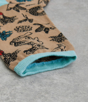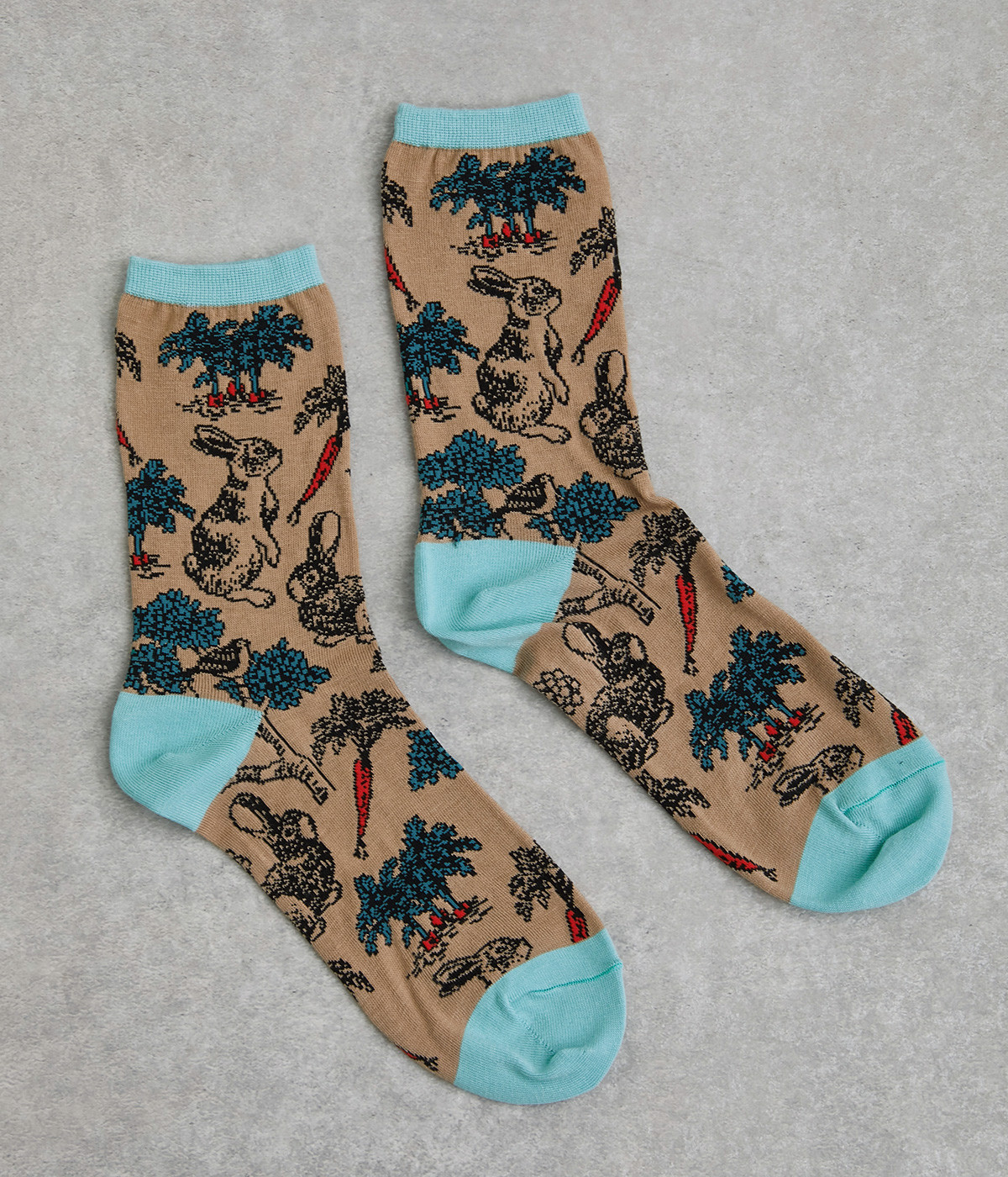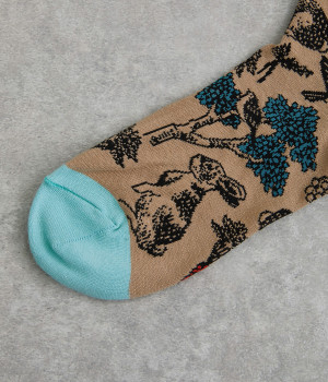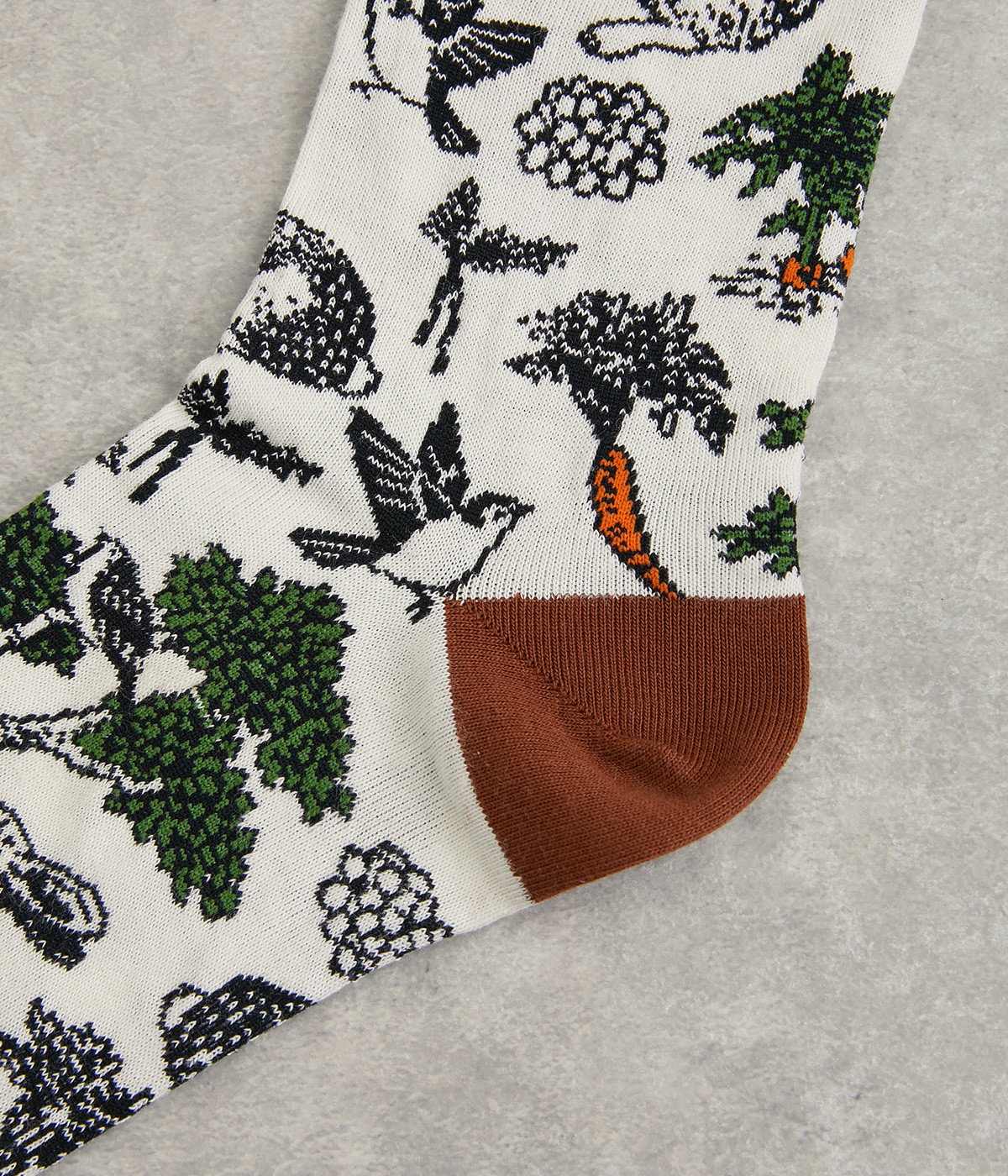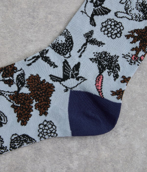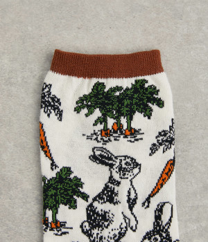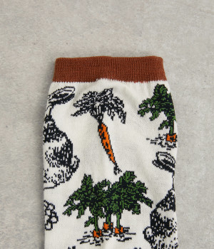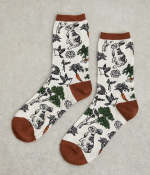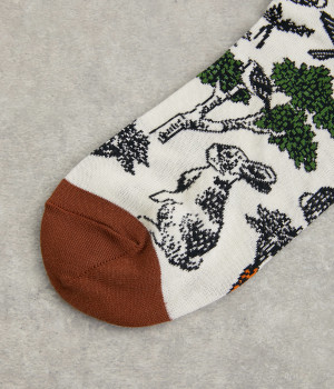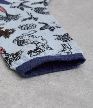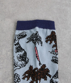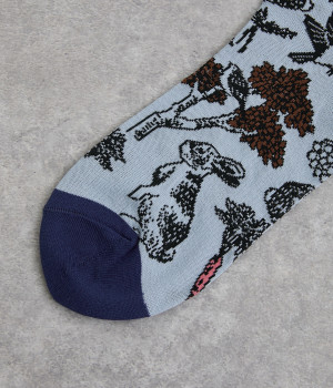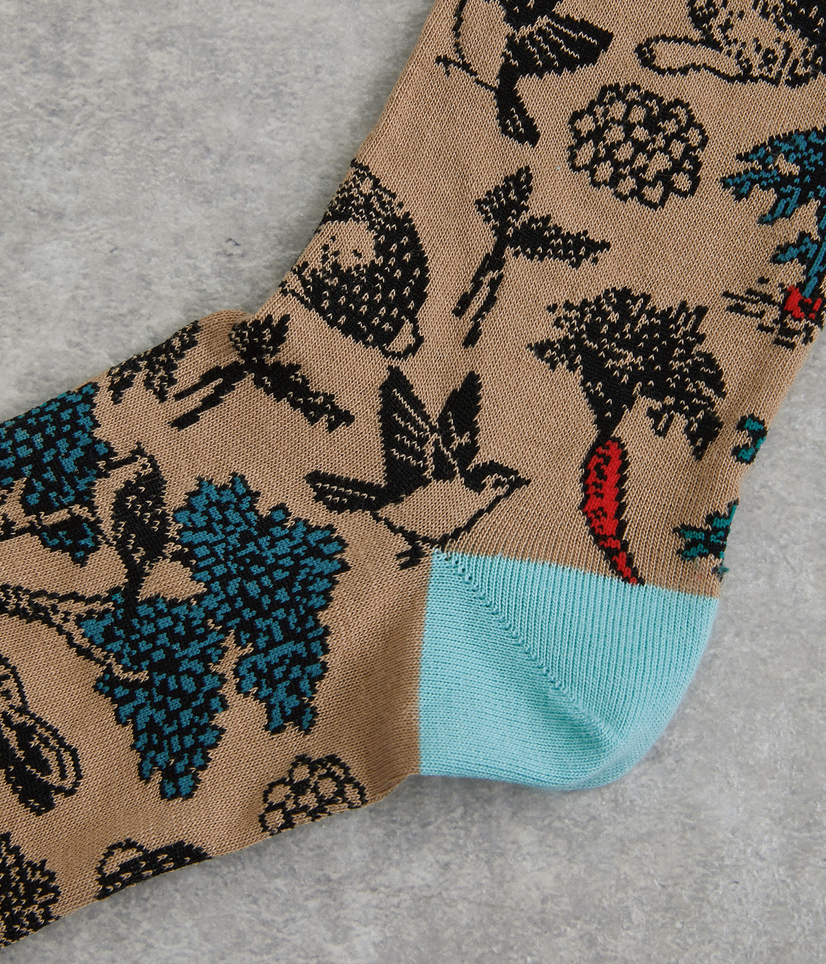 繊細なタッチで描かれたウサギや鳥などのアートな総柄
