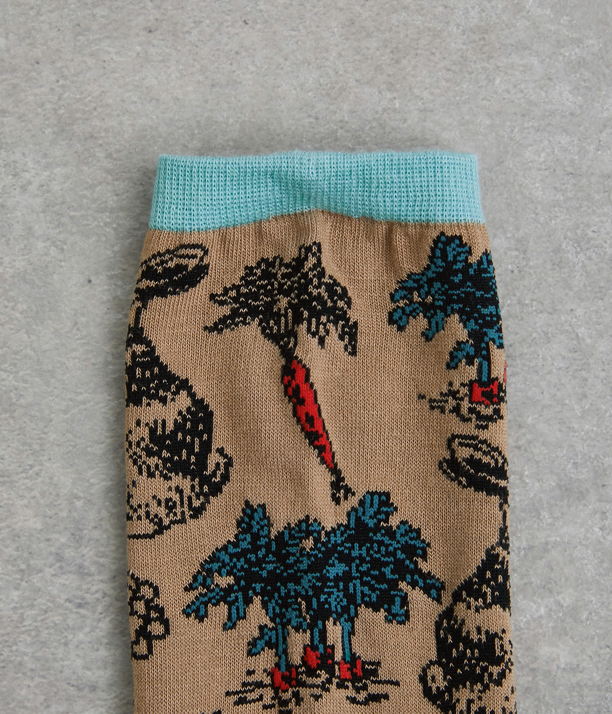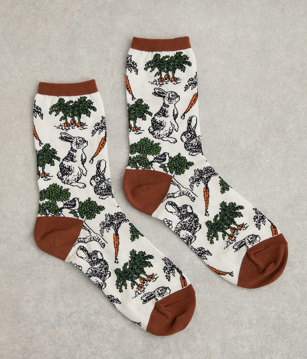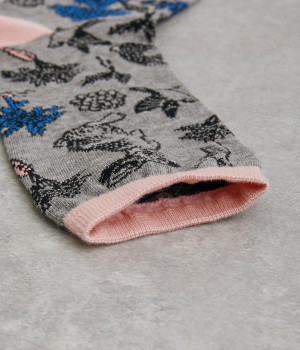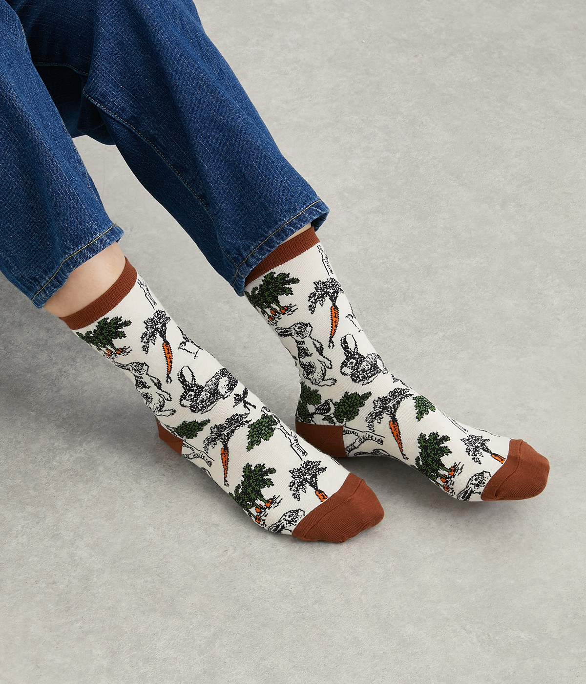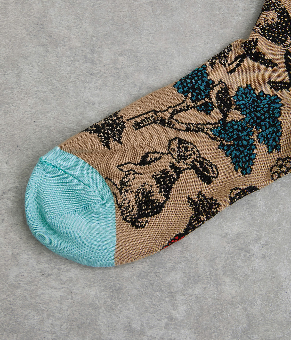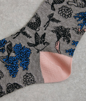 繊細なタッチで描かれたウサギや鳥などのアートな総柄