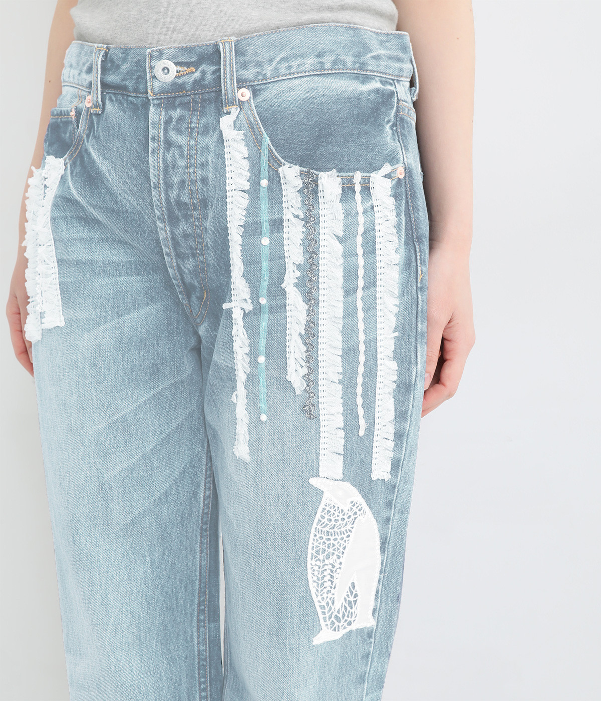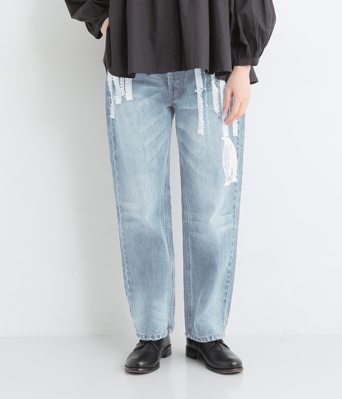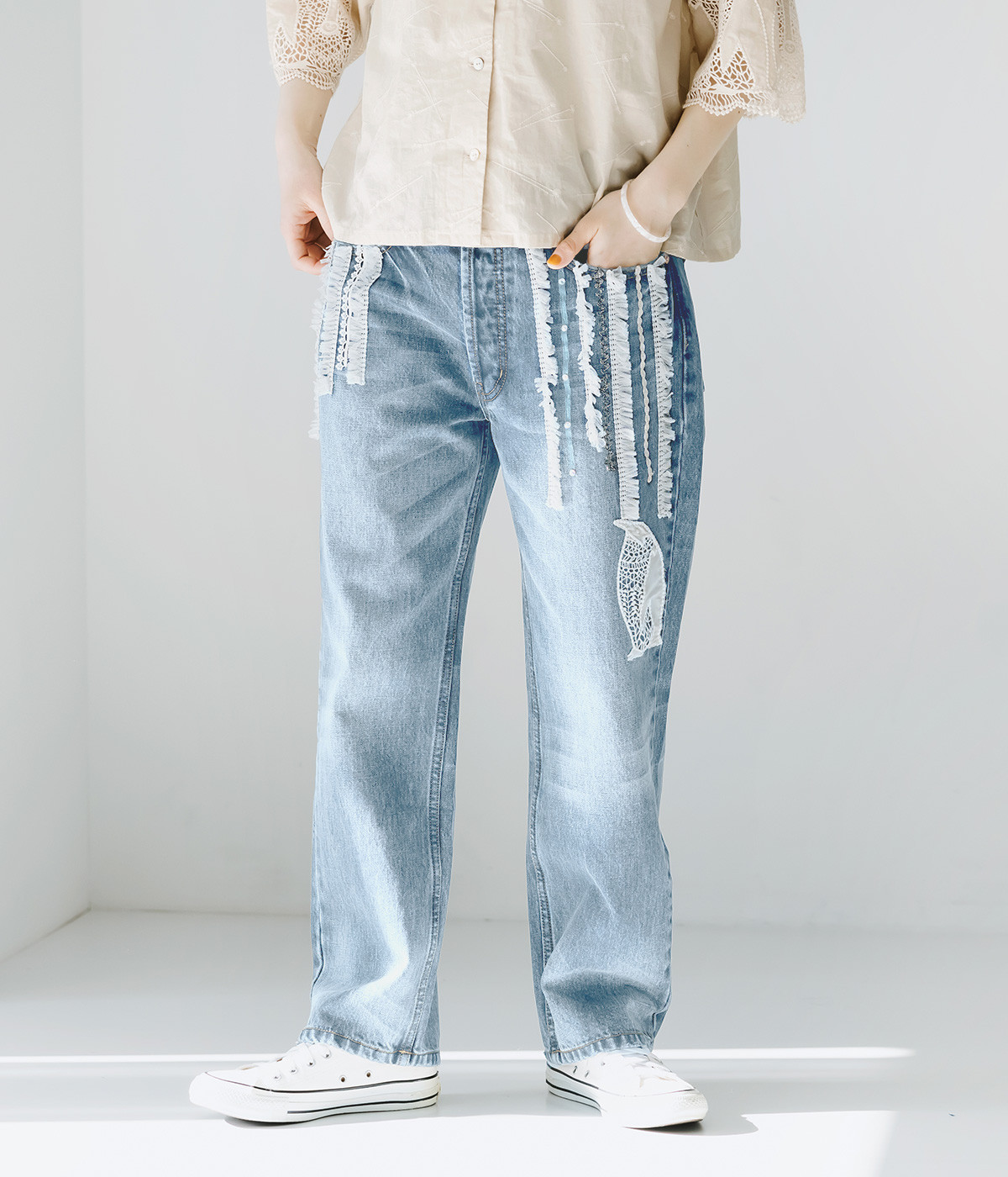 手仕事のぬくもり感たっぷりのスペシャルなデコレーションを惜しみなくあしらいました。オリジナルレースや刺しゅうをふんだんに取り入れたにぎやかなデザイン。ゆったりとしたテーパードラインではき心地も抜群です。