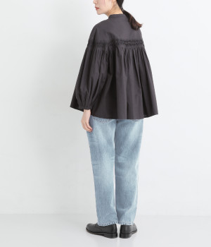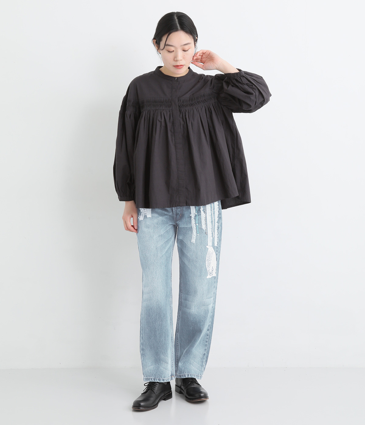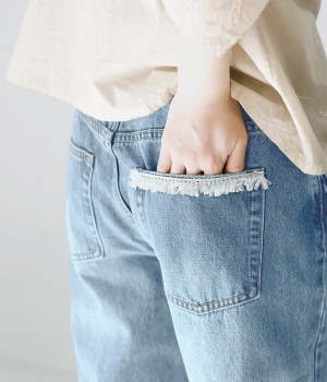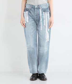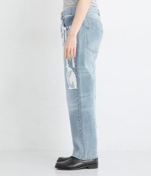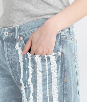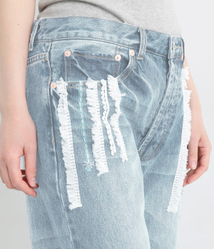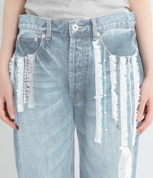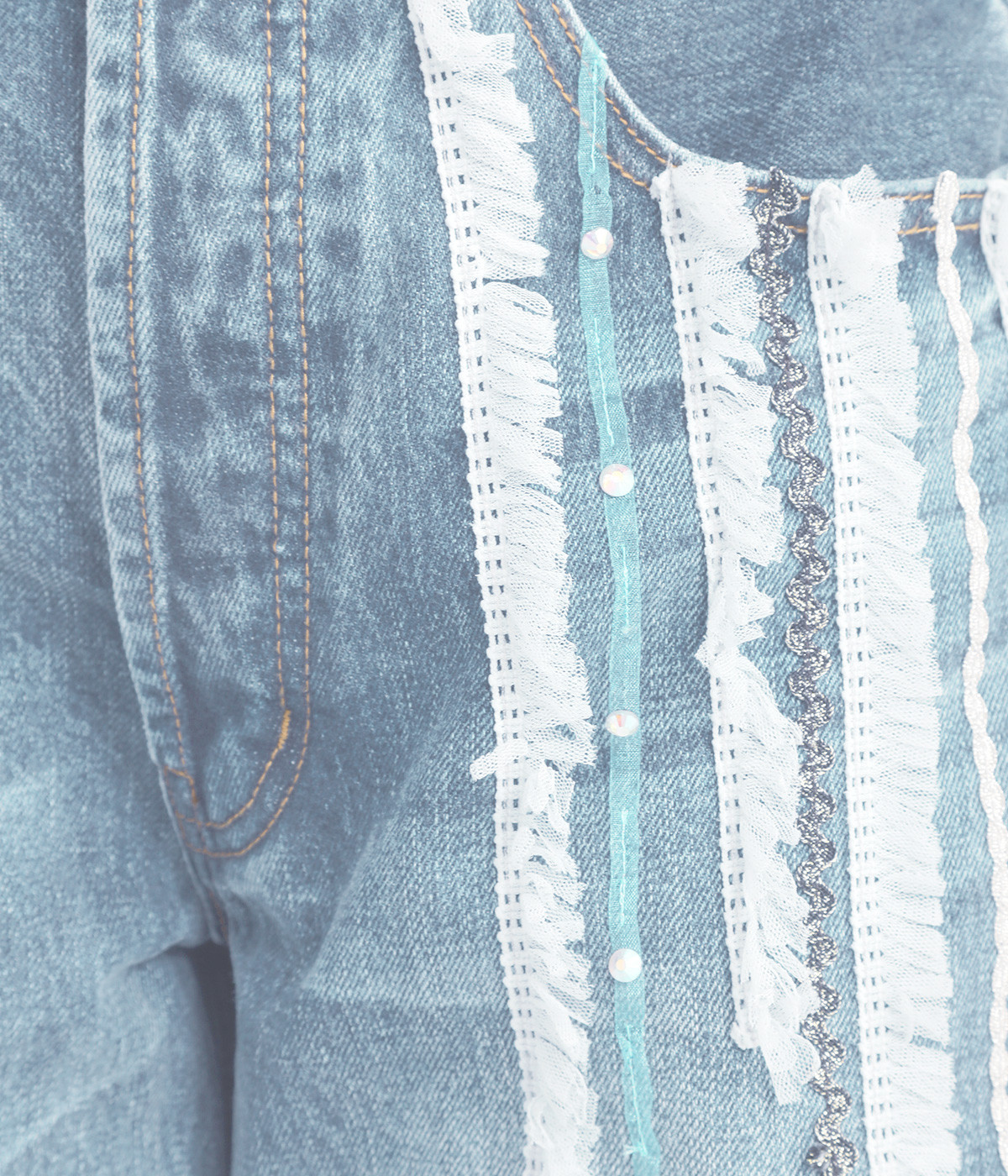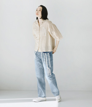 手仕事のぬくもり感たっぷりのスペシャルなデコレーションを惜しみなくあしらいました。オリジナルレースや刺しゅうをふんだんに取り入れたにぎやかなデザイン。ゆったりとしたテーパードラインではき心地も抜群です。