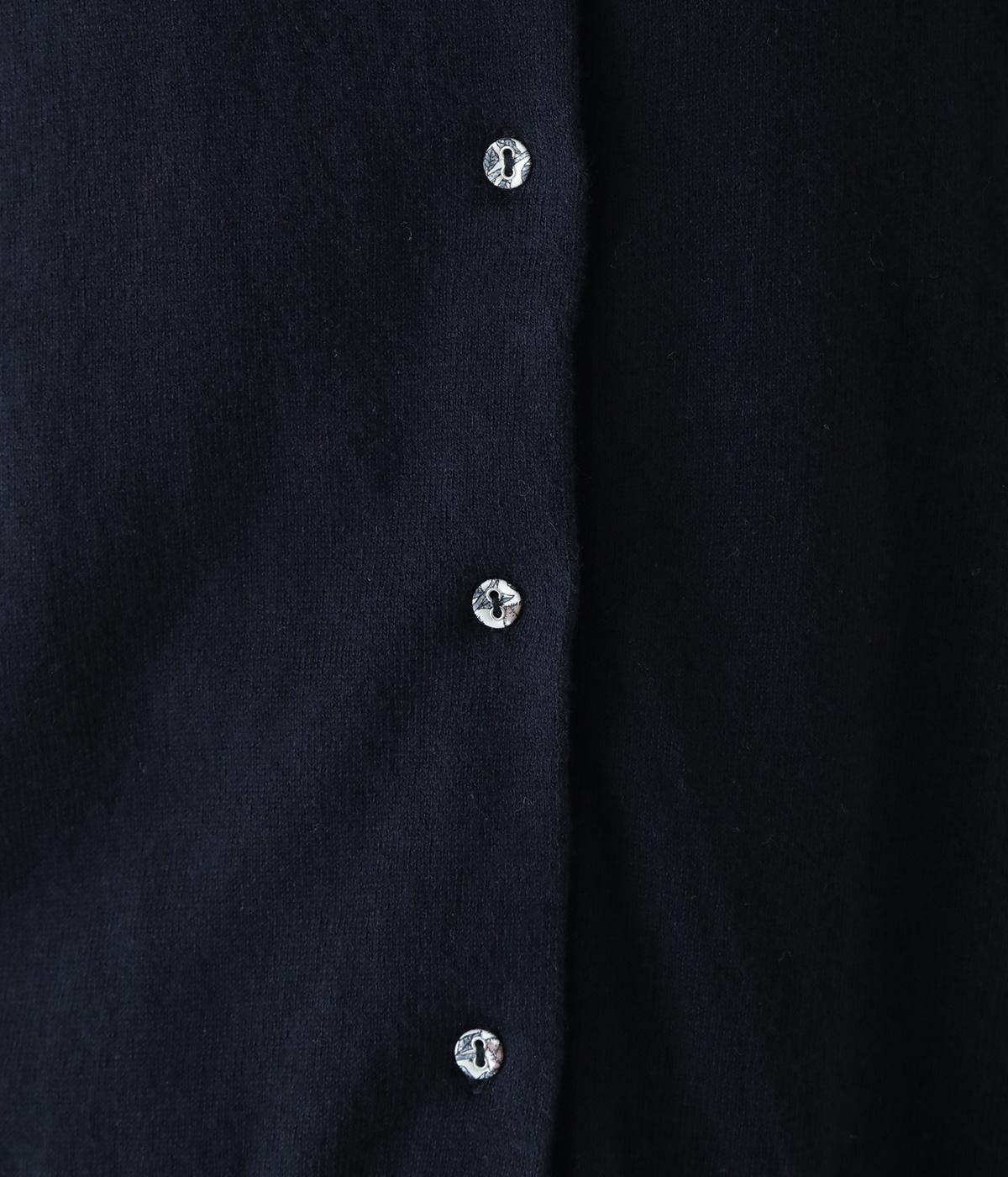 首元に沿ってやや立ち上がったボトルネックが上品なニットカーディガン。前立てとくるみボタンにLIBERTY生地を使用しアクセントにしています。ボタンを開けてさっと羽織ると、柄がより映えて華やかさがアップ。身頃はゆったりとさせ、リラックスした着用感にもこだわりました。