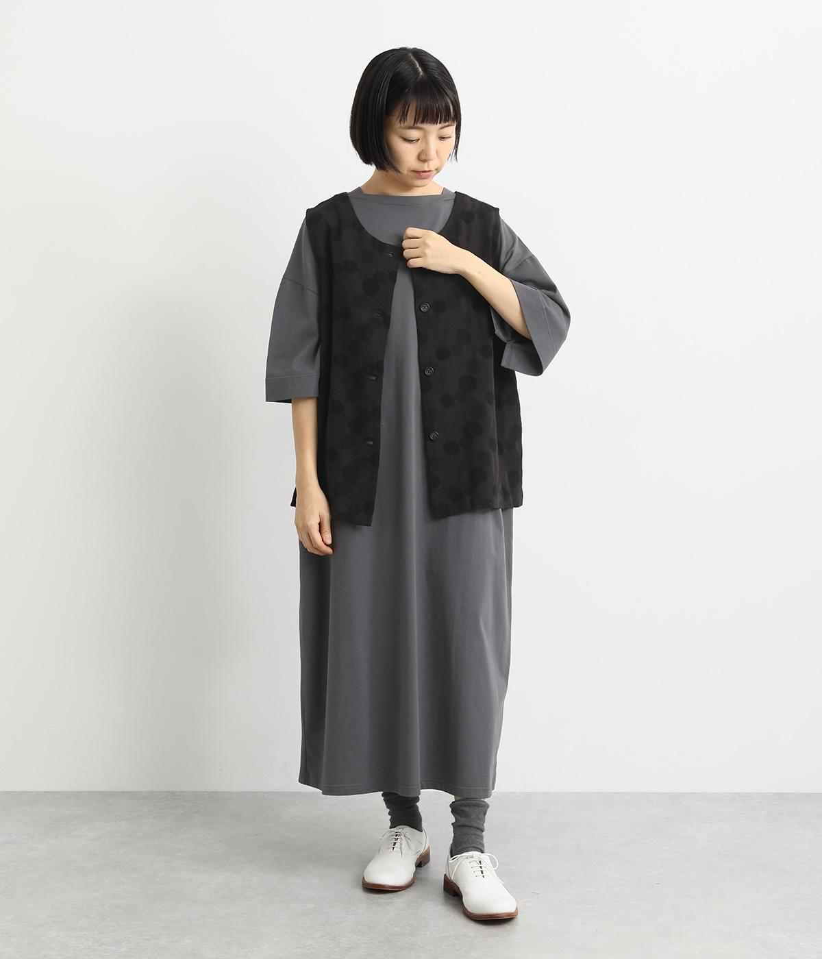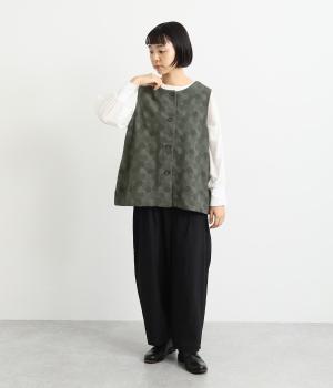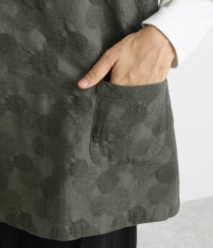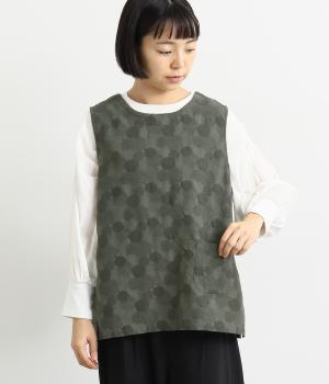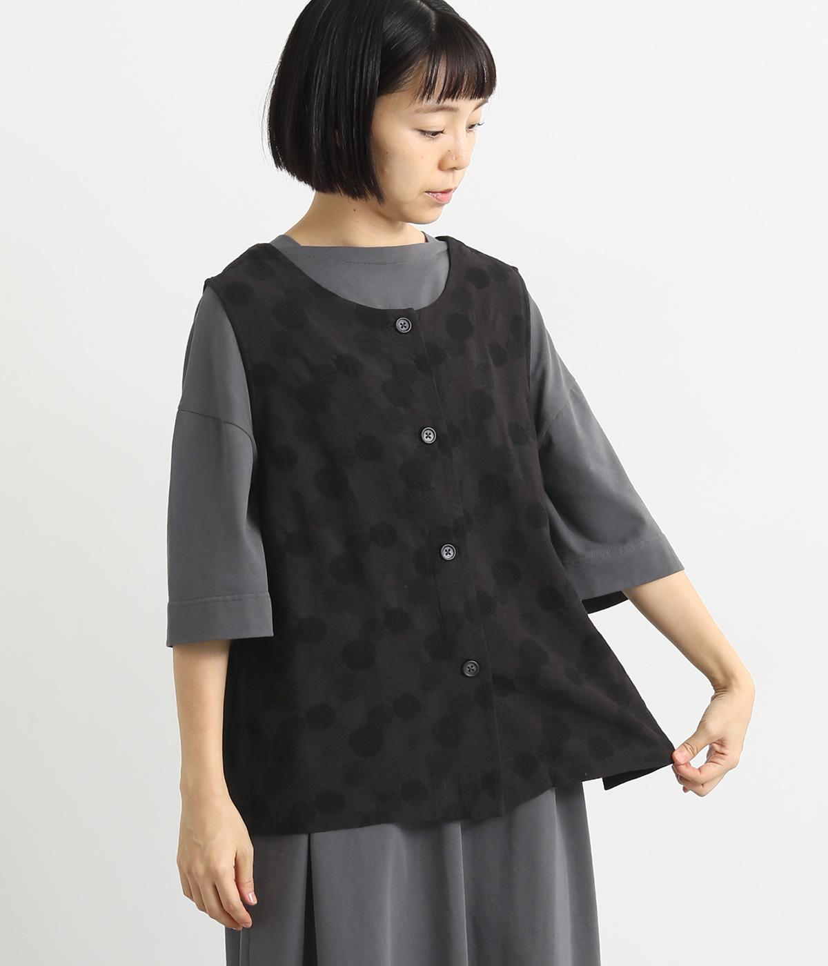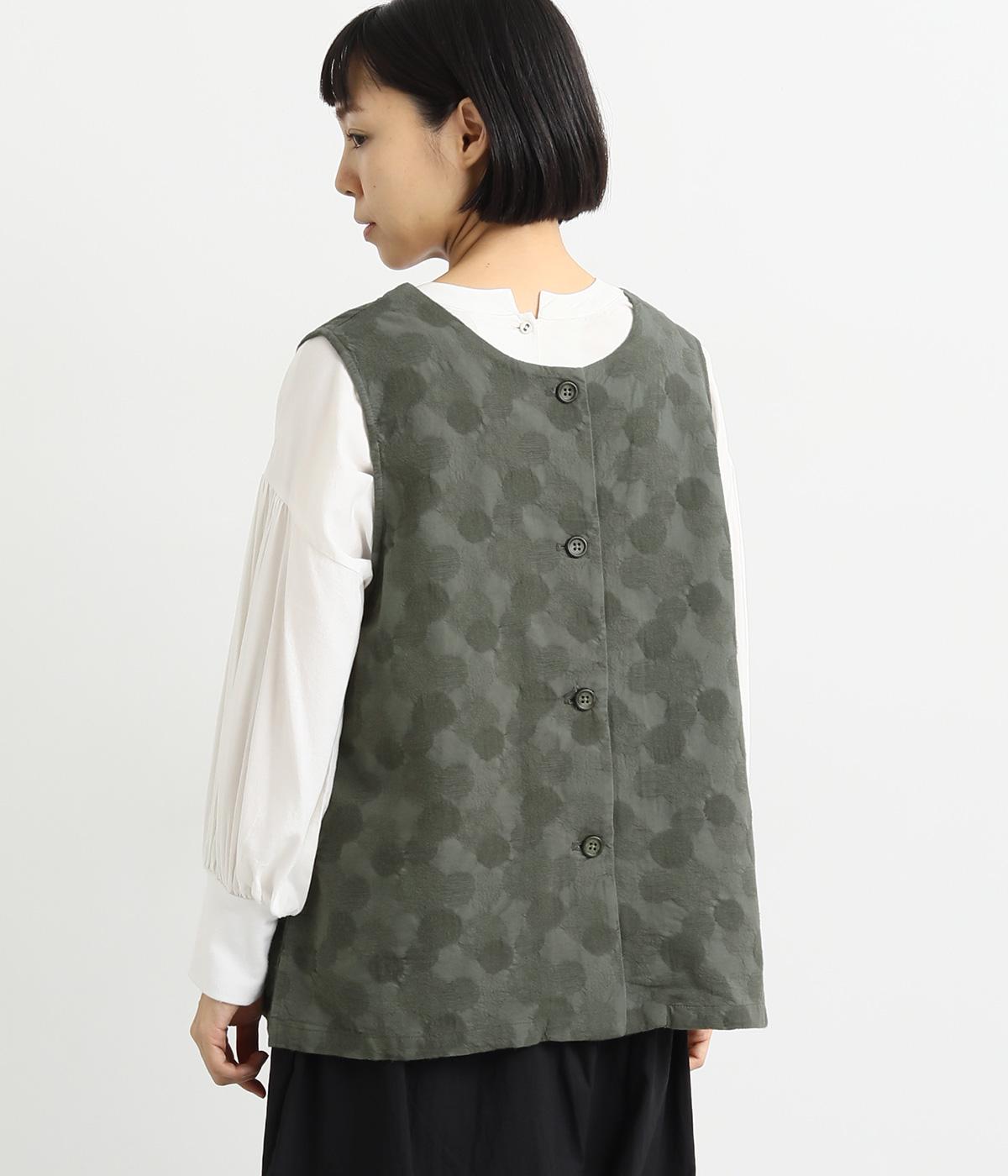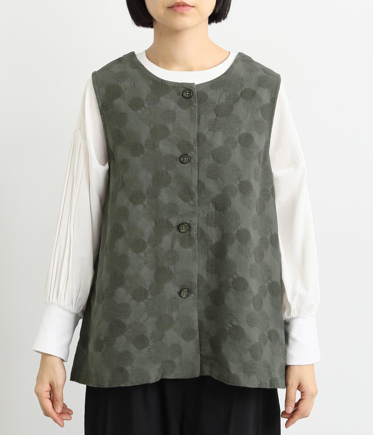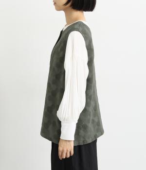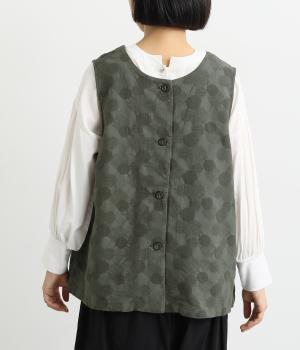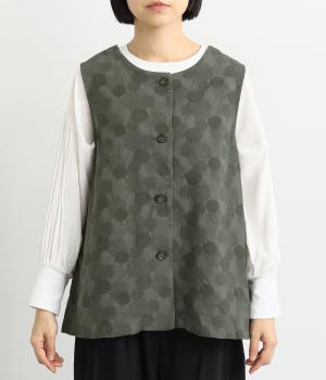 2way仕様のベストに仕立てました。ボタンを外して羽織っても違う表情を楽しめます。スリット入りで動きやすさも◎。ドットは控えめなので、どんなインナーやボトムにも幅広くコーディネートできます。