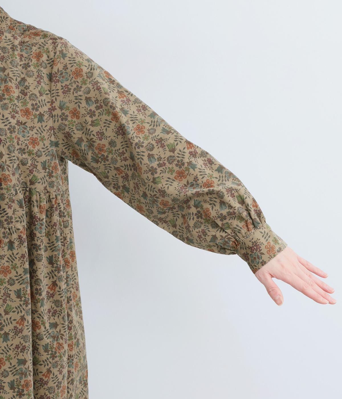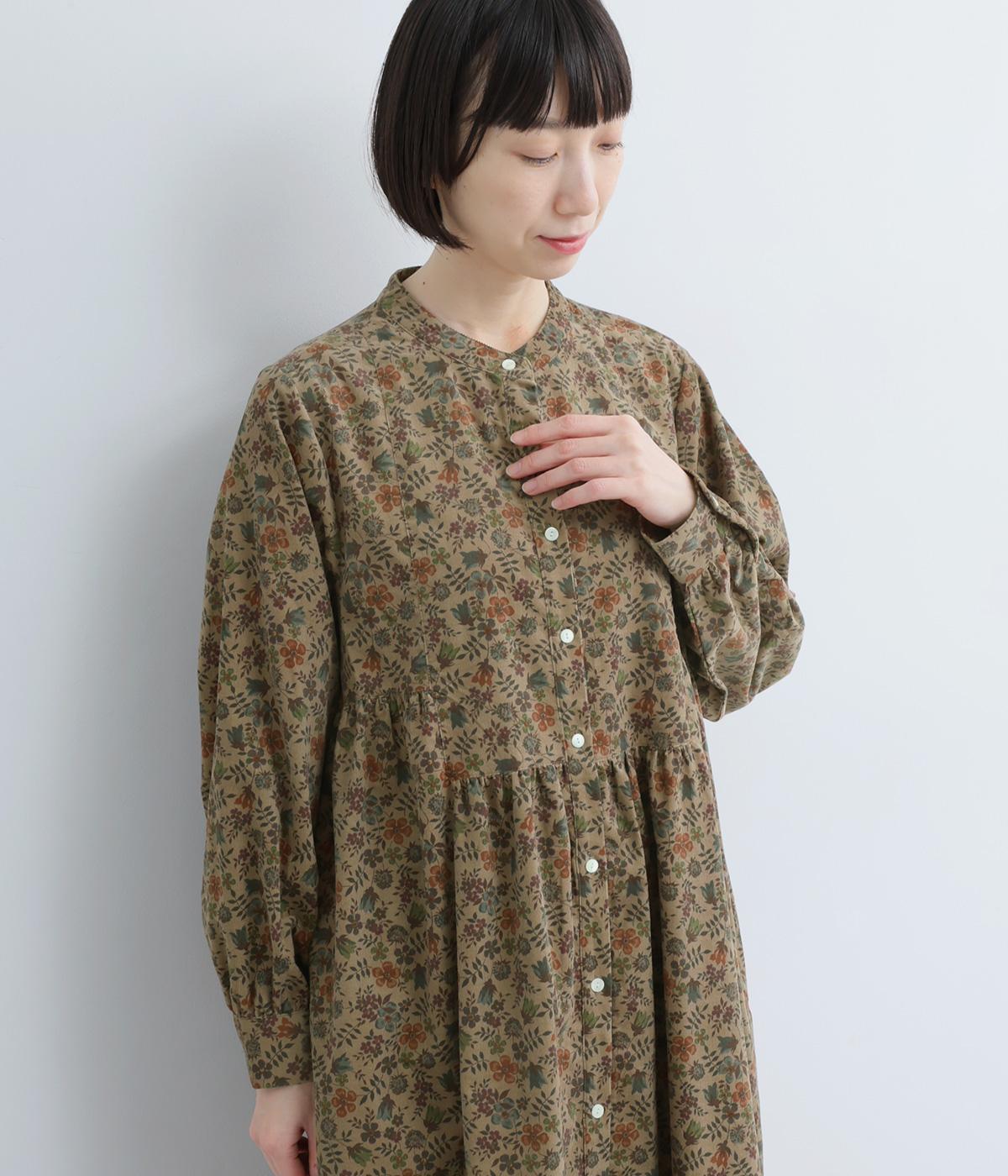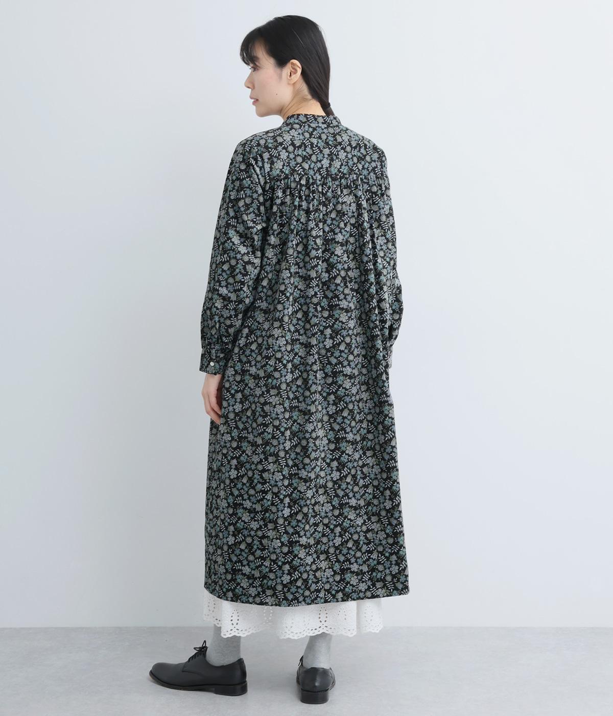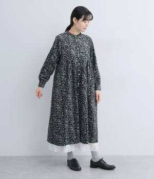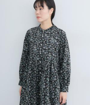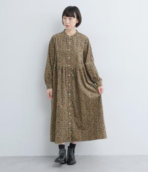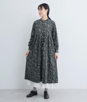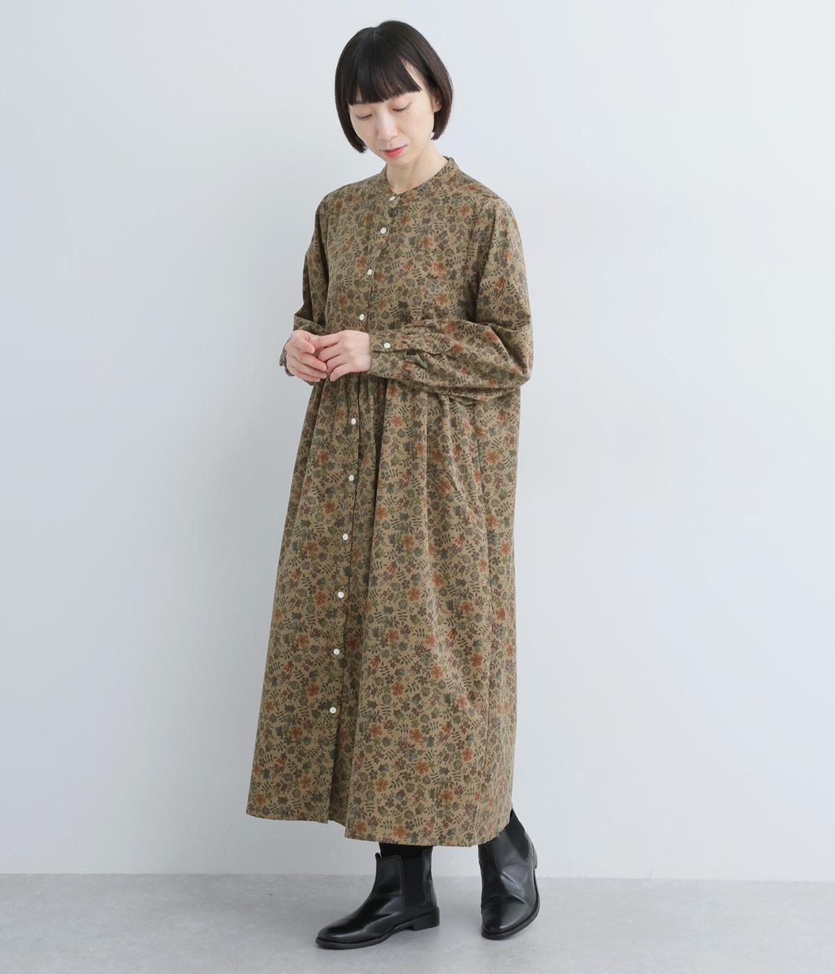 前後のギャザー切り替えでふんわり広がるクラシカルなワンピース。フェミニンなディテールを、バンドカラーですっきり引き締めました。1枚はもちろん、前を開けて羽織りにしたり、中にパンツを重ねてアレンジするのも素敵です。