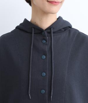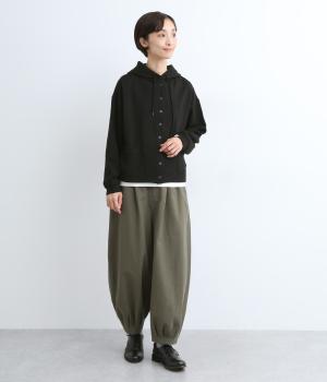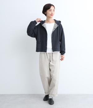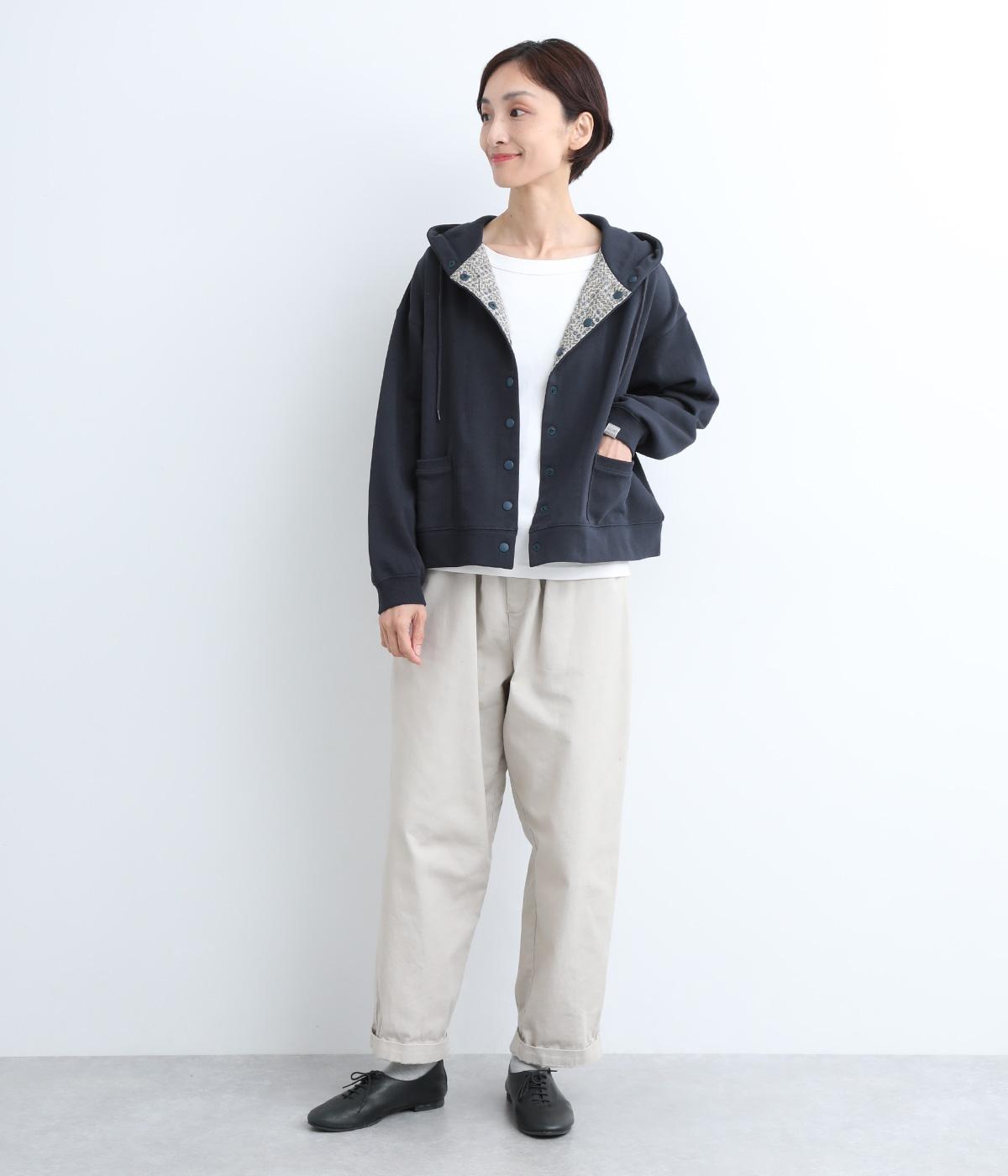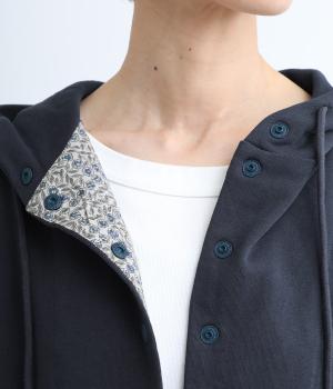 軽く羽織れるアウターとして便利なスナップボタンの前あきジャケット。フードつきのカジュアルテイストに、見返しのリバティプリントが羽織った際にちらりと見えてかわいらしさをプラス。コンパクトなシルエットで着こなしやすい仕上がりです。