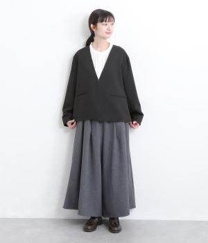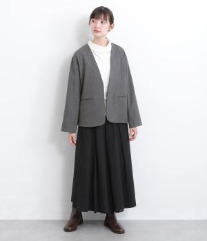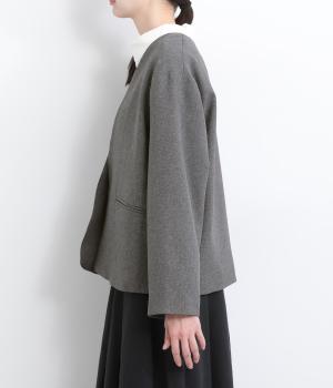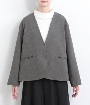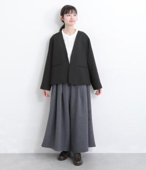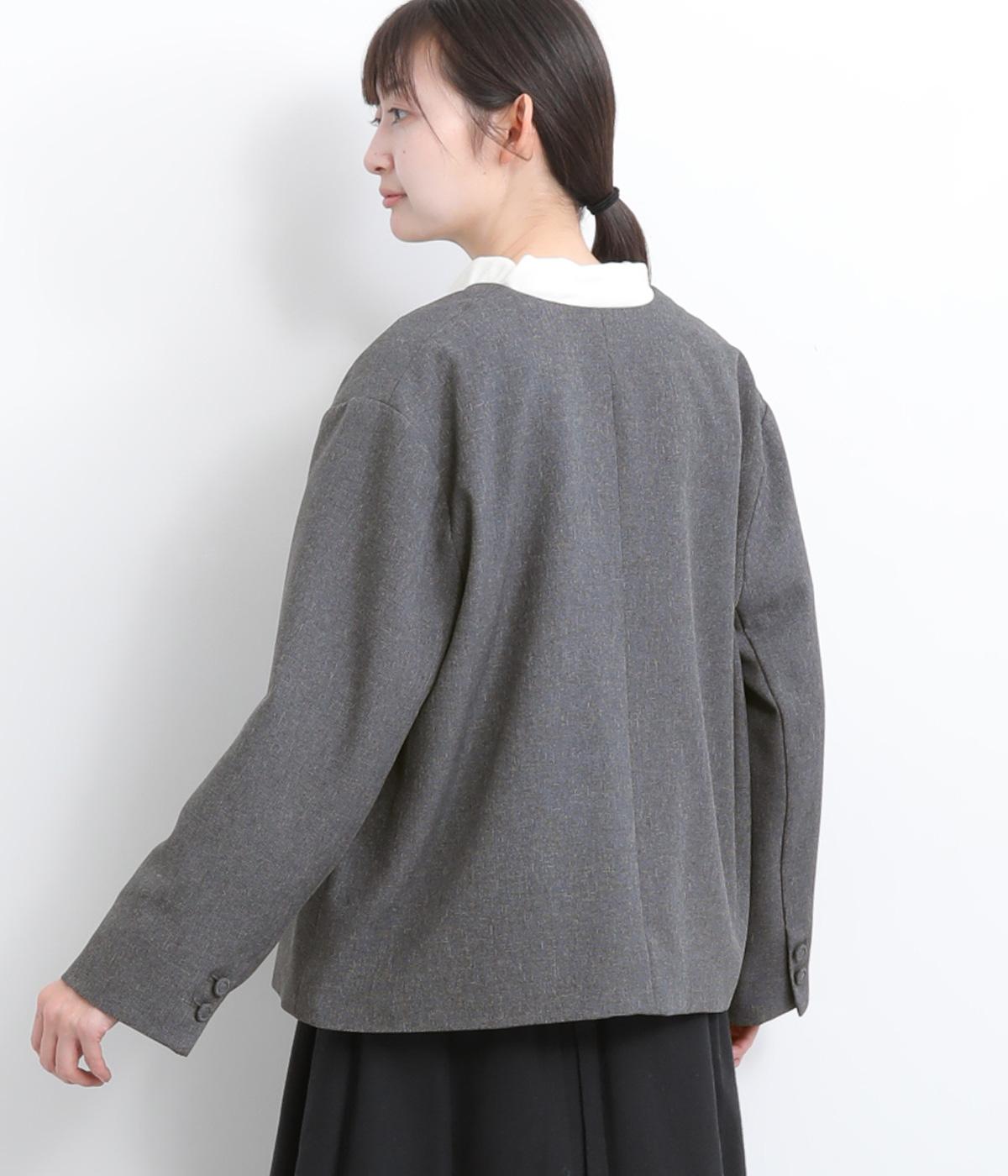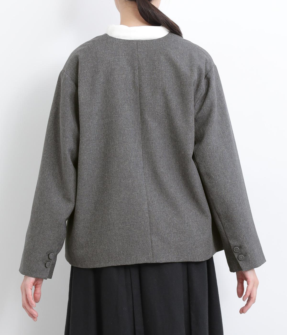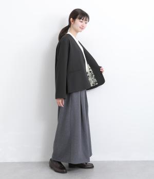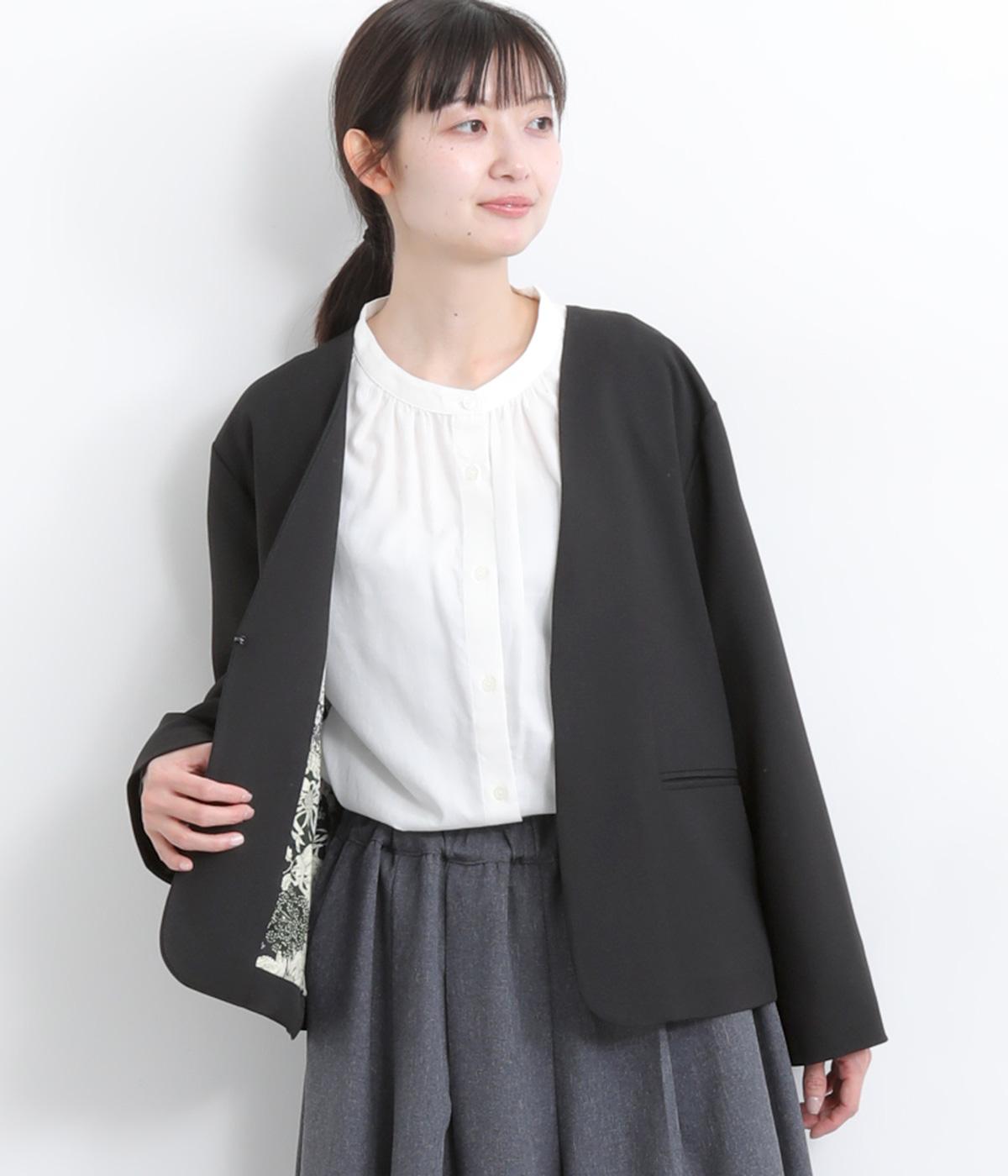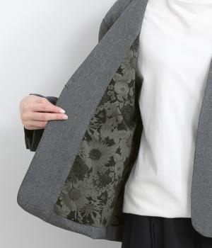 こなれ感の漂うノーカラージャケットです。ホックひとつで留める前立ては緩やかなラインを描き、前を開ければリバティ柄がのぞきます。飾りポケットや共布のカフスボタンがさりげないアクセントになっています。