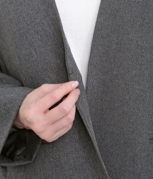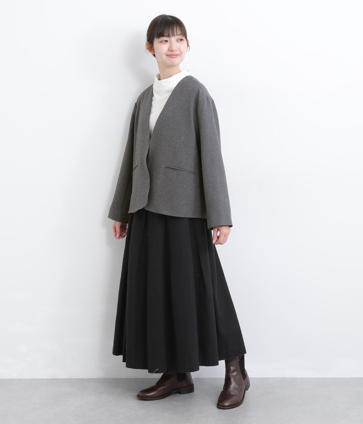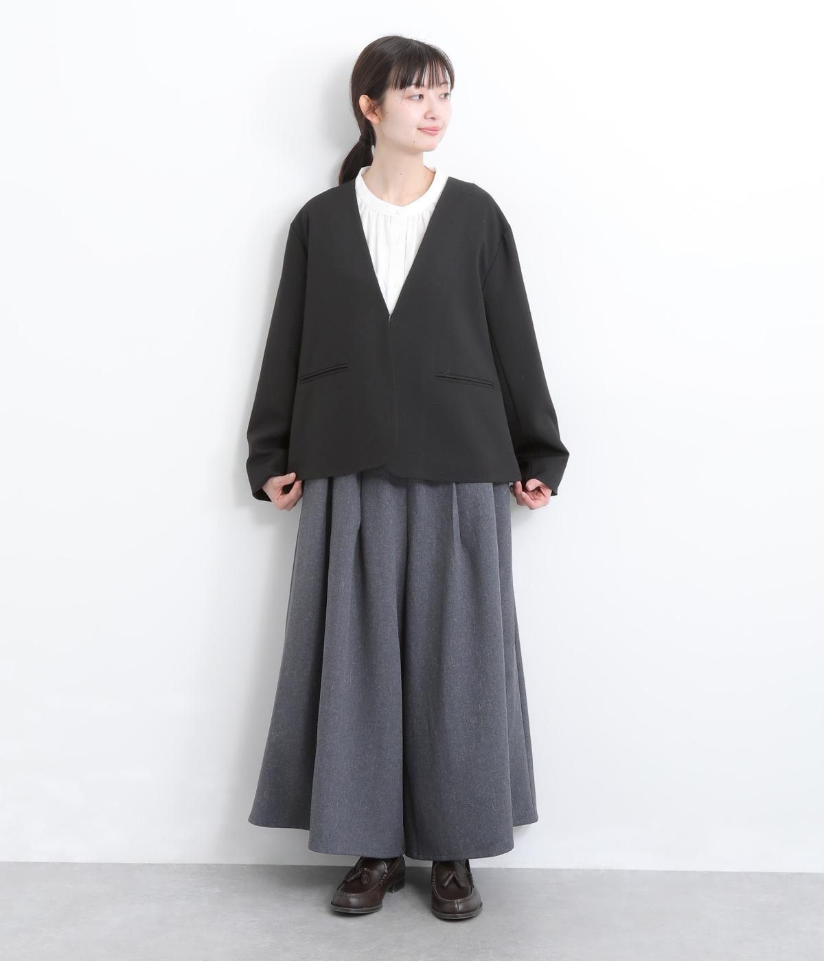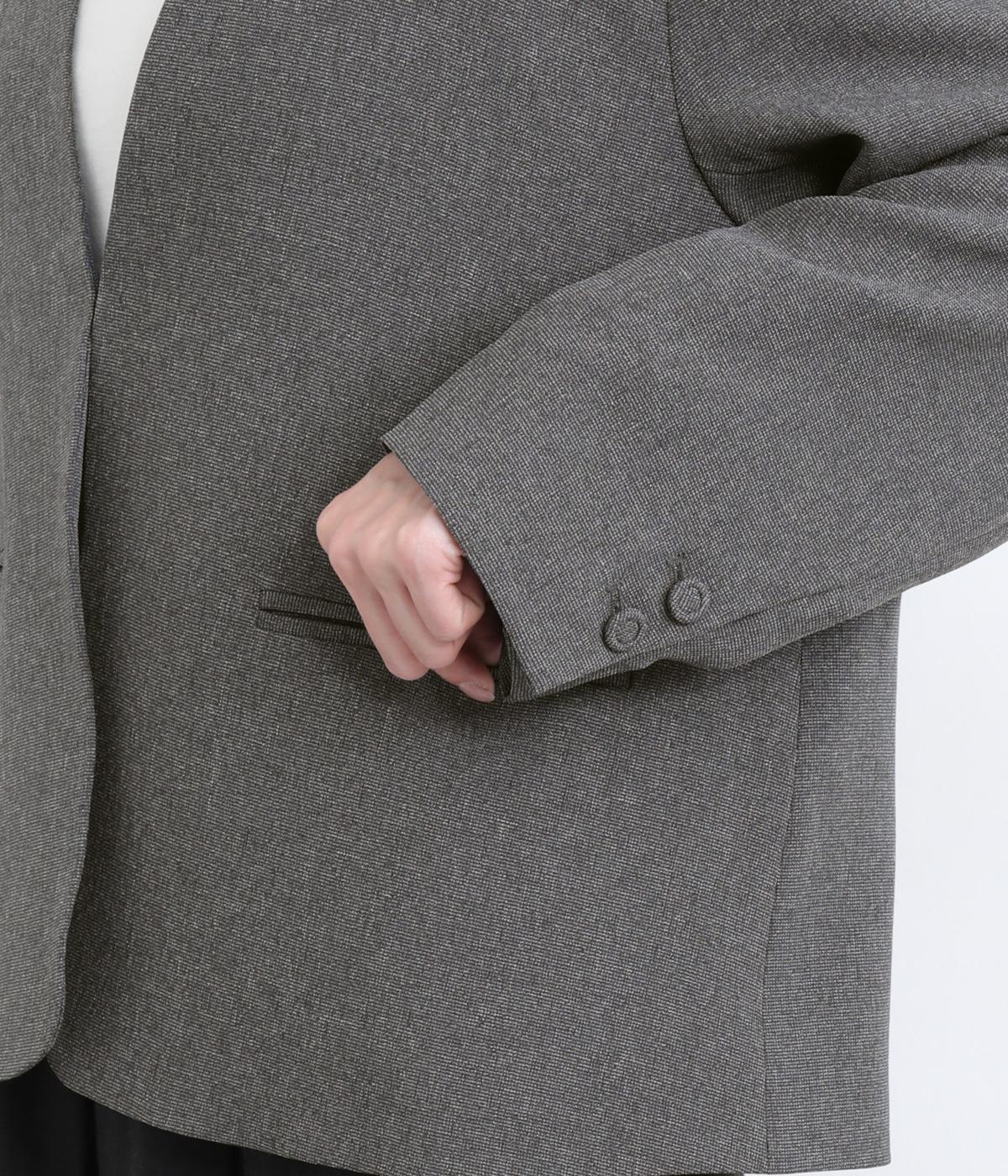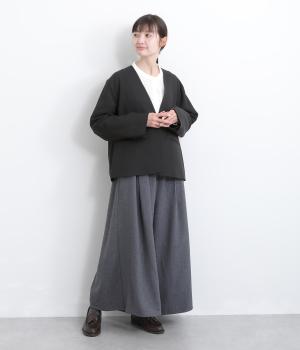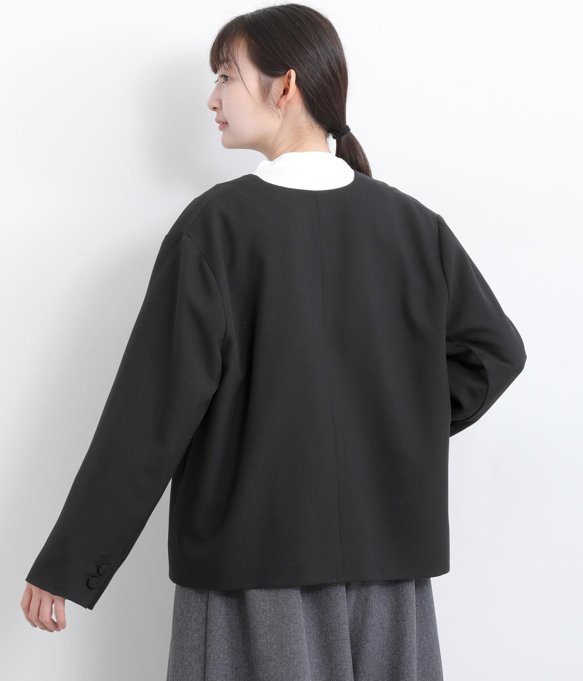 こなれ感の漂うノーカラージャケットです。ホックひとつで留める前立ては緩やかなラインを描き、前を開ければリバティ柄がのぞきます。飾りポケットや共布のカフスボタンがさりげないアクセントになっています。