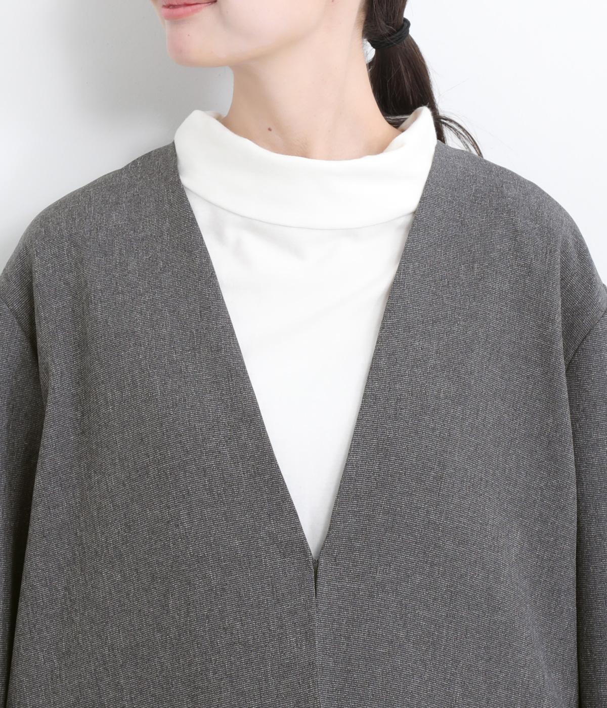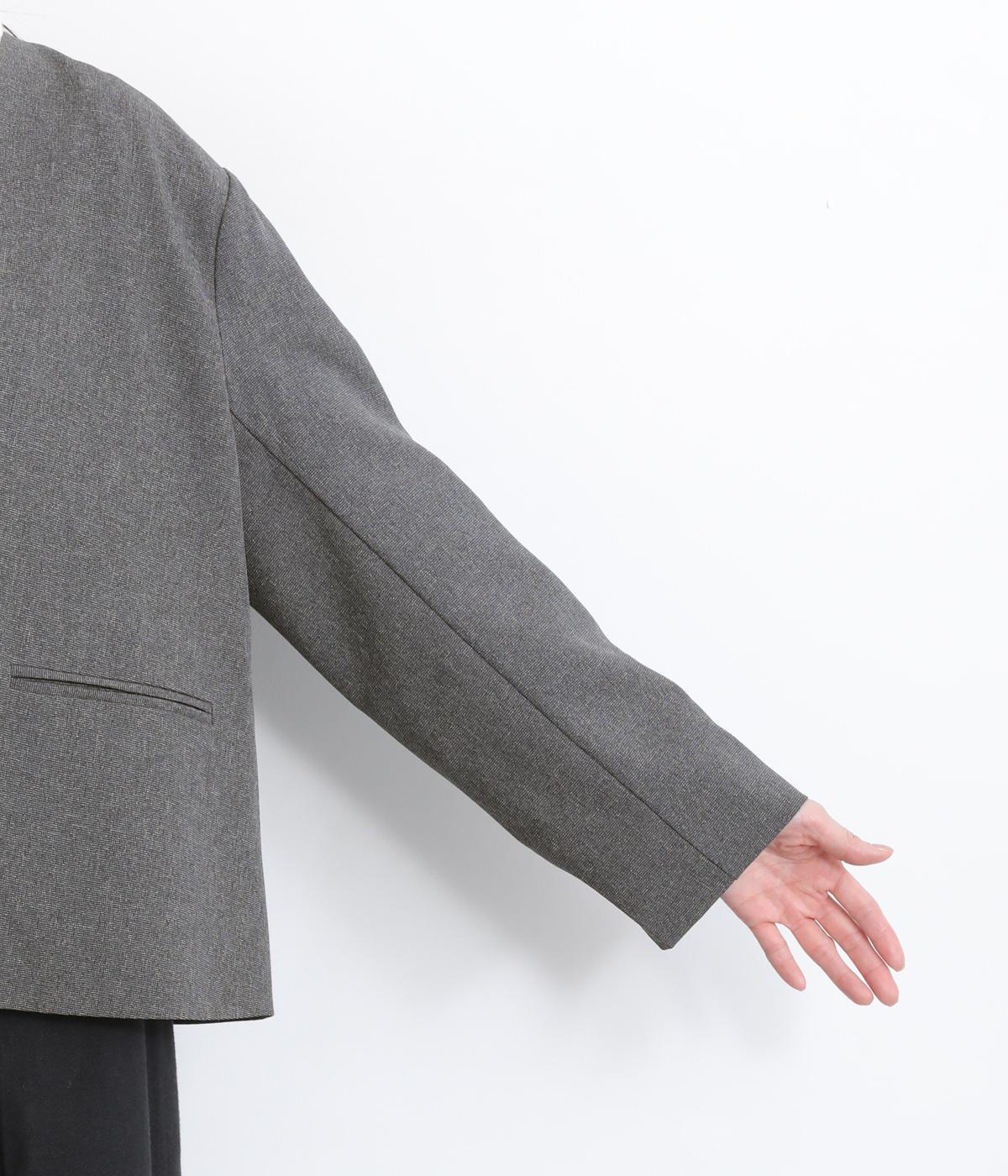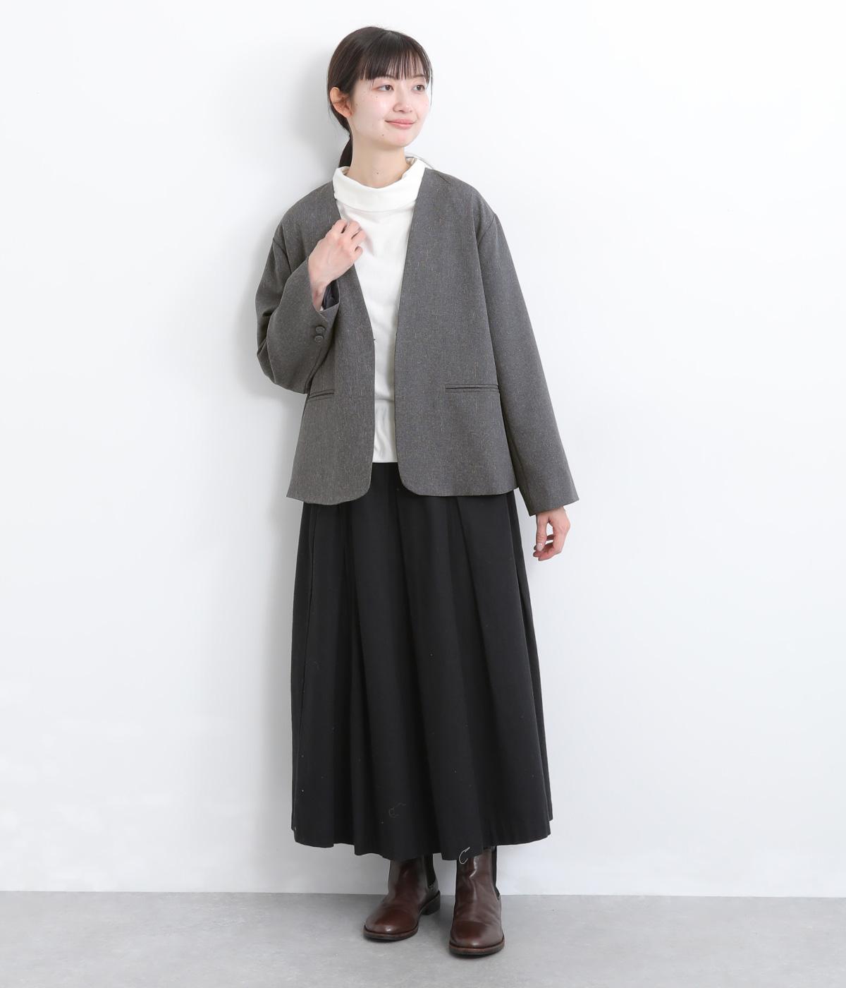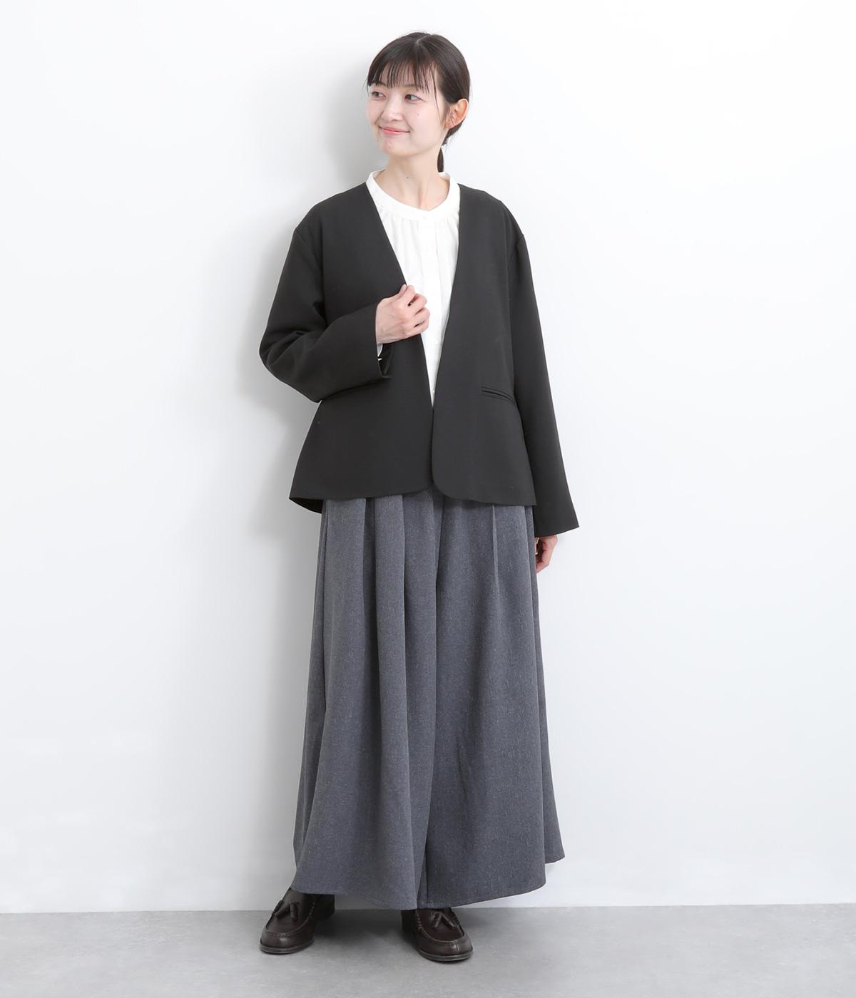 こなれ感の漂うノーカラージャケットです。ホックひとつで留める前立ては緩やかなラインを描き、前を開ければリバティ柄がのぞきます。飾りポケットや共布のカフスボタンがさりげないアクセントになっています。