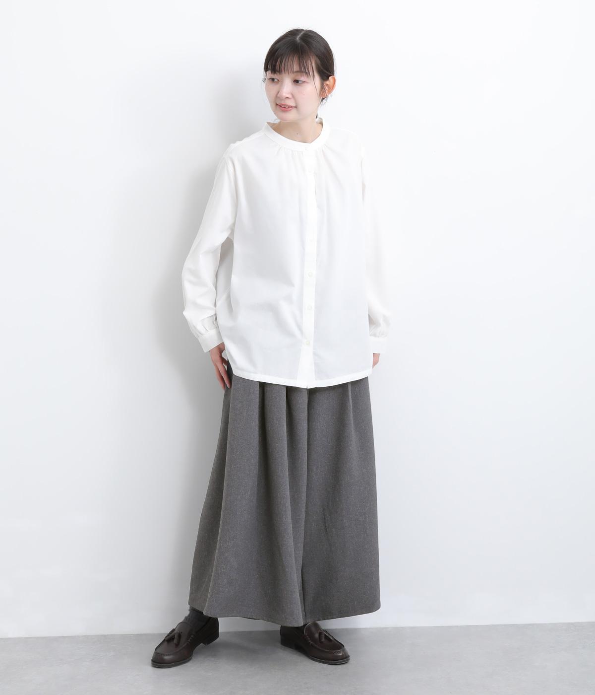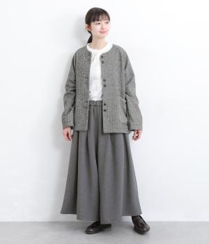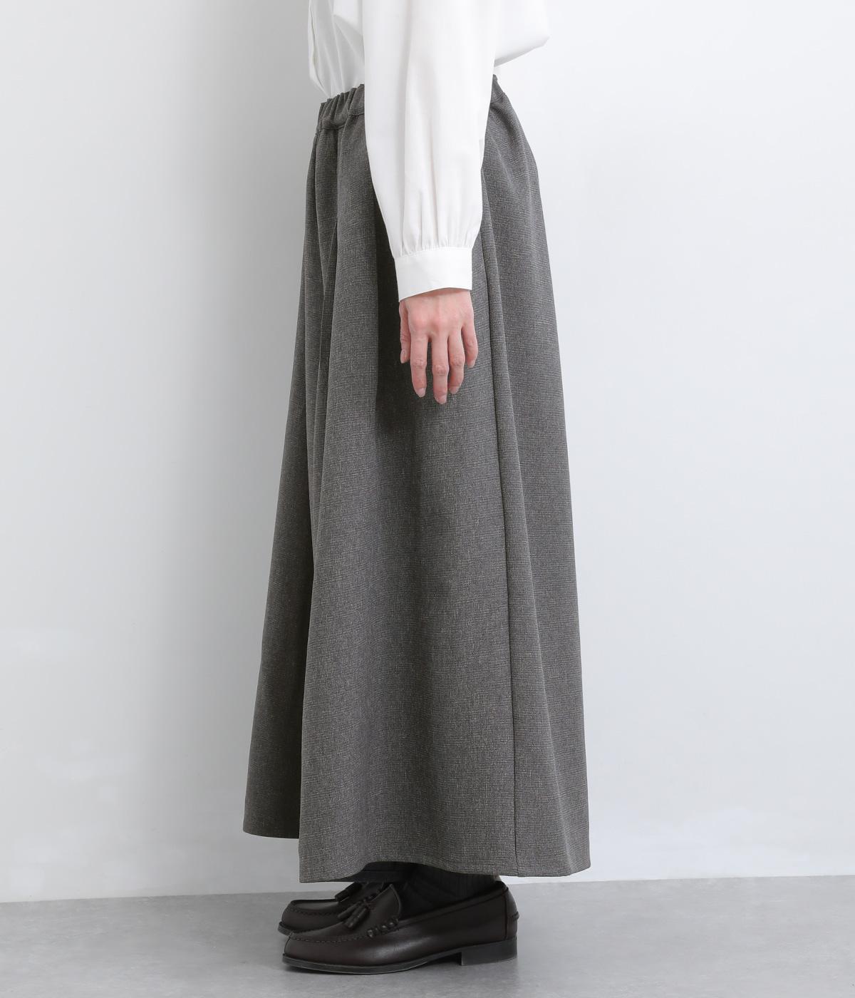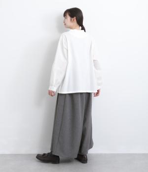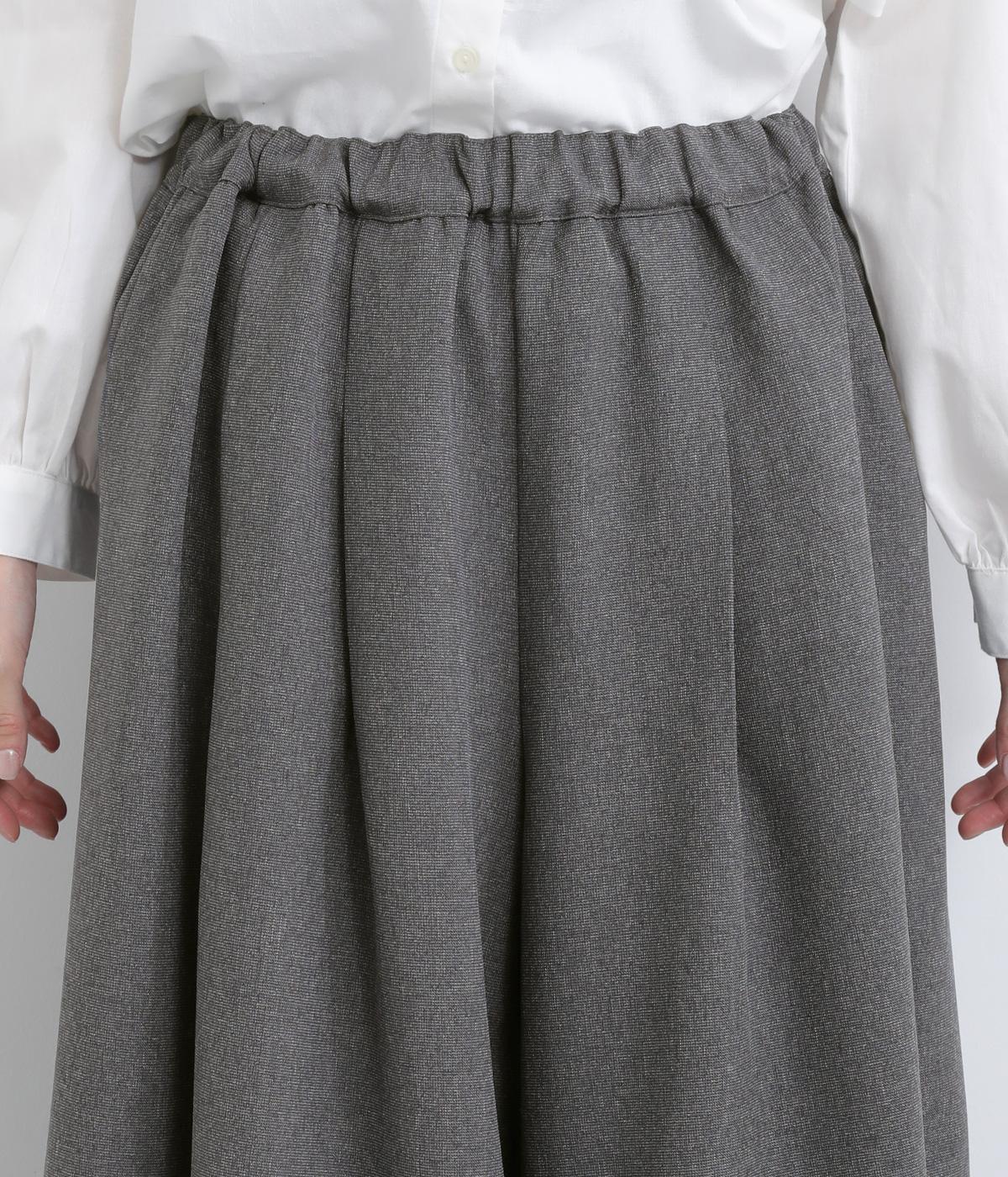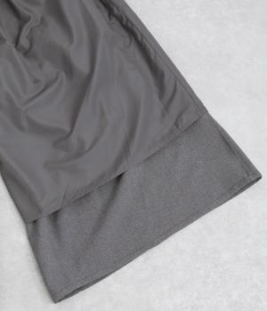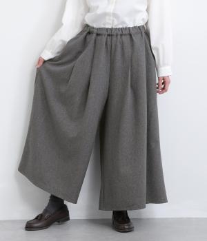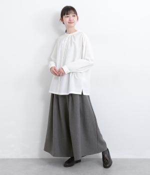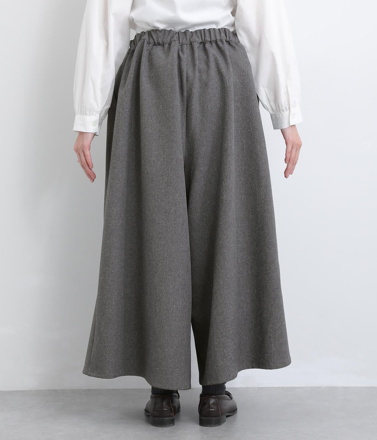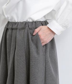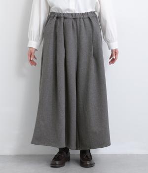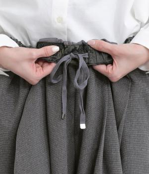 たっぷりタックを入れた生地が優雅なドレープをつくります。ボリュームがありながらも動きやすく仕立てました。裏側にさりげなくリバティ柄をあしらったウエストは総ゴム使用で、紐でサイズ調節が可能です。