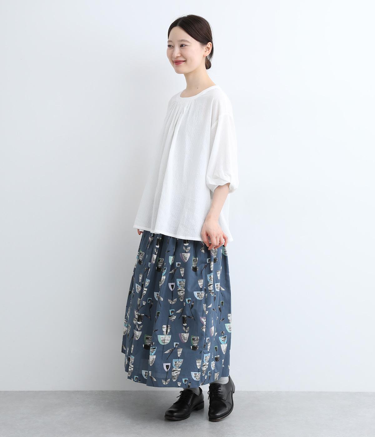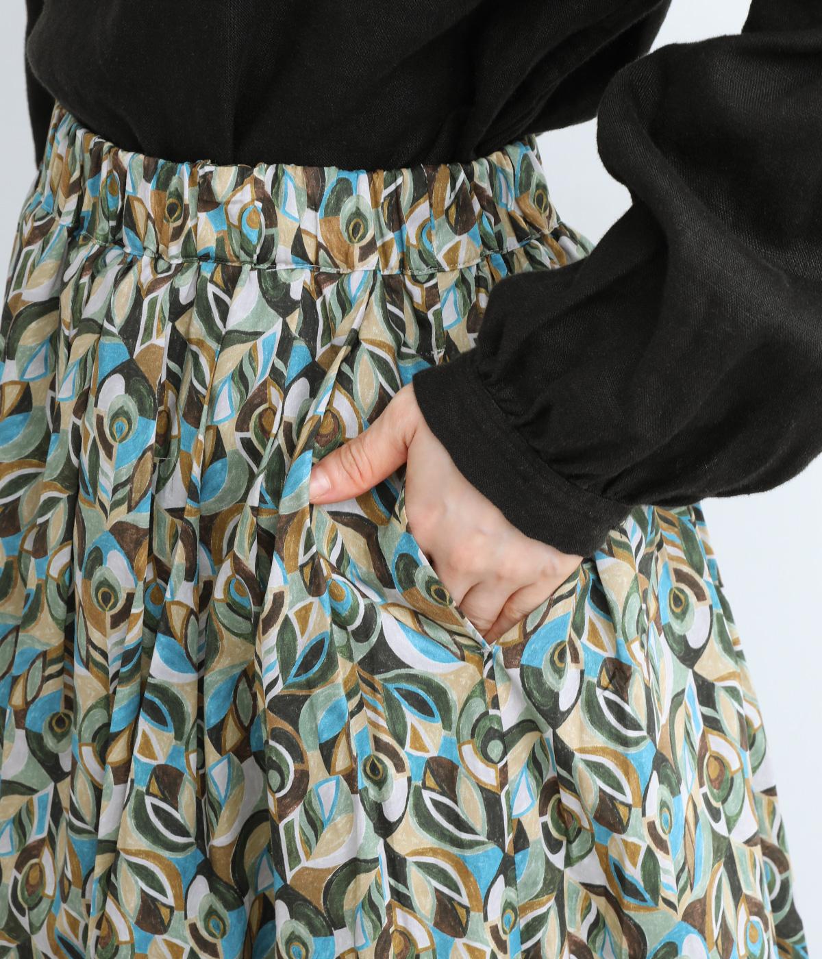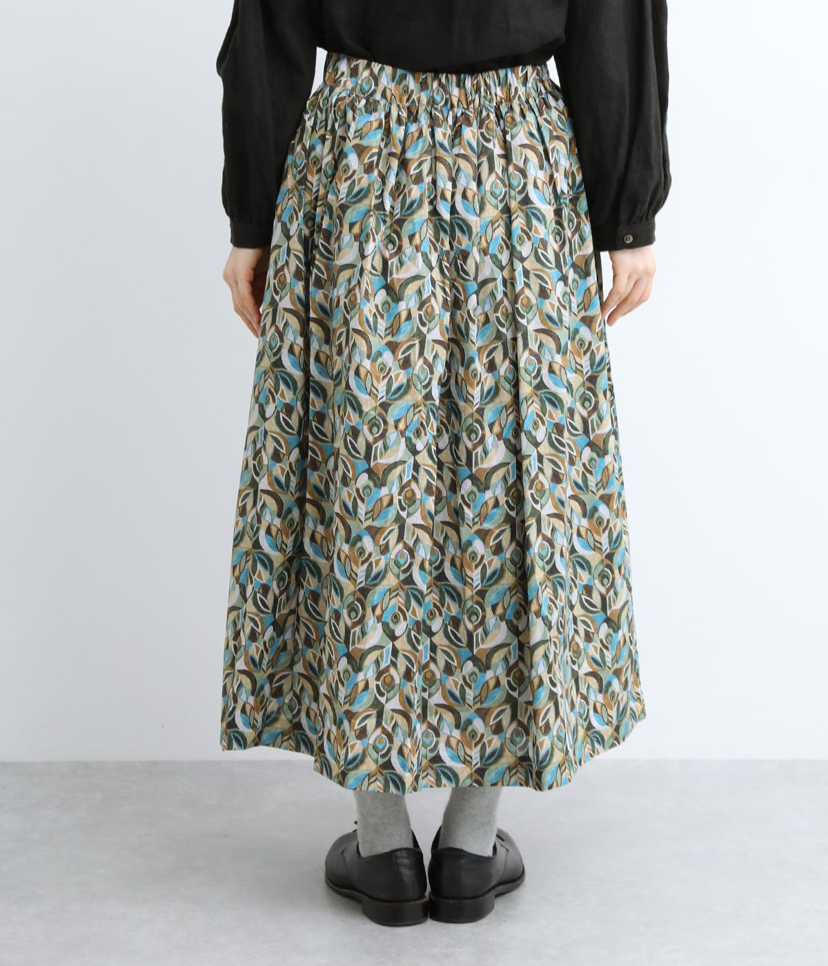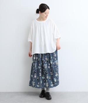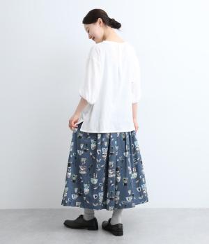 前スカートにはタック、後スカートにはギャザーをたっぷり入れてフェミニンンテイストなシルエットを演出しています。ウエストはぐるりとゴム仕様で、内側の共紐でサイズ調節可能に。シューズやソックス合わせがたのしめる丈感も◎。