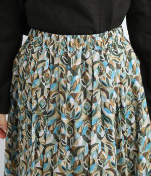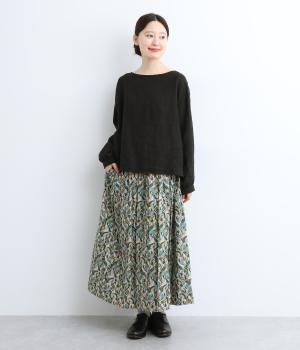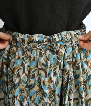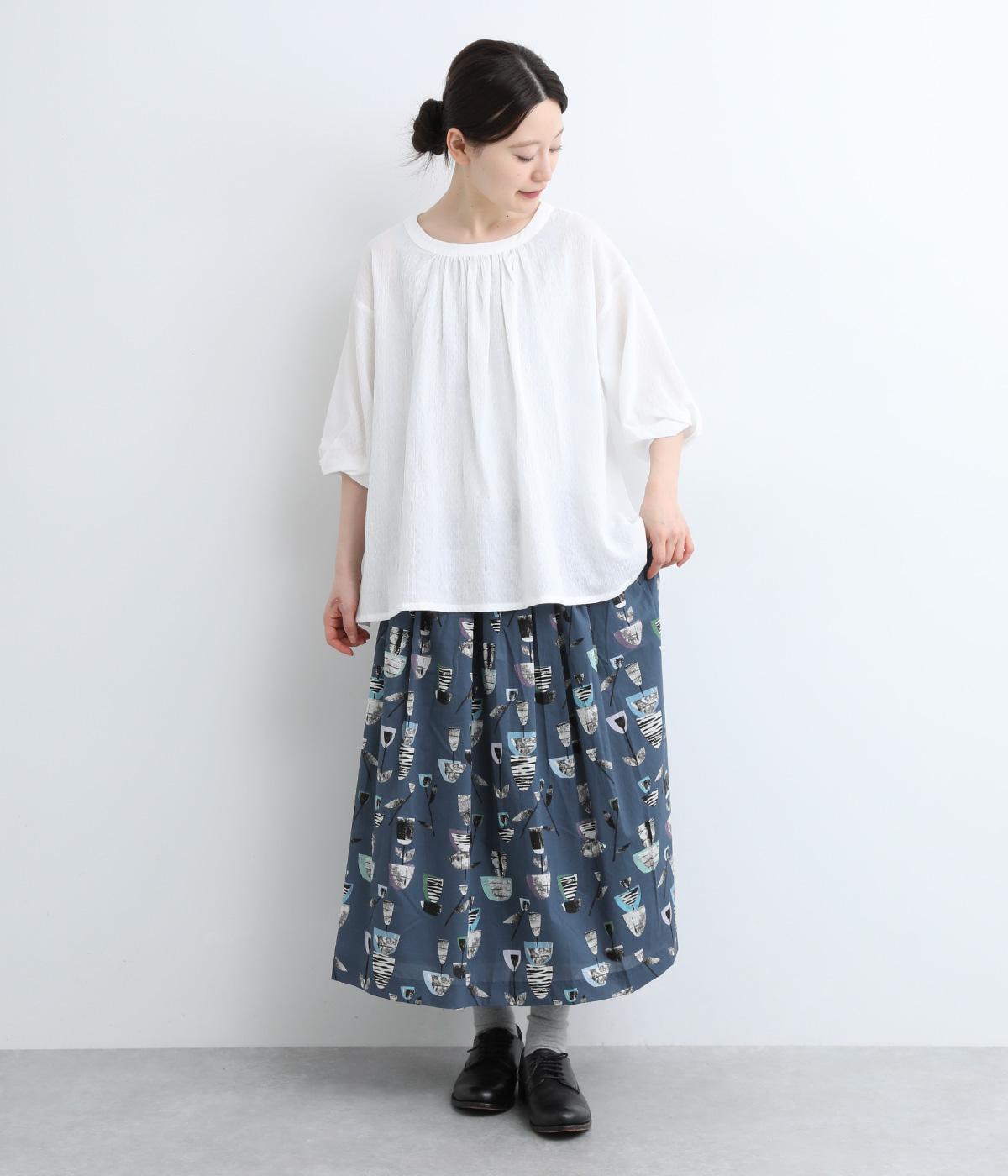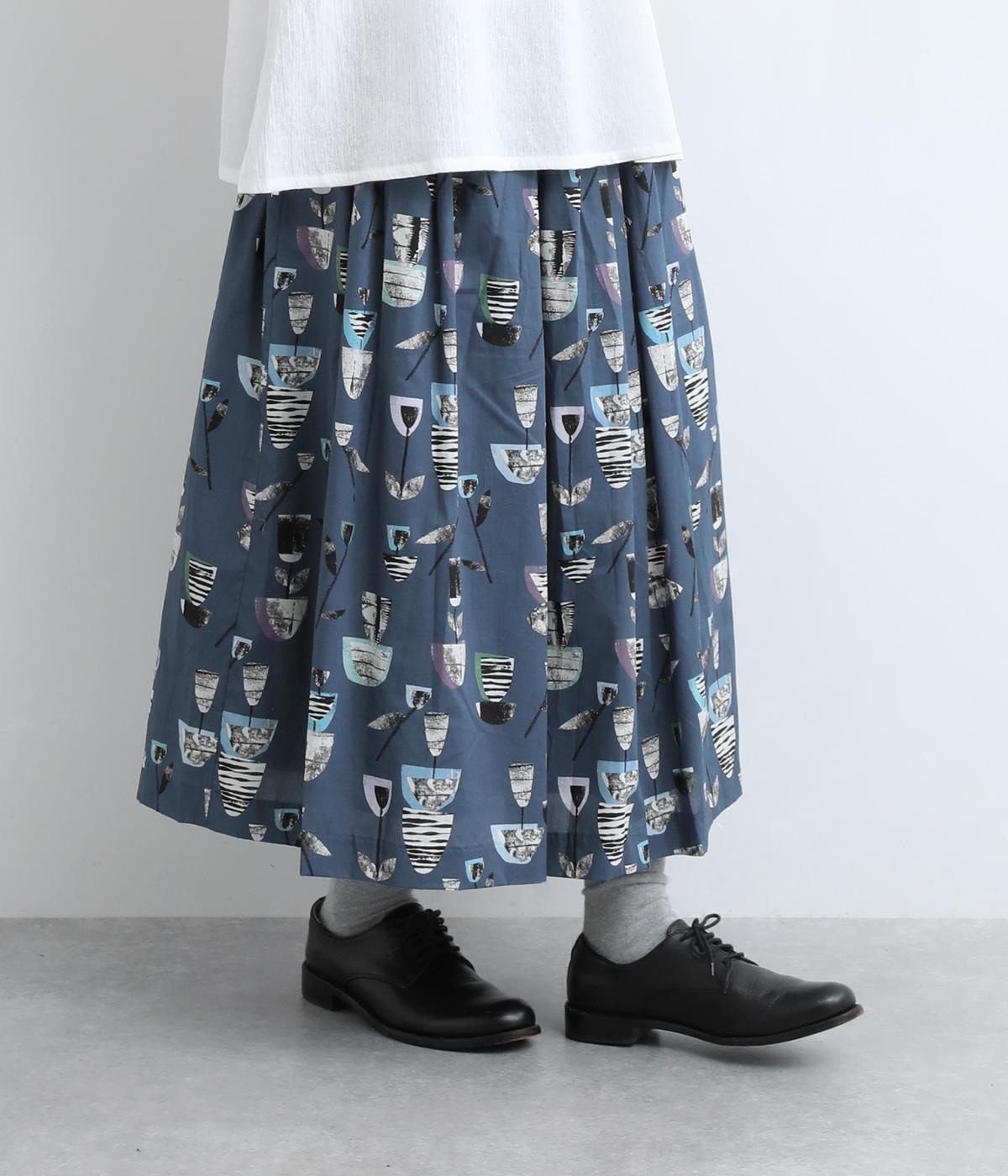 前スカートにはタック、後スカートにはギャザーをたっぷり入れてフェミニンンテイストなシルエットを演出しています。ウエストはぐるりとゴム仕様で、内側の共紐でサイズ調節可能に。シューズやソックス合わせがたのしめる丈感も◎。