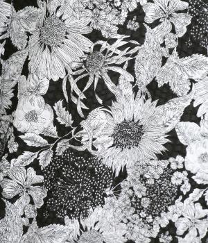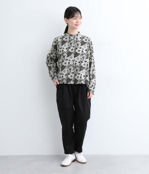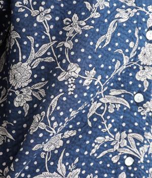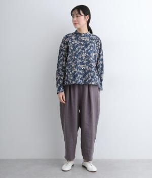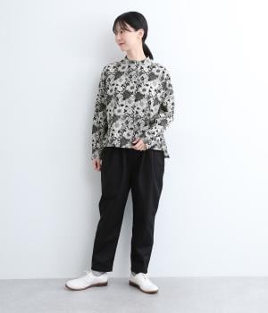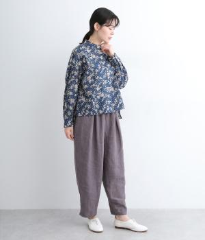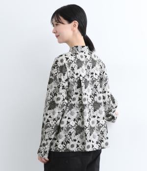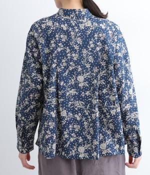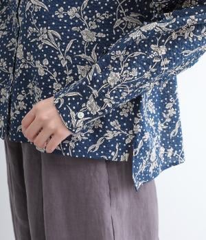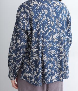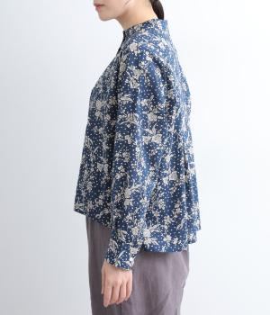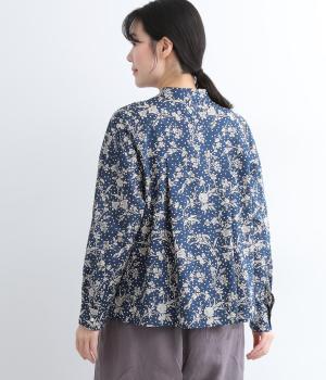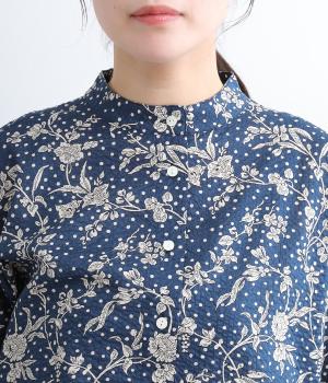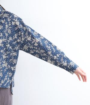リバティらしい生命力のある花柄をシックなカラーとすっきりしたスタンドネックで、落ち着いた雰囲気にまとめました。前後差をつけた裾サイドのスリットや後ろタックのゆとりなど、きちんとした印象を持たせつつ着心地よく仕上げました。