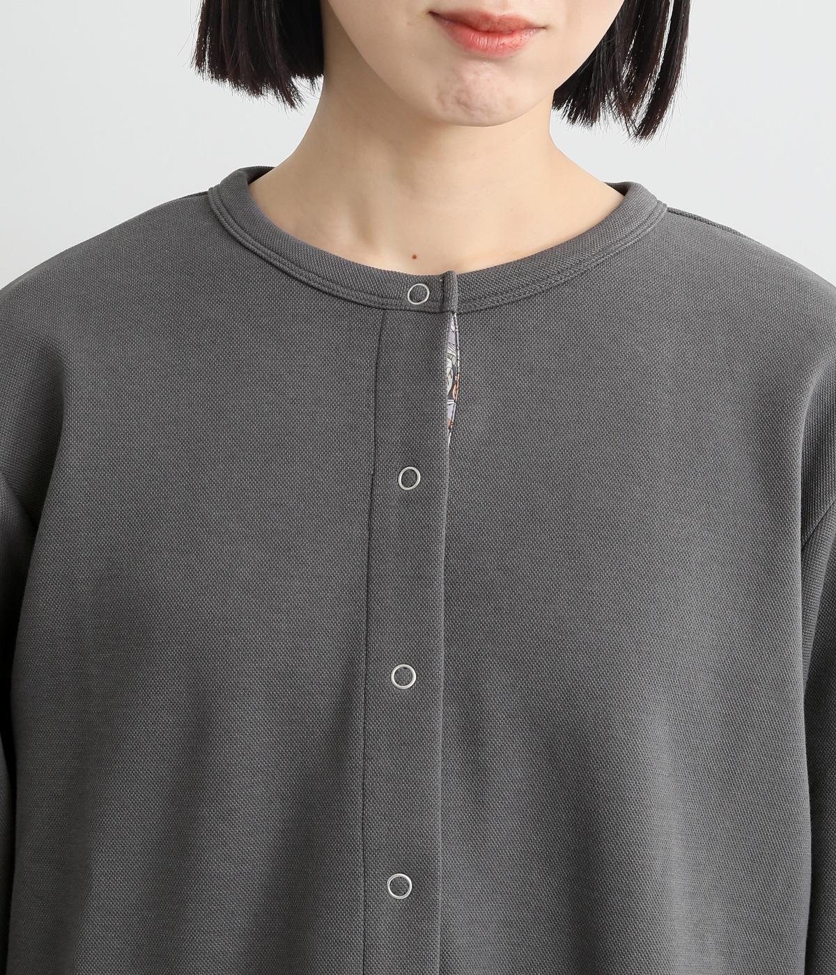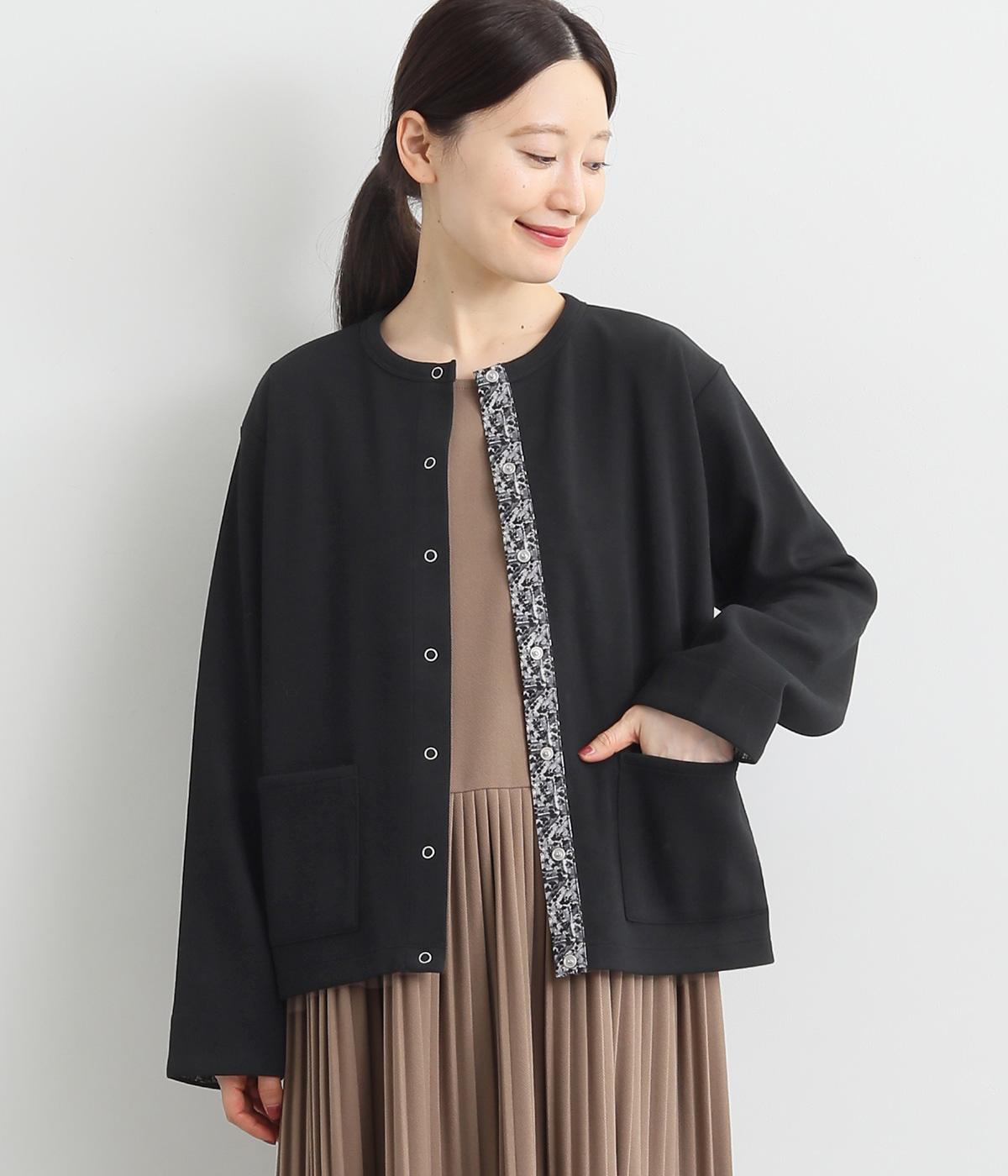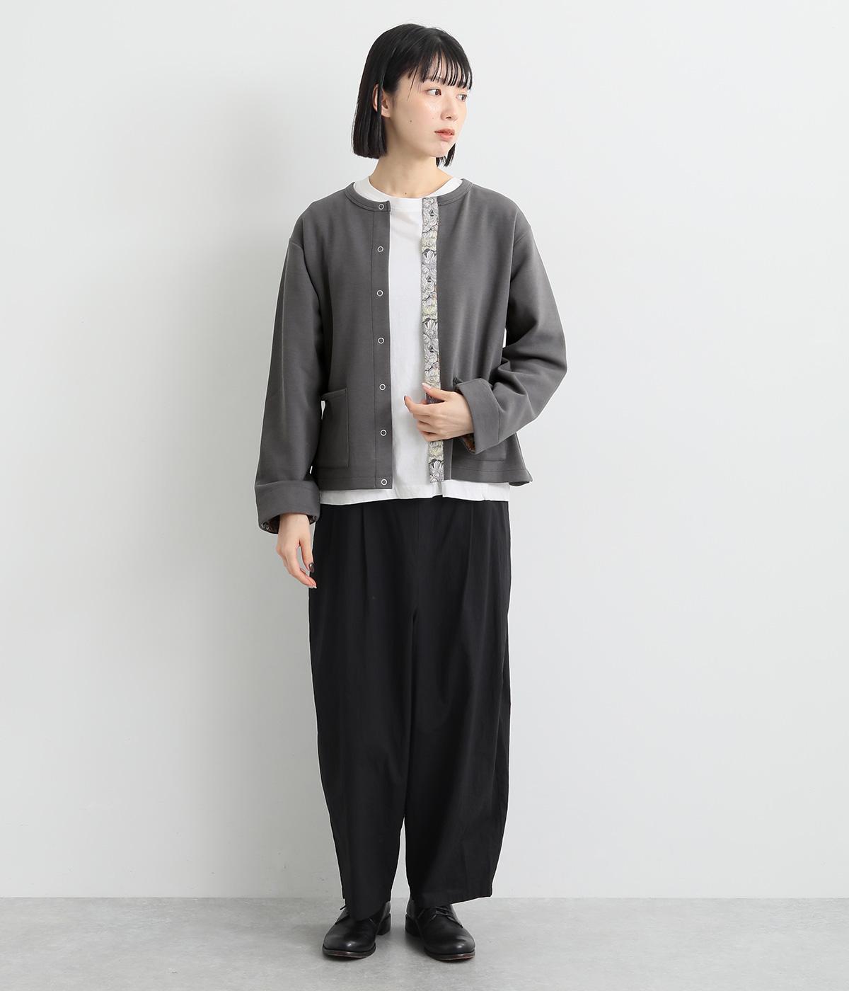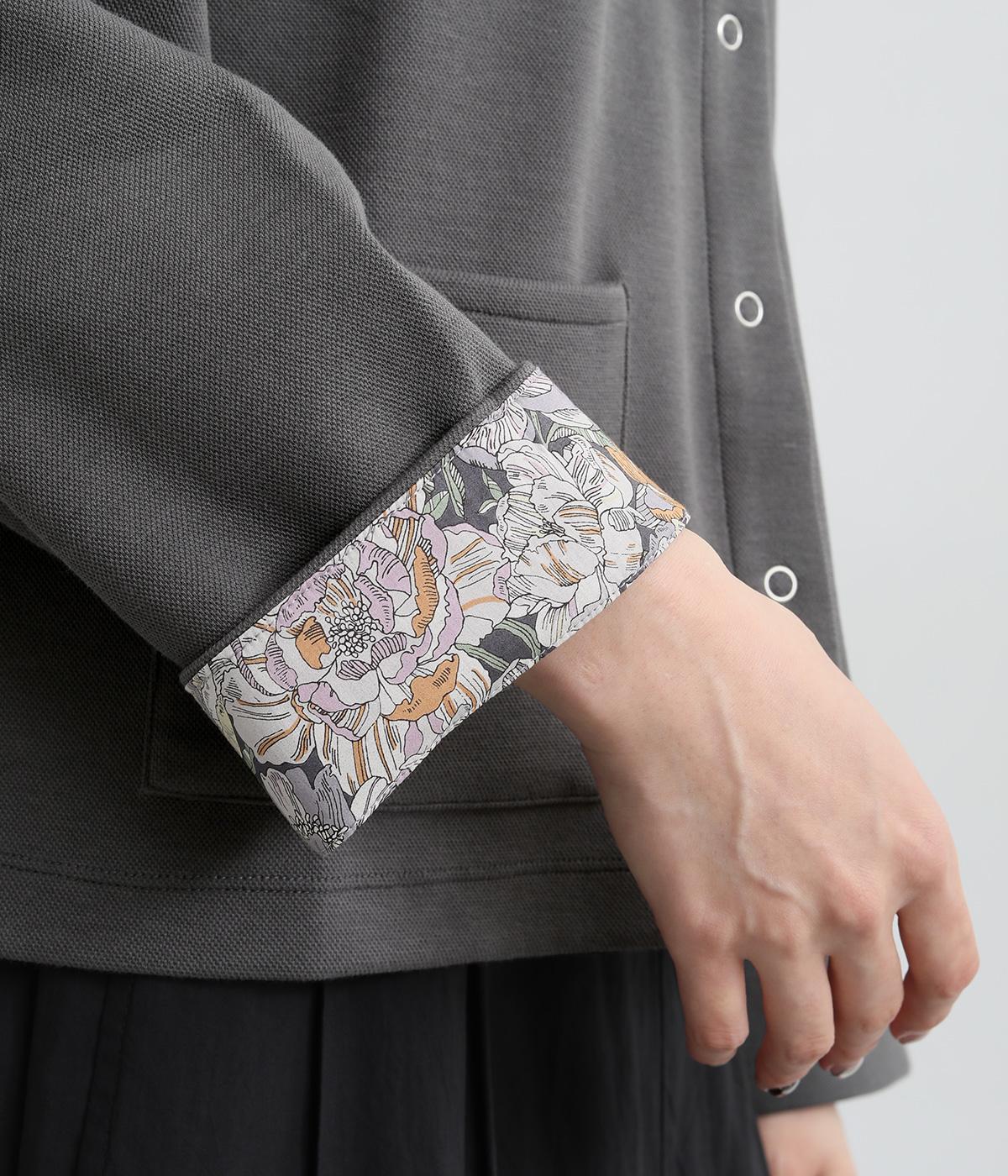 前立てと袖裏部分にリバティ生地をさりげなく取り入れたカーディガン。袖を折り返したり前を開けたりしたときに見える、大人っぽい繊細な柄が素敵です。クルーネックのベーシックなデザインで、さまざまな着こなしに合わせやすいのも◎。スナップボタン仕様で着脱もイージーです。
