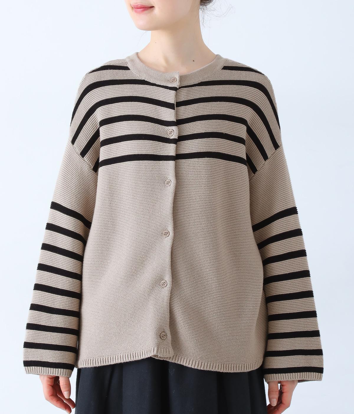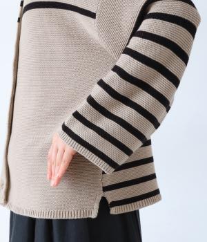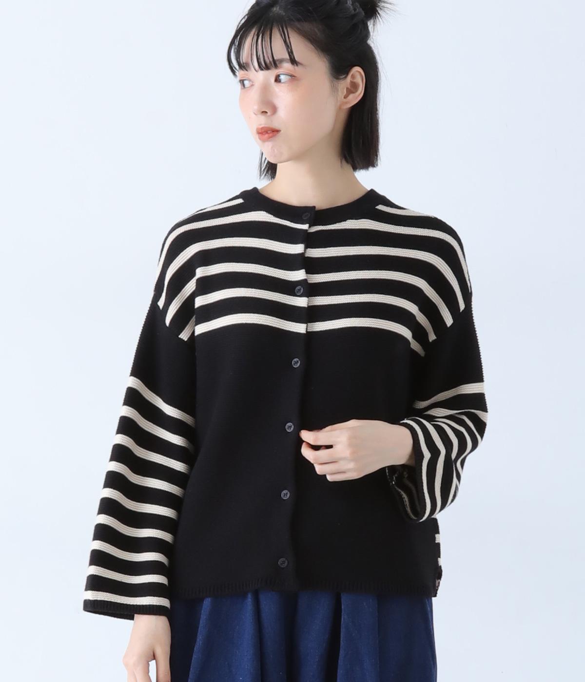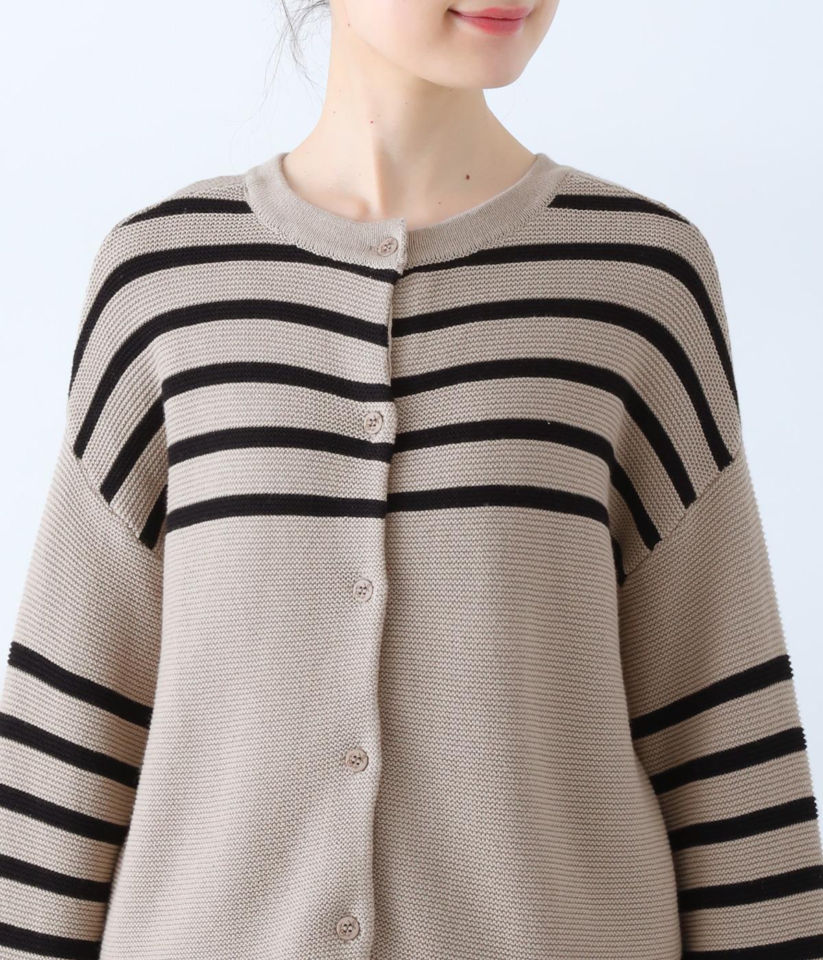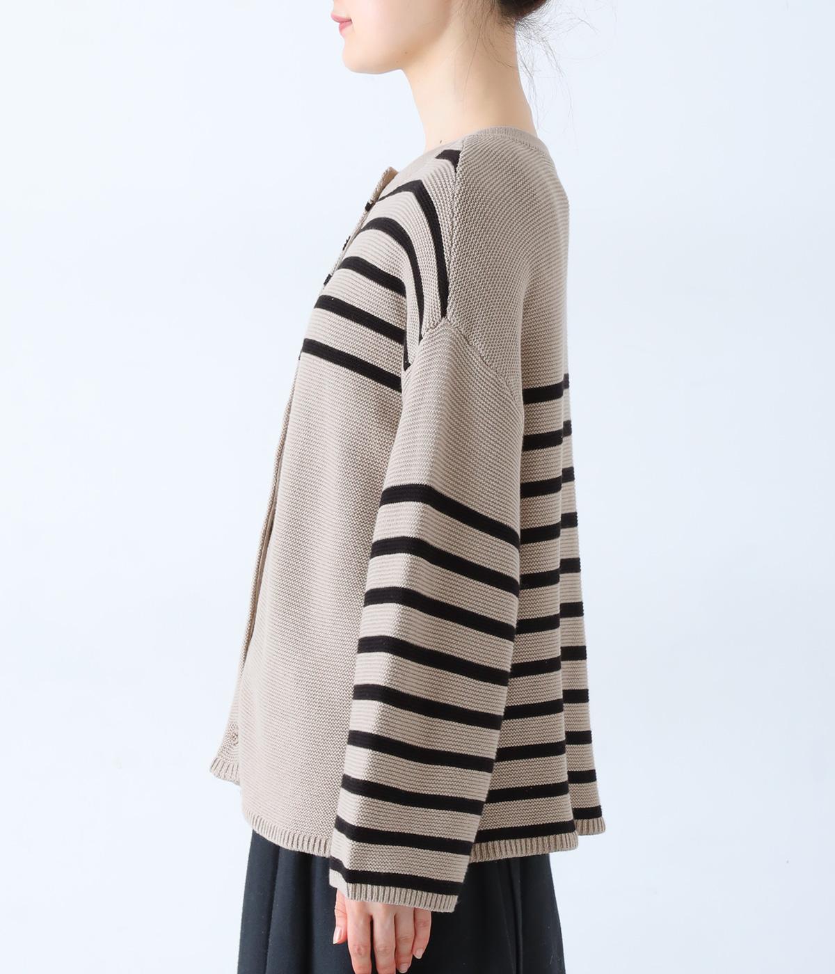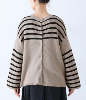 前後2way仕様のニットカーディガン。無地部分とボーダーのバランスにこだわった、カジュアルさをおさえた大人らしいルックスが◎。袖と身幅にゆとりを持たせつつも、柄の効果ですっきりとした印象に。羽織りとしてもプルオーバーとしても活躍する便利な一着です。