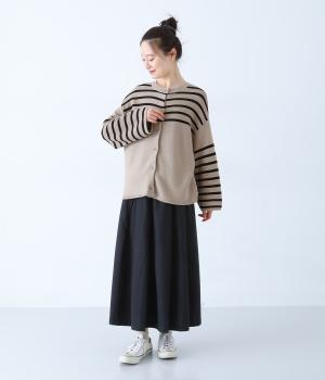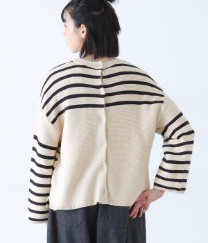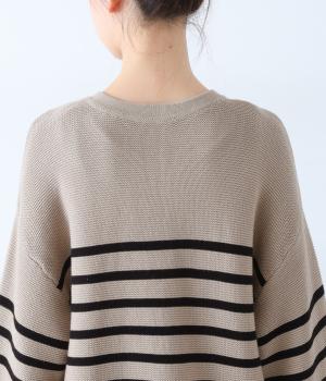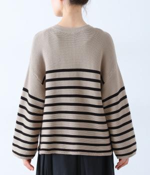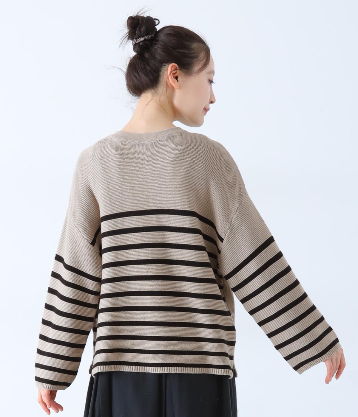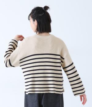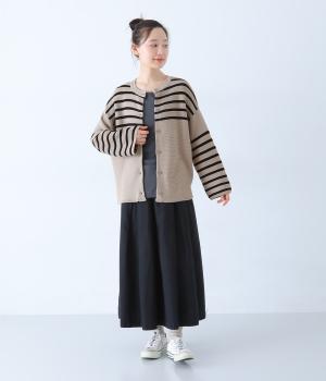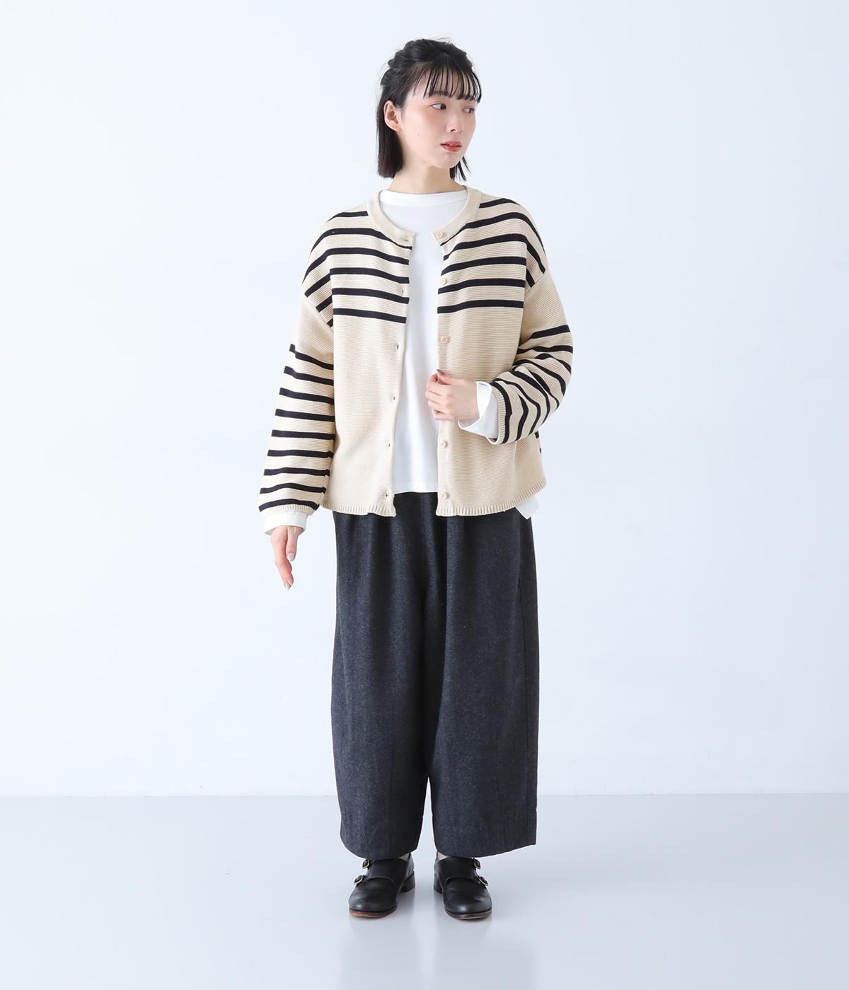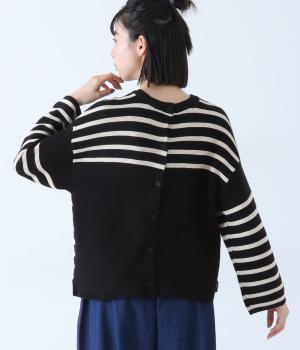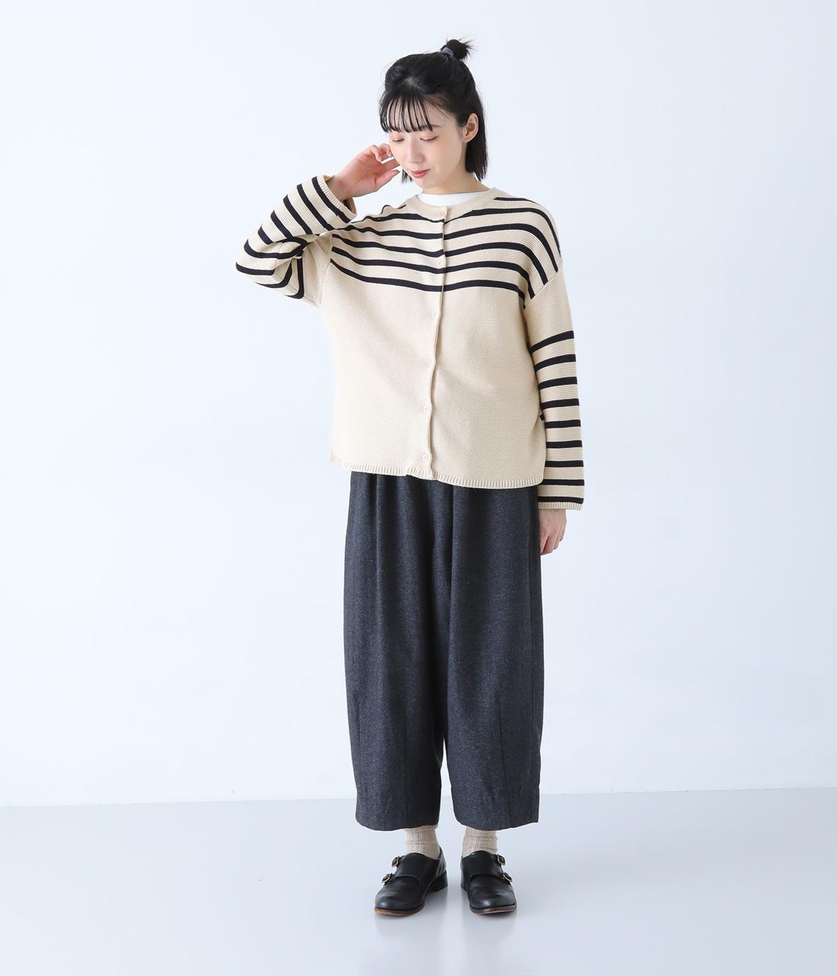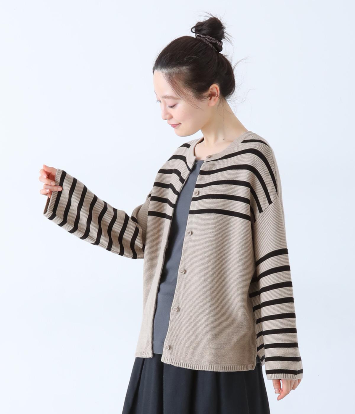 前後2way仕様のニットカーディガン。無地部分とボーダーのバランスにこだわった、カジュアルさをおさえた大人らしいルックスが◎。袖と身幅にゆとりを持たせつつも、柄の効果ですっきりとした印象に。羽織りとしてもプルオーバーとしても活躍する便利な一着です。
