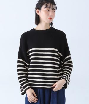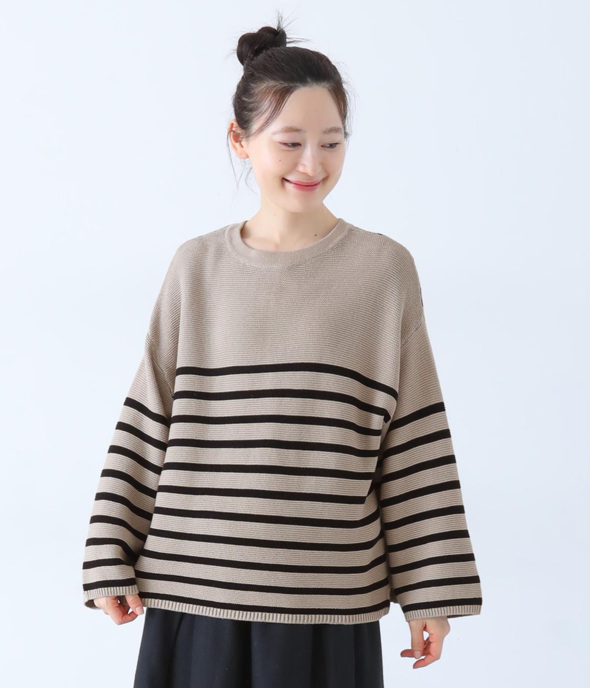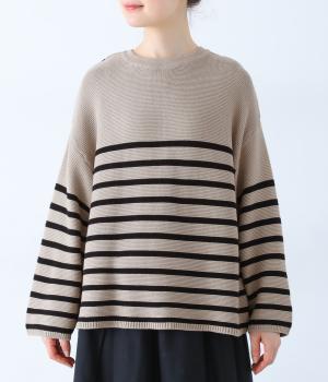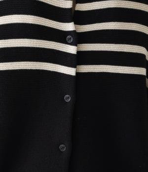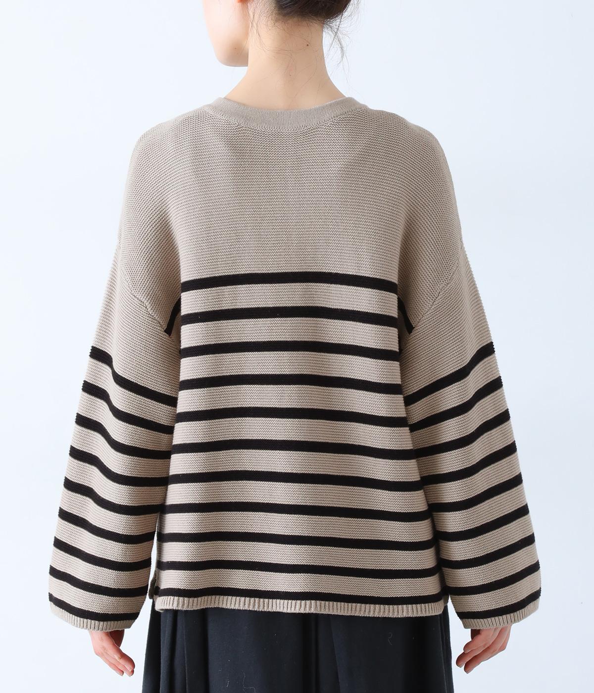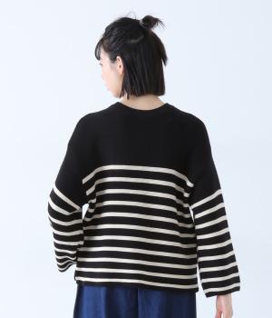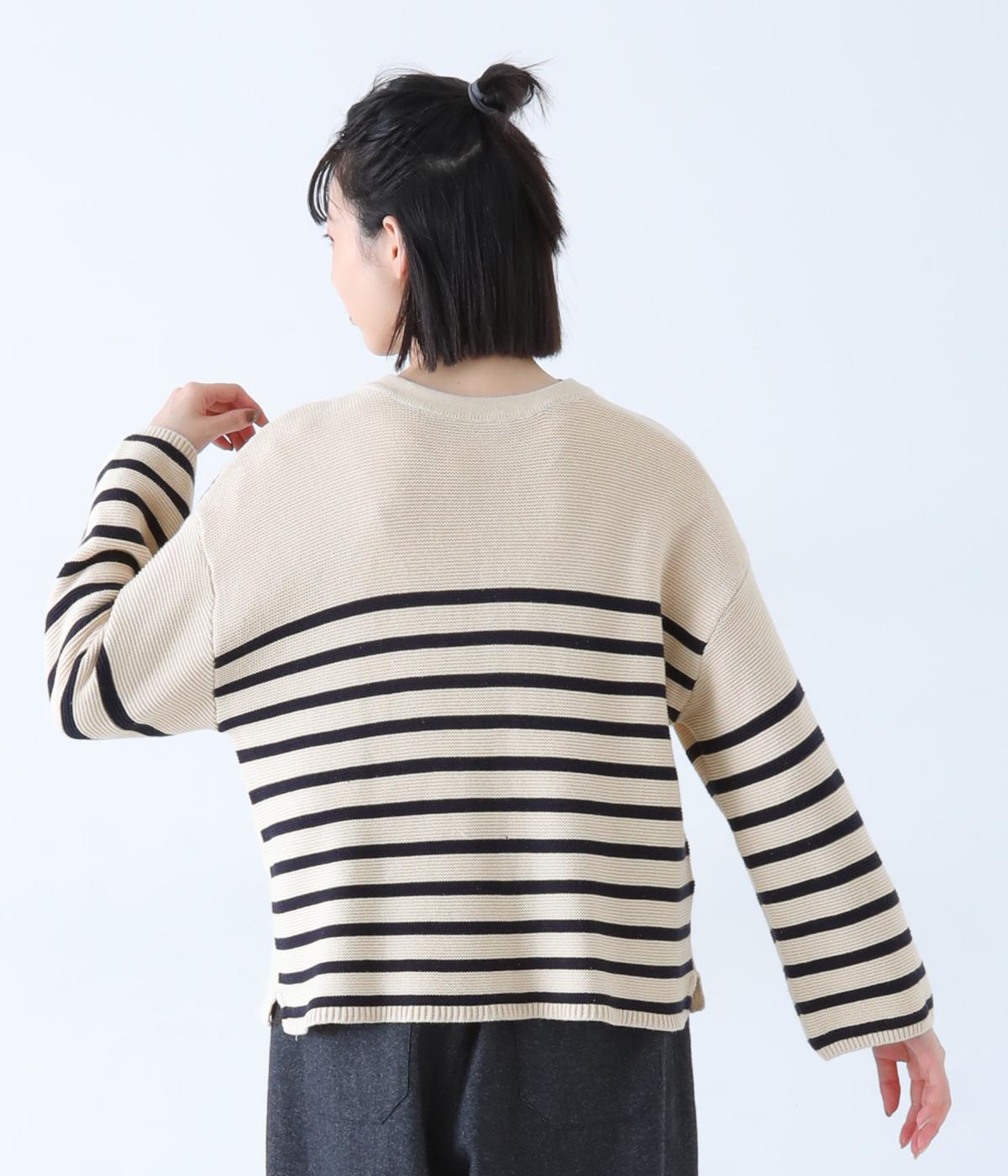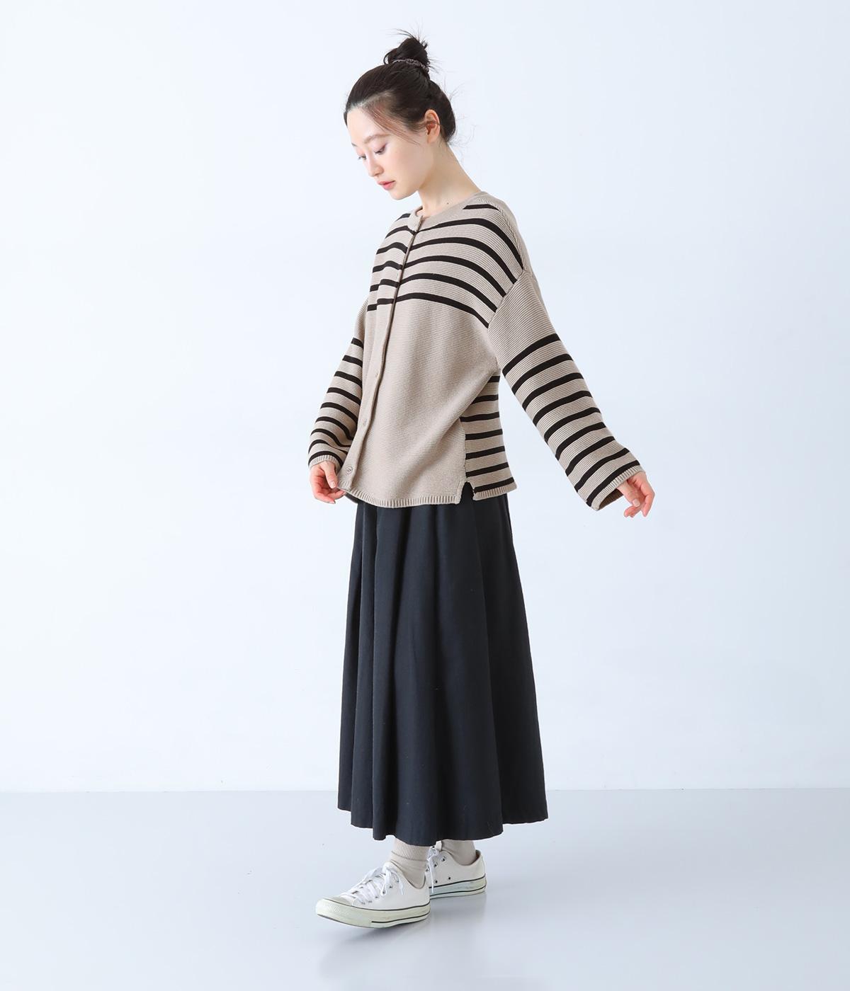 前後2way仕様のニットカーディガン。無地部分とボーダーのバランスにこだわった、カジュアルさをおさえた大人らしいルックスが◎。袖と身幅にゆとりを持たせつつも、柄の効果ですっきりとした印象に。羽織りとしてもプルオーバーとしても活躍する便利な一着です。