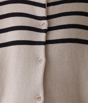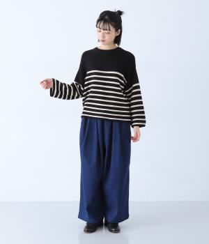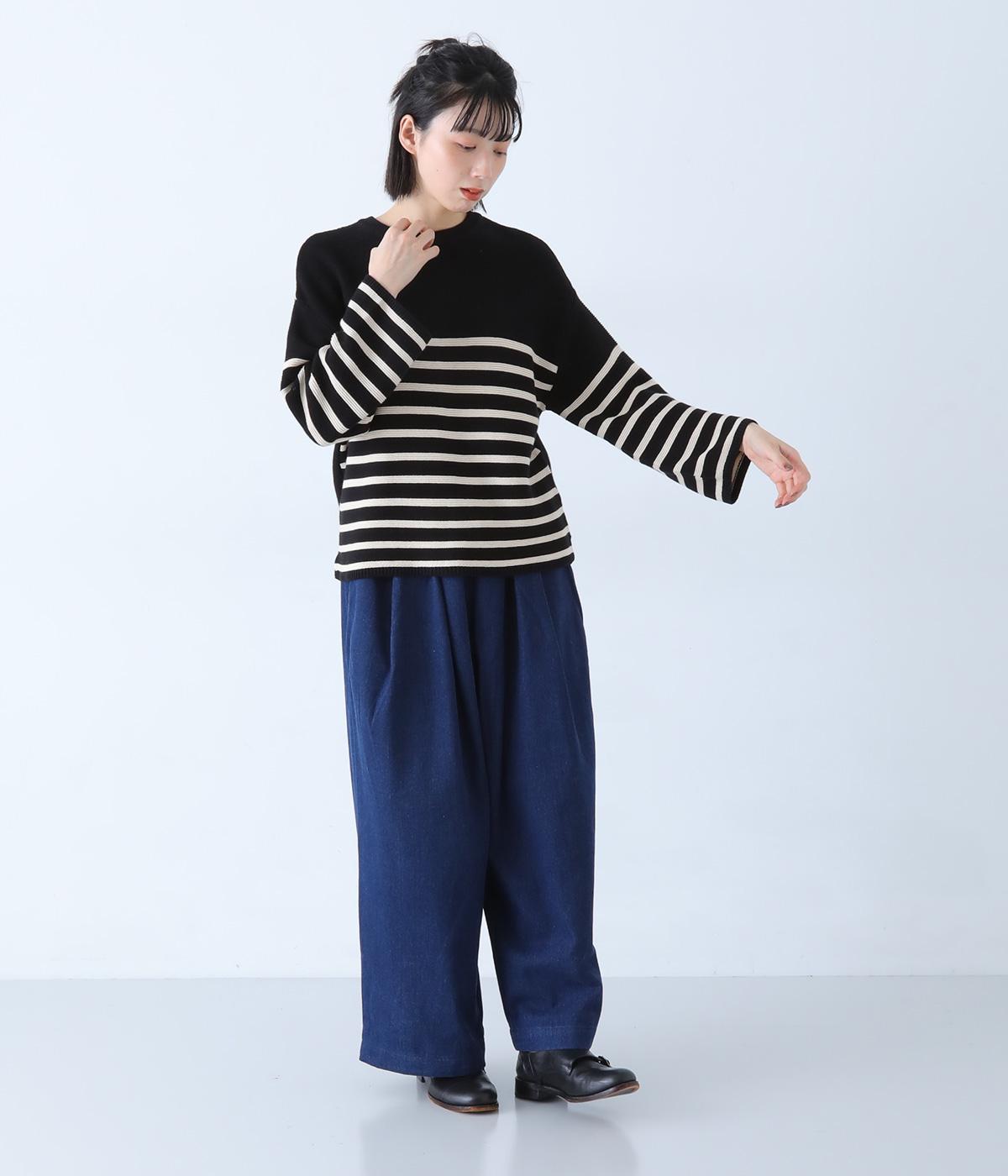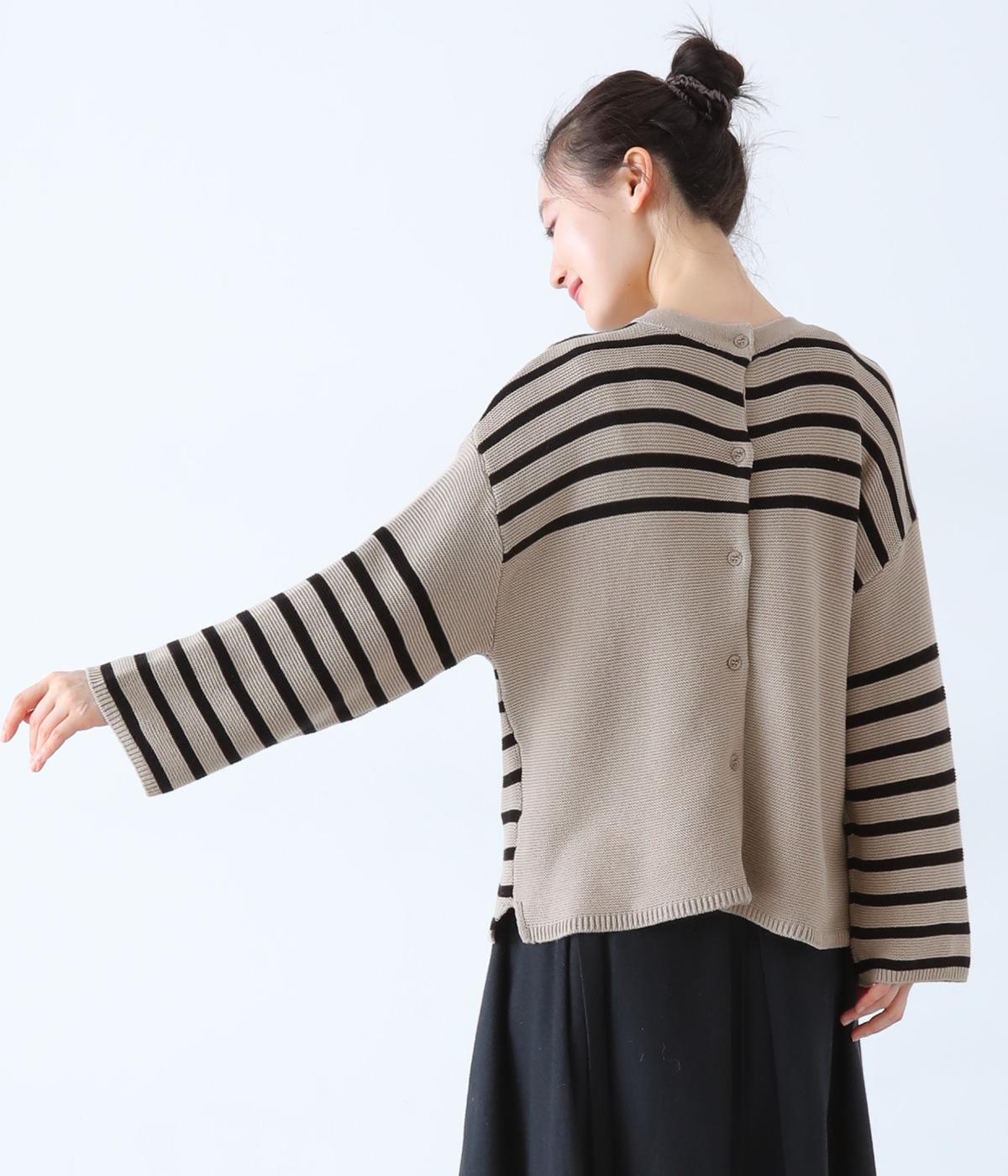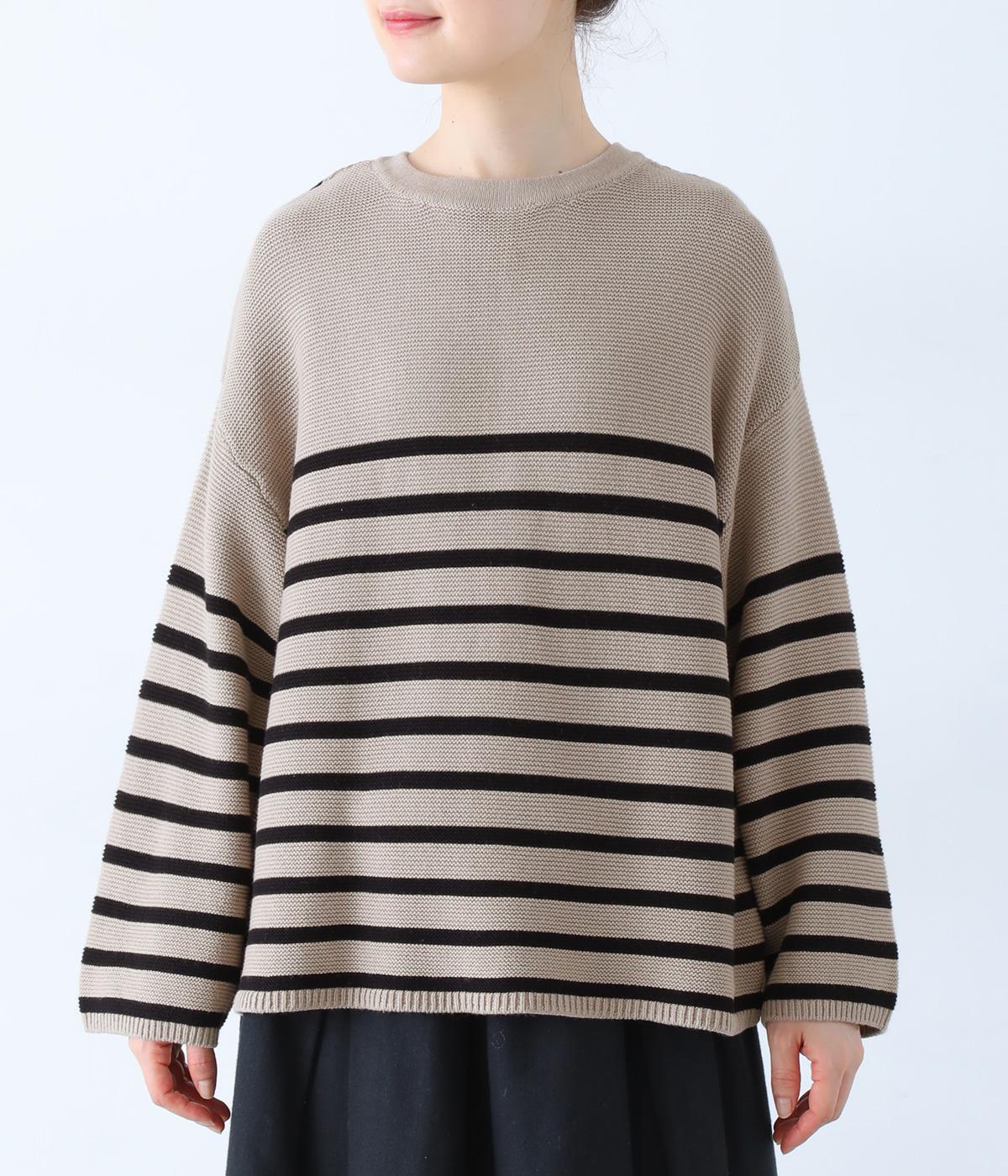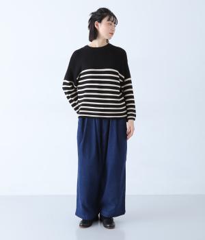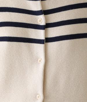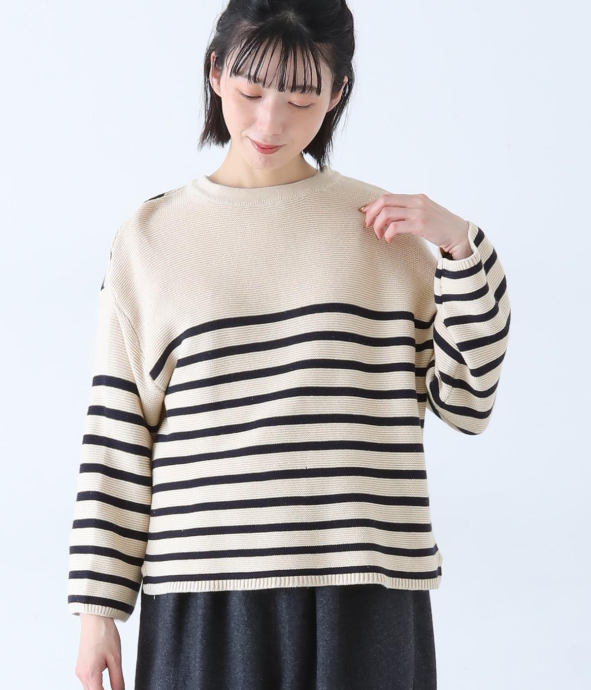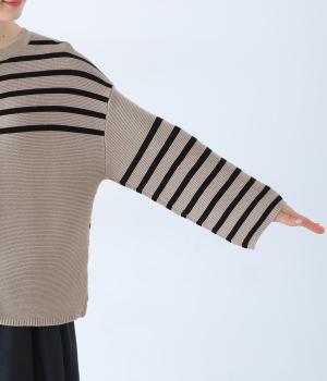前後2way仕様のニットカーディガン。無地部分とボーダーのバランスにこだわった、カジュアルさをおさえた大人らしいルックスが◎。袖と身幅にゆとりを持たせつつも、柄の効果ですっきりとした印象に。羽織りとしてもプルオーバーとしても活躍する便利な一着です。