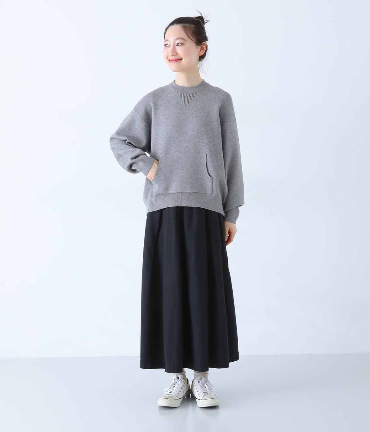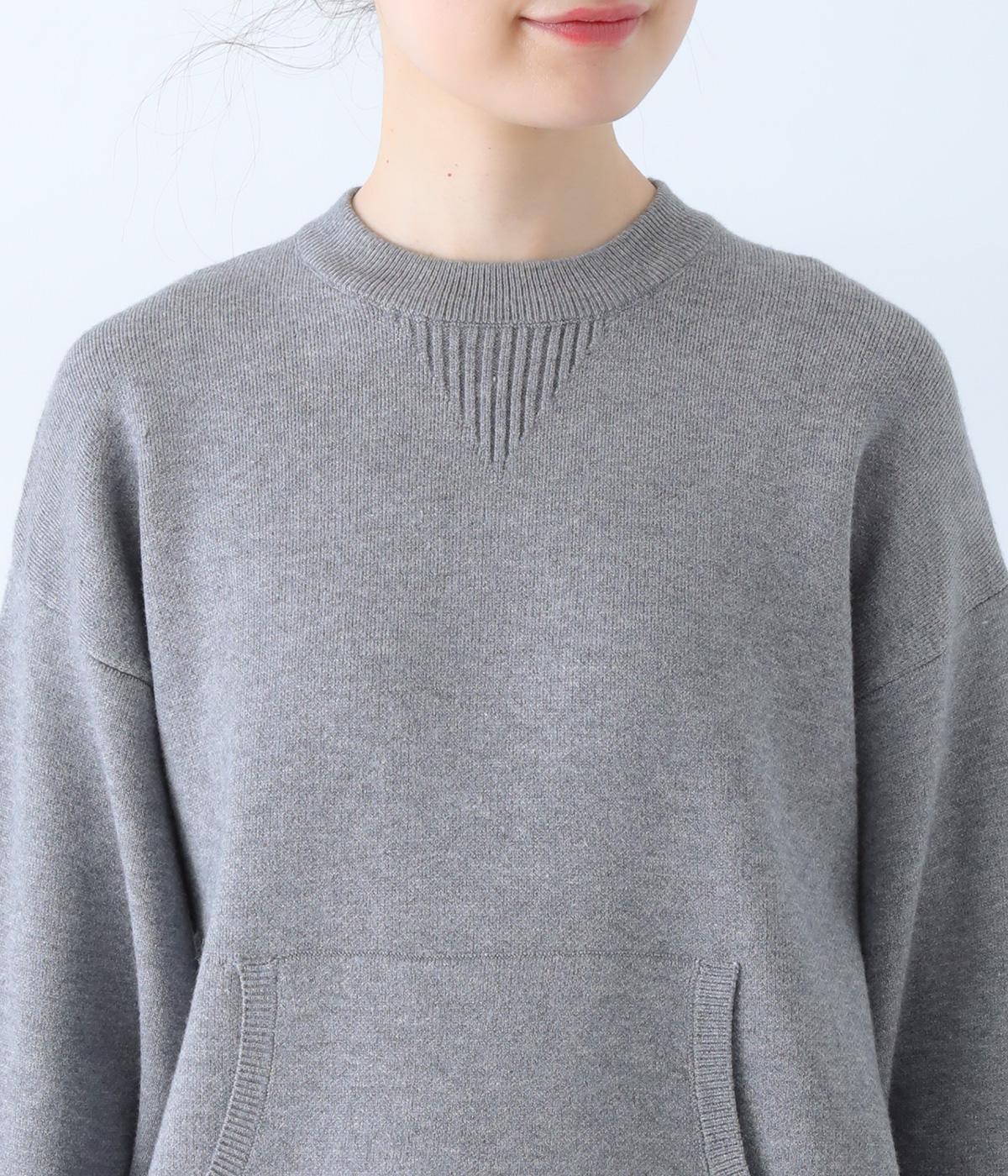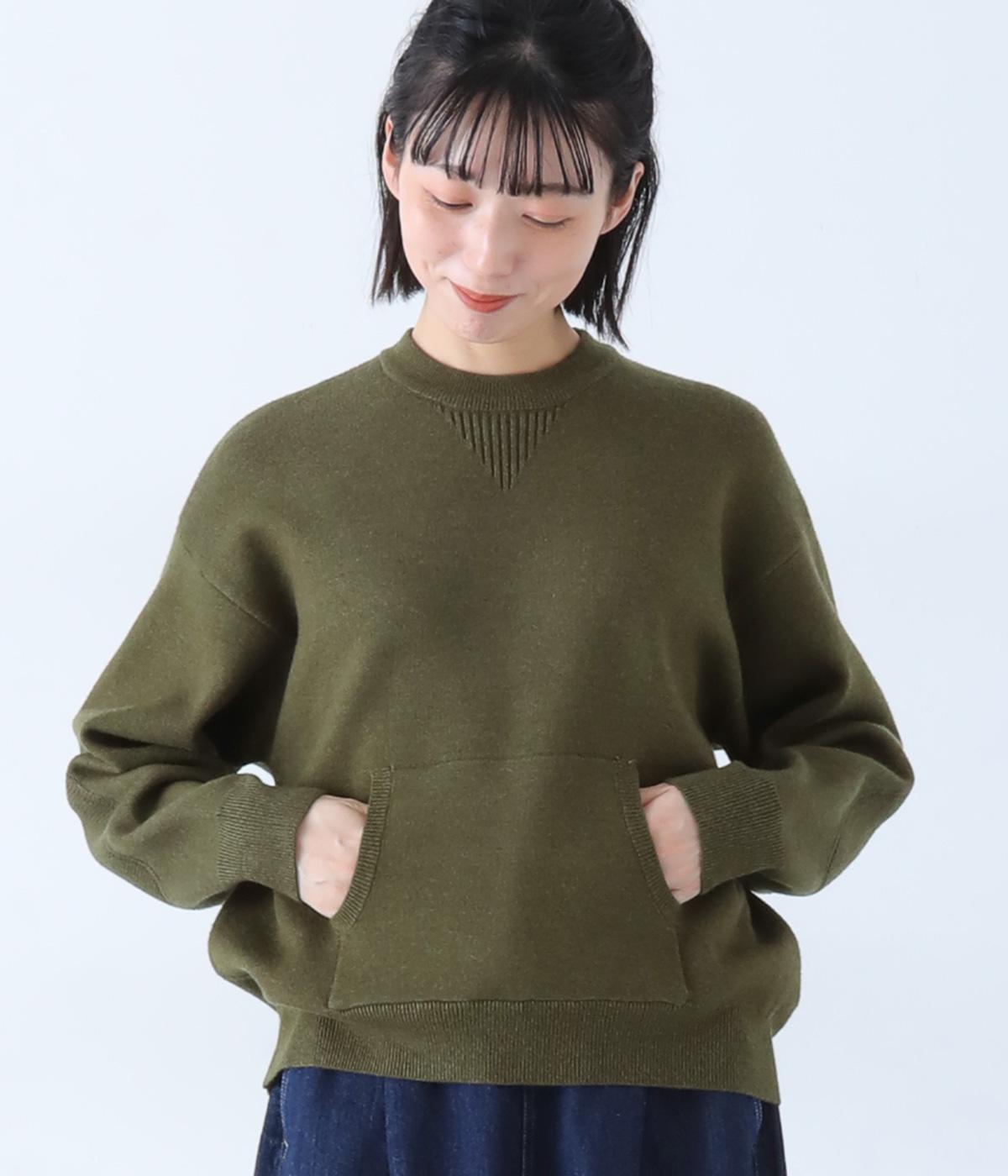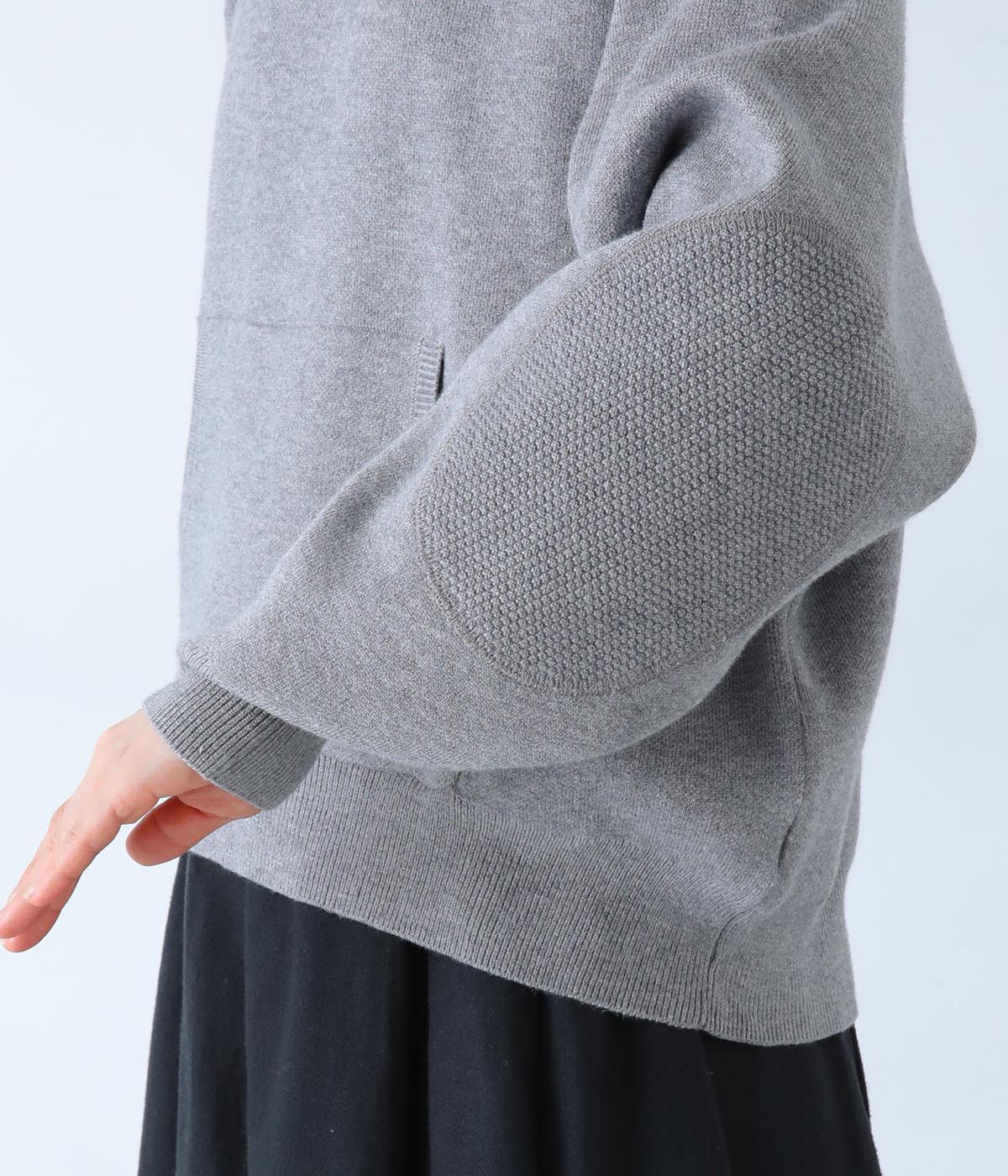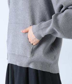 逆三角形のディテールを編地で表現したスウェット風ニット。フロントのカンガルーポケットやひじのエルボーパッチもスウェット感をアップさせるポイントです。ニット生地なのでカジュアルすぎず、リラクシーなパンツ合わせも手抜き感なくたのしめます。