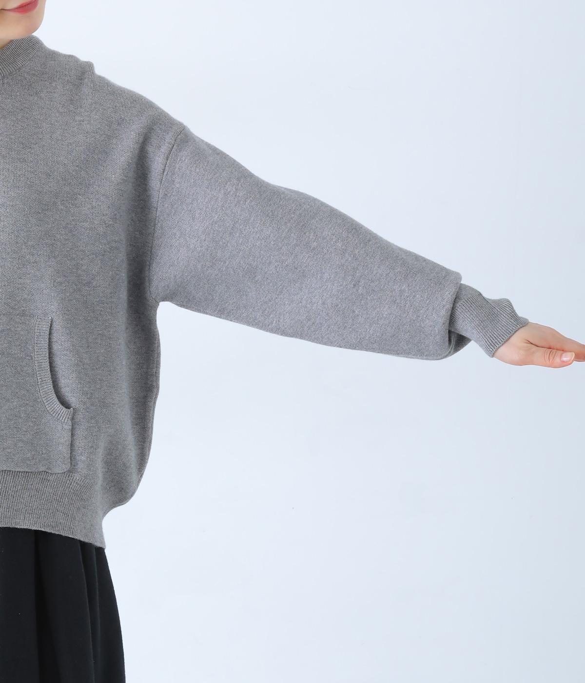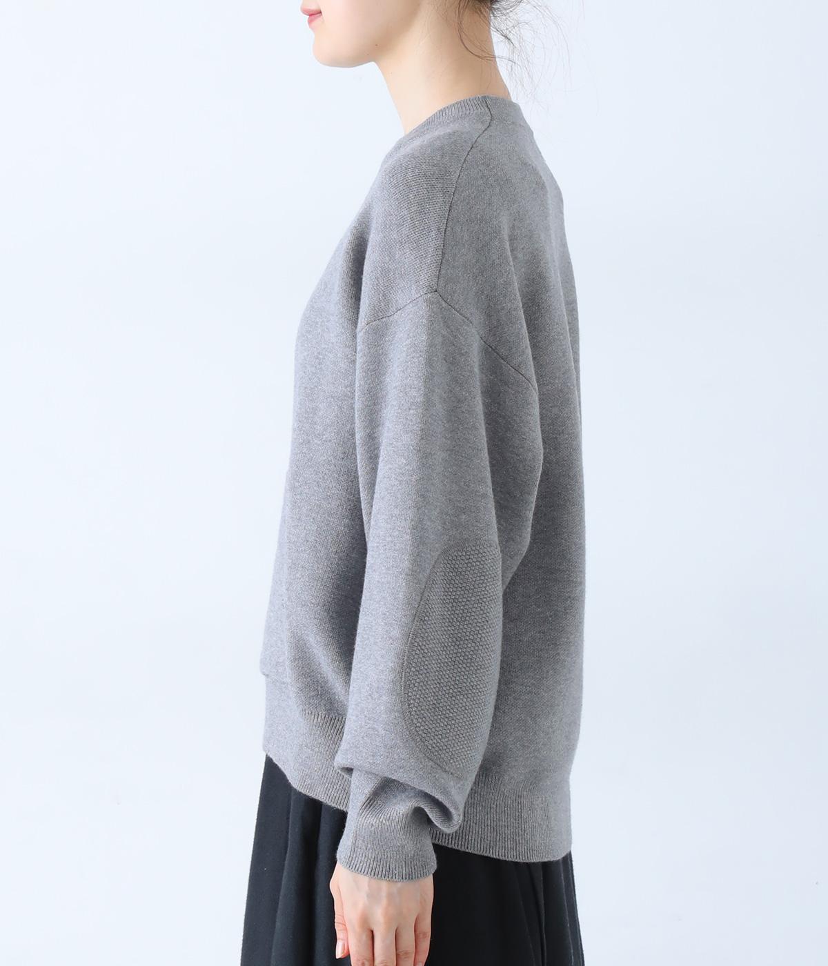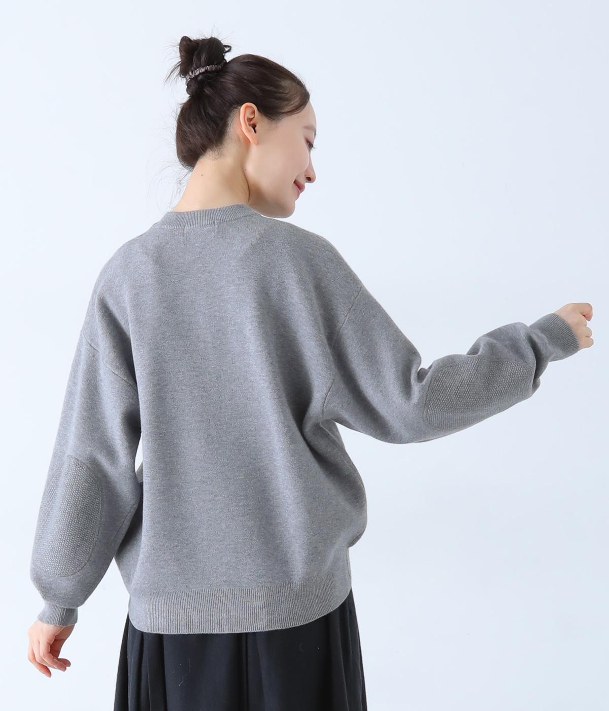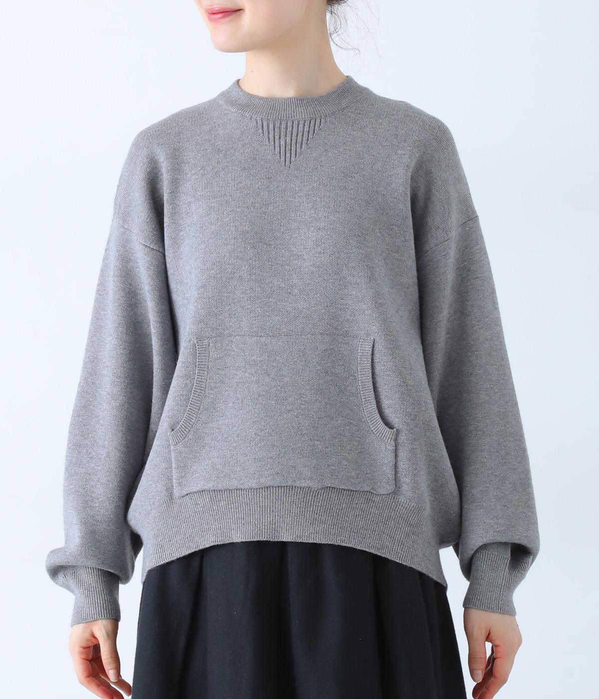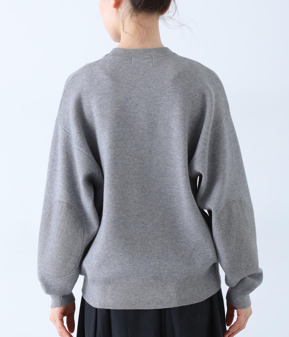 逆三角形のディテールを編地で表現したスウェット風ニット。フロントのカンガルーポケットやひじのエルボーパッチもスウェット感をアップさせるポイントです。ニット生地なのでカジュアルすぎず、リラクシーなパンツ合わせも手抜き感なくたのしめます。