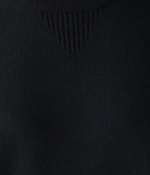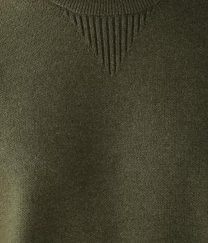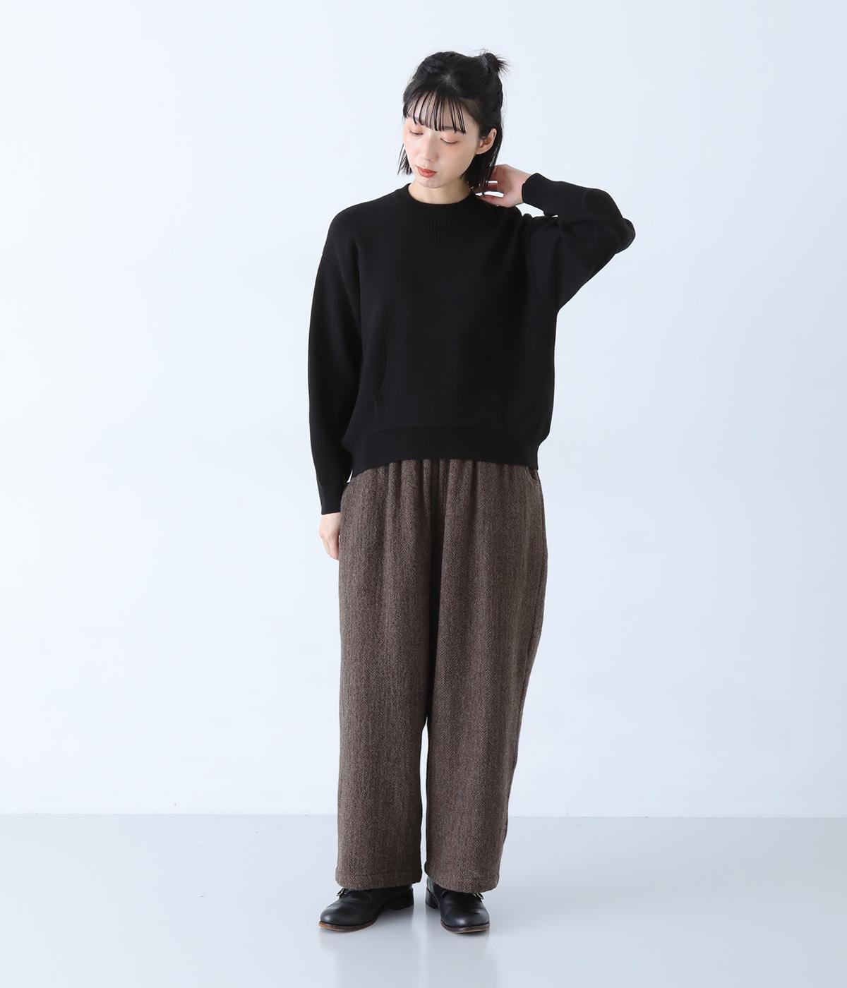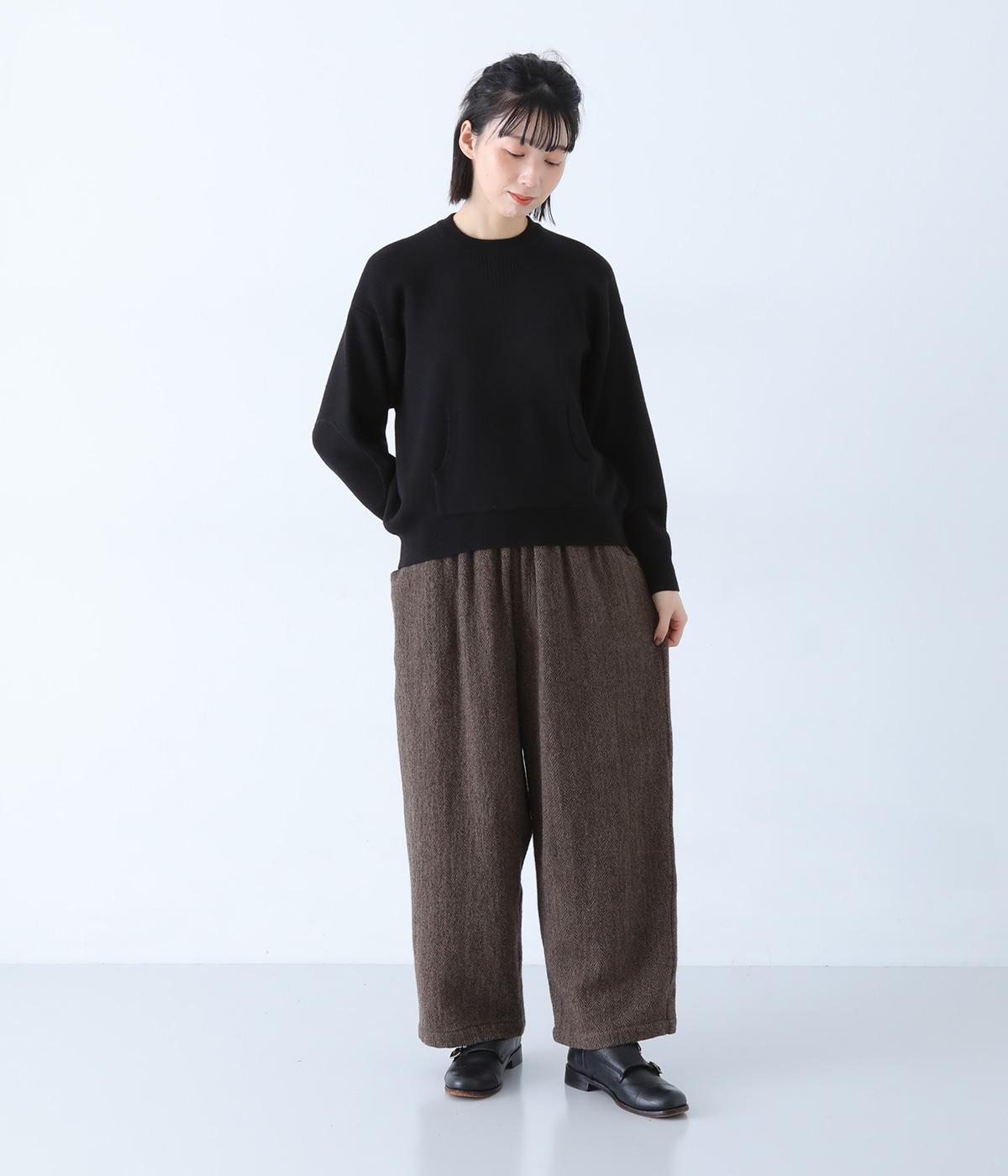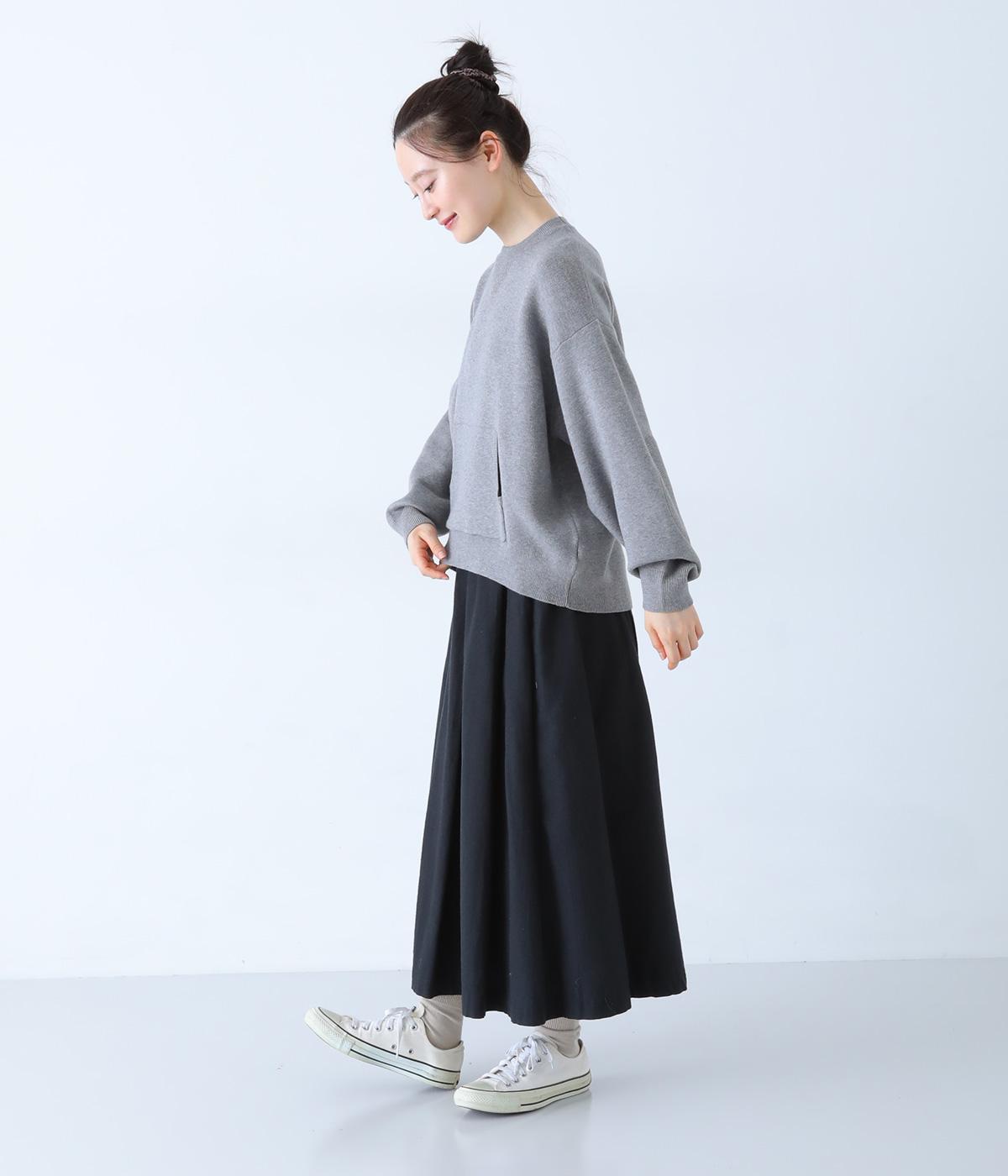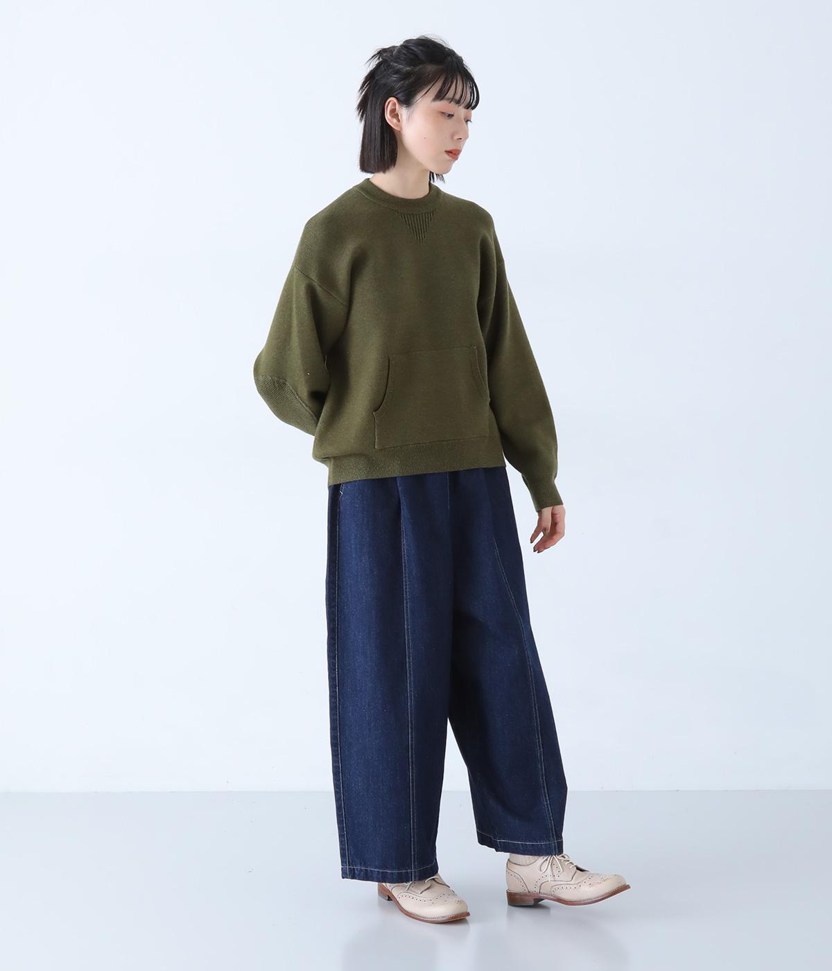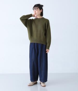逆三角形のディテールを編地で表現したスウェット風ニット。フロントのカンガルーポケットやひじのエルボーパッチもスウェット感をアップさせるポイントです。ニット生地なのでカジュアルすぎず、リラクシーなパンツ合わせも手抜き感なくたのしめます。