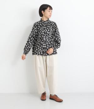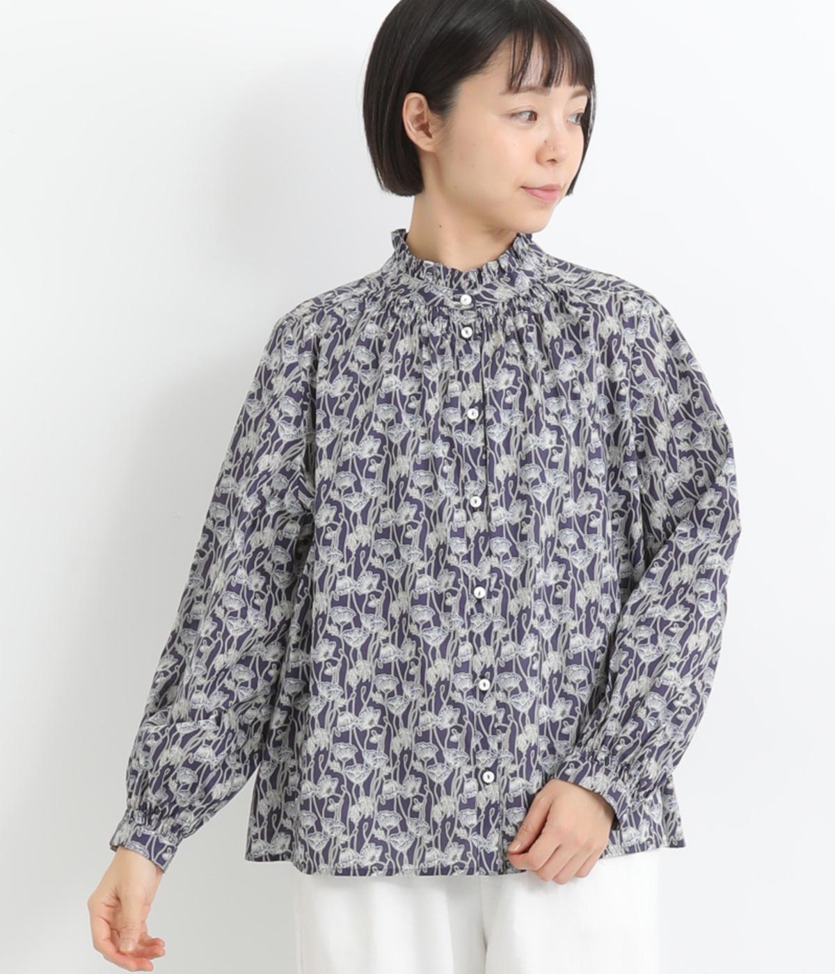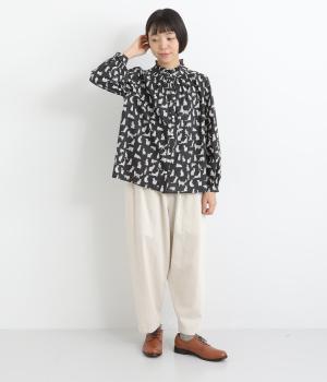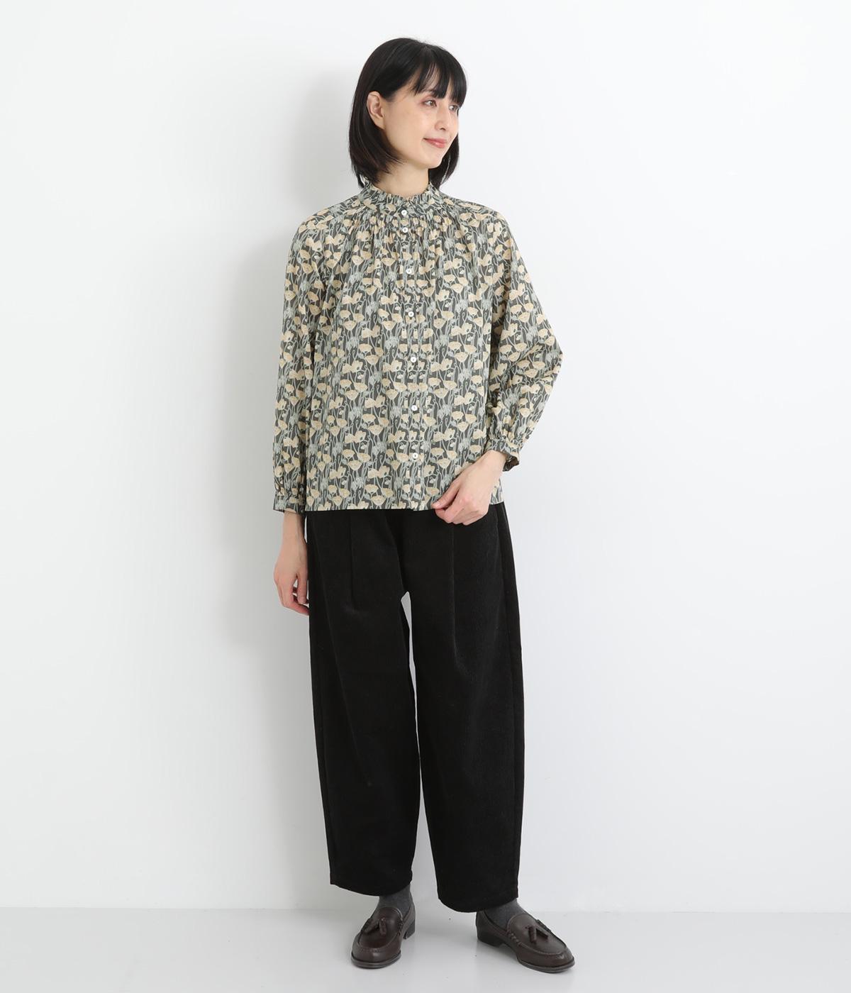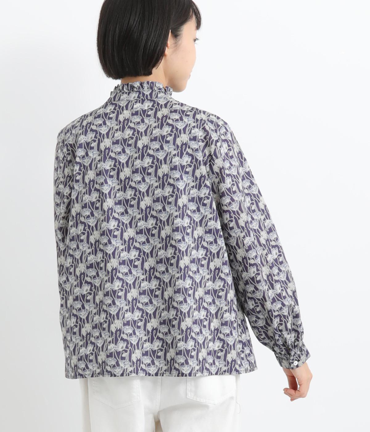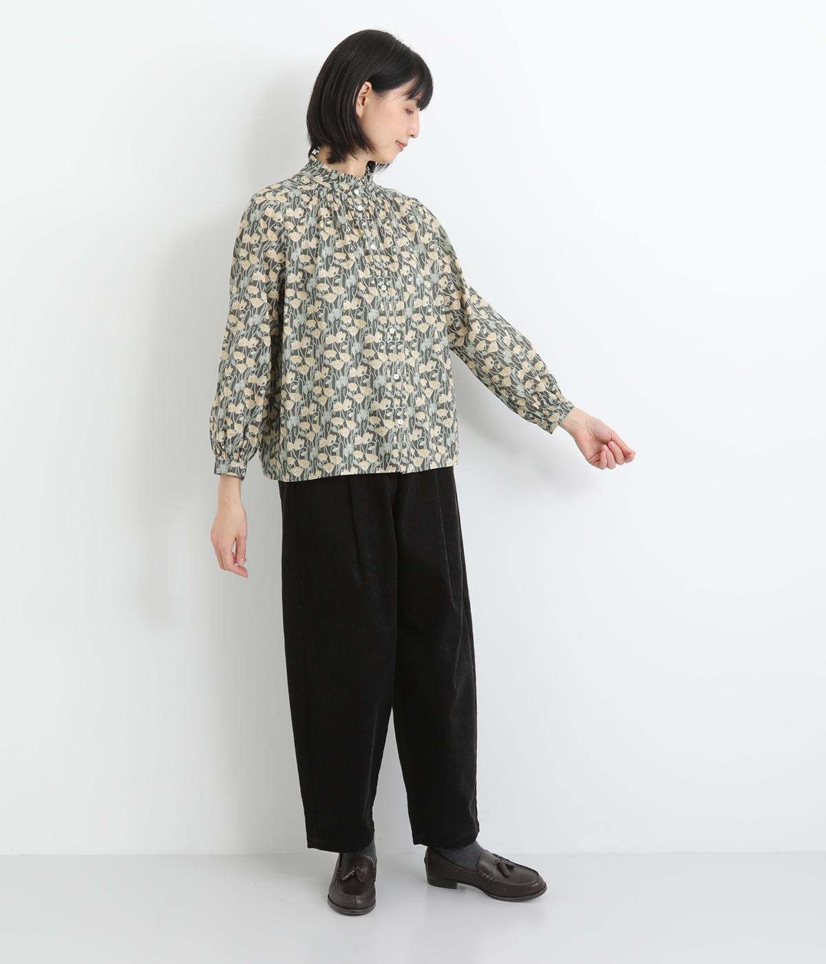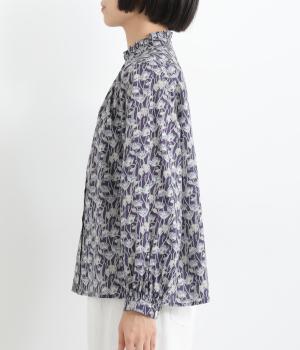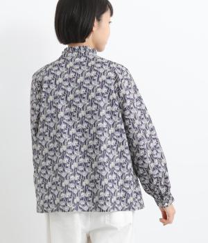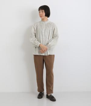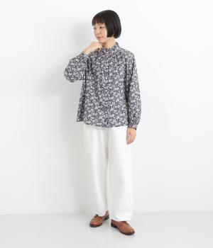 台襟から少しハイネック気味に配したタックフリルと袖シャーリングが、クラシカル&フェミニンな一枚。着こなしを彩る総柄で、ゆとりある身幅とほどよい着丈でスカートにもパンツにも好相性。きちんと見せたいシーンでも活躍します。