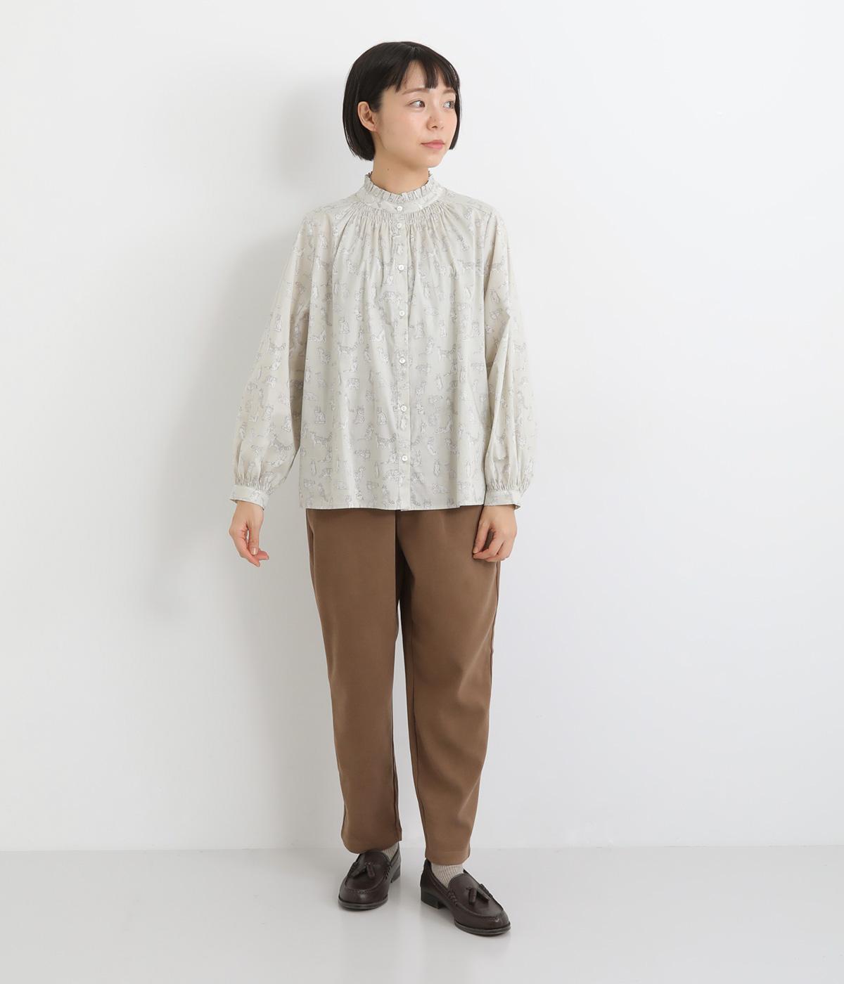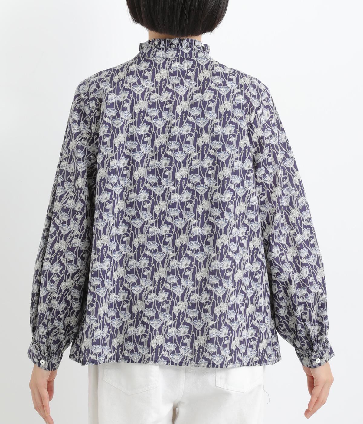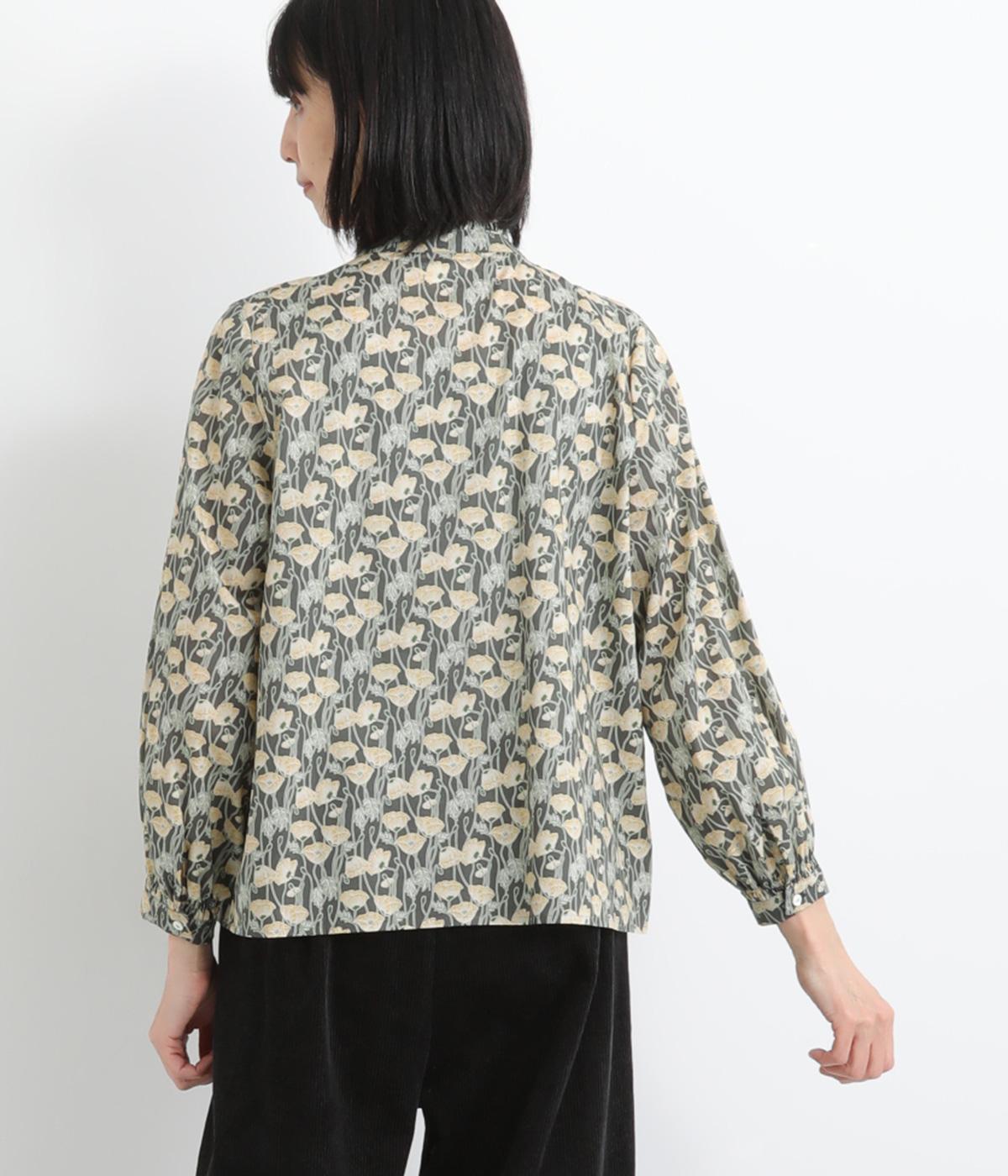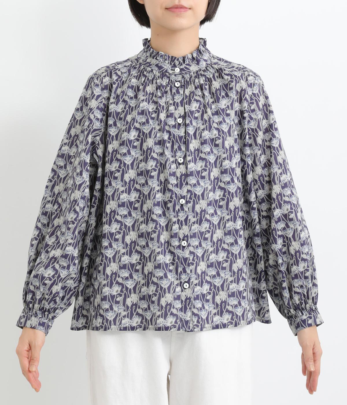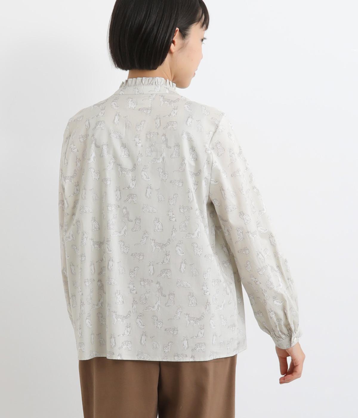 台襟から少しハイネック気味に配したタックフリルと袖シャーリングが、クラシカル&フェミニンな一枚。着こなしを彩る総柄で、ゆとりある身幅とほどよい着丈でスカートにもパンツにも好相性。きちんと見せたいシーンでも活躍します。