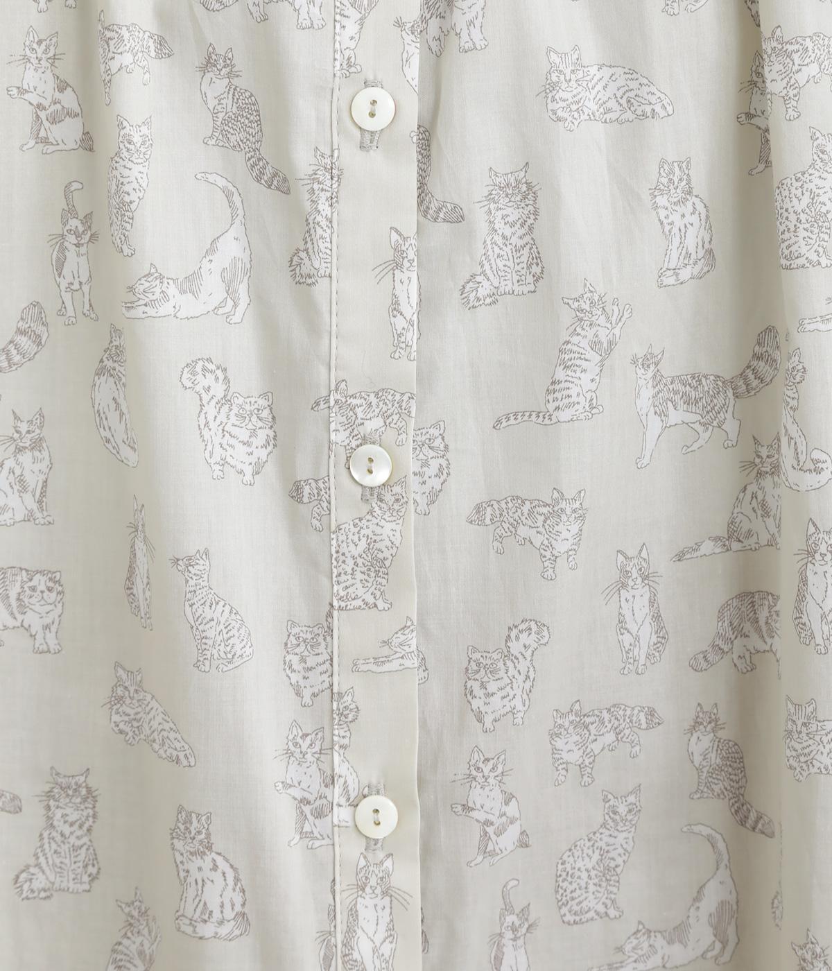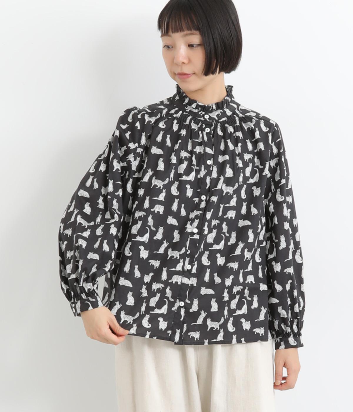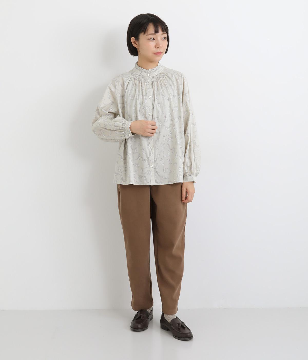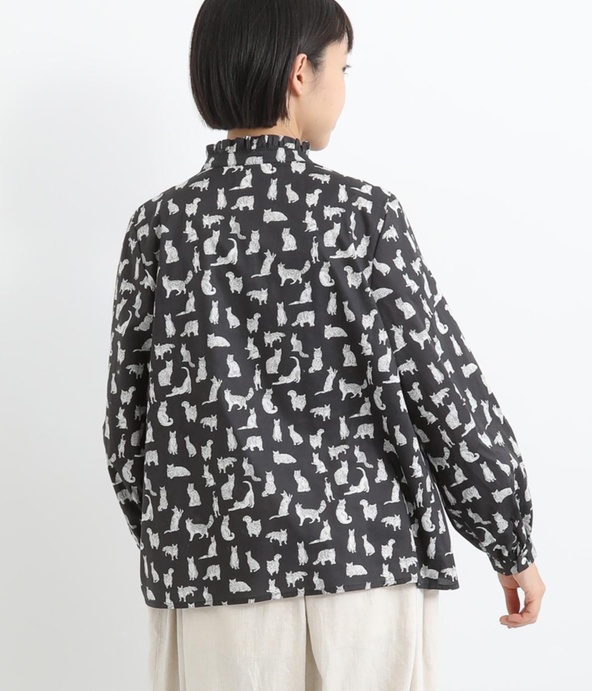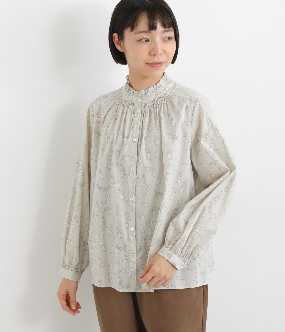 台襟から少しハイネック気味に配したタックフリルと袖シャーリングが、クラシカル&フェミニンな一枚。着こなしを彩る総柄で、ゆとりある身幅とほどよい着丈でスカートにもパンツにも好相性。きちんと見せたいシーンでも活躍します。
