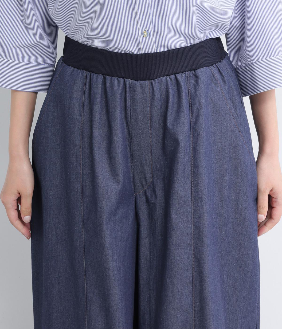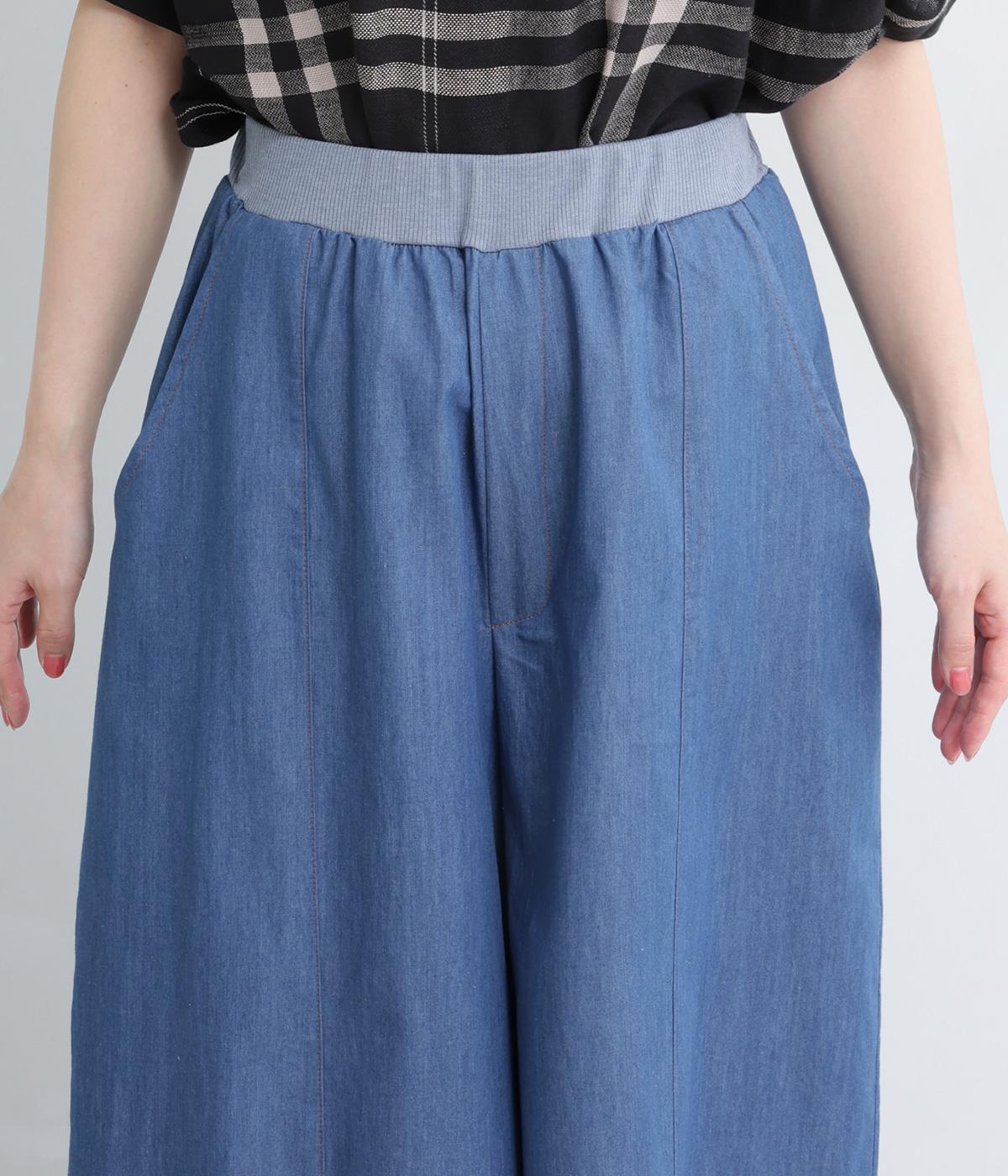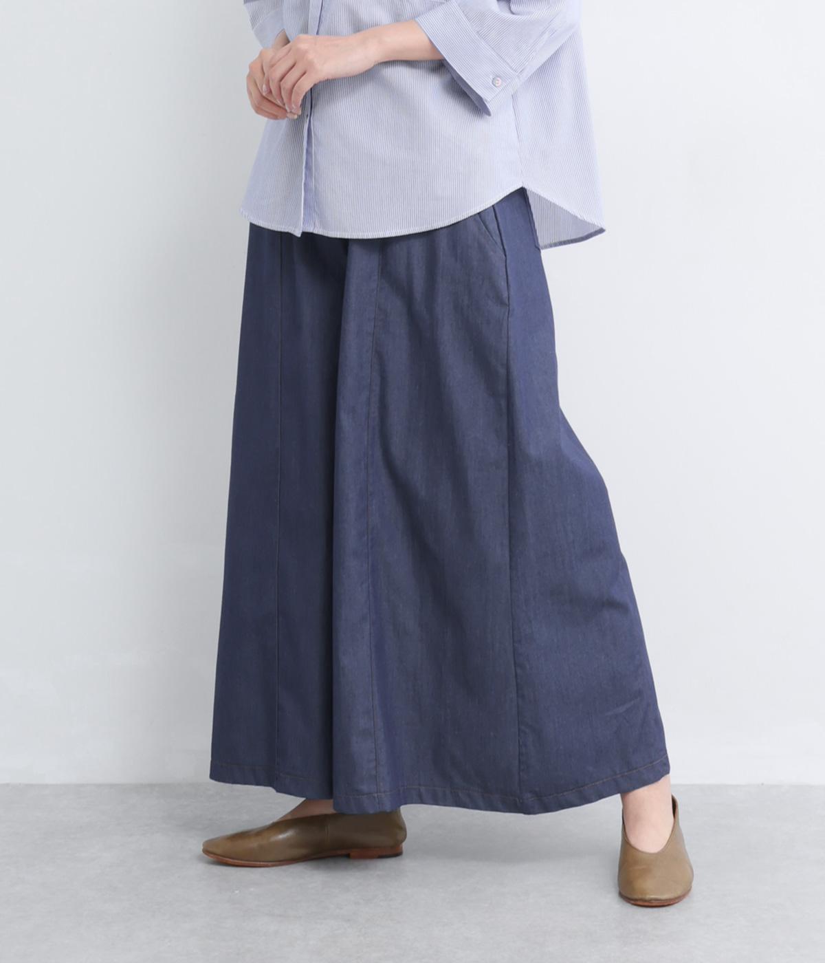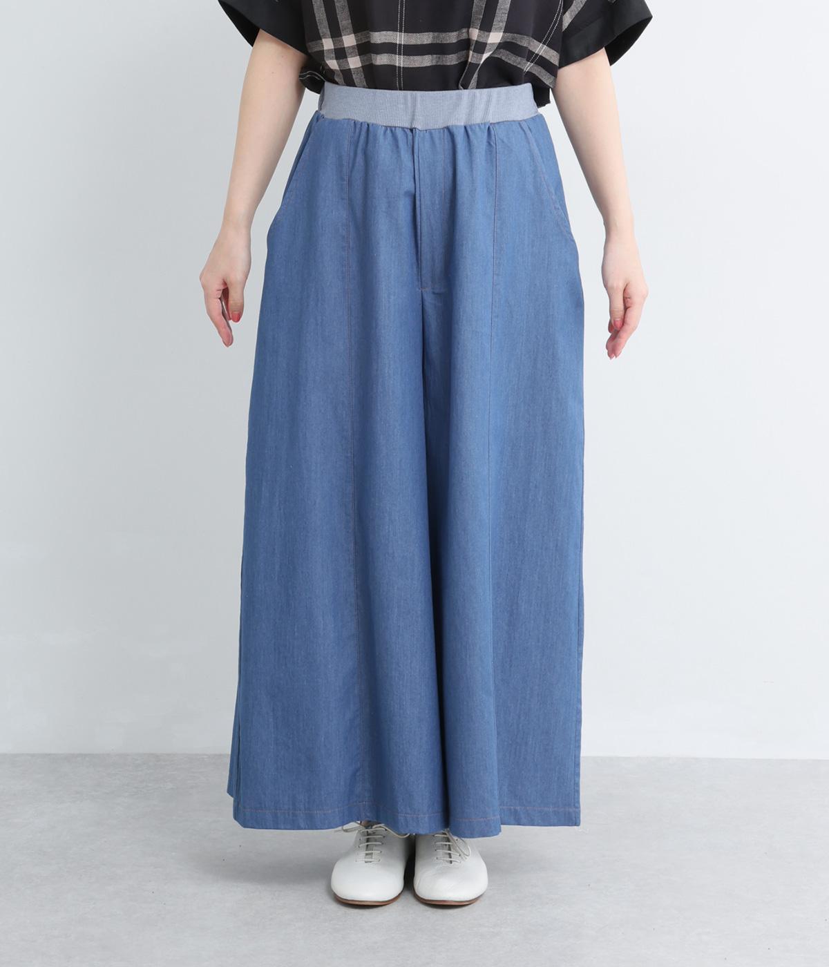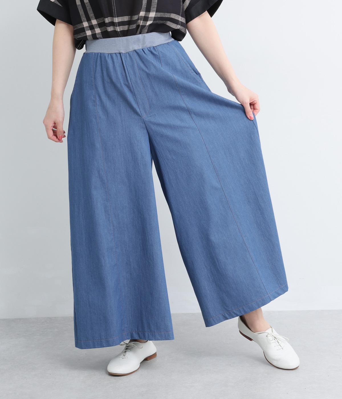 センター切り替えのスカート見えするワイドデニムパンツ。やわらかな生地がフレアシルエットにぴったりで、裾がゆるやかに揺れて表情豊かに魅せます。ウエストはオールリブ仕様でフィット感が良く、トップスインもおすすめ。