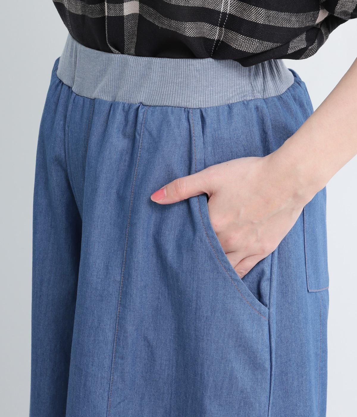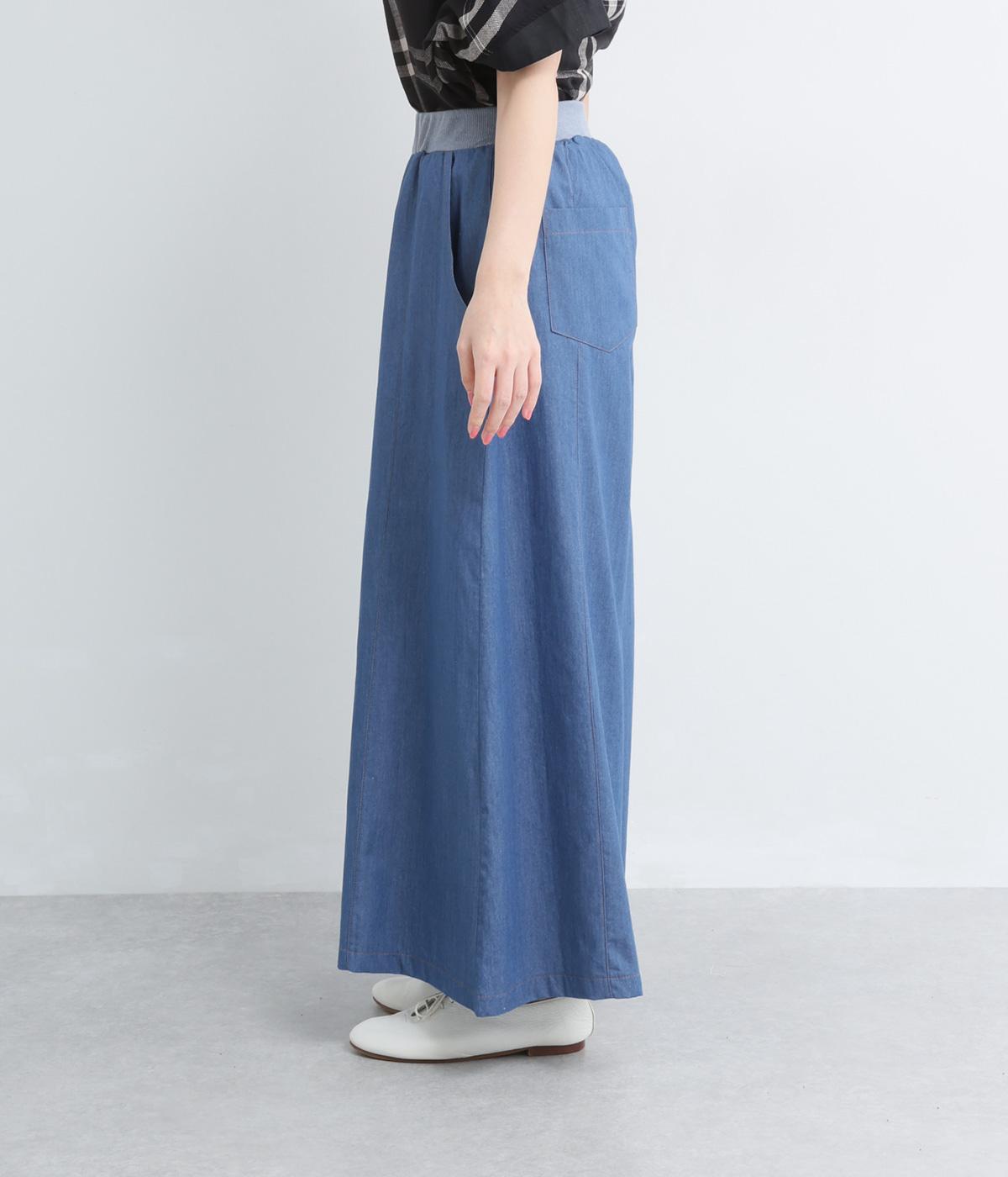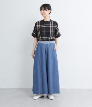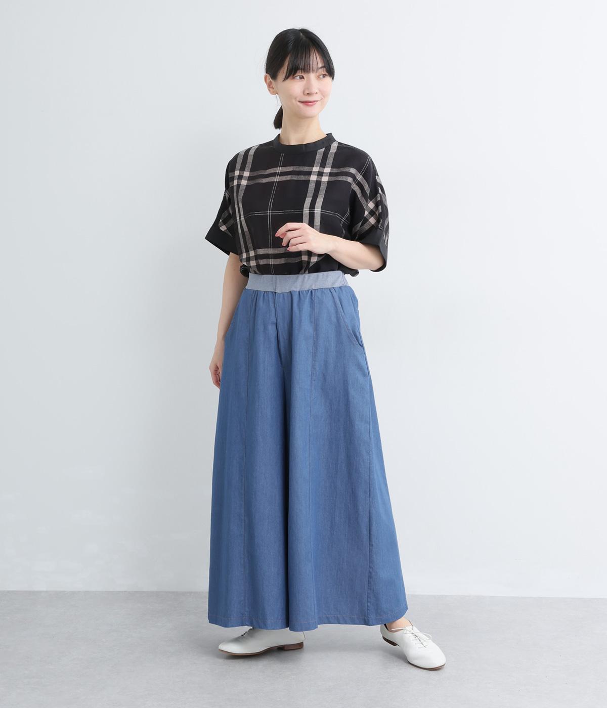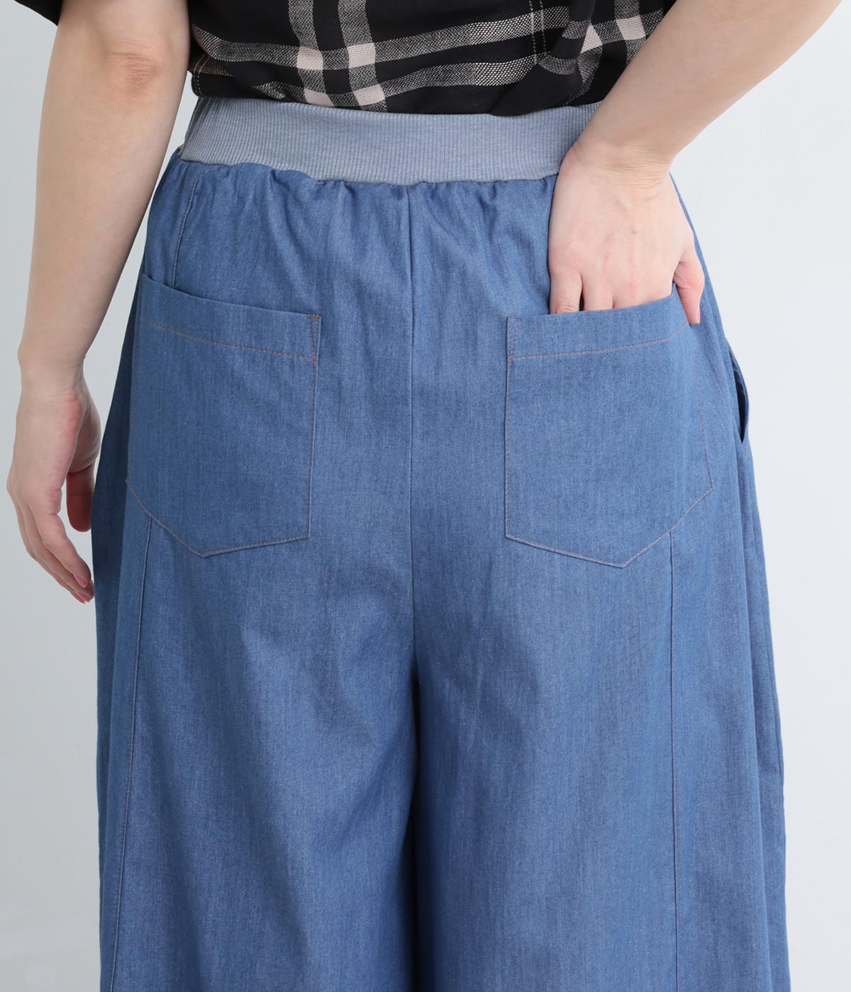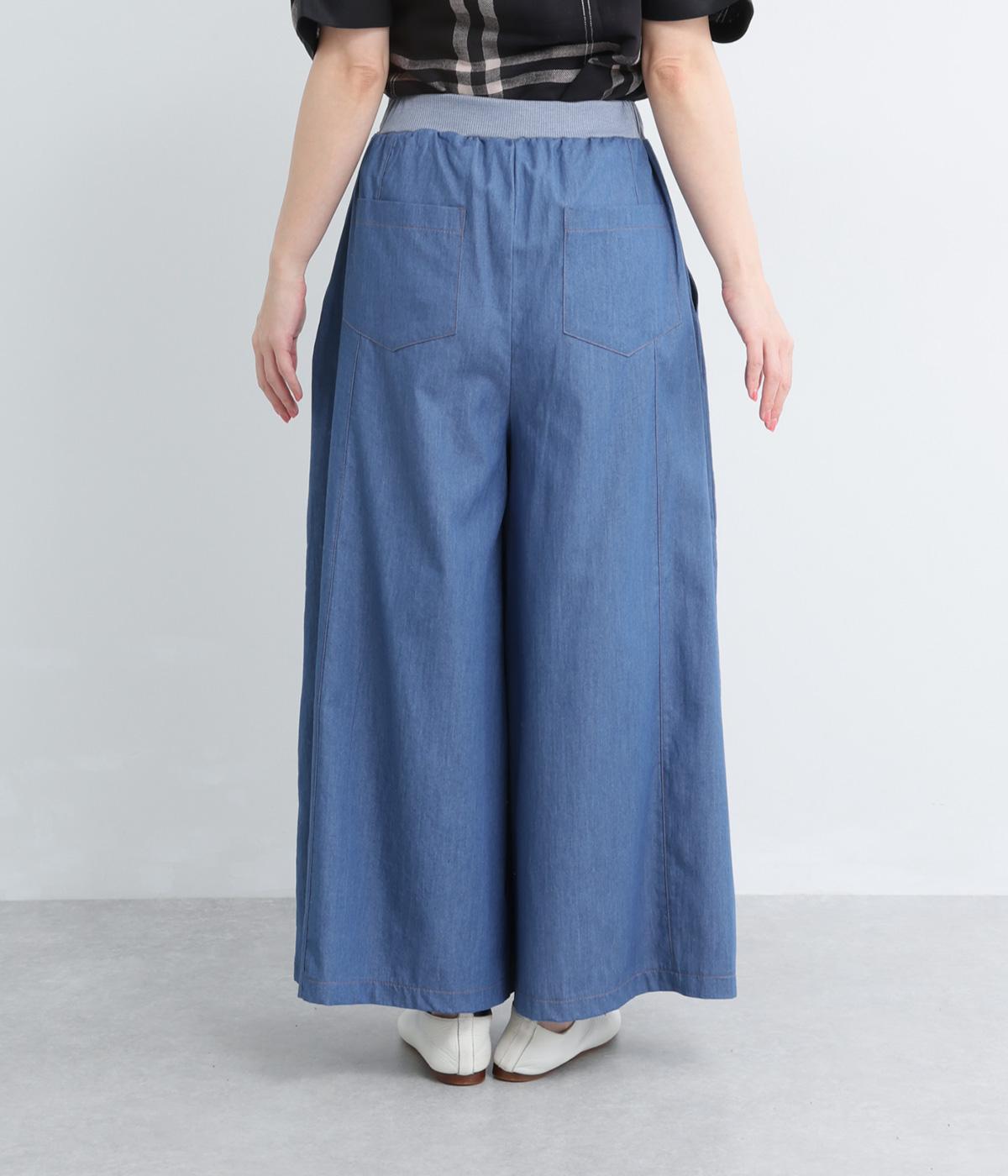 センター切り替えのスカート見えするワイドデニムパンツ。やわらかな生地がフレアシルエットにぴったりで、裾がゆるやかに揺れて表情豊かに魅せます。ウエストはオールリブ仕様でフィット感が良く、トップスインもおすすめ。