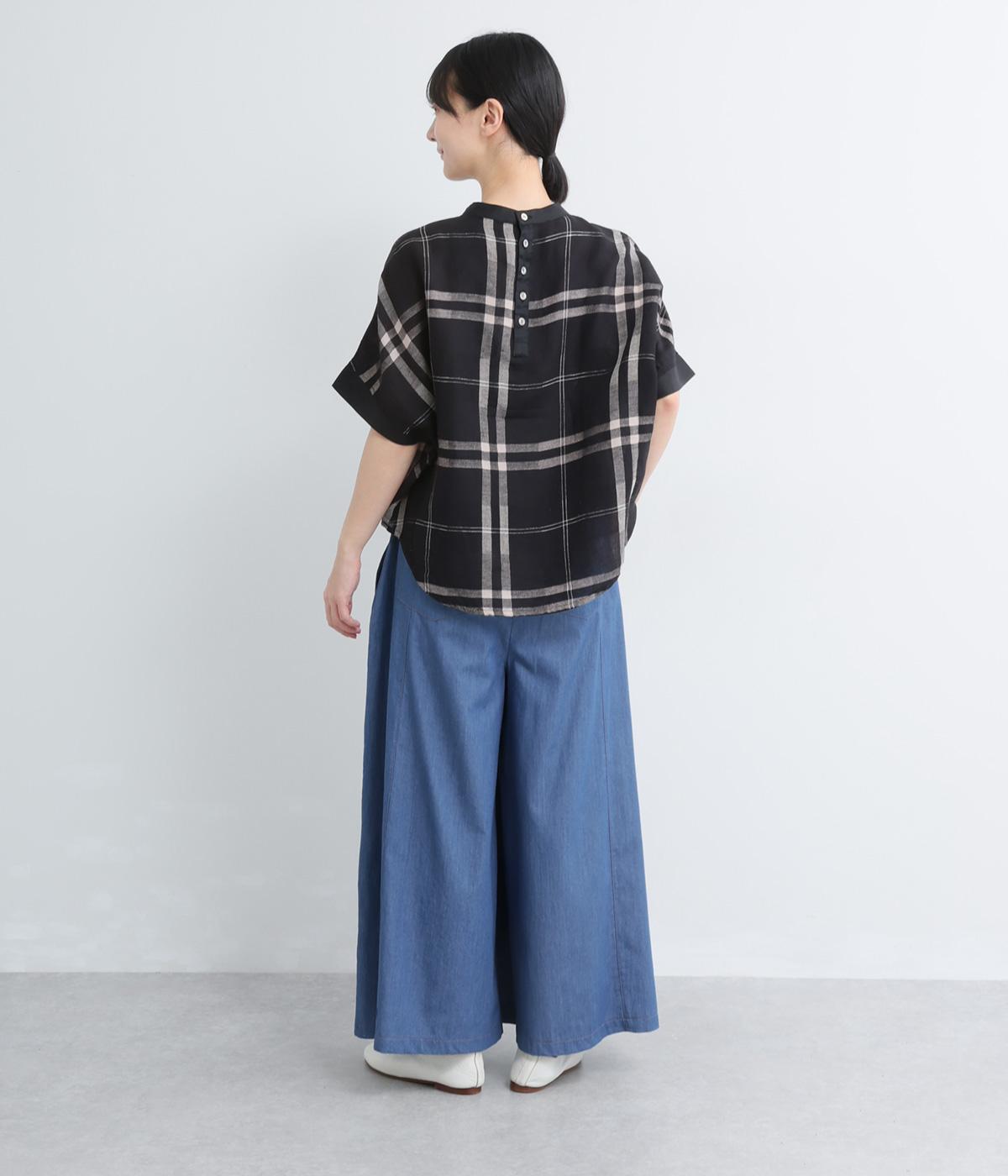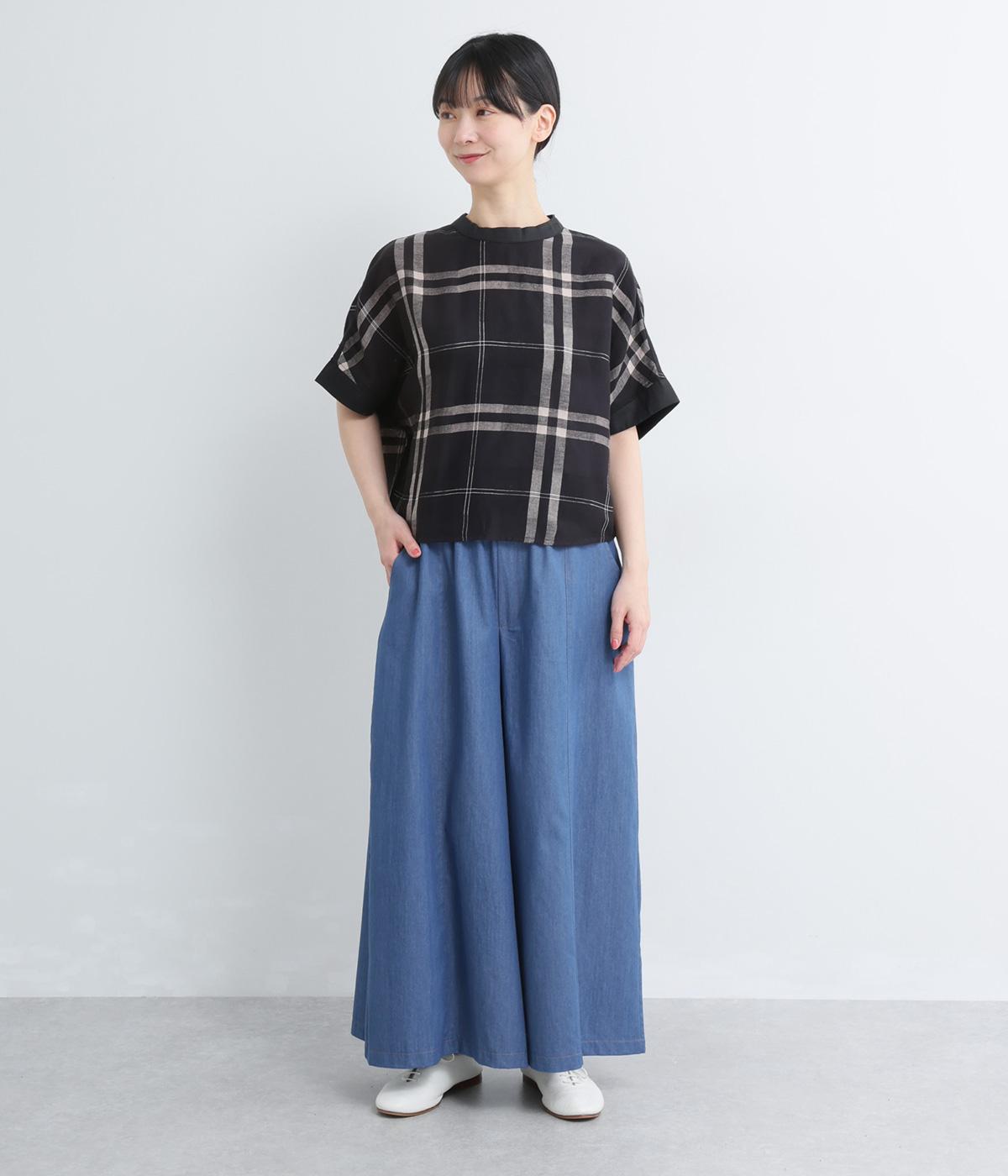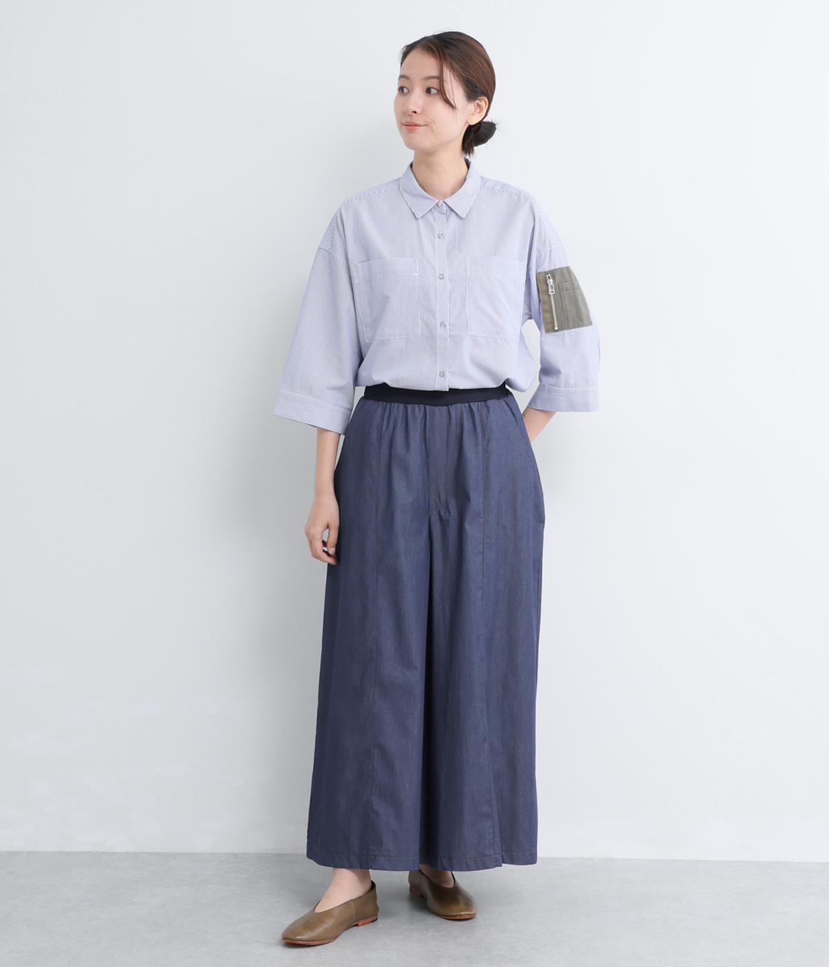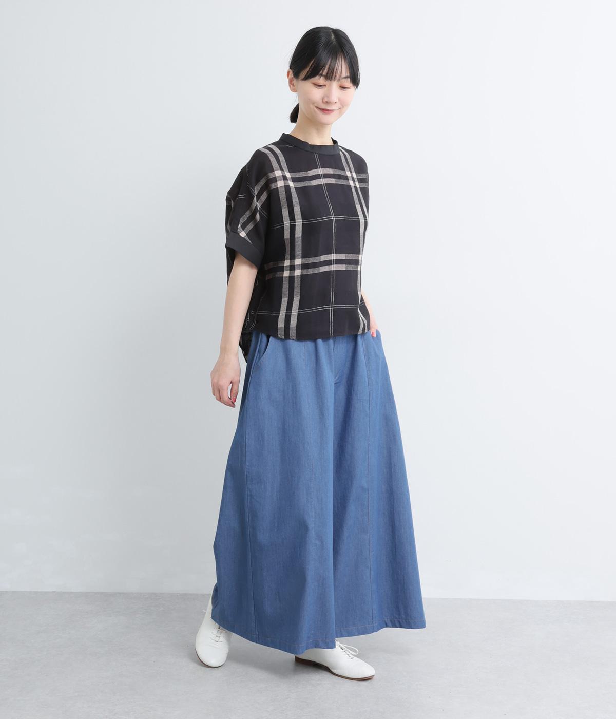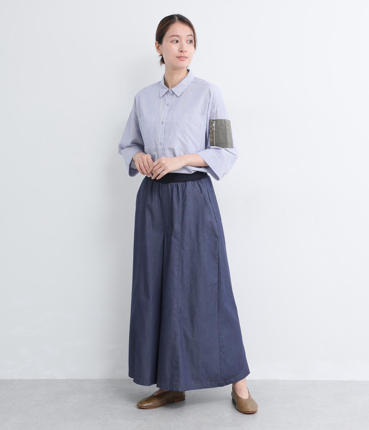 センター切り替えのスカート見えするワイドデニムパンツ。やわらかな生地がフレアシルエットにぴったりで、裾がゆるやかに揺れて表情豊かに魅せます。ウエストはオールリブ仕様でフィット感が良く、トップスインもおすすめ。