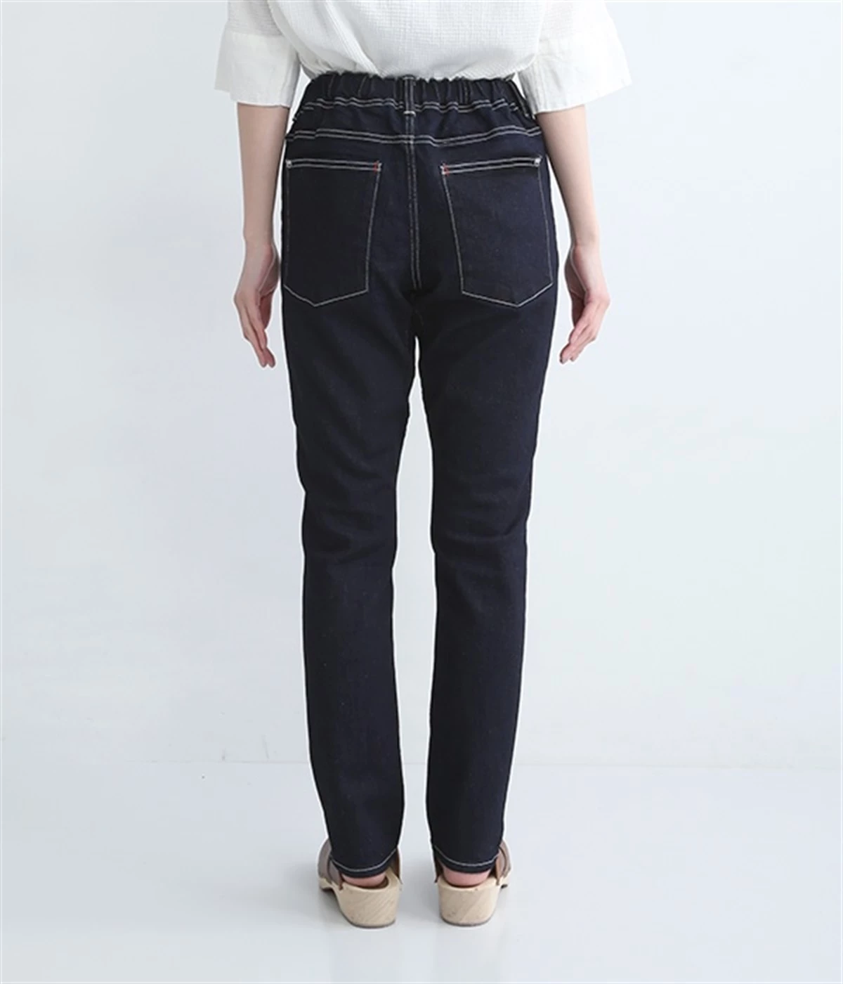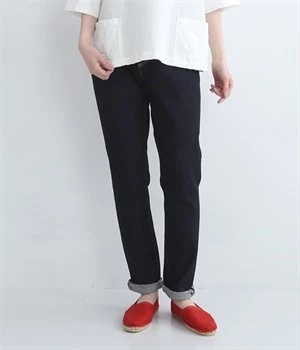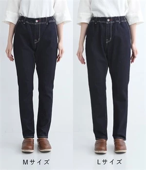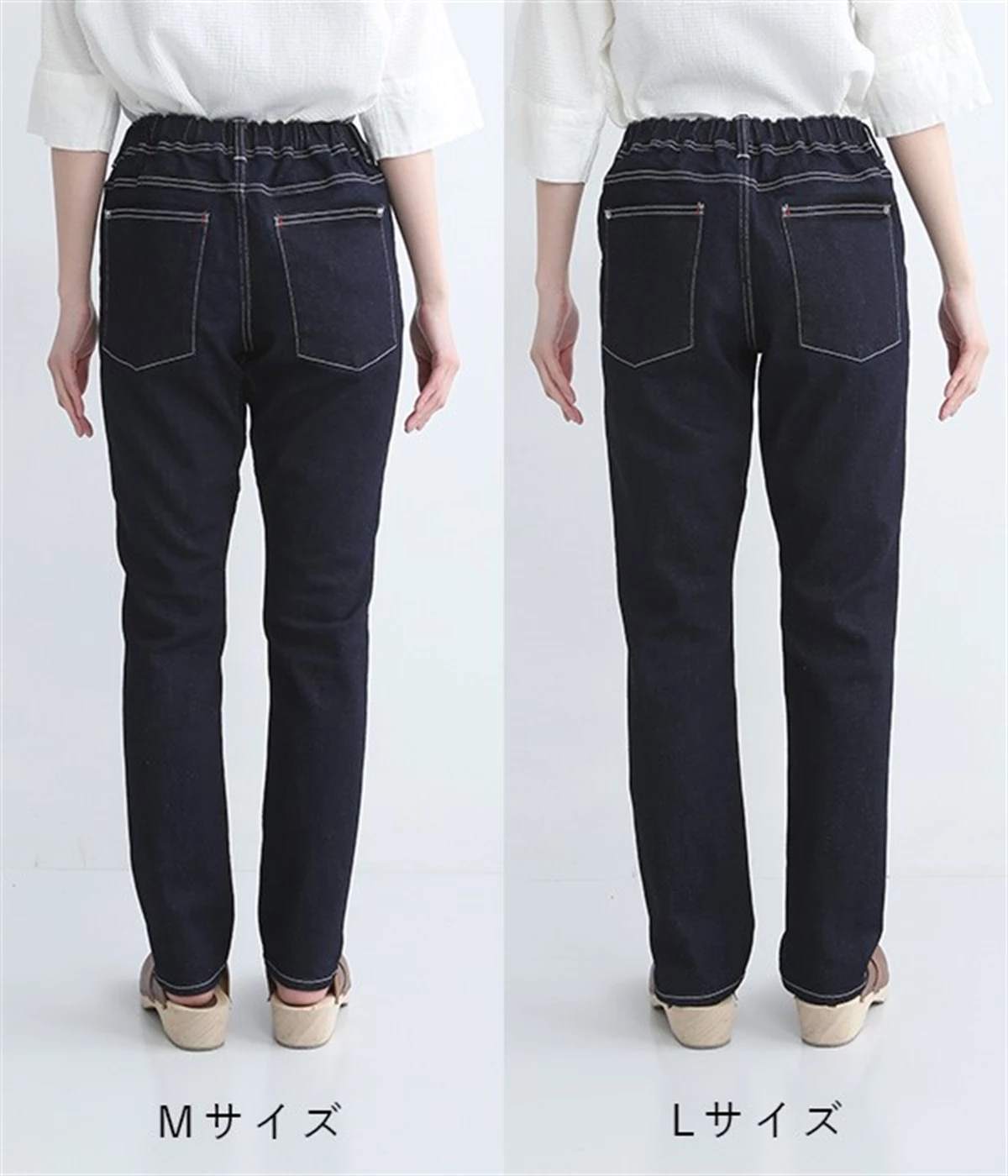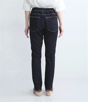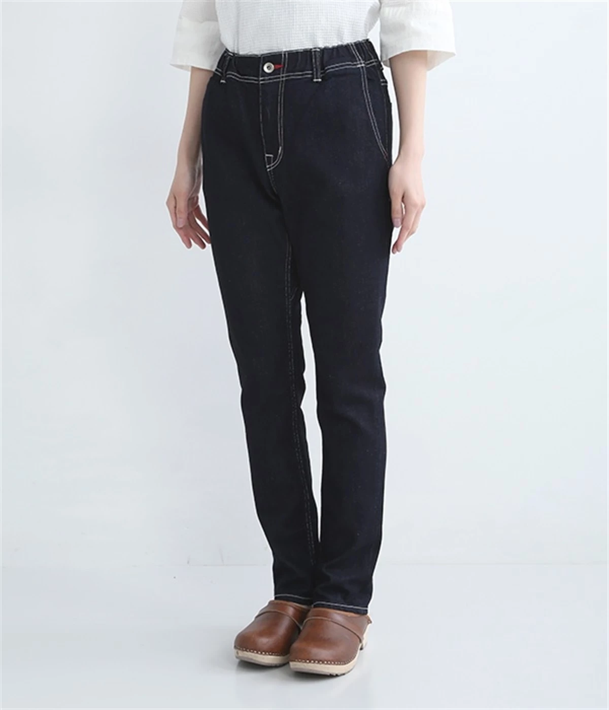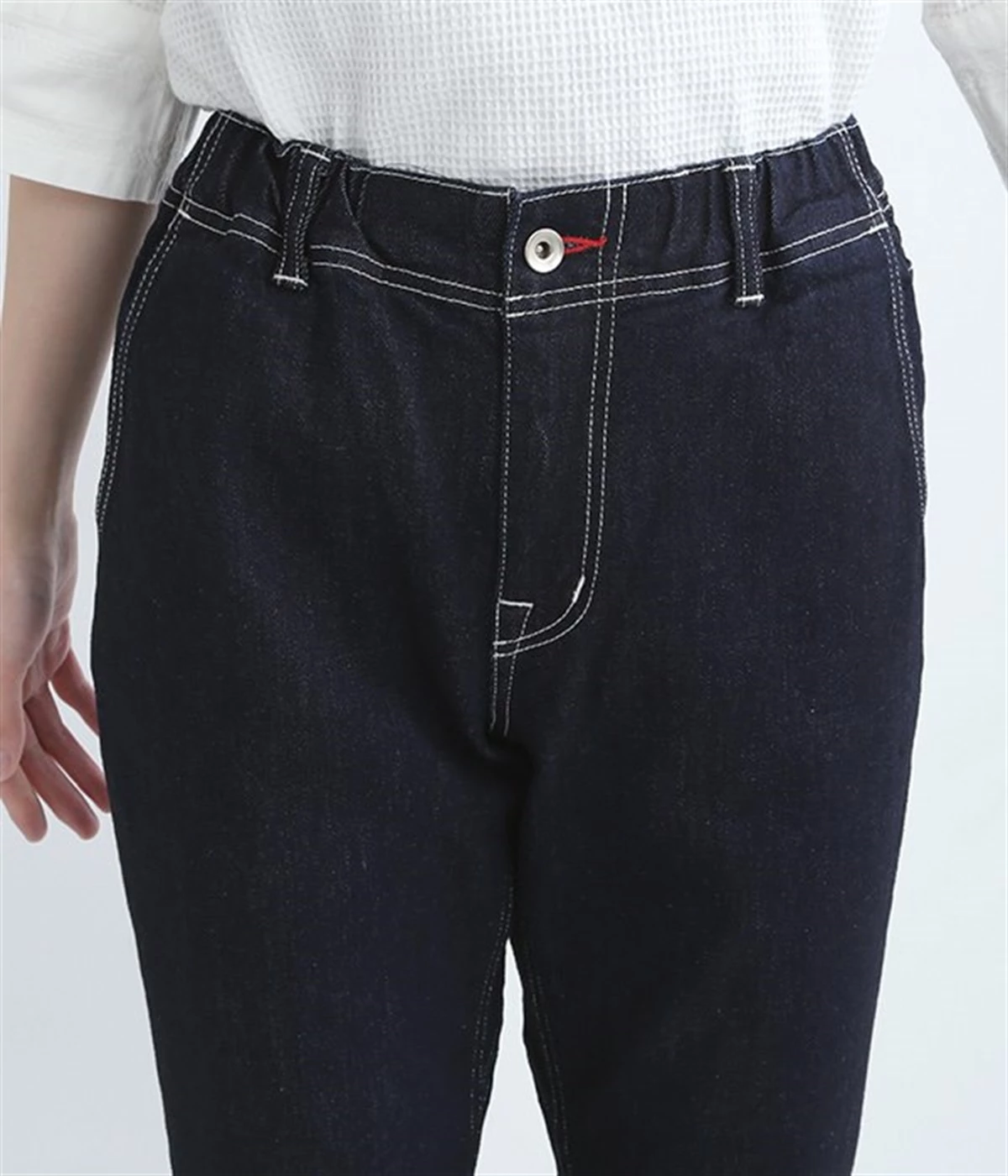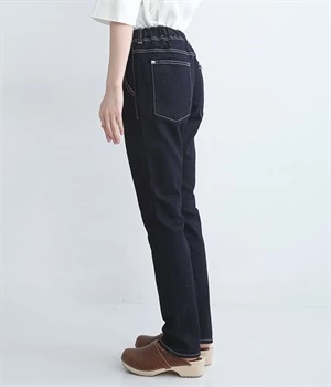 ノンウォッシュの面持ちに配色ステッチが映えるデニムパンツです。厚すぎない中肉のインディゴデニムは、季節をこえて通年での着用ができ、定番アイテムになってくれそう。テーパードをかけたスリムシルエットでもラクにはけるよう、ポリウレタンを混紡してストレッチをきかせています。前ボタン&ファスナーの本開きですが、サイドから後ろはゴムを通したハーフイージー仕様。単体ですっきりとはくだけでなく、ワンピースやスカートの下にレイヤードする着まわしもおすすめです。