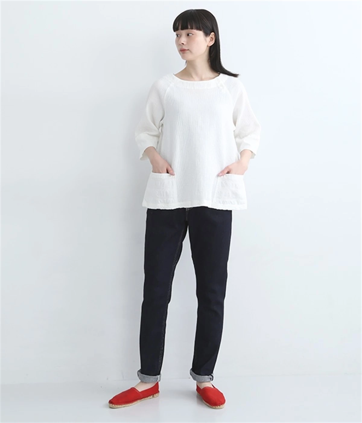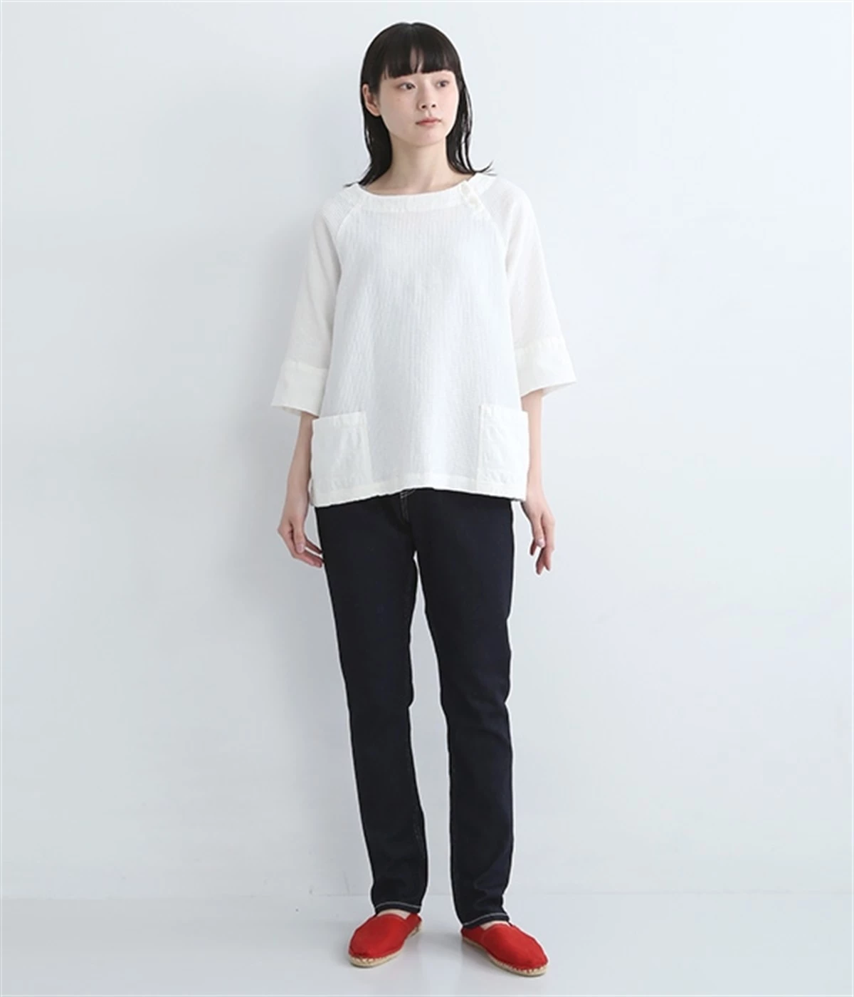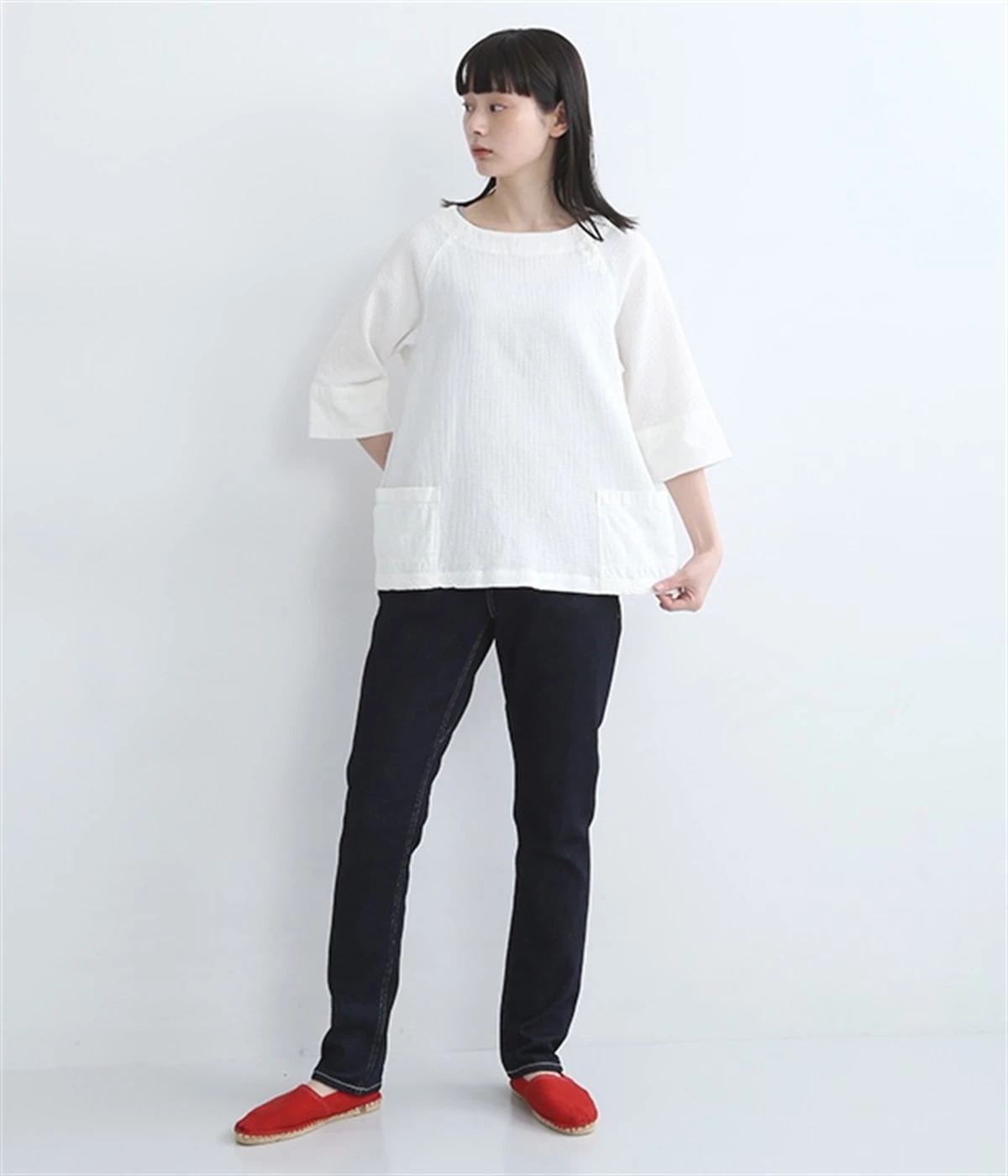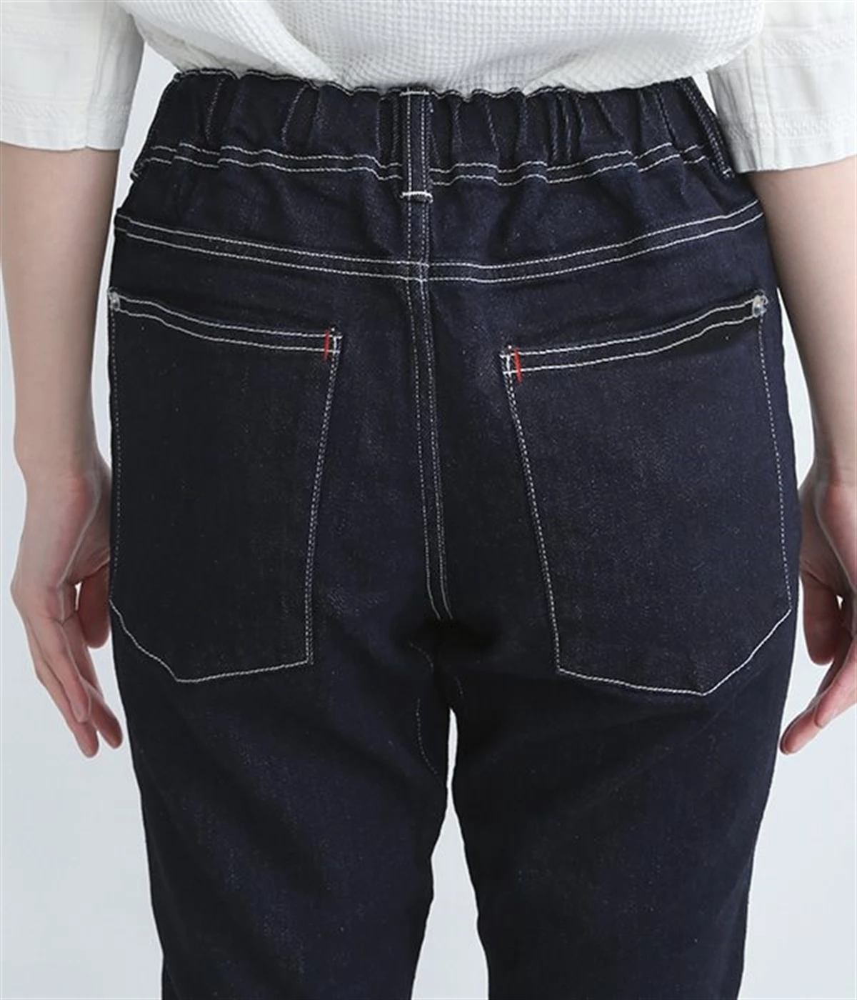 ノンウォッシュの面持ちに配色ステッチが映えるデニムパンツです。厚すぎない中肉のインディゴデニムは、季節をこえて通年での着用ができ、定番アイテムになってくれそう。テーパードをかけたスリムシルエットでもラクにはけるよう、ポリウレタンを混紡してストレッチをきかせています。前ボタン&ファスナーの本開きですが、サイドから後ろはゴムを通したハーフイージー仕様。単体ですっきりとはくだけでなく、ワンピースやスカートの下にレイヤードする着まわしもおすすめです。