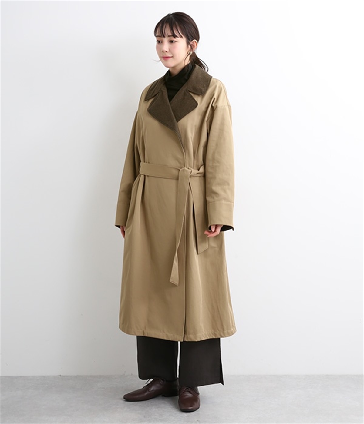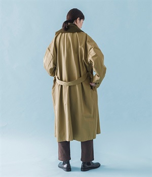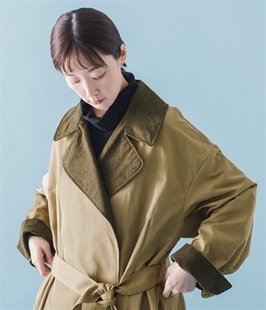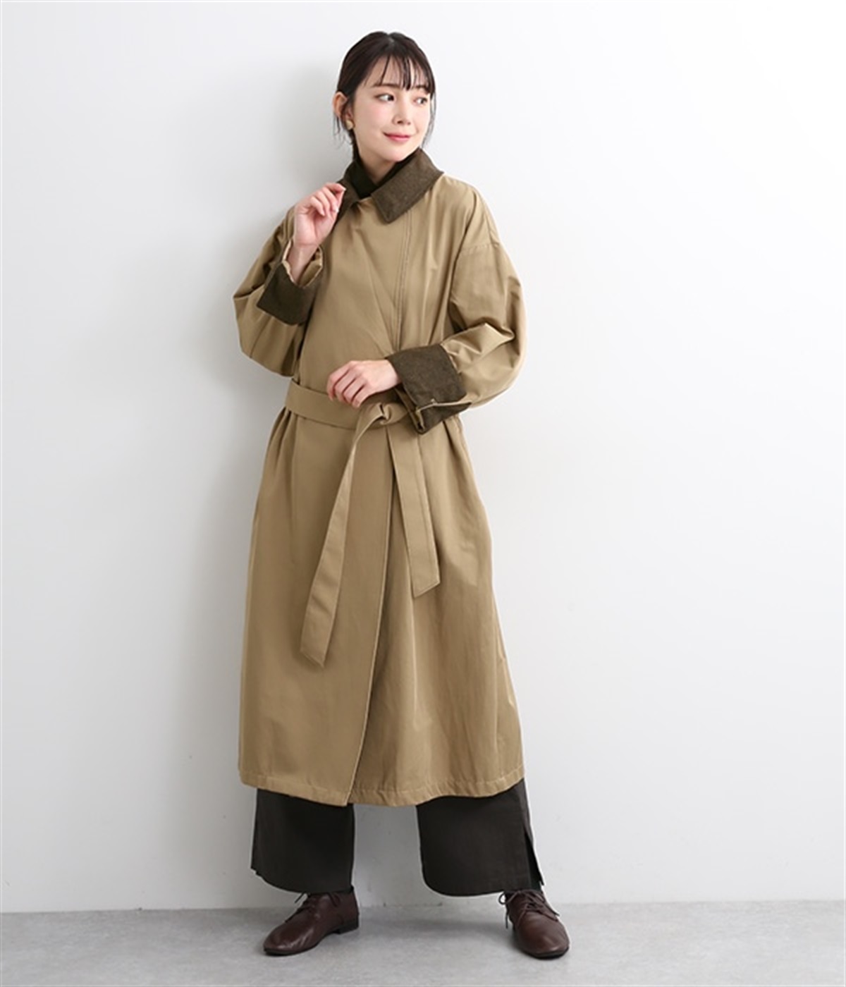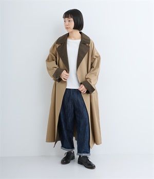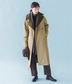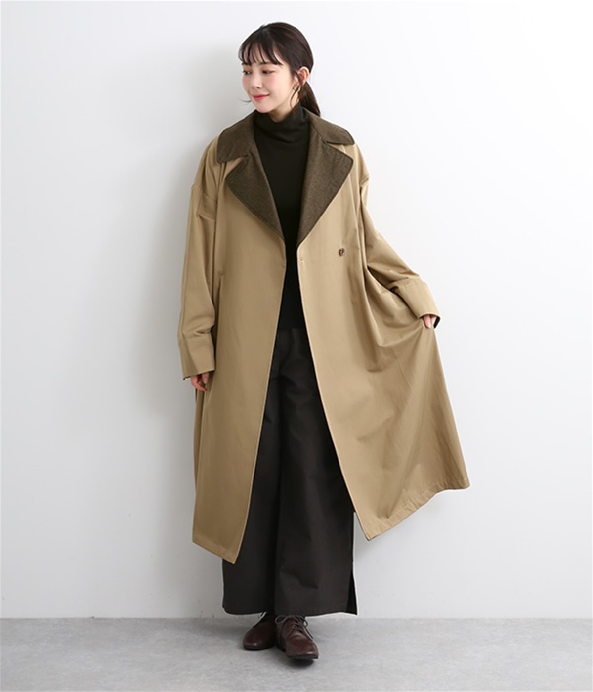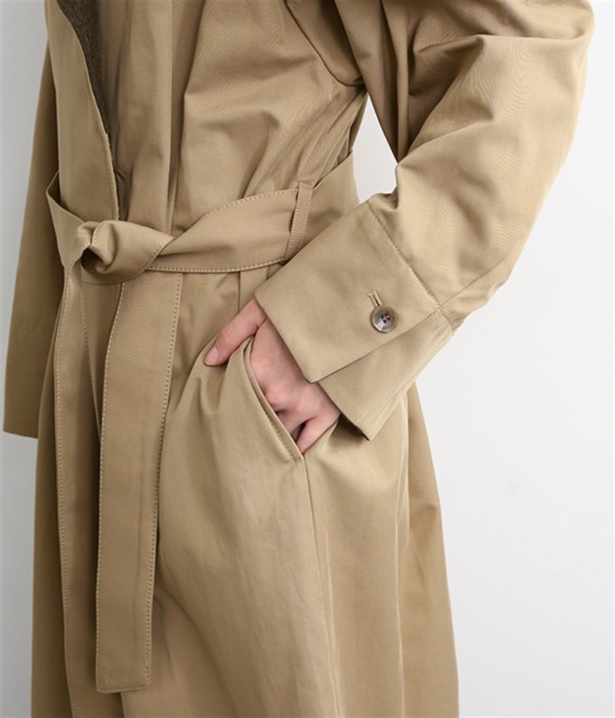 襟と袖の異素材が楽しめるワイドロングコート。トレンチコートをベースに、カジュアル向けにシンプルなデザインにしています。袖を折り返すことで異素材の裏生地が現れ、パッと目を惹くアクセントに。身幅にはゆとりがあり中に着こみやすいのも好ポイントです。付属のウエストベルトを使うと、シルエットが引き締まりスタイリッシュにも見せてくれます。