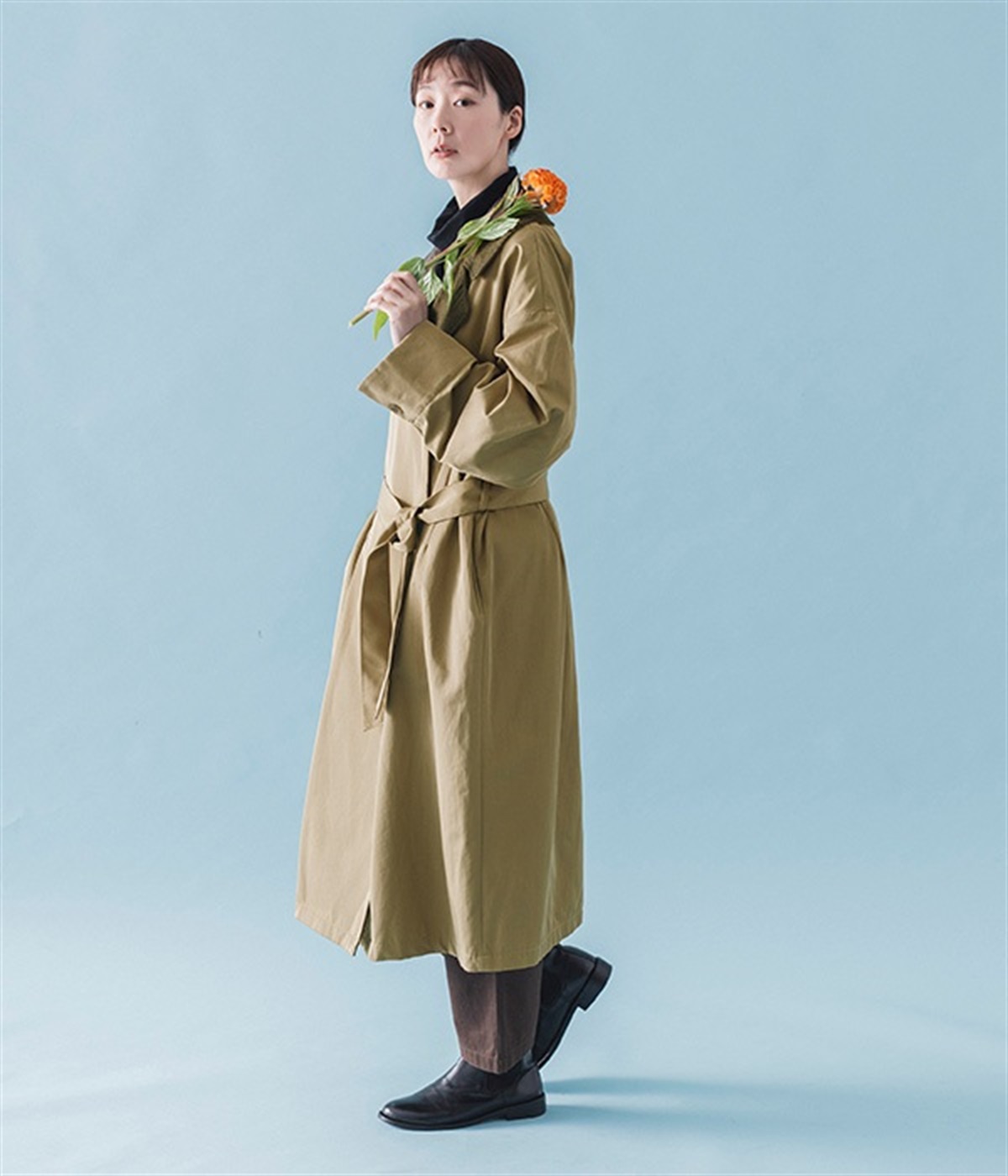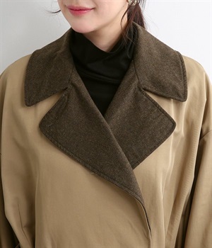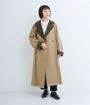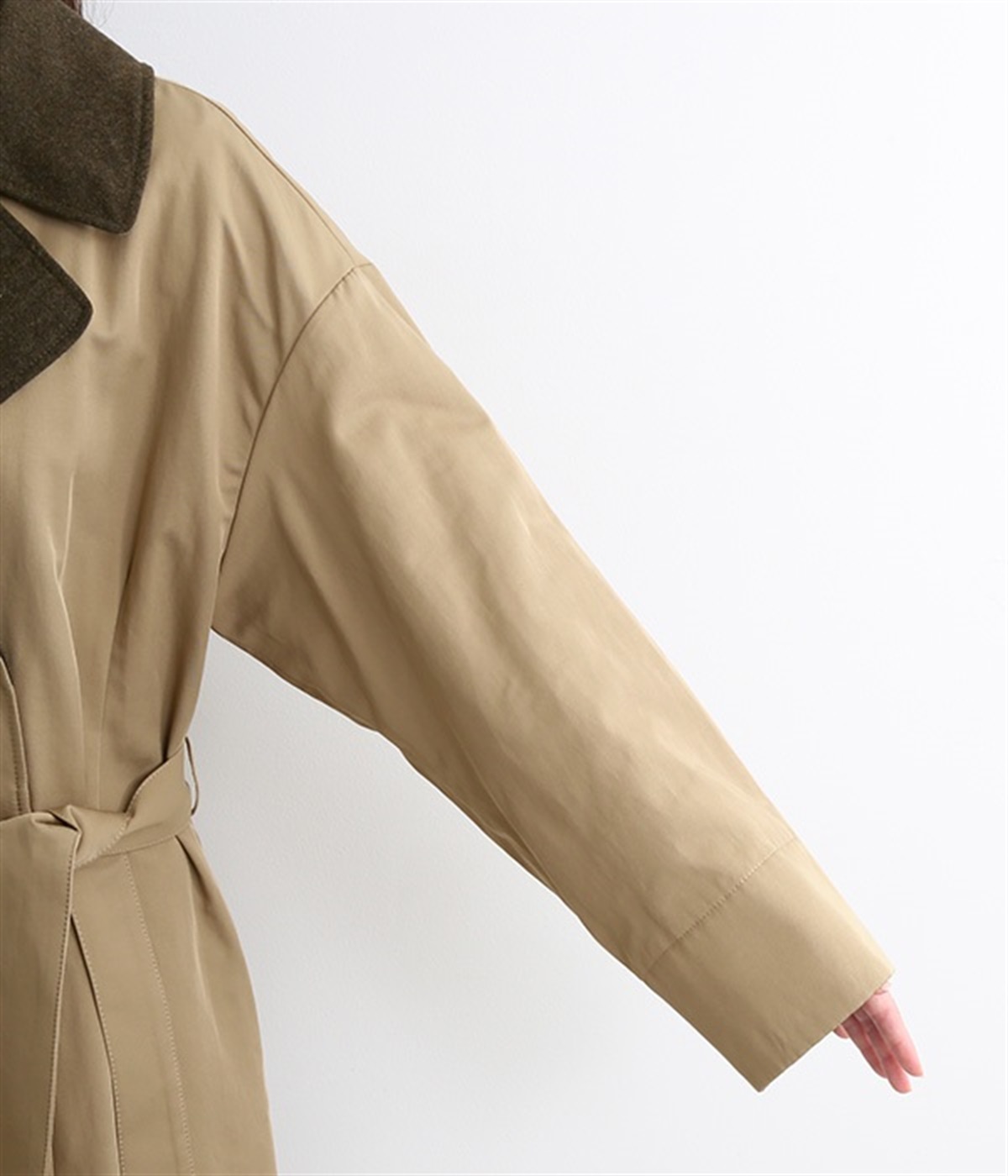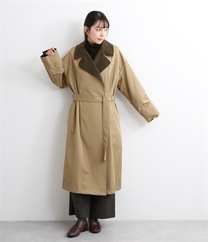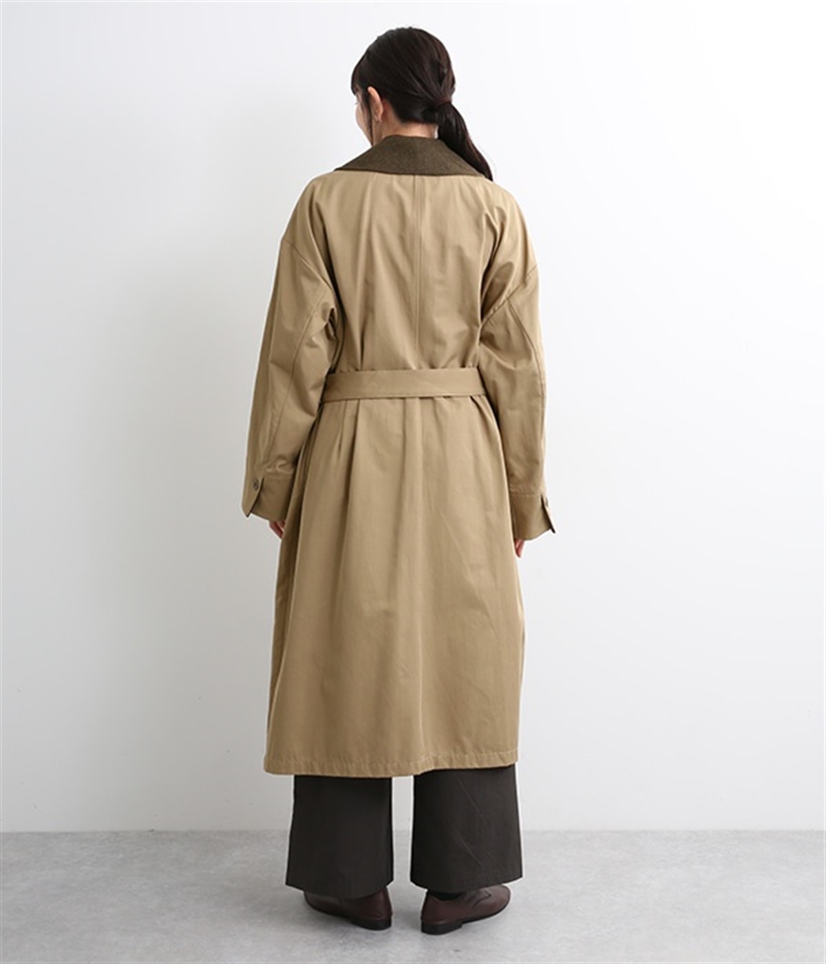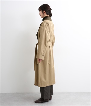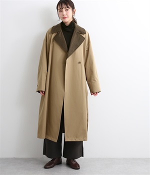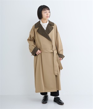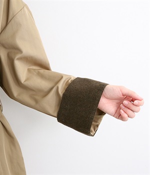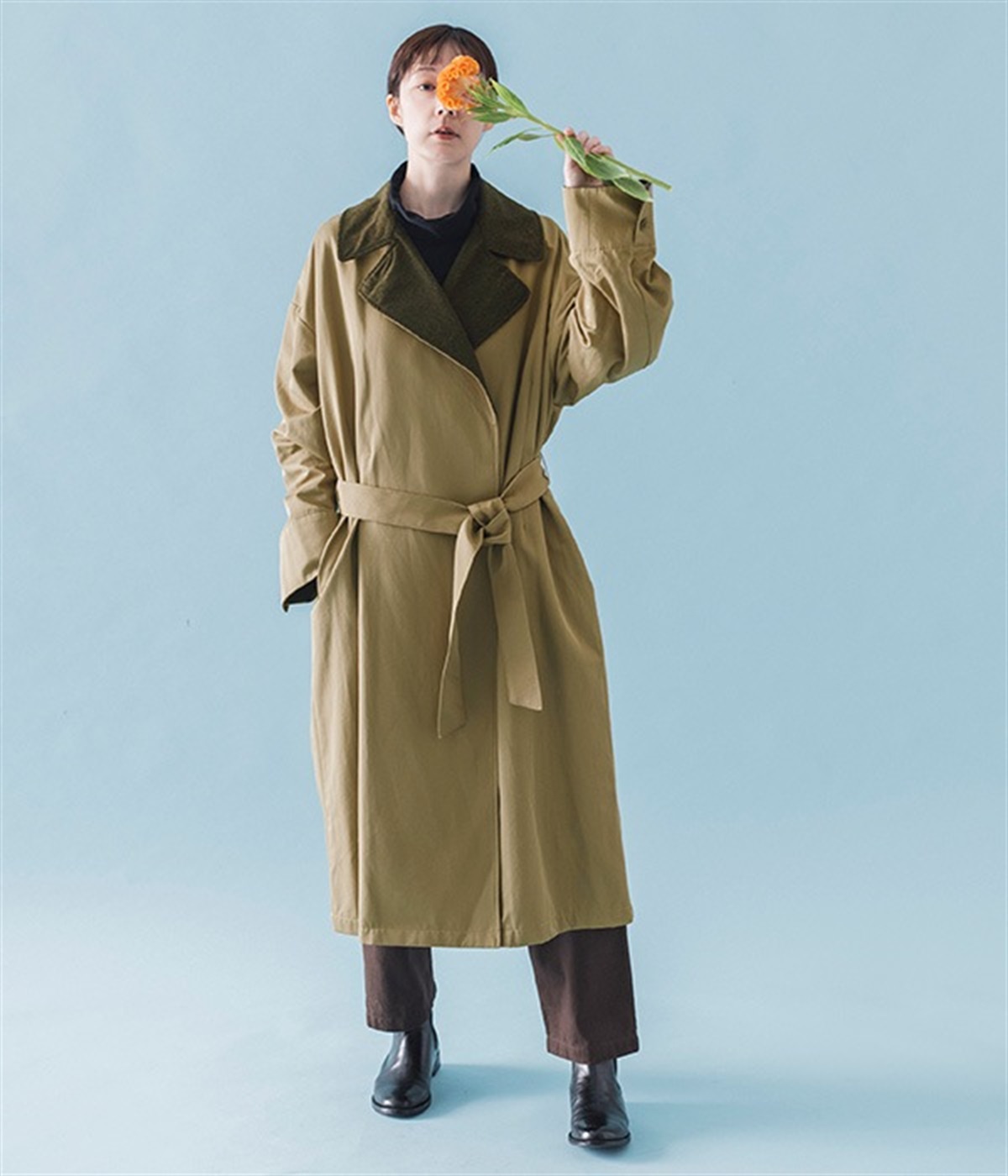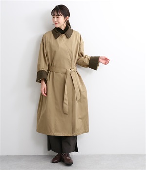 襟と袖の異素材が楽しめるワイドロングコート。トレンチコートをベースに、カジュアル向けにシンプルなデザインにしています。袖を折り返すことで異素材の裏生地が現れ、パッと目を惹くアクセントに。身幅にはゆとりがあり中に着こみやすいのも好ポイントです。付属のウエストベルトを使うと、シルエットが引き締まりスタイリッシュにも見せてくれます。