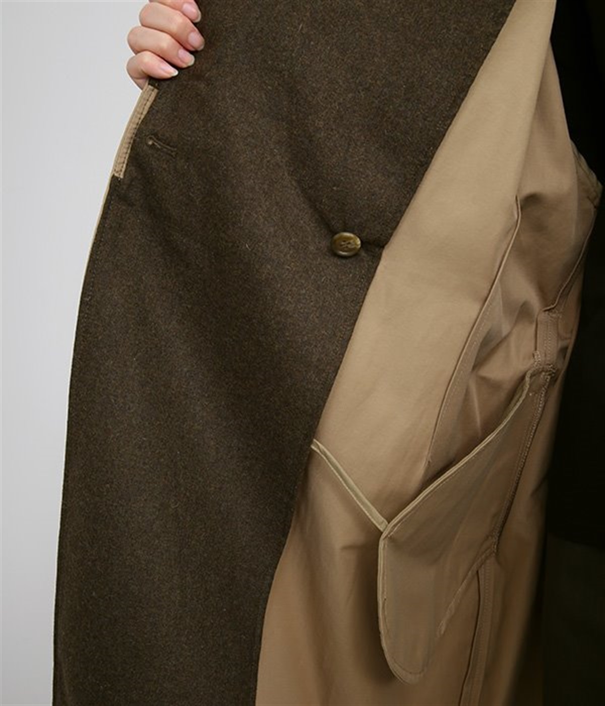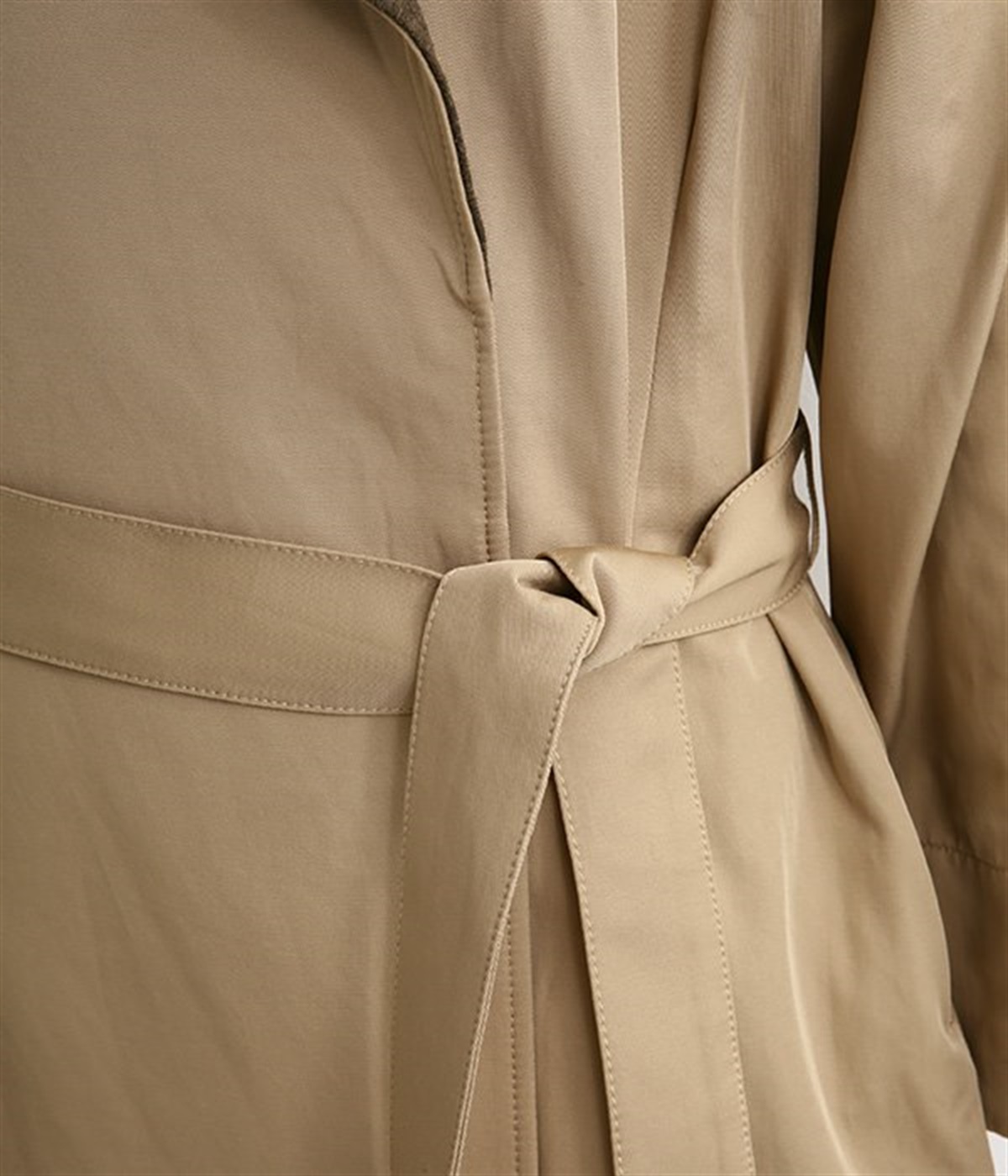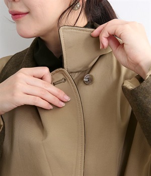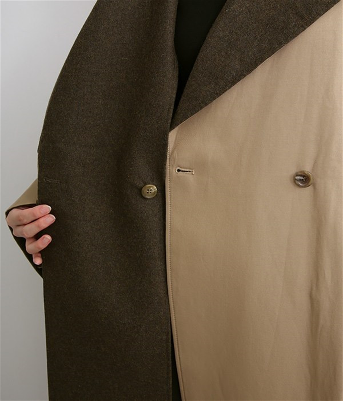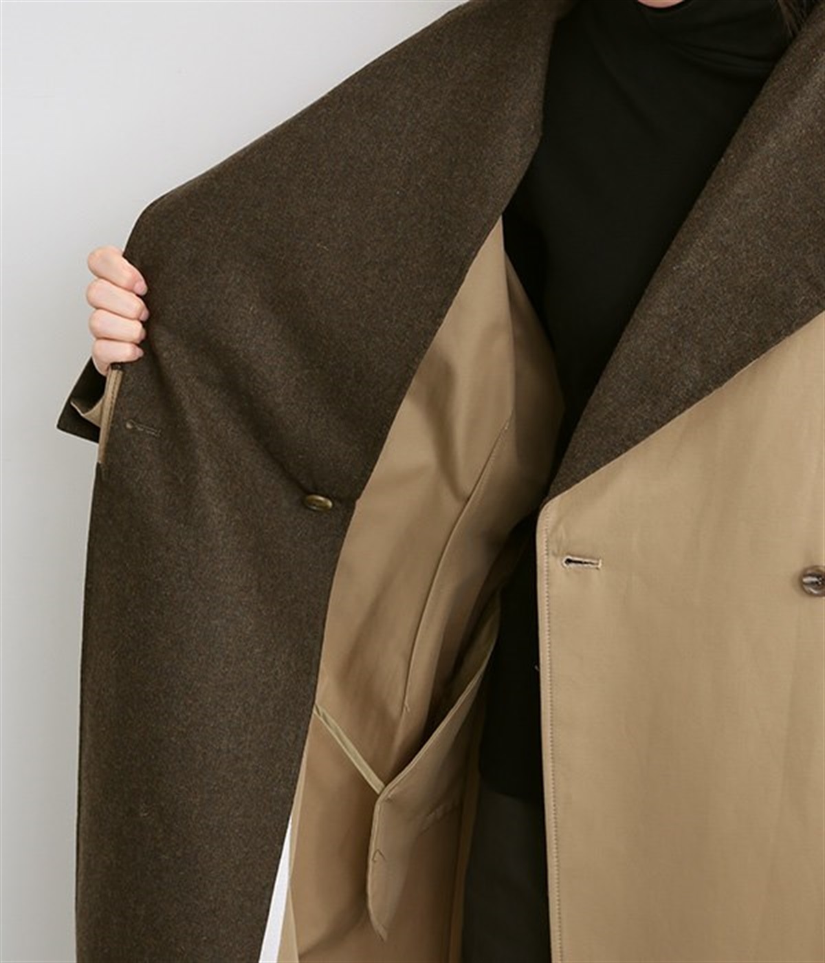 襟と袖の異素材が楽しめるワイドロングコート。トレンチコートをベースに、カジュアル向けにシンプルなデザインにしています。袖を折り返すことで異素材の裏生地が現れ、パッと目を惹くアクセントに。身幅にはゆとりがあり中に着こみやすいのも好ポイントです。付属のウエストベルトを使うと、シルエットが引き締まりスタイリッシュにも見せてくれます。