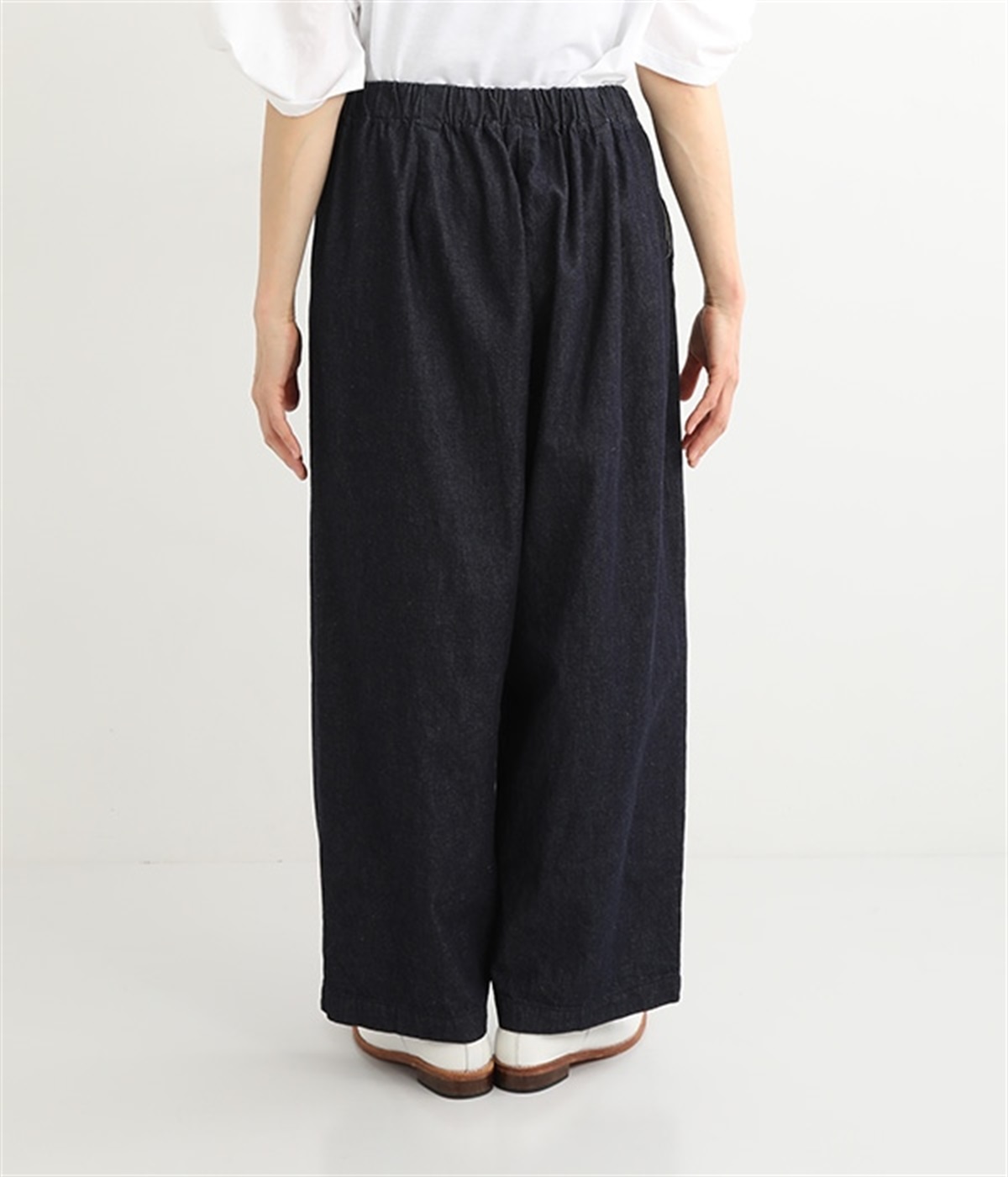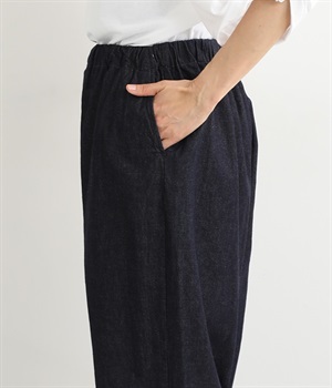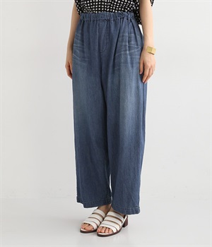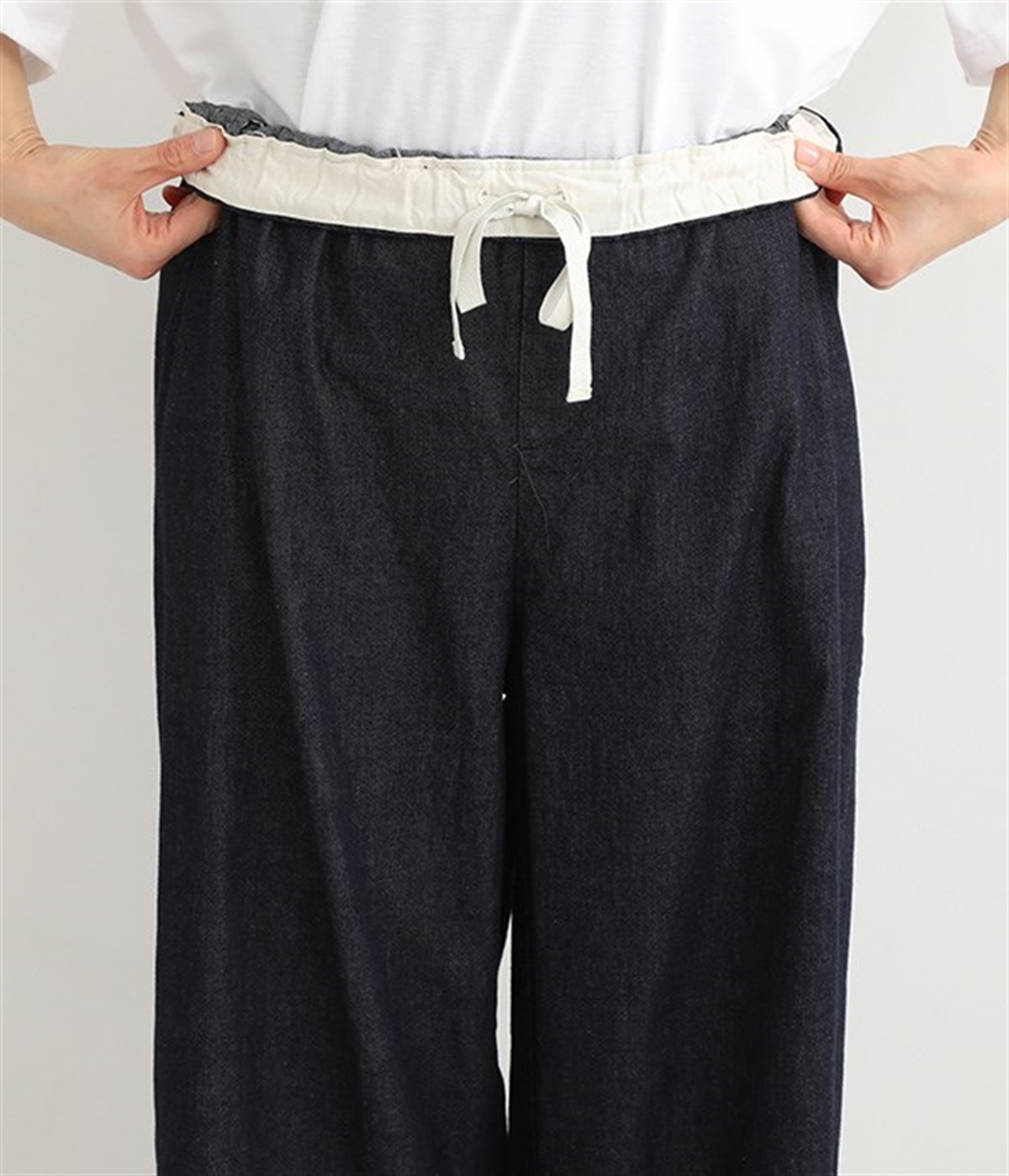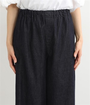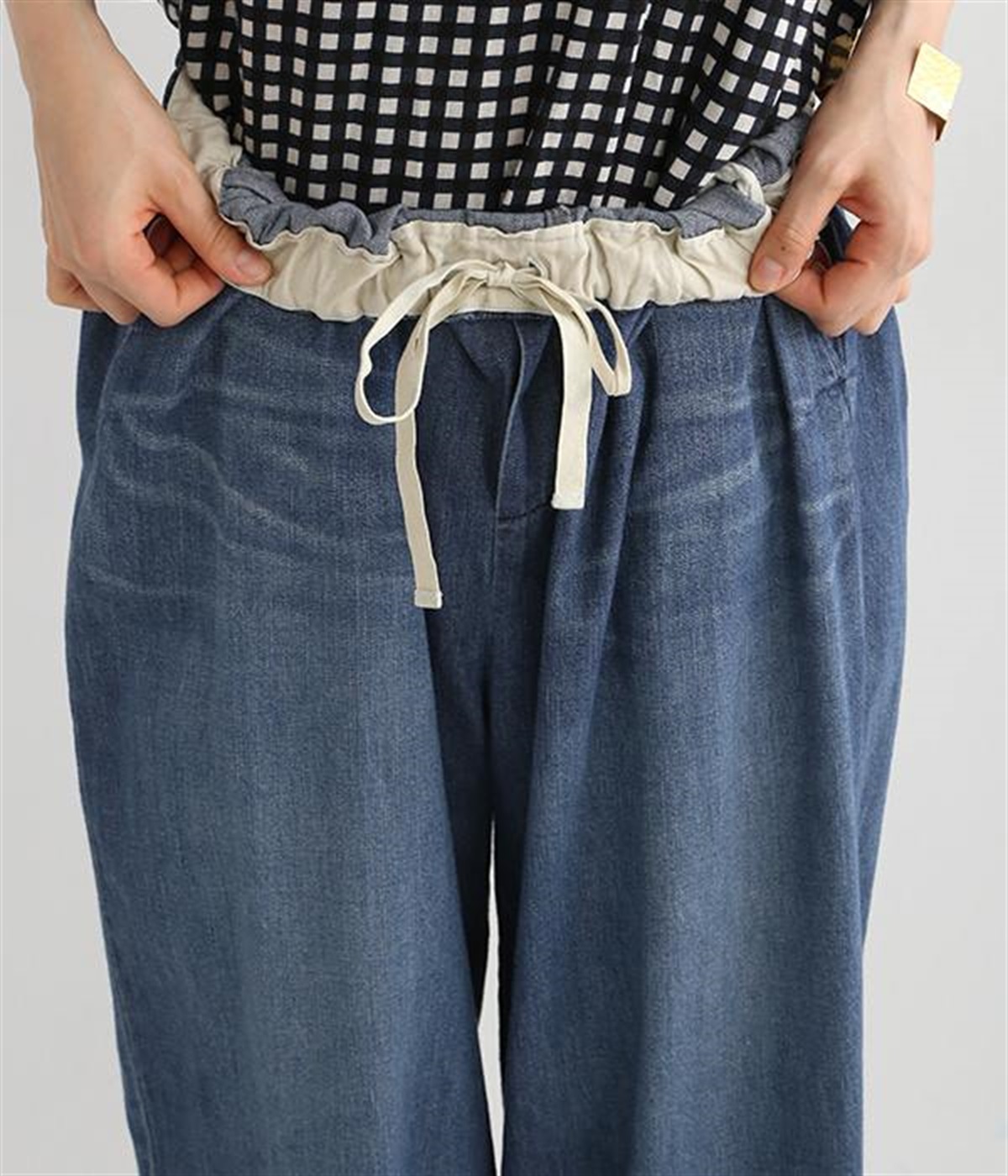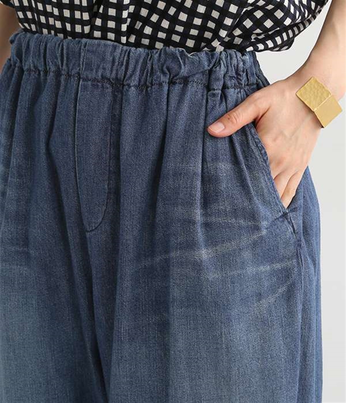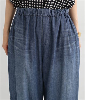 ブライトデニムを使用したイージーパンツです。柔らかく軽い素材と、足のラインを拾わないほどよいゆとりのあるサイズ感が特徴に。ダメージデザインは全て手加工で施され、こだわりを感じられる大人のデニムとなっています。ウエストはゴム仕様でリラックスした穿き心地。内側には紐がついているので、フィットするように調節できます。