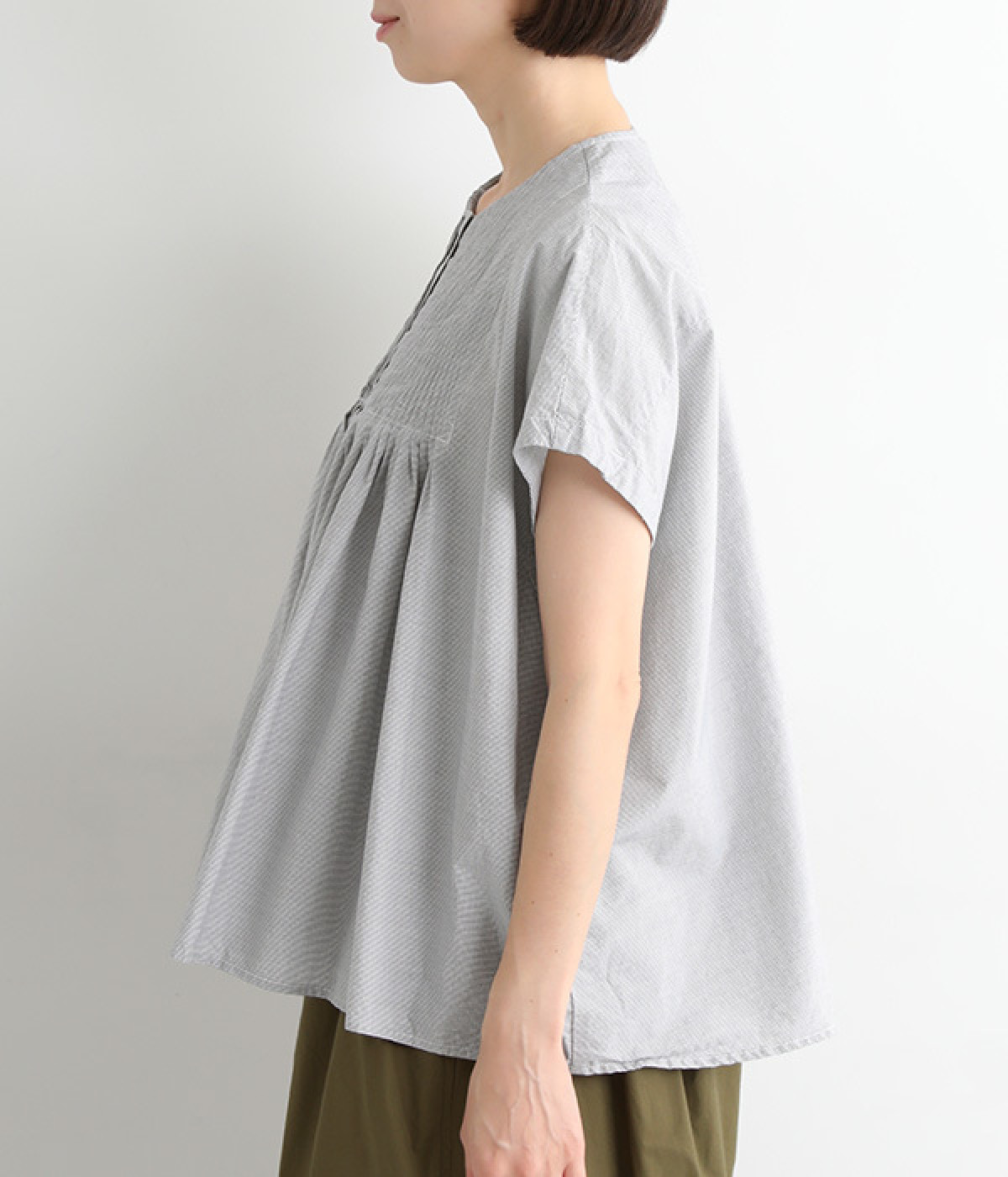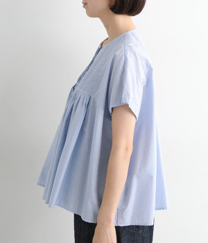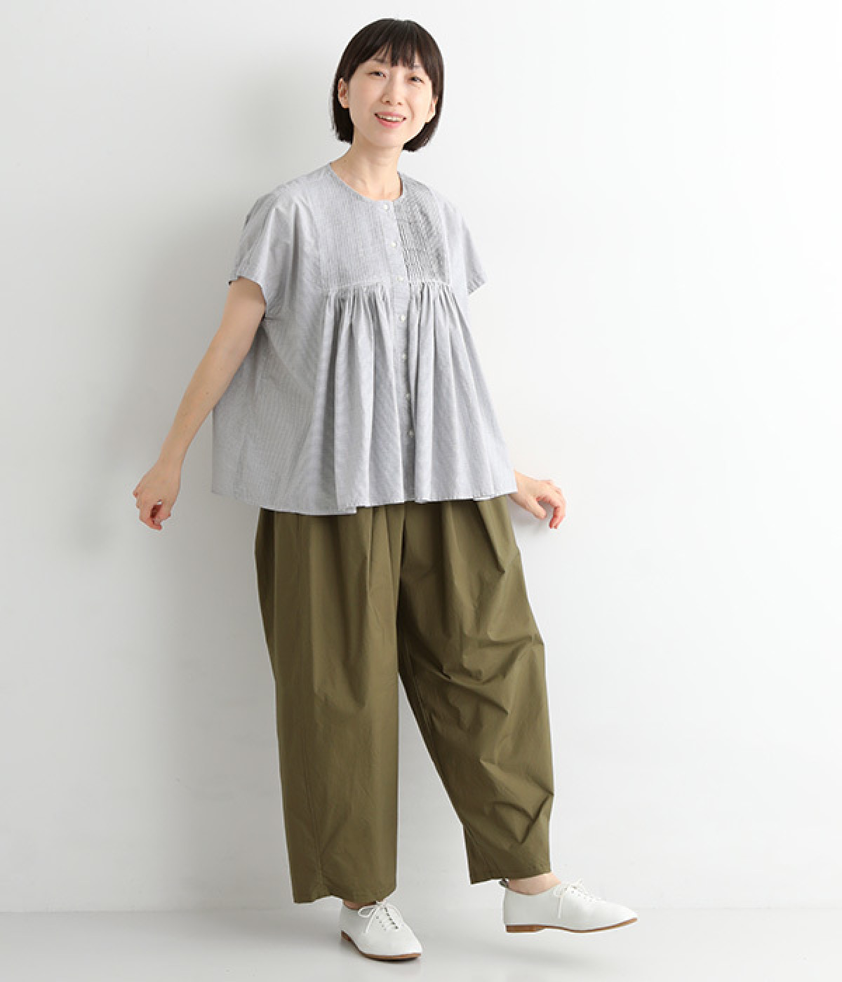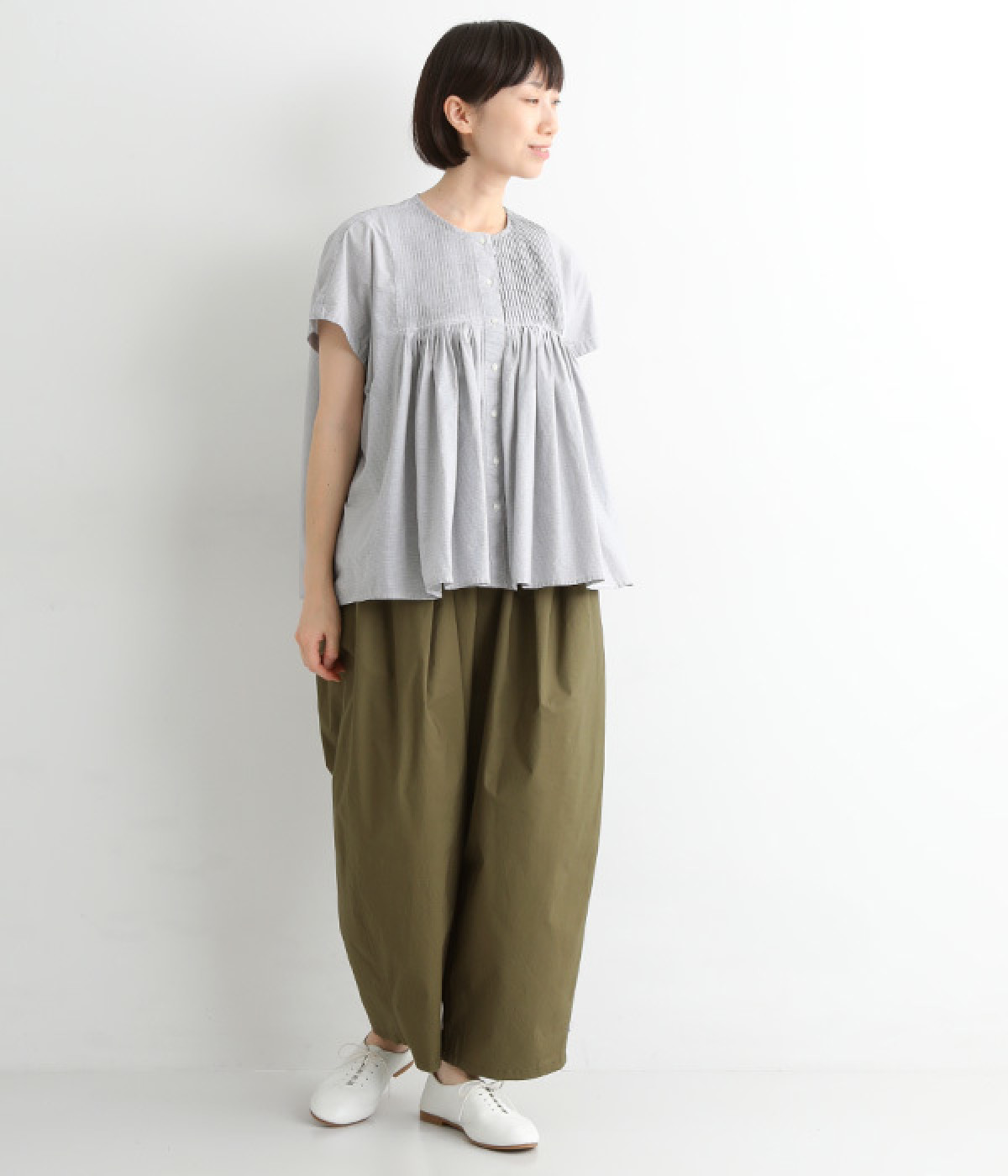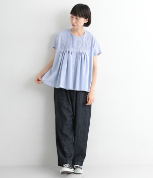 胸元からギャザーで分量を出し、ふんわりソフトなシルエットに