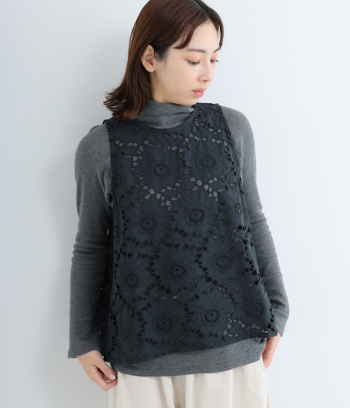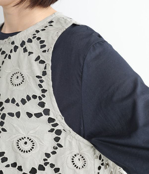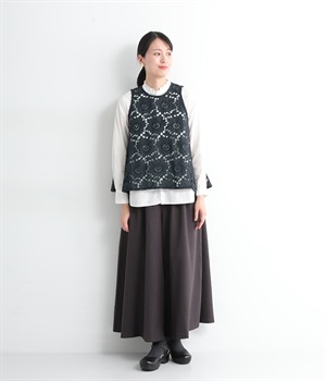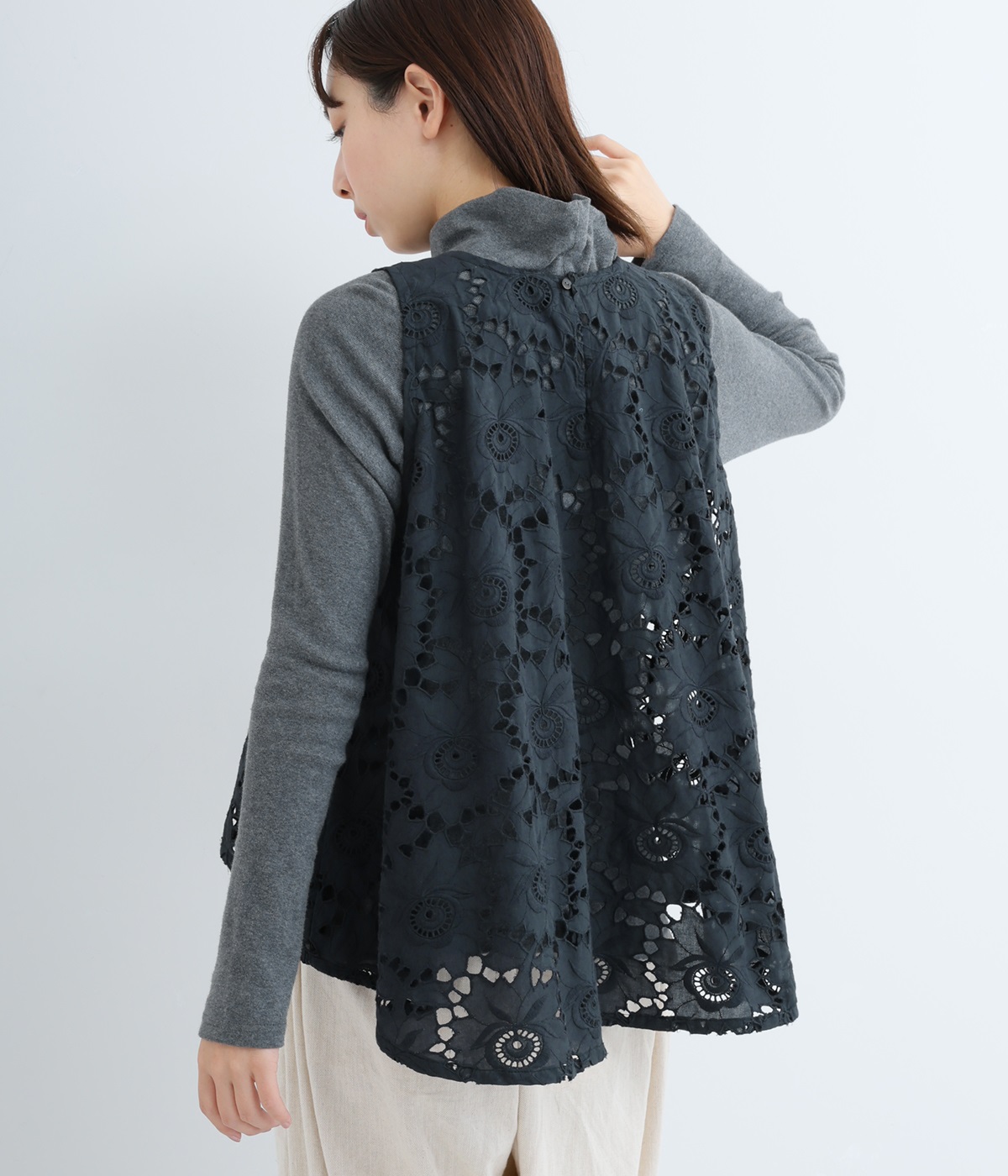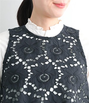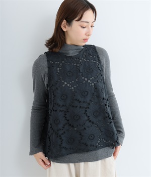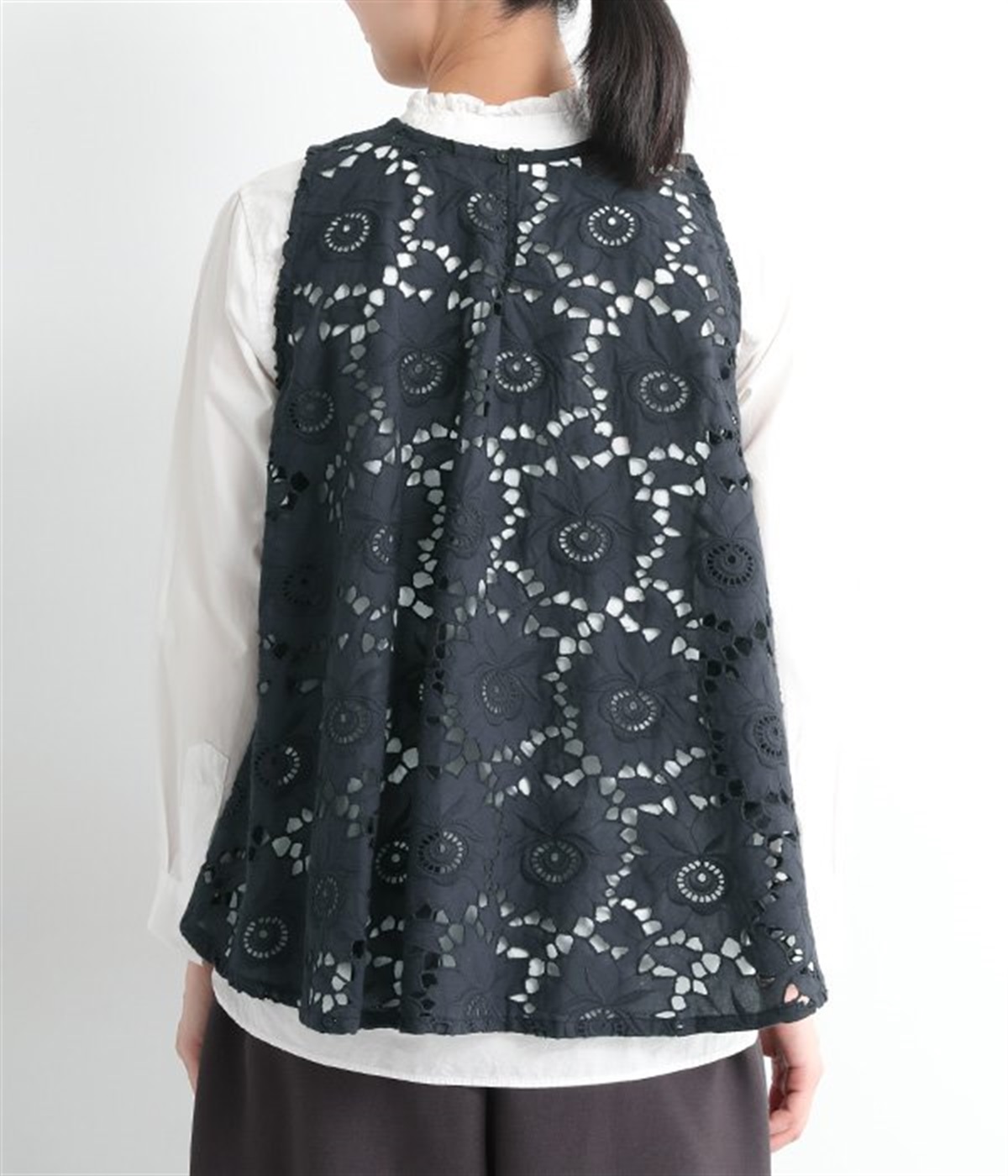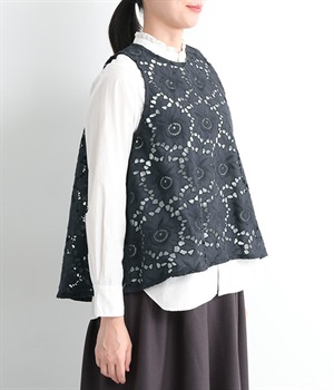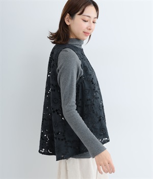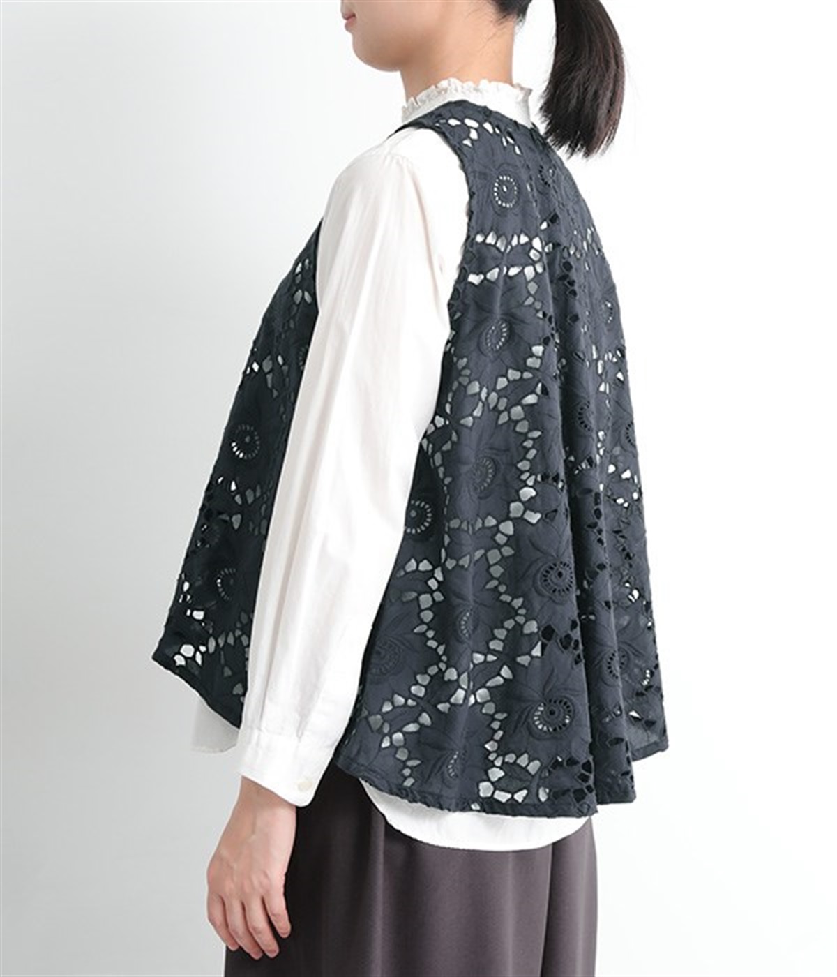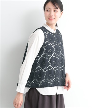 華やかな印象のレース模様が素敵なベストです。裾にむかってゆるやかに広がるフレアシルエットが上品な仕上がり。首もとと肩まわりはコンパクトな作りで、すっきりと大人っぽく着られます。透け感があるので、インナー次第で装いに変化が出せるのもポイント。タートルニット、半袖カットソー、ノースリーブトップスなどさまざまなレイヤードが楽しめる一枚です。