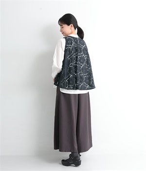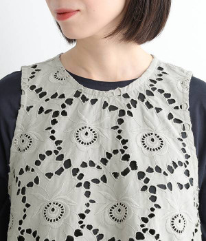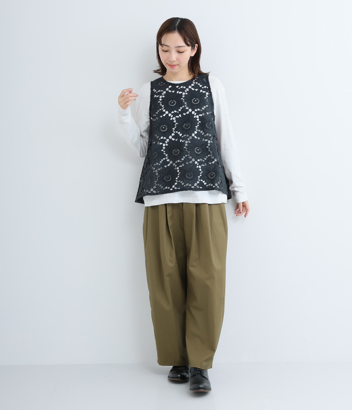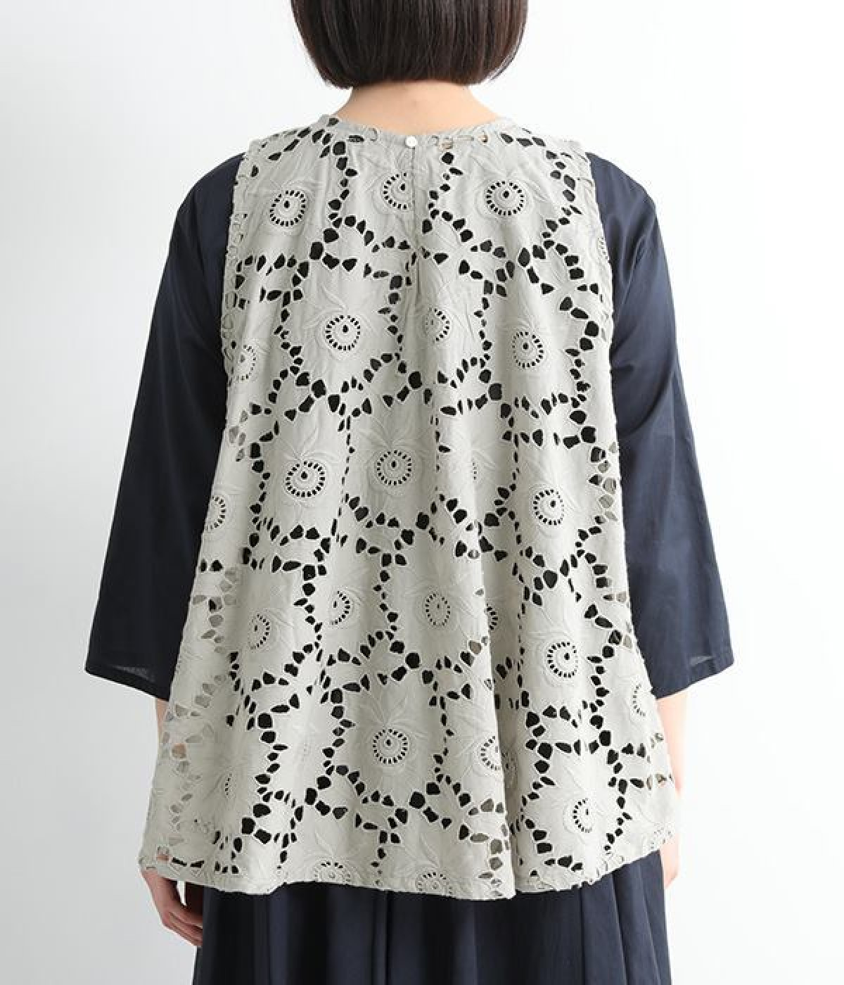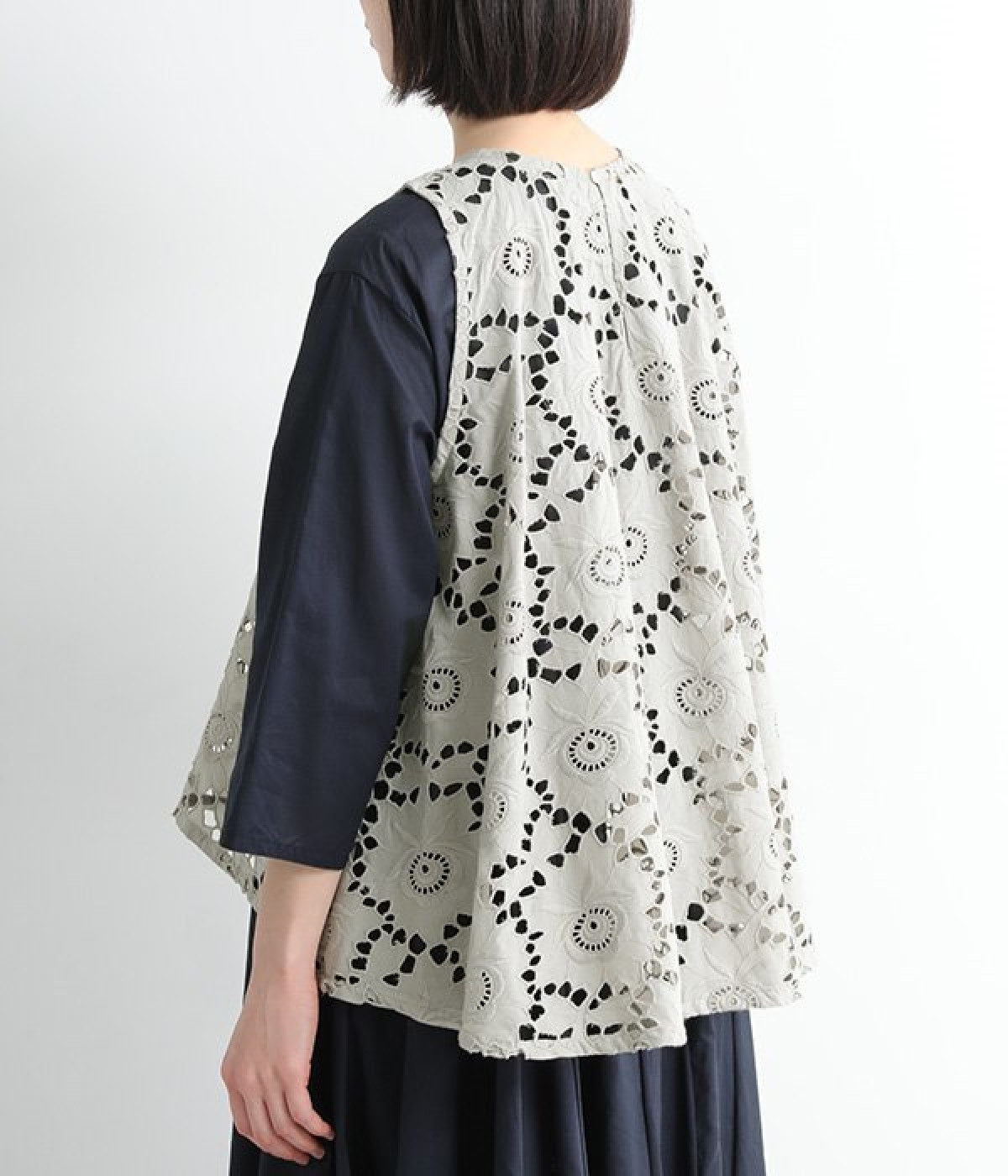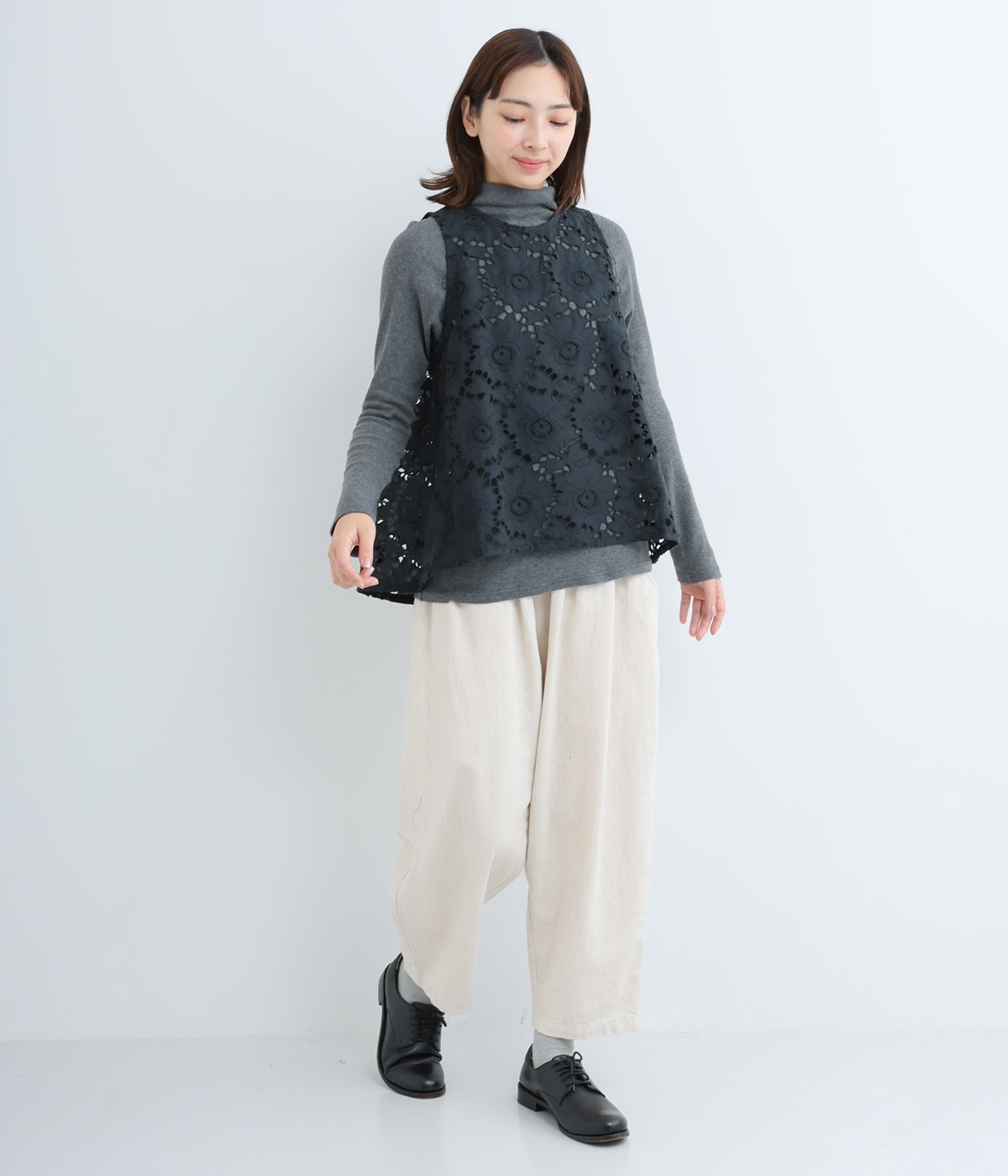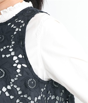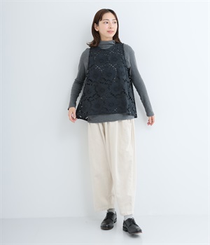 華やかな印象のレース模様が素敵なベストです。裾にむかってゆるやかに広がるフレアシルエットが上品な仕上がり。首もとと肩まわりはコンパクトな作りで、すっきりと大人っぽく着られます。透け感があるので、インナー次第で装いに変化が出せるのもポイント。タートルニット、半袖カットソー、ノースリーブトップスなどさまざまなレイヤードが楽しめる一枚です。