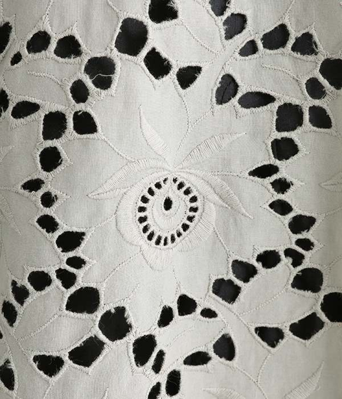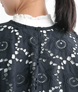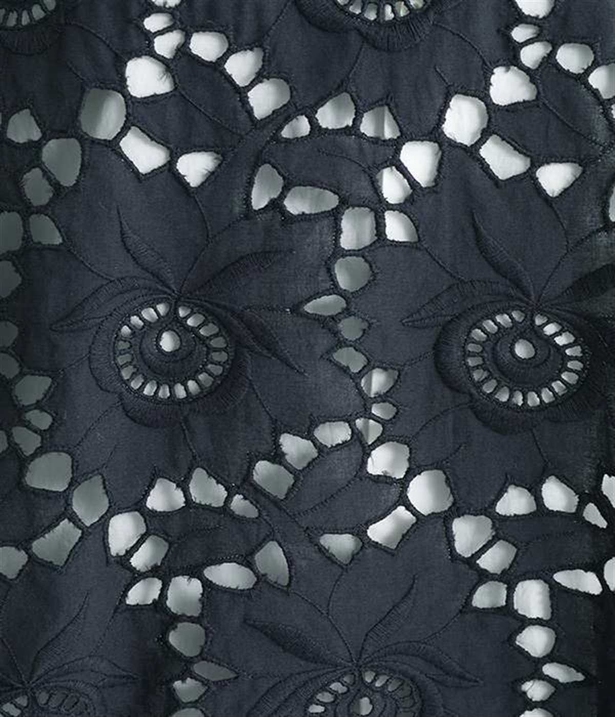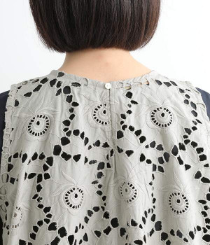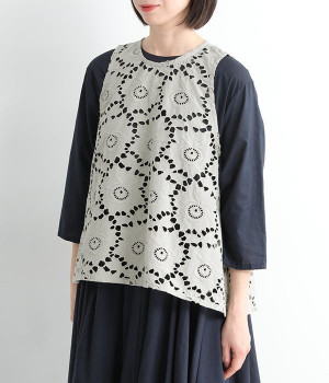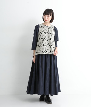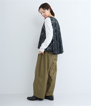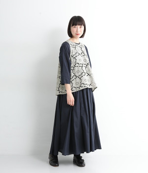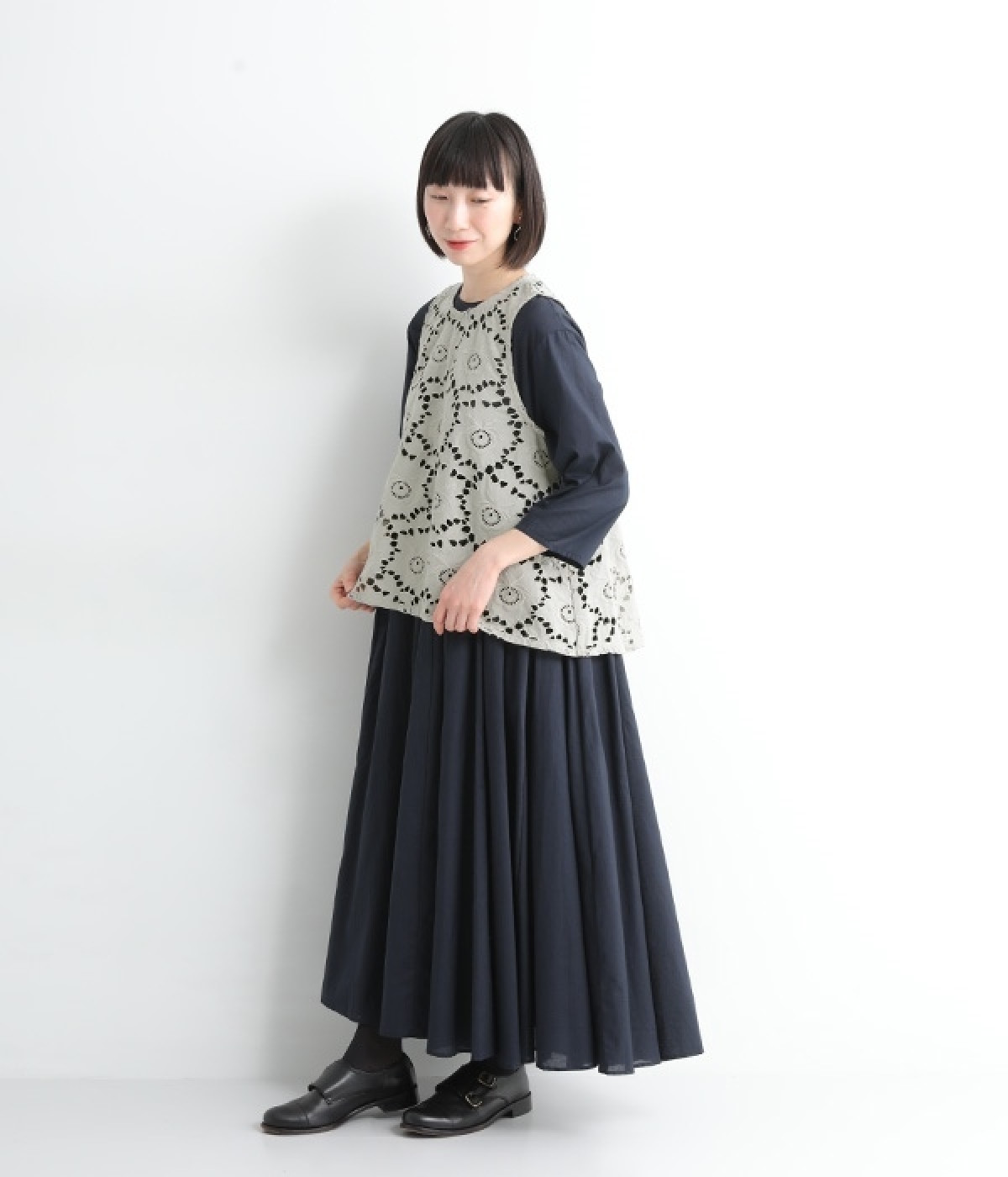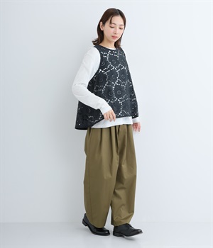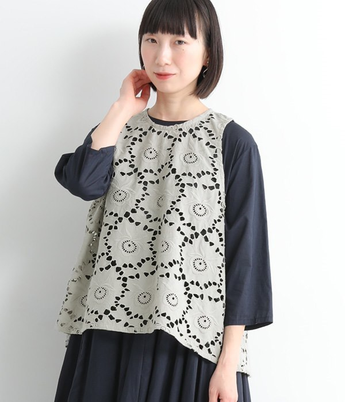 華やかな印象のレース模様が素敵なベストです。裾にむかってゆるやかに広がるフレアシルエットが上品な仕上がり。首もとと肩まわりはコンパクトな作りで、すっきりと大人っぽく着られます。透け感があるので、インナー次第で装いに変化が出せるのもポイント。タートルニット、半袖カットソー、ノースリーブトップスなどさまざまなレイヤードが楽しめる一枚です。