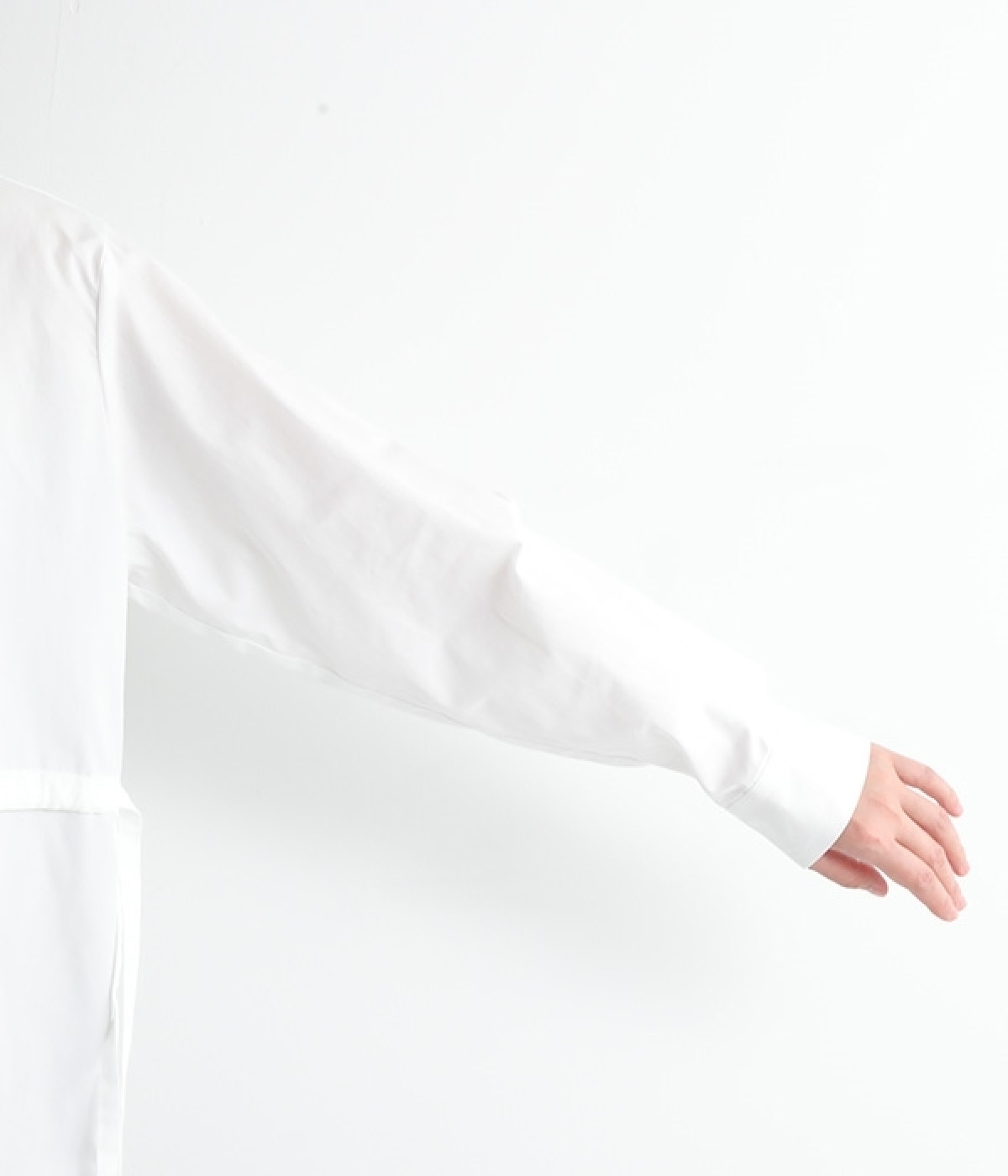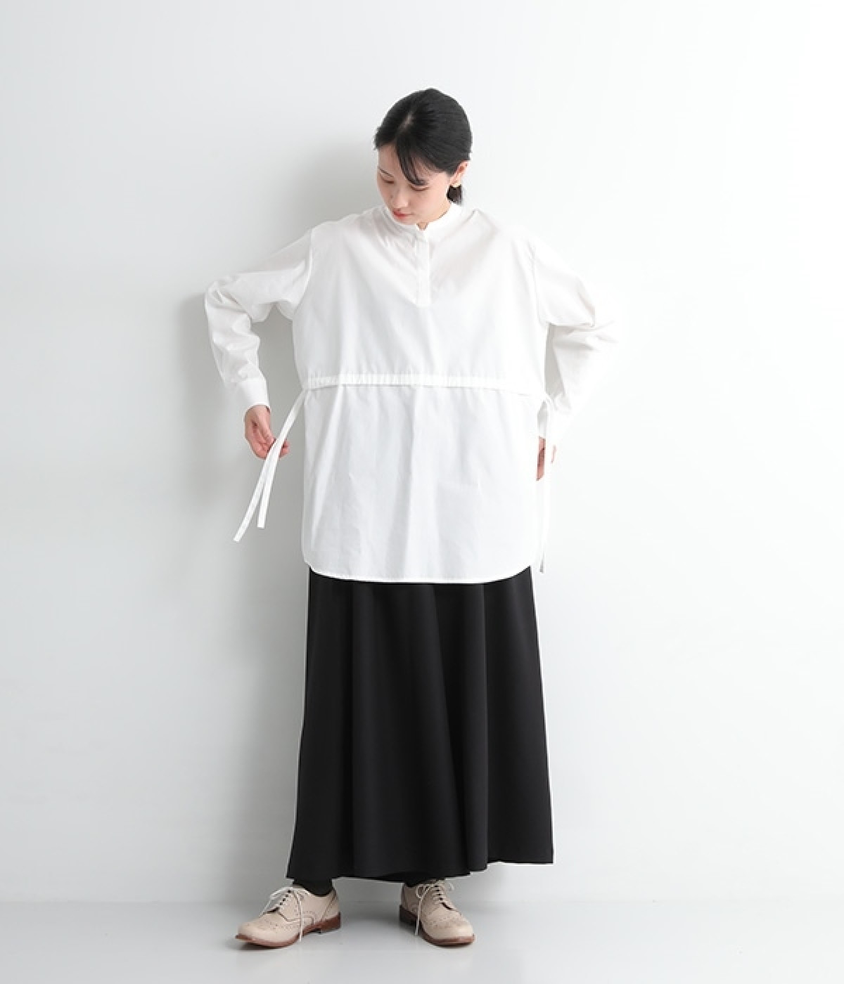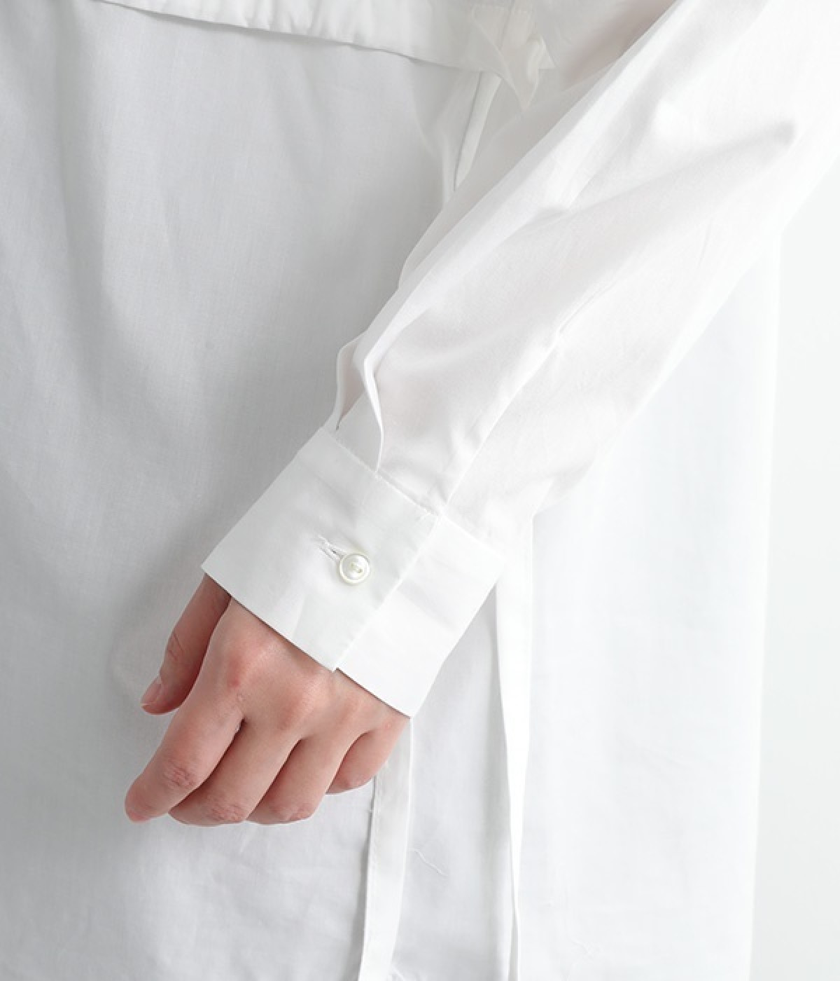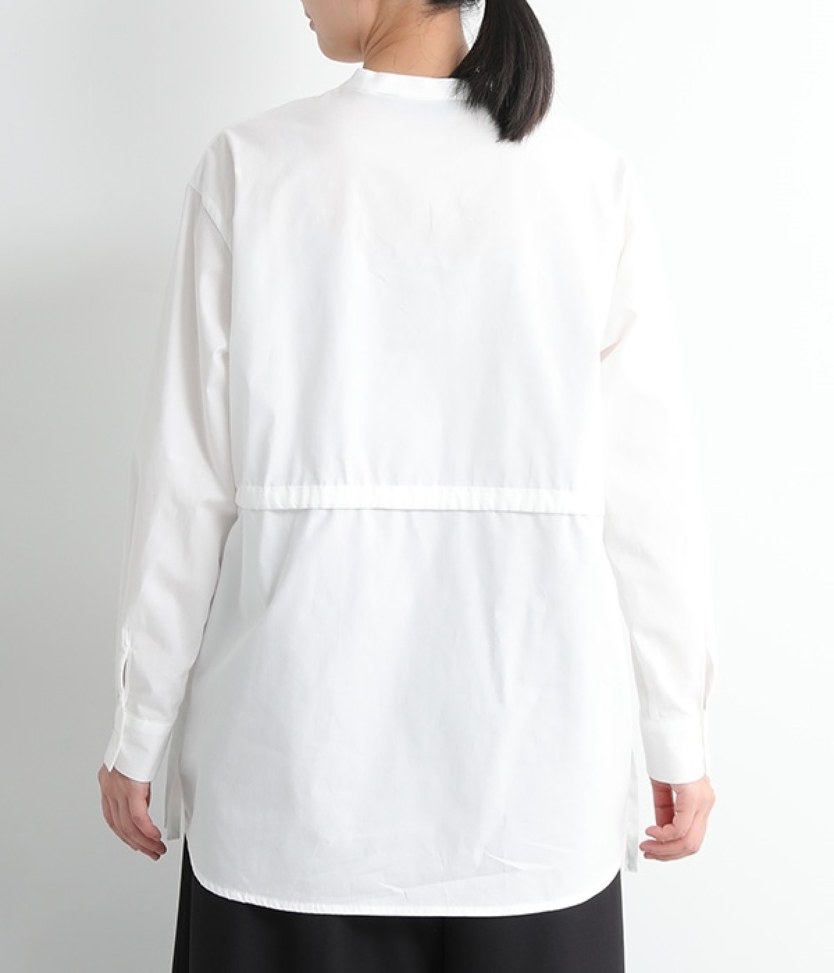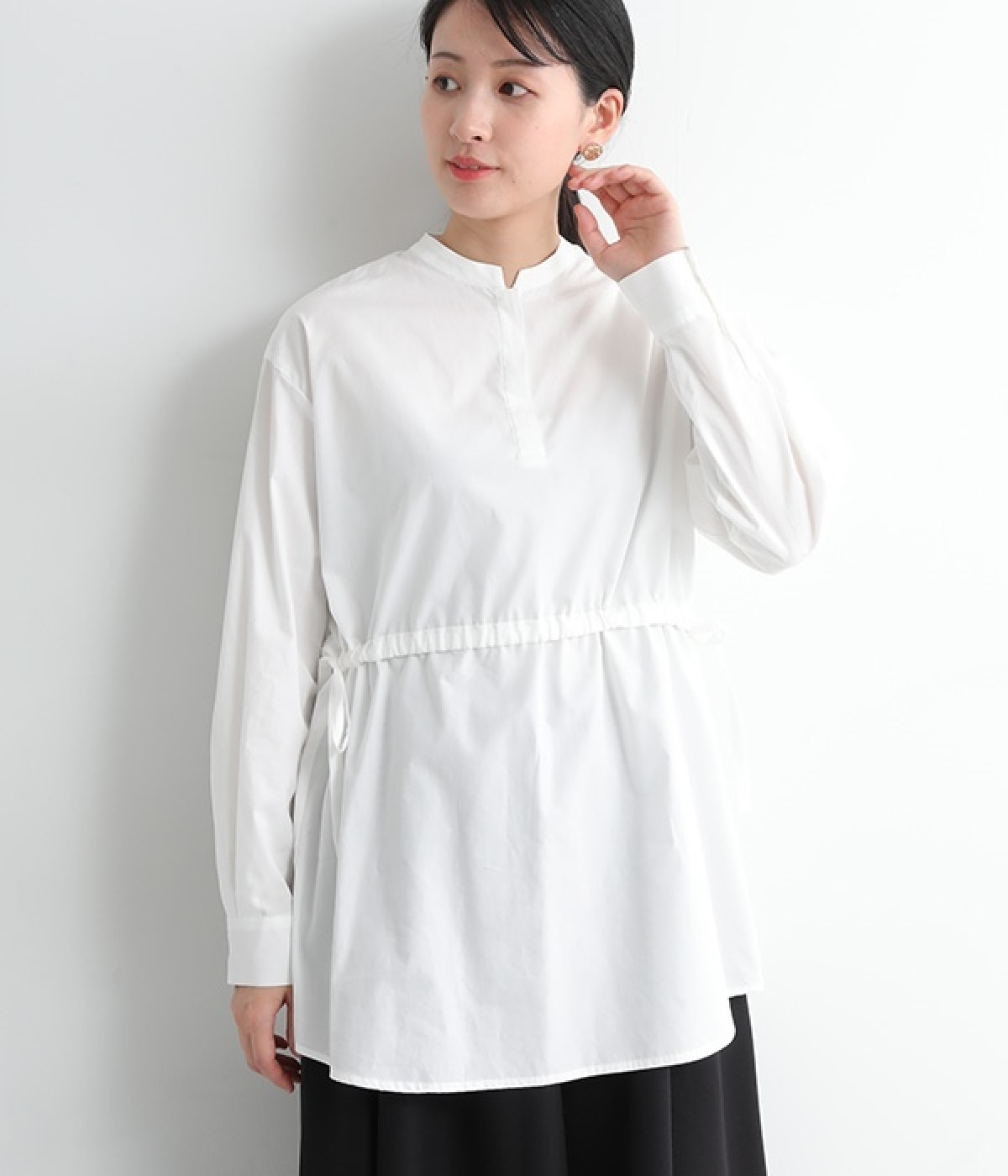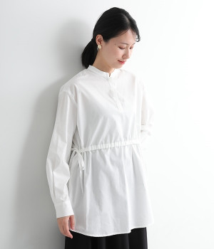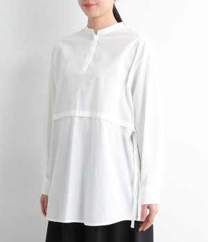 適度なハリのある、上質なコットン生地で仕立てたシャツ。程よい高さのスタンドカラーと比翼あきで上品なムードが漂います。胸下に配されたリボンをキュッと絞ることでシルエットのアレンジが可能。ワイドな身幅と腰まわりをカバーする丈でリラクシーな着こなしが叶います。ロングスカートやワイドパンツなどの分量感のあるボトムと合わせるのもおすすめです。