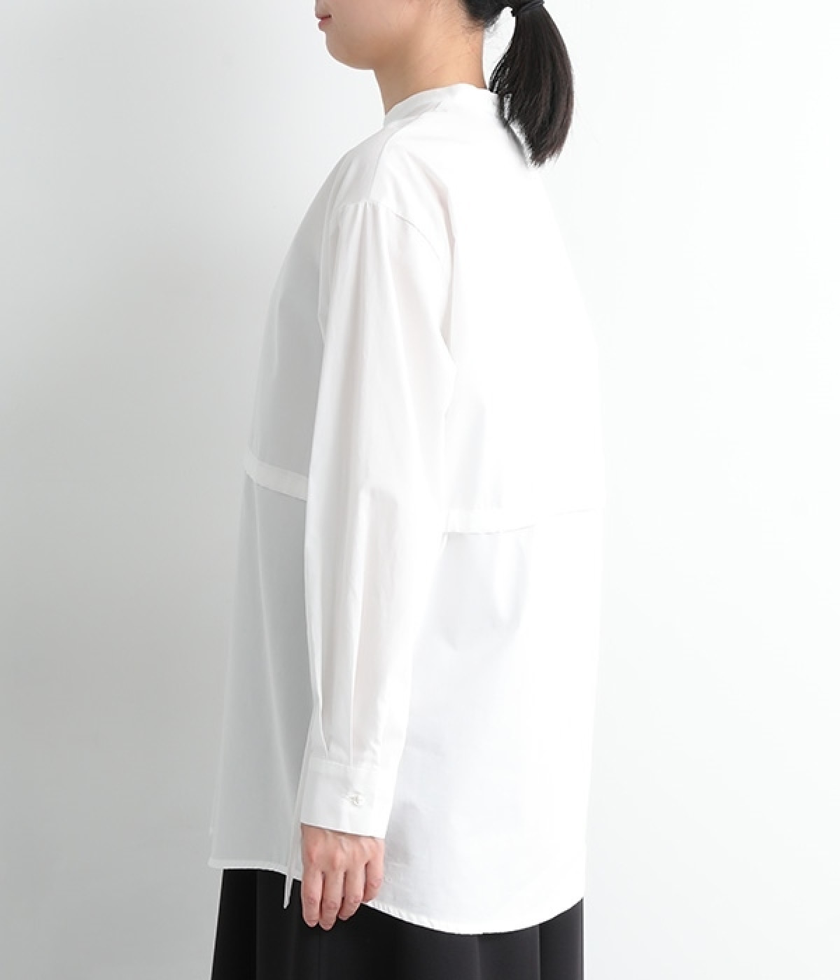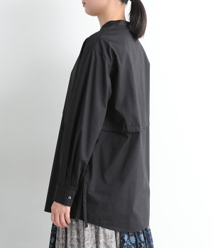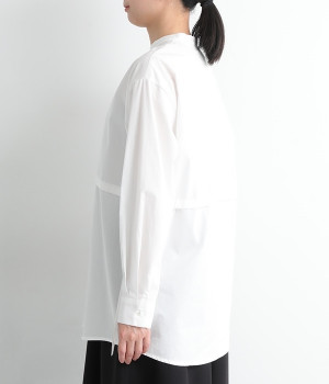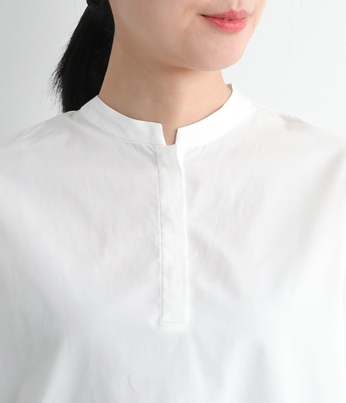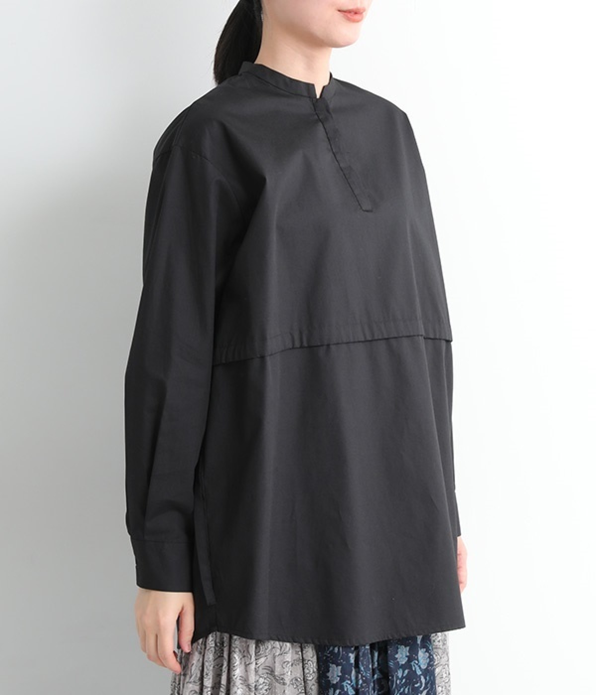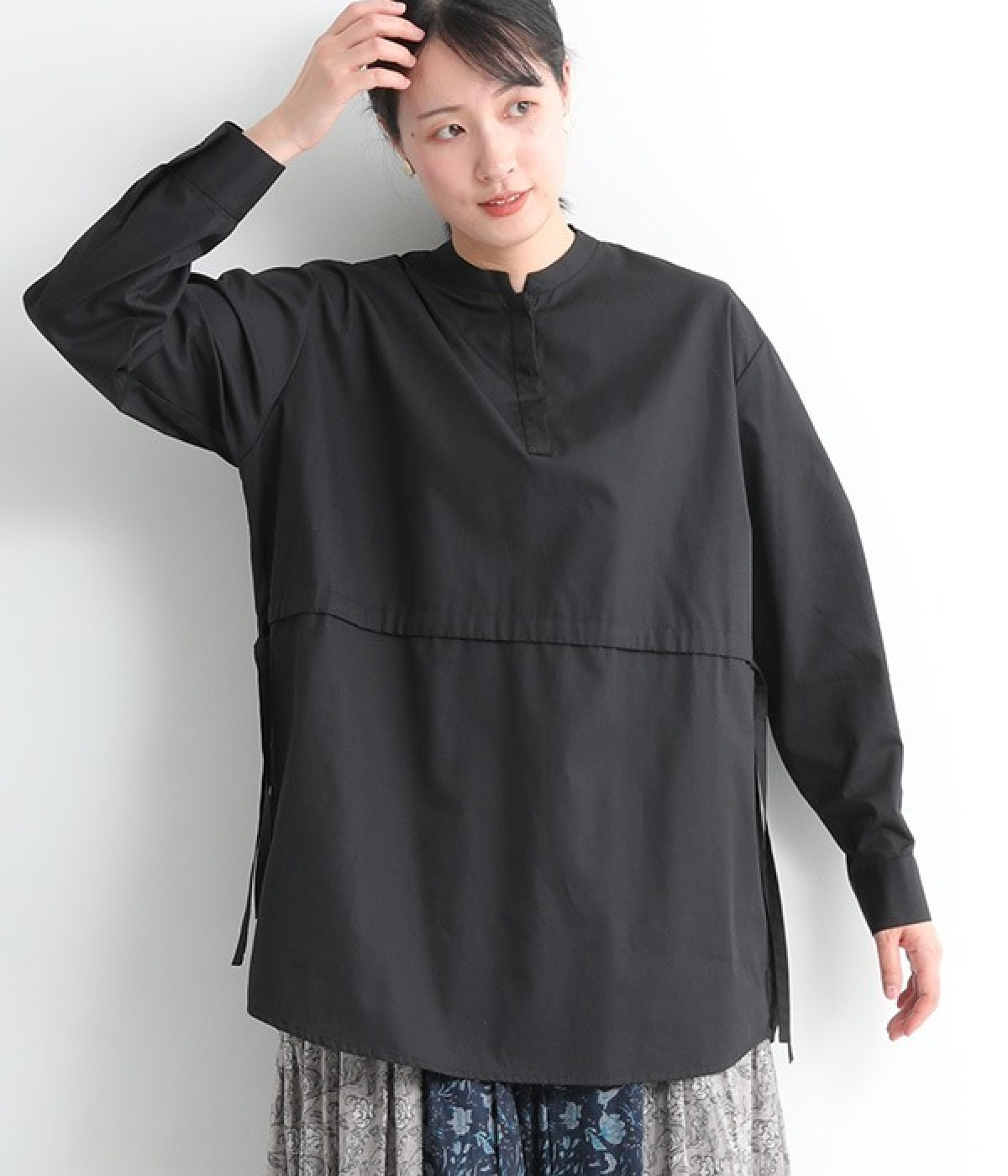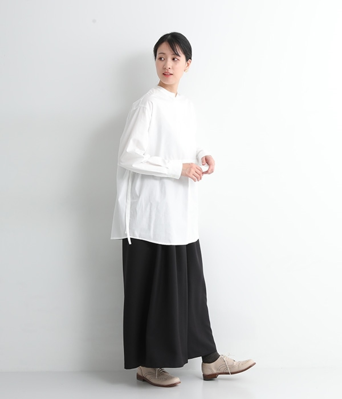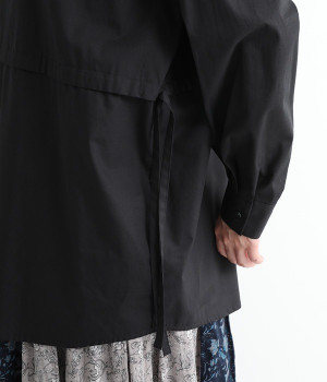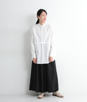 適度なハリのある、上質なコットン生地で仕立てたシャツ。程よい高さのスタンドカラーと比翼あきで上品なムードが漂います。胸下に配されたリボンをキュッと絞ることでシルエットのアレンジが可能。ワイドな身幅と腰まわりをカバーする丈でリラクシーな着こなしが叶います。ロングスカートやワイドパンツなどの分量感のあるボトムと合わせるのもおすすめです。