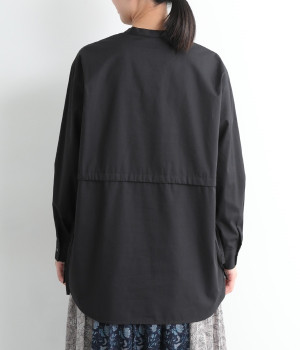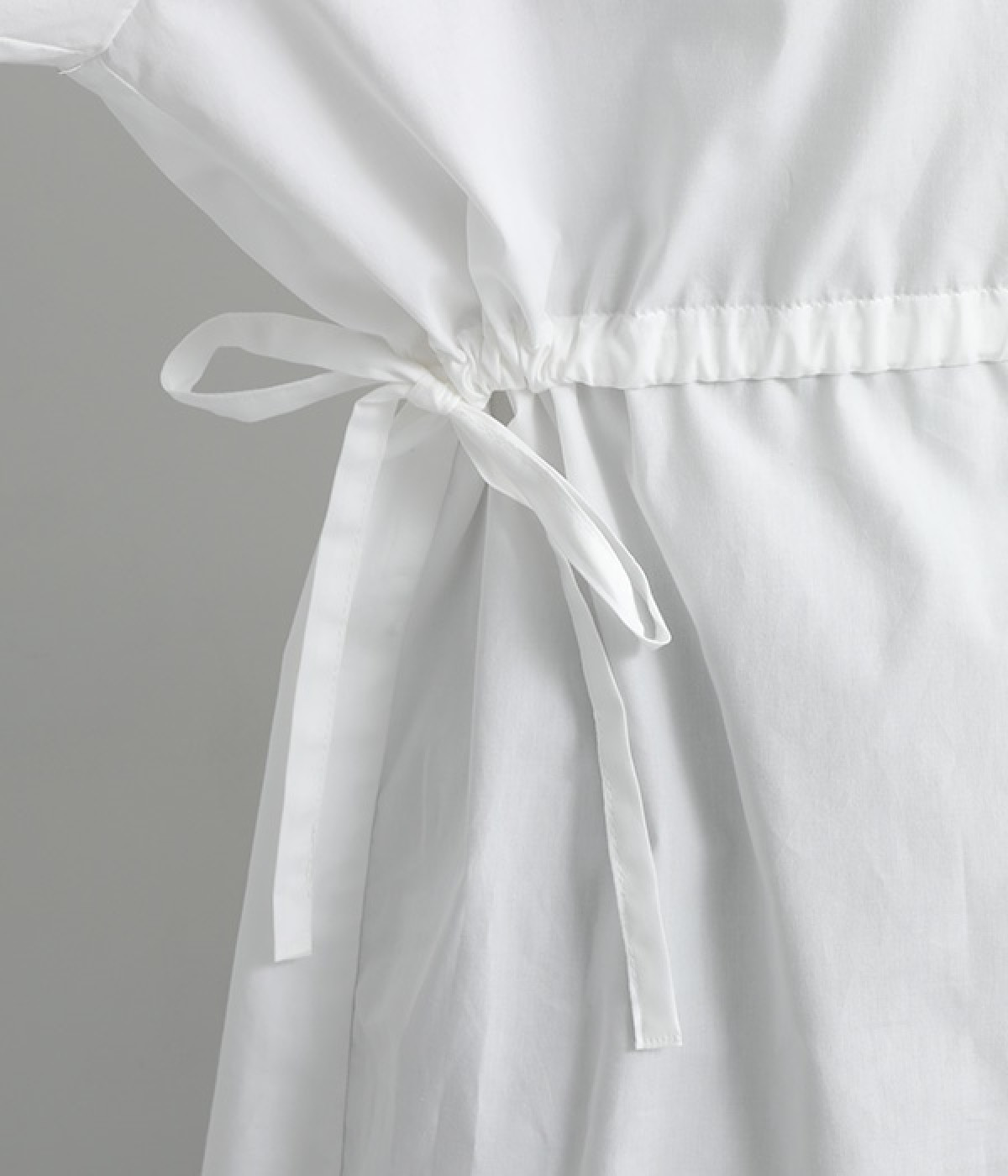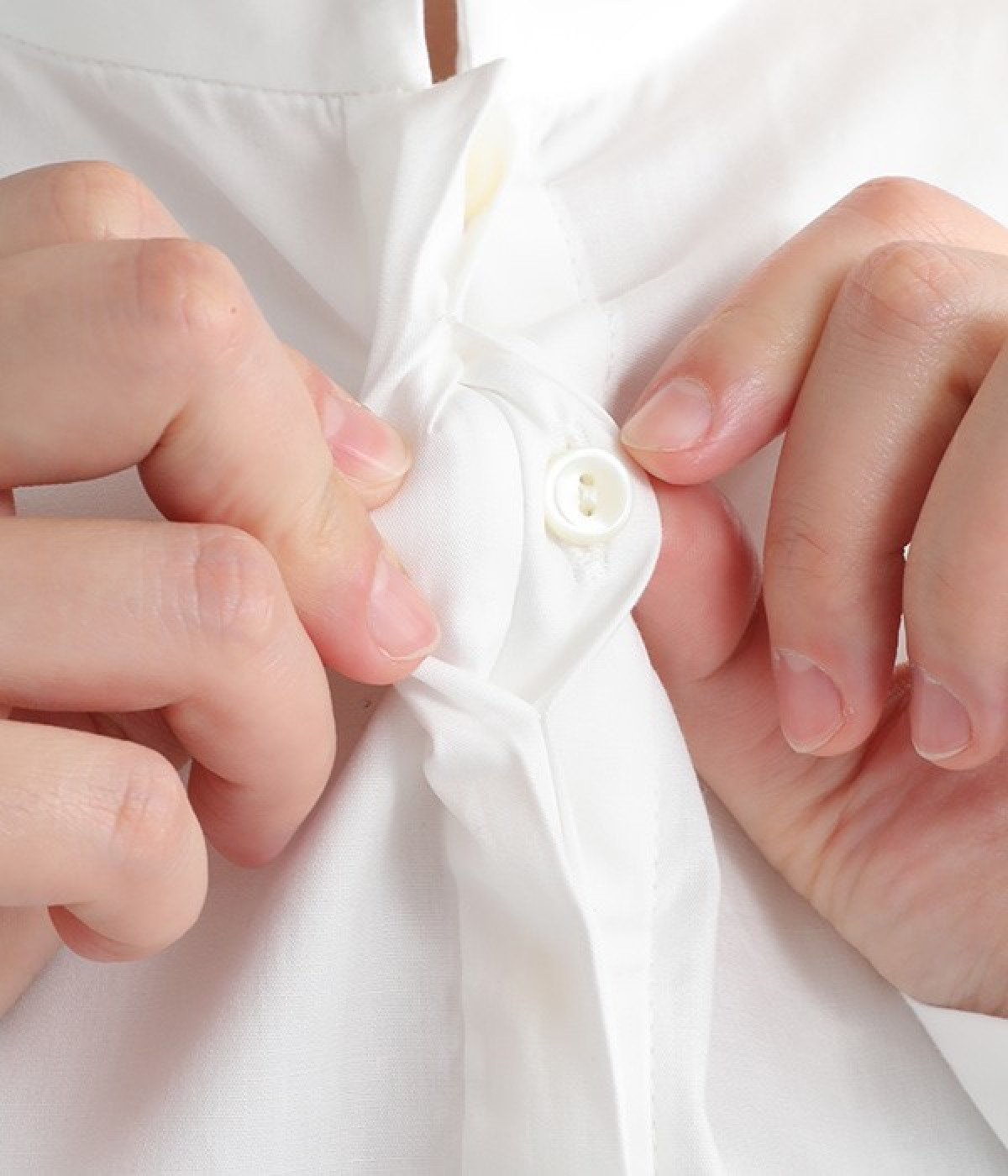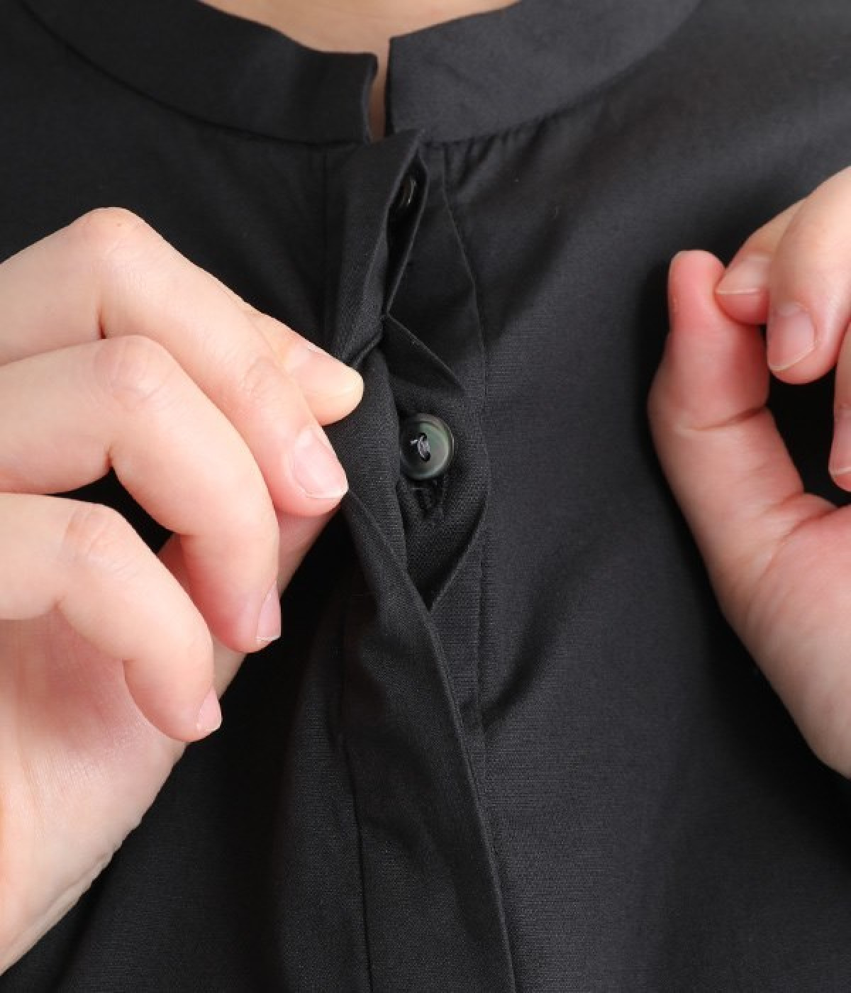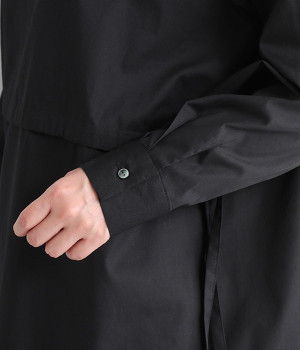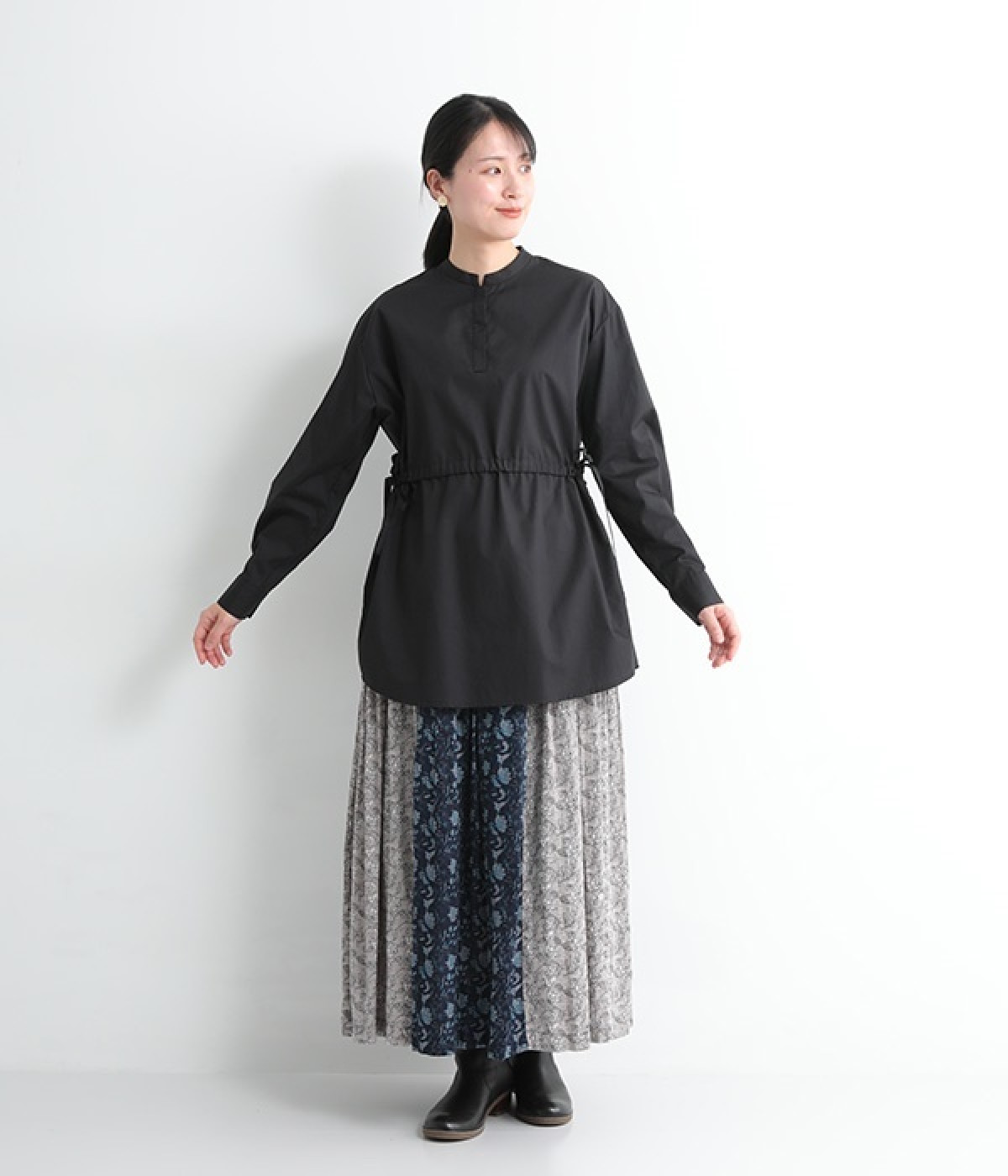 適度なハリのある、上質なコットン生地で仕立てたシャツ。程よい高さのスタンドカラーと比翼あきで上品なムードが漂います。胸下に配されたリボンをキュッと絞ることでシルエットのアレンジが可能。ワイドな身幅と腰まわりをカバーする丈でリラクシーな着こなしが叶います。ロングスカートやワイドパンツなどの分量感のあるボトムと合わせるのもおすすめです。