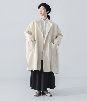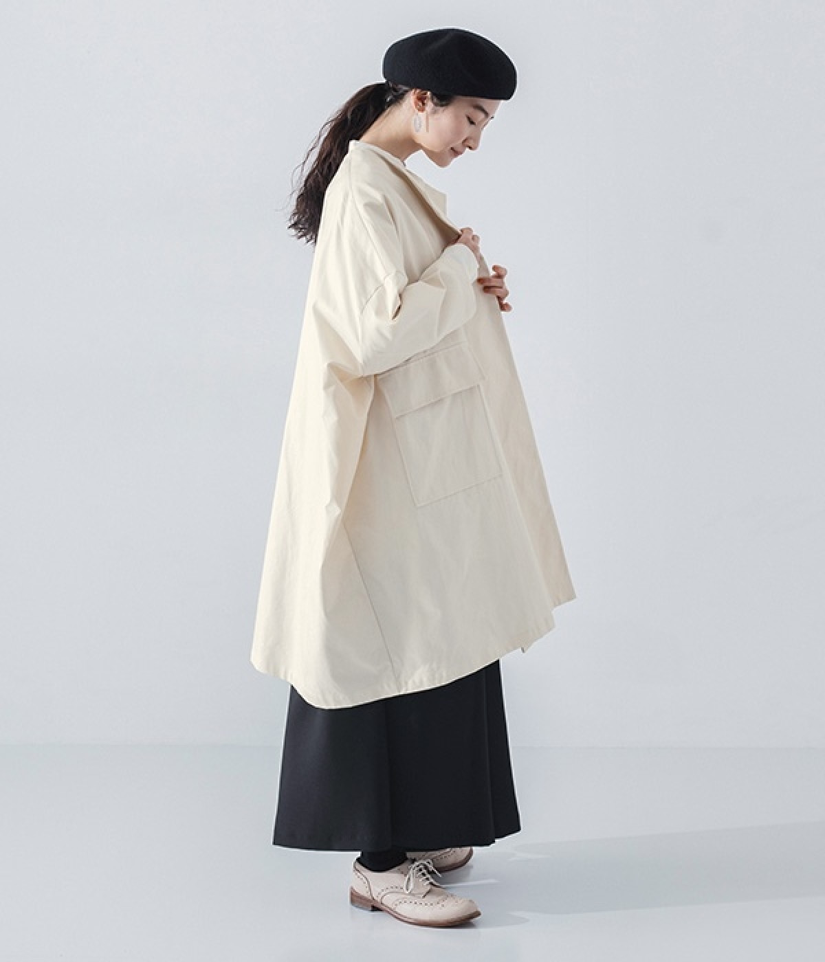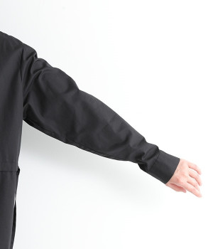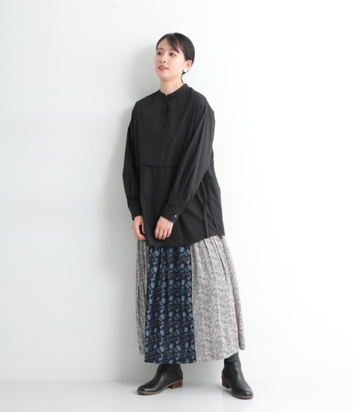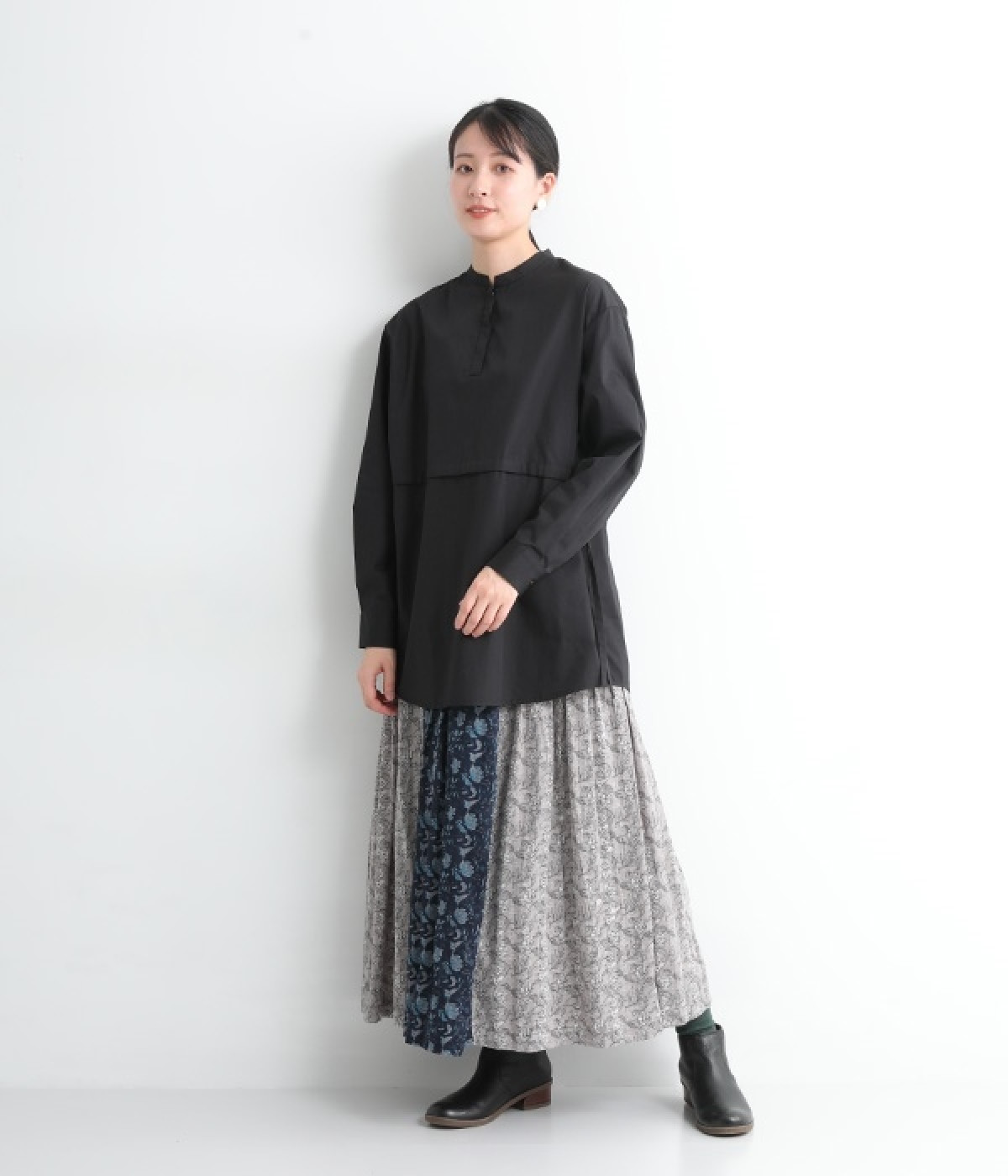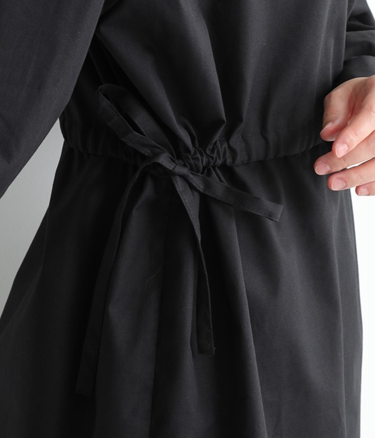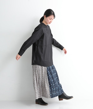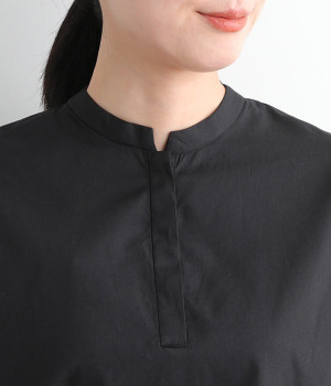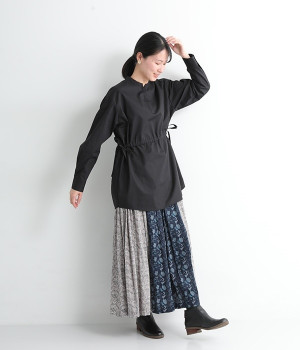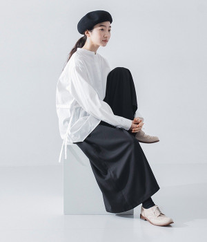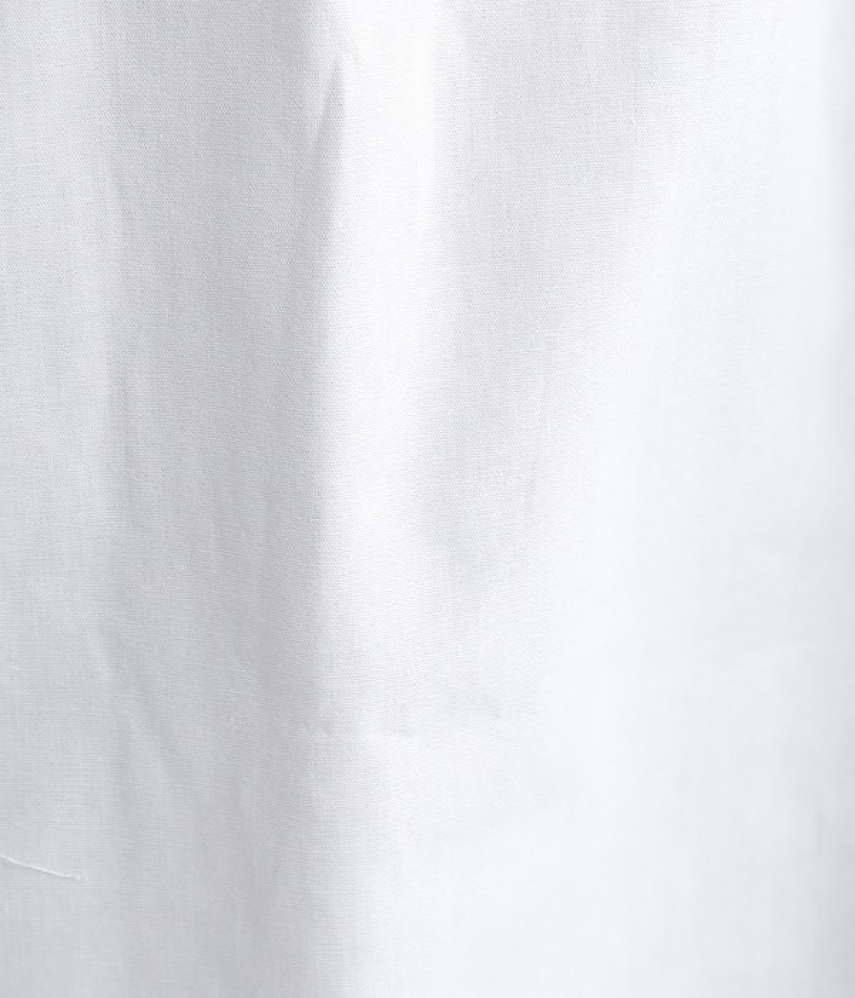 適度なハリのある、上質なコットン生地で仕立てたシャツ。程よい高さのスタンドカラーと比翼あきで上品なムードが漂います。胸下に配されたリボンをキュッと絞ることでシルエットのアレンジが可能。ワイドな身幅と腰まわりをカバーする丈でリラクシーな着こなしが叶います。ロングスカートやワイドパンツなどの分量感のあるボトムと合わせるのもおすすめです。
