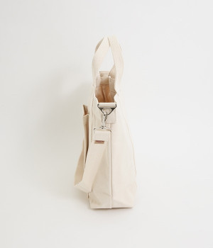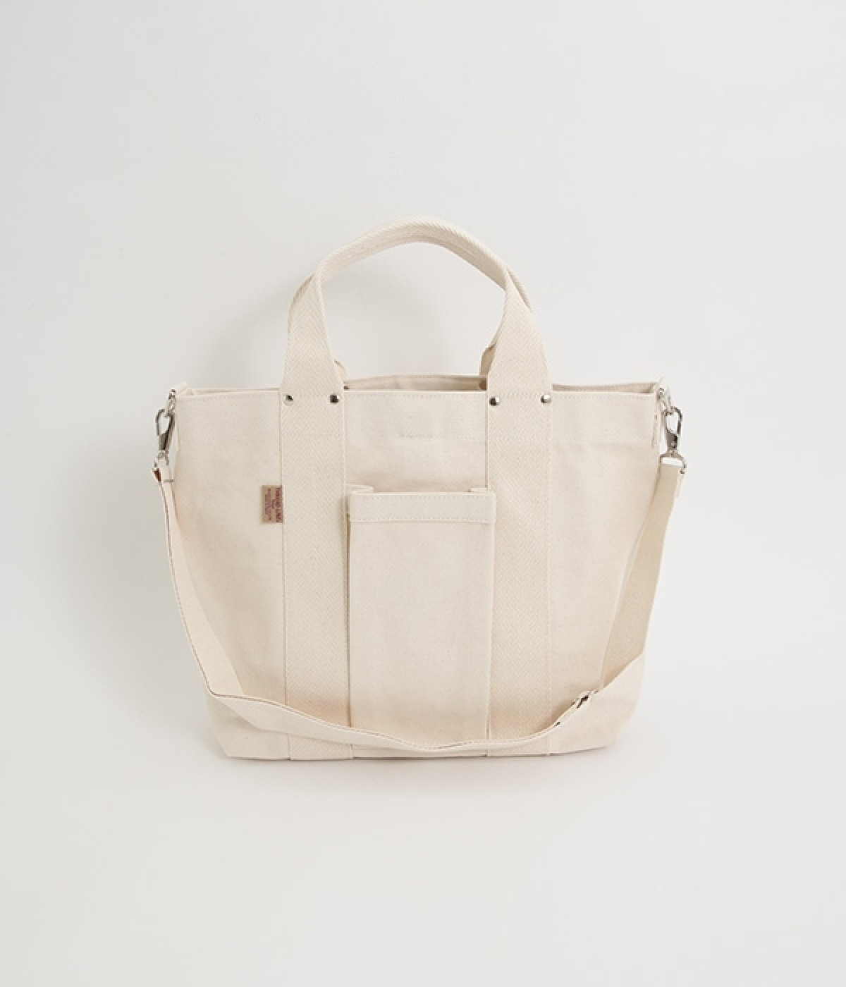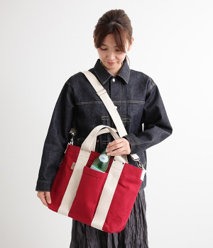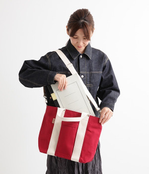耐久性に優れているキャンバス生地で作られた、A4サイズのファイルを楽々収納できる大きさのトートバッグです。前面には大きなポケットがあり、500mlのペットボトルや細見の水筒ならすっぽりと収まります。取り外し可能なショルダーストラップが付いているので、手持ちにも肩掛けにもできて便利◎。シーンやコーディネートに合わせて自由にアレンジできます。
