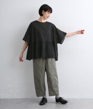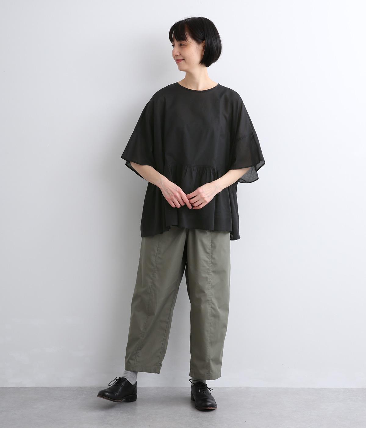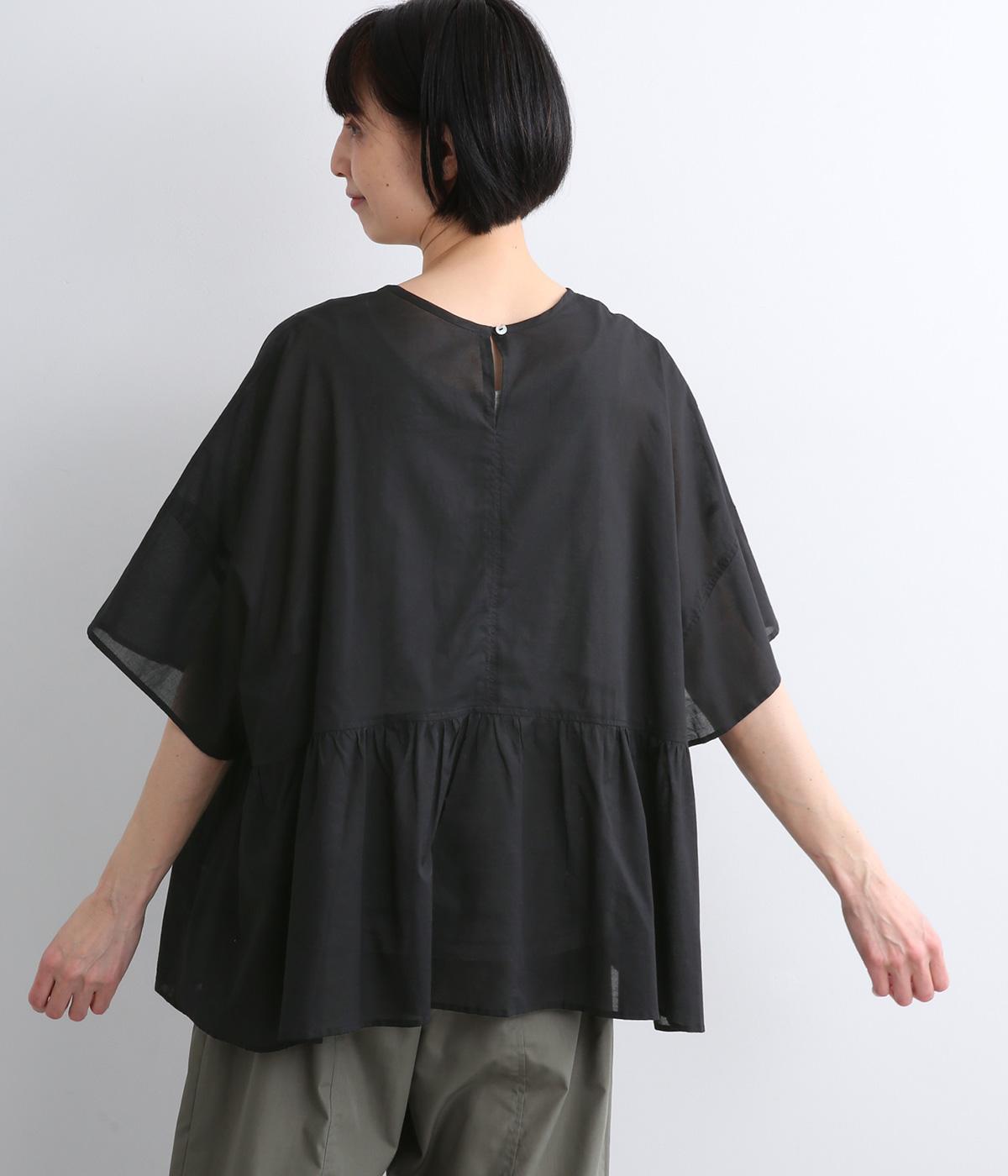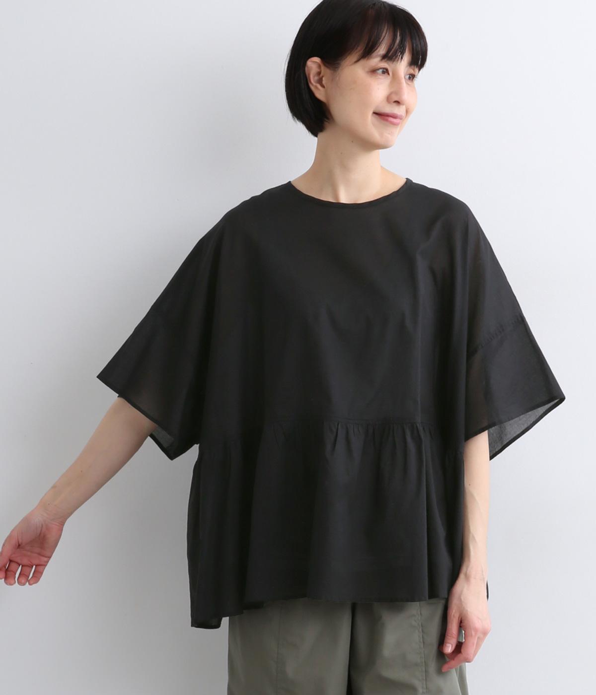 ウエスト切り替えにたっぷりとギャザーをあしらった、ふんわりシルエットのリラクシーなブラウスです。透け感の出る素材が涼しげで、インナー合わせで印象が変わります。バックネックにはシェルボタンをつけて、着脱のしやすさをアップ。