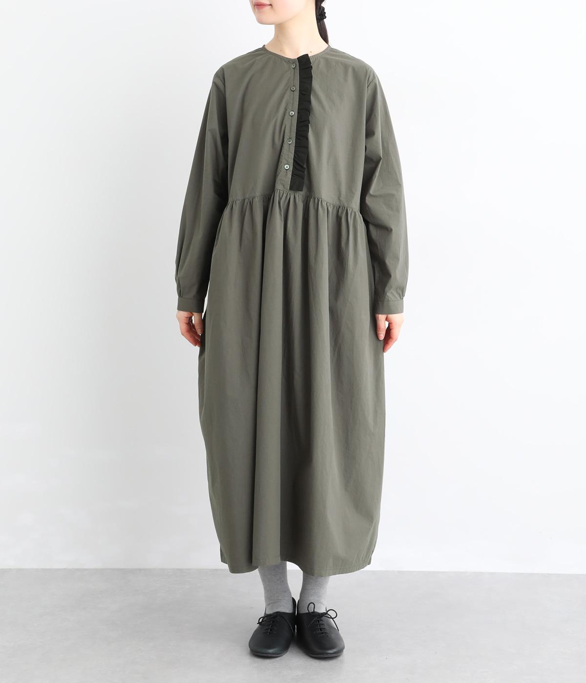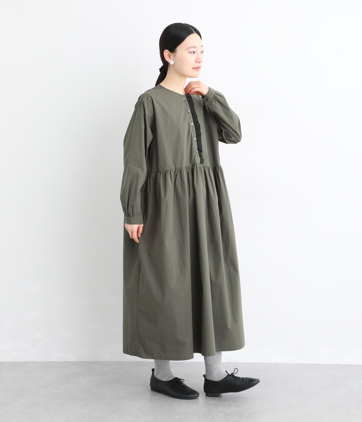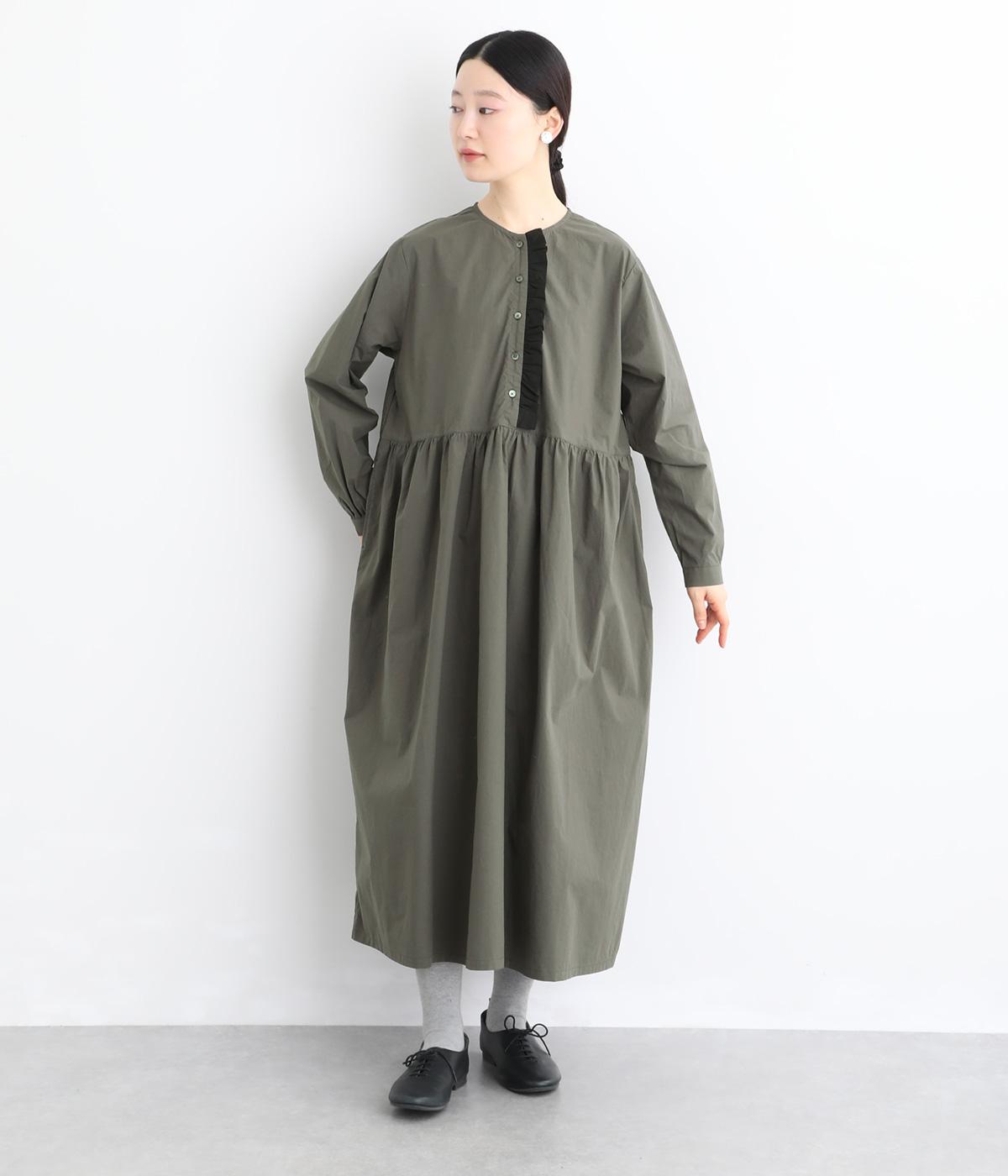 前立てにあしらったフリルが、上品な華やかさを添えるワンピースです。片側のみにフリルを施すことで甘さをおさえ、大人の装いにもなじむ仕上がりに。ウエストから寄せたギャザーがやわらかなシルエットを演出し、きれいめからカジュアルまで、幅広いコーディネートに活躍します。