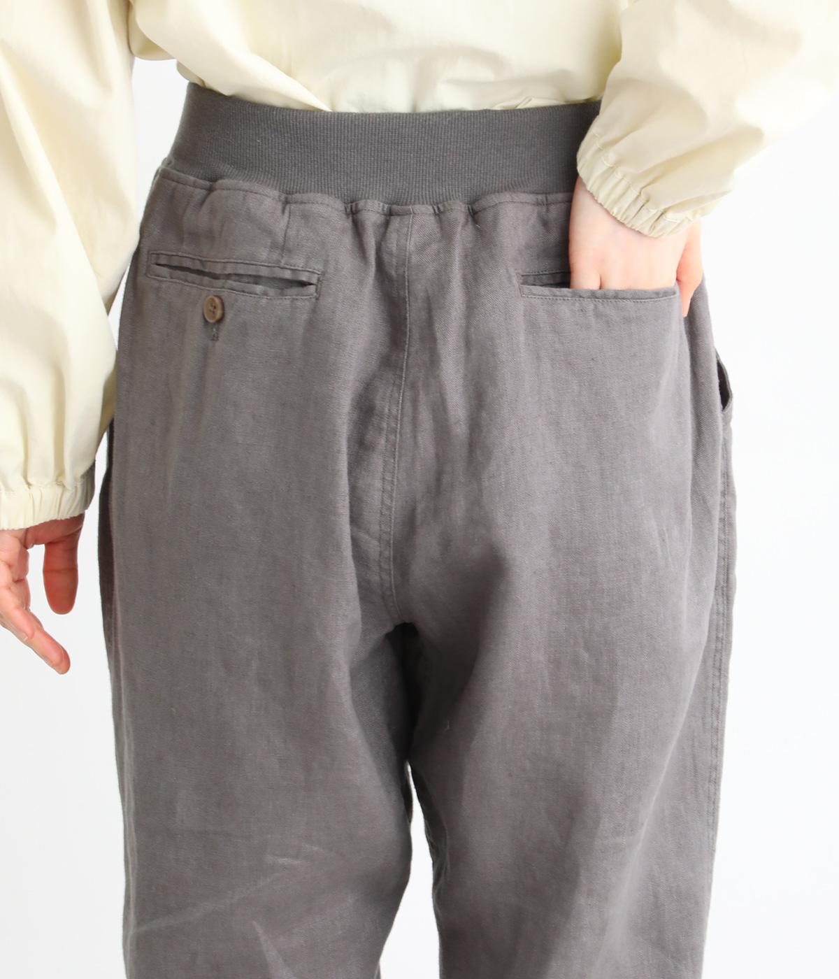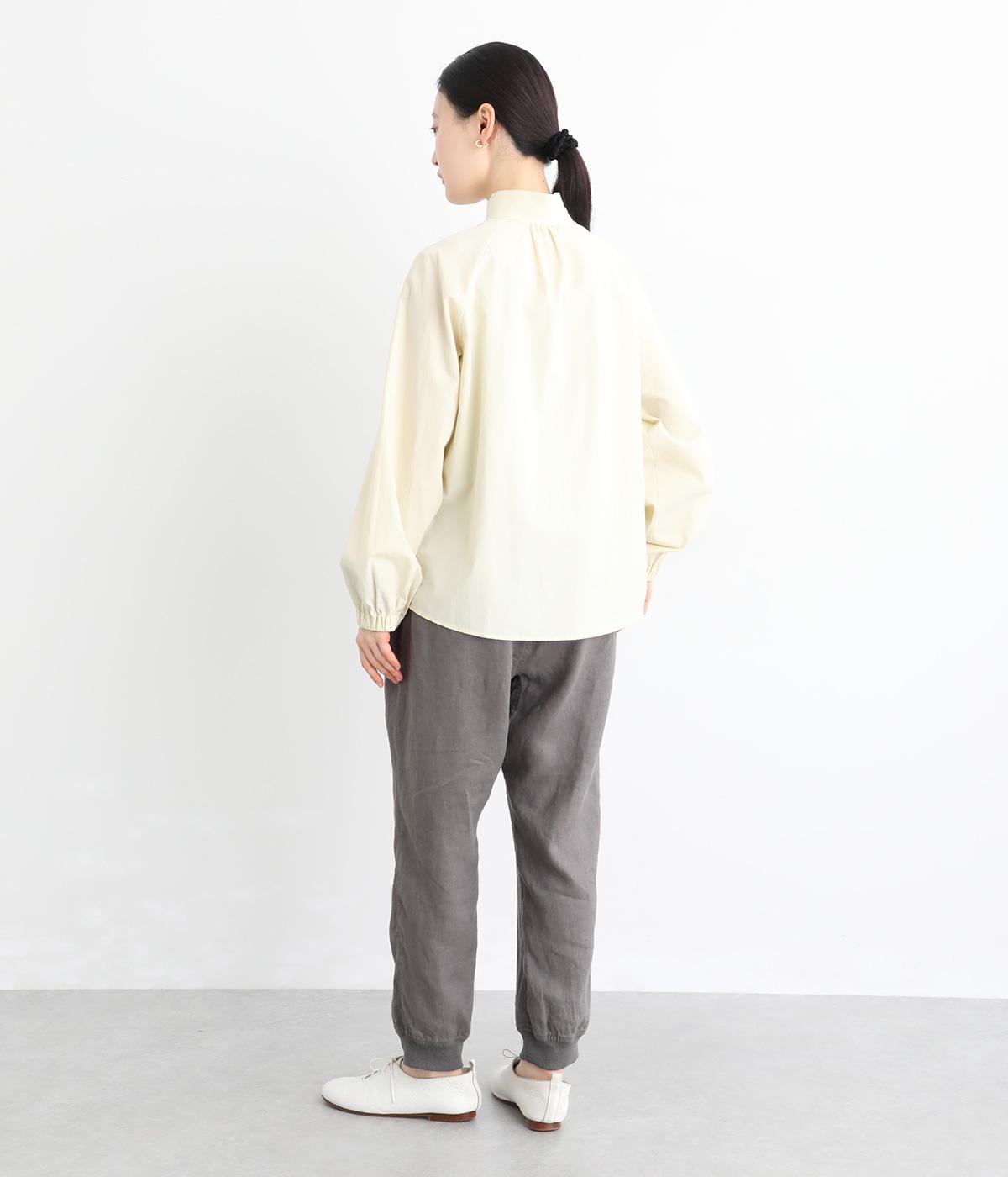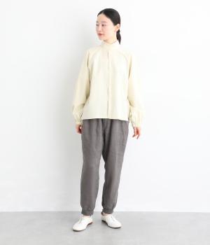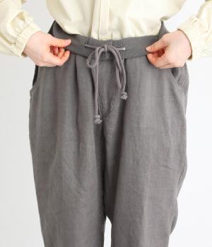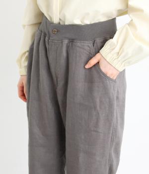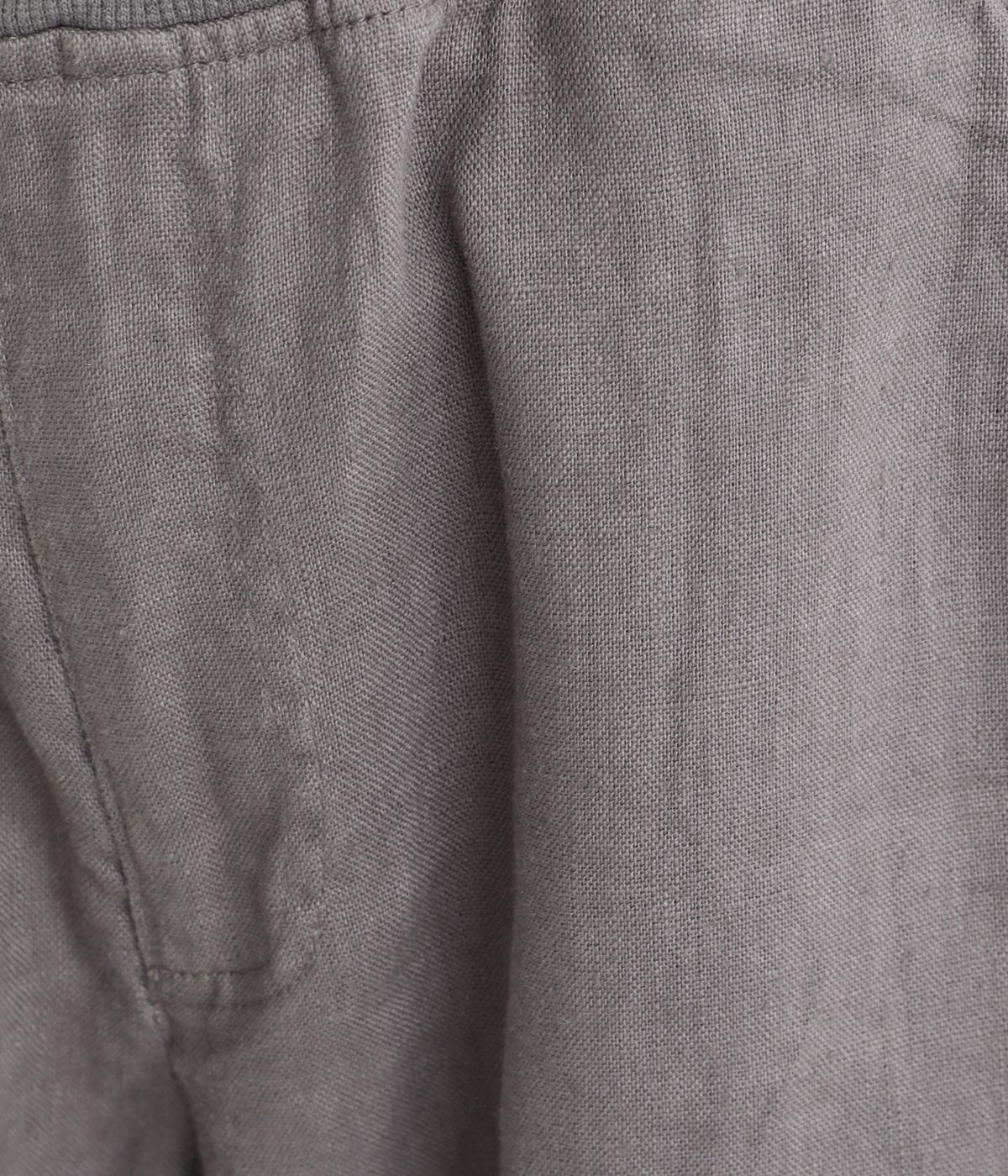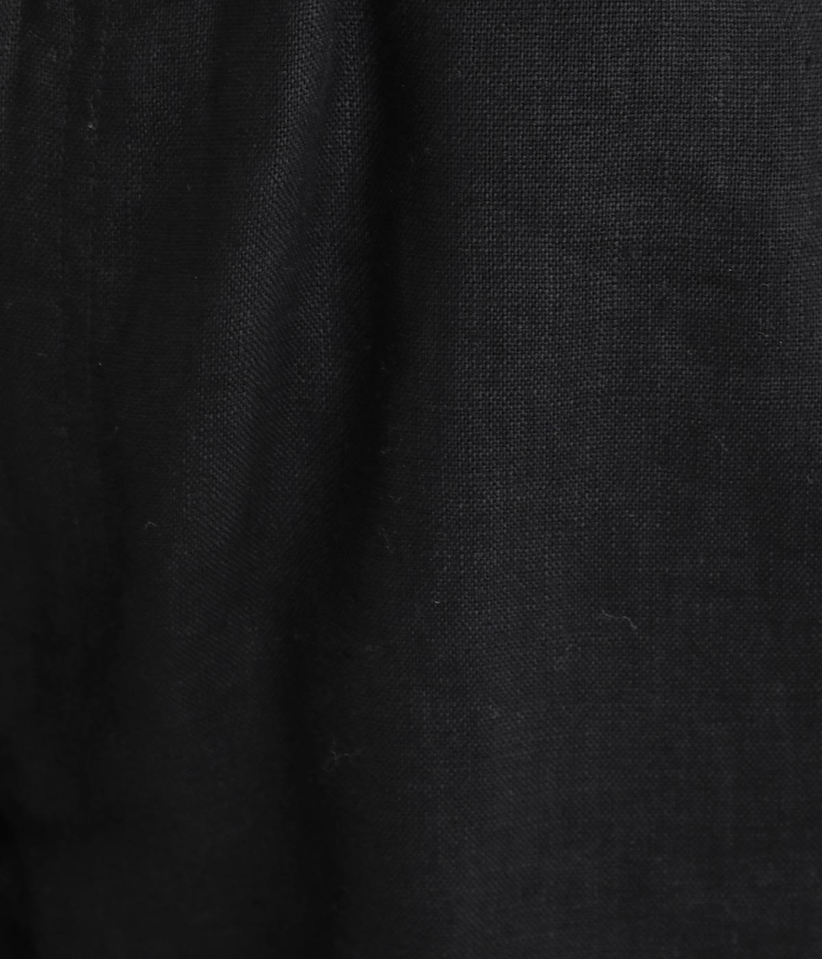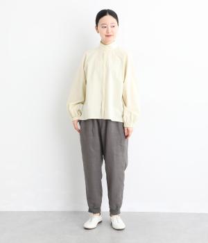 太番手のリネン生地を使用した、しっかりとした風合いが魅力です。ほどよい厚みとハリがありながらも、さらりとした肌ざわりで軽やかな着心地に。ほのかな光沢が奥行きを添え、ナチュラルな雰囲気と存在感のある表情をたのしめます。