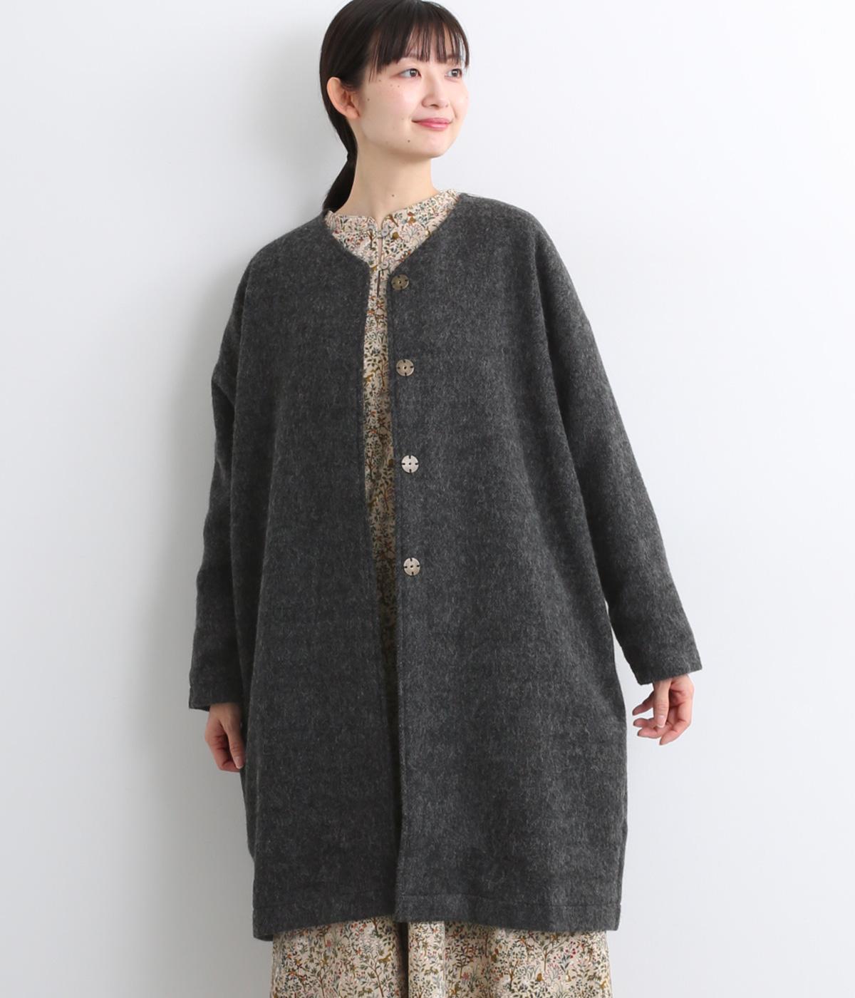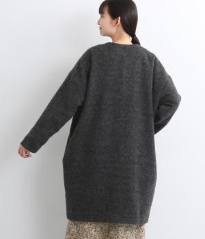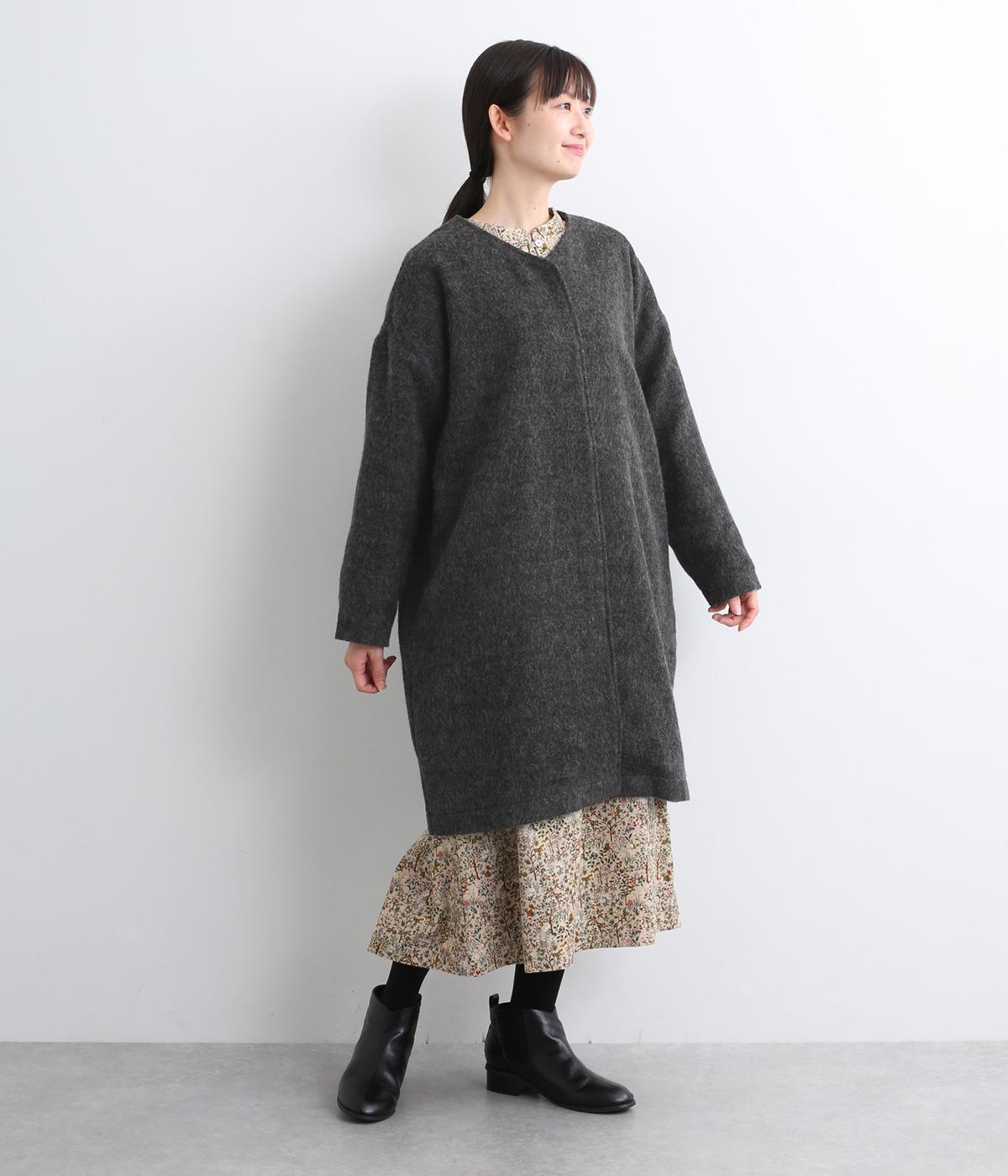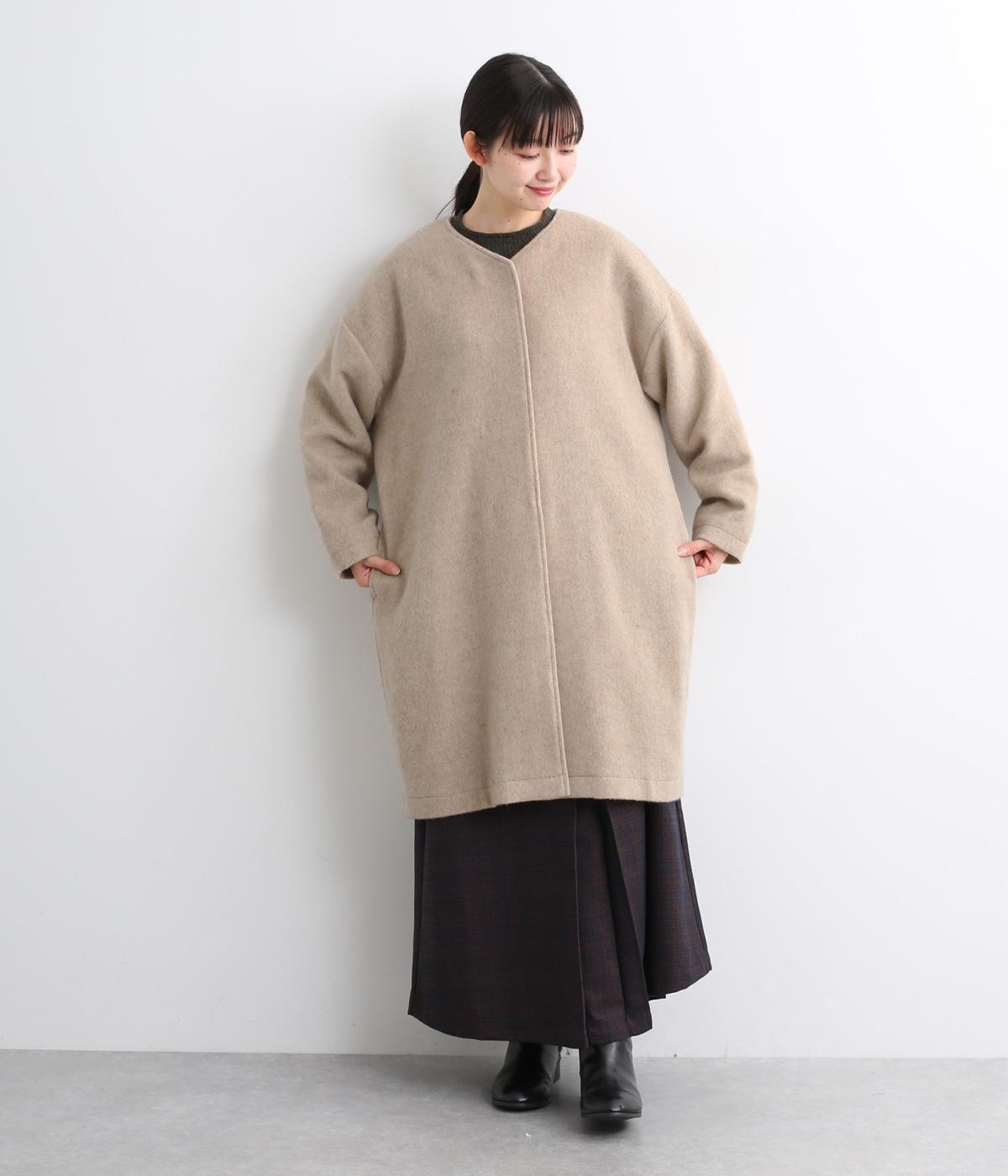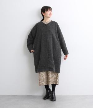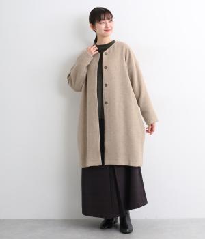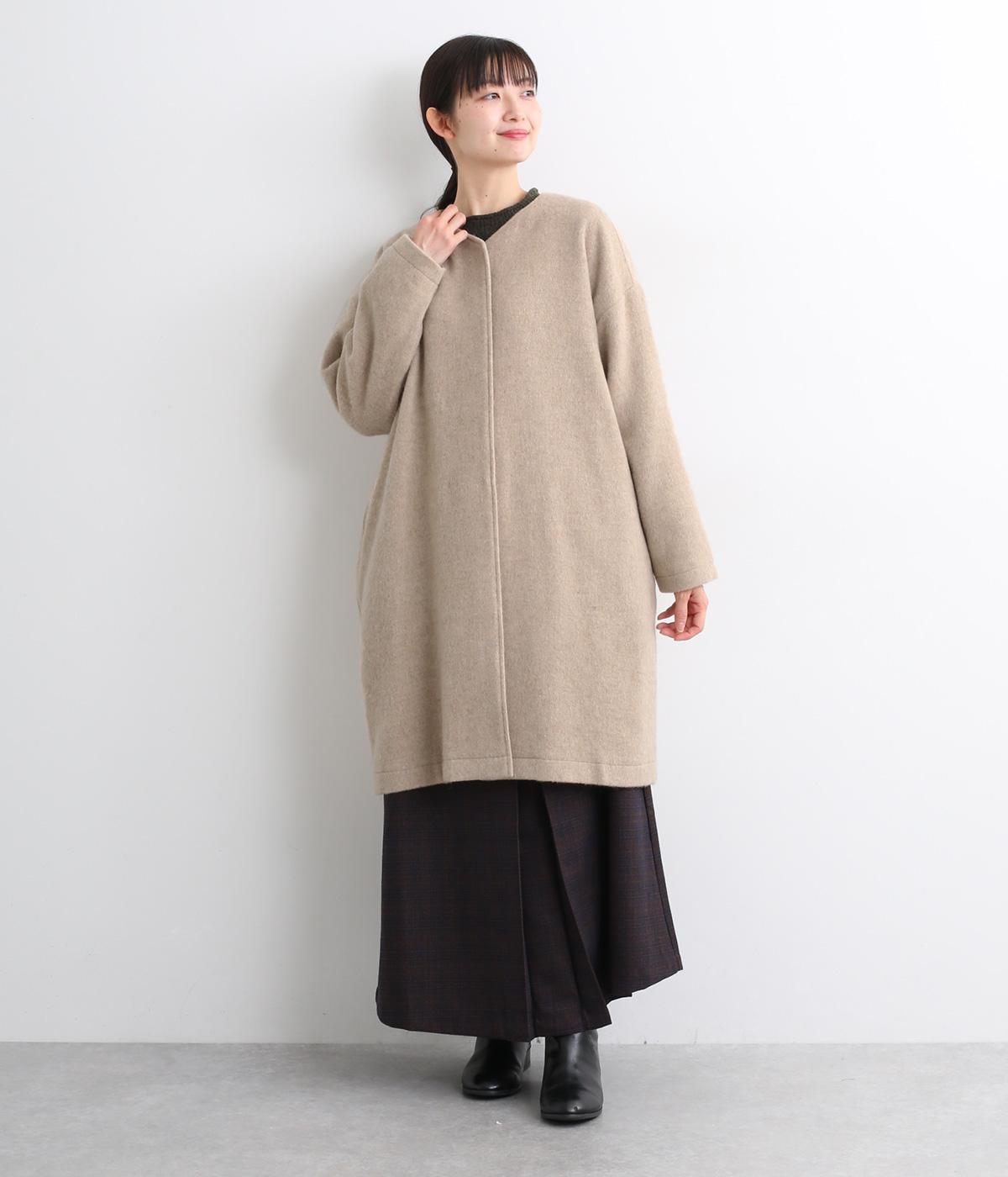 ノーカラーと隠しボタンのすっきりとしたデザインが使いやすいコート。ほどよくゆとりを持たせたシルエットで重ね着しやすいです。浅めVネックのノーカラーなので首もとすっきり、マフラーやタートルネックなども重ねやすいです。