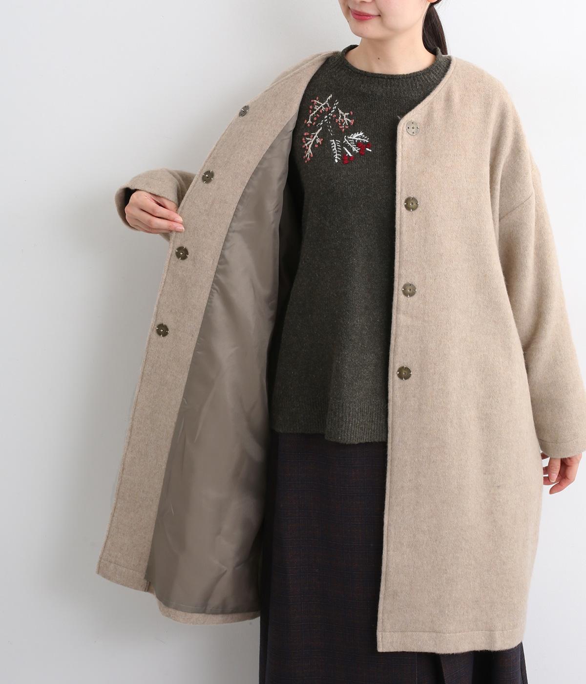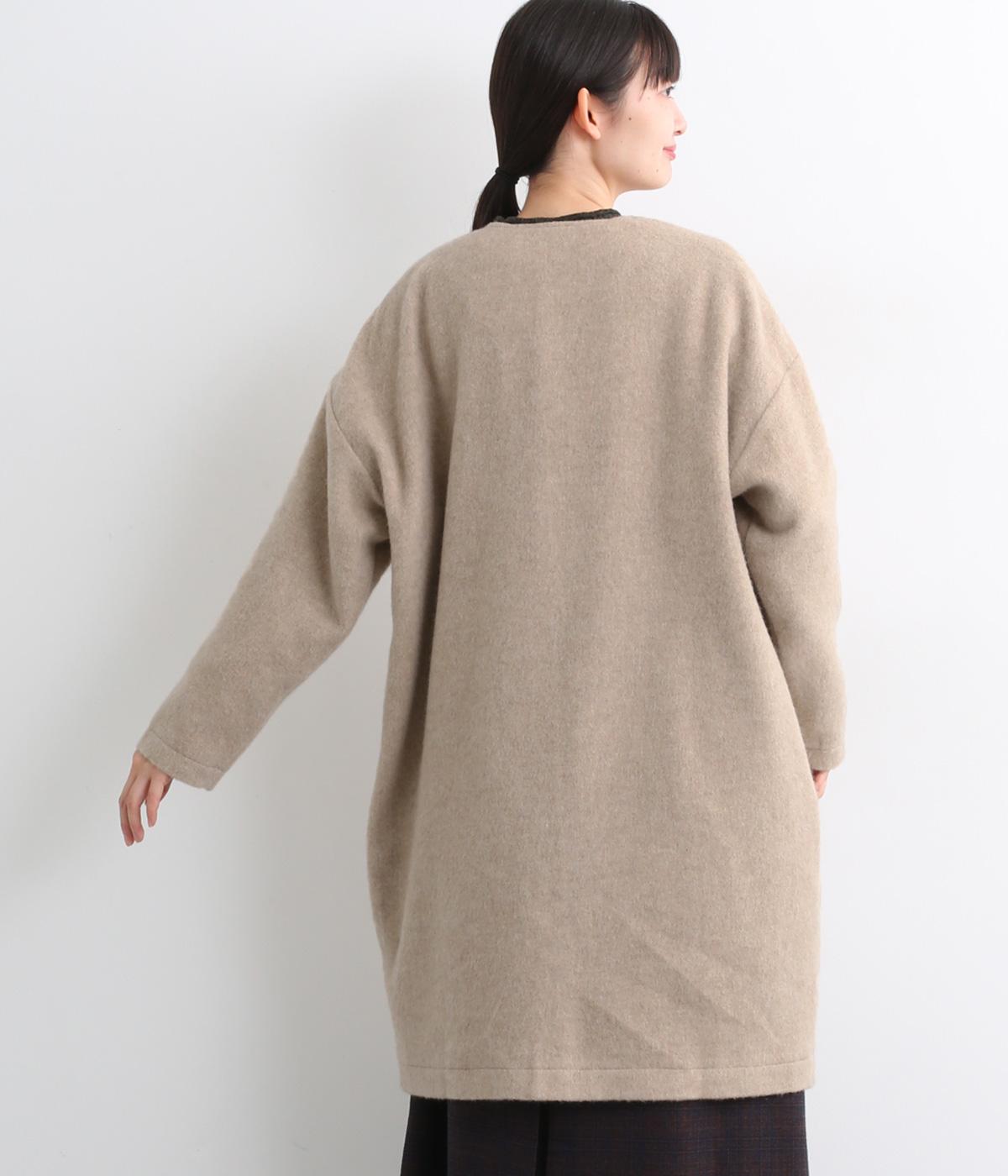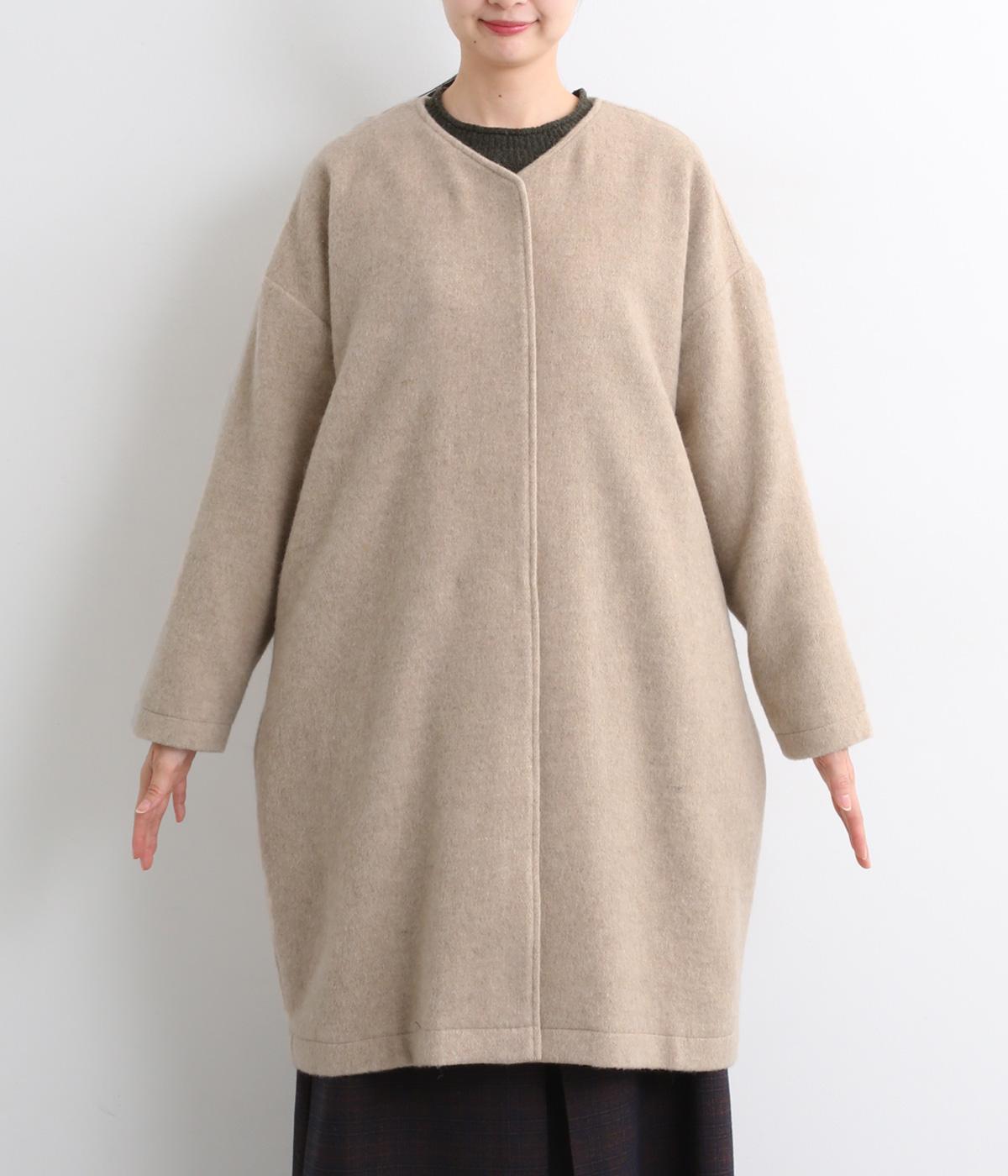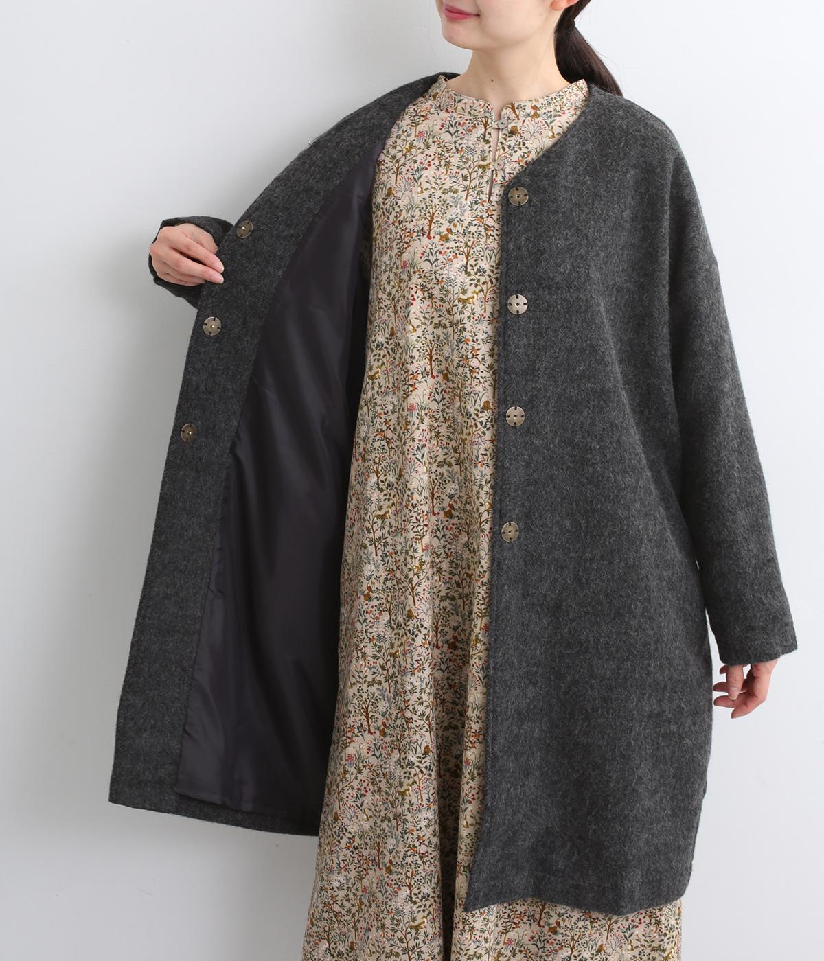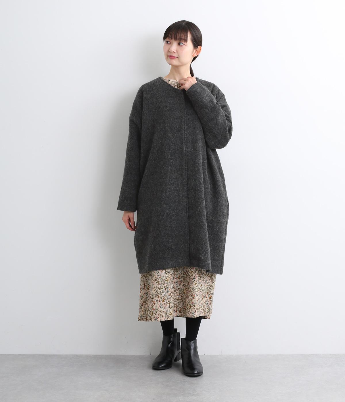 ノーカラーと隠しボタンのすっきりとしたデザインが使いやすいコート。ほどよくゆとりを持たせたシルエットで重ね着しやすいです。浅めVネックのノーカラーなので首もとすっきり、マフラーやタートルネックなども重ねやすいです。