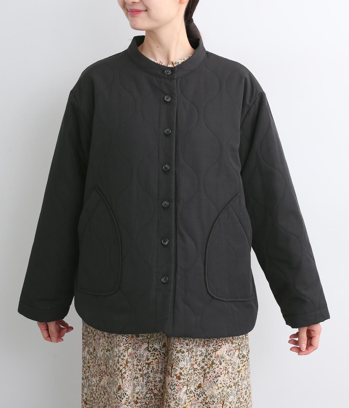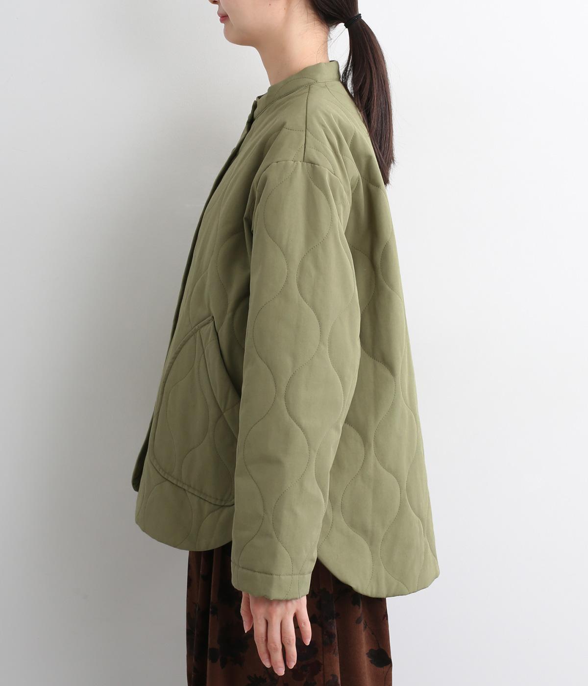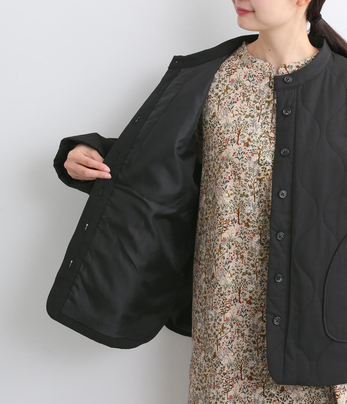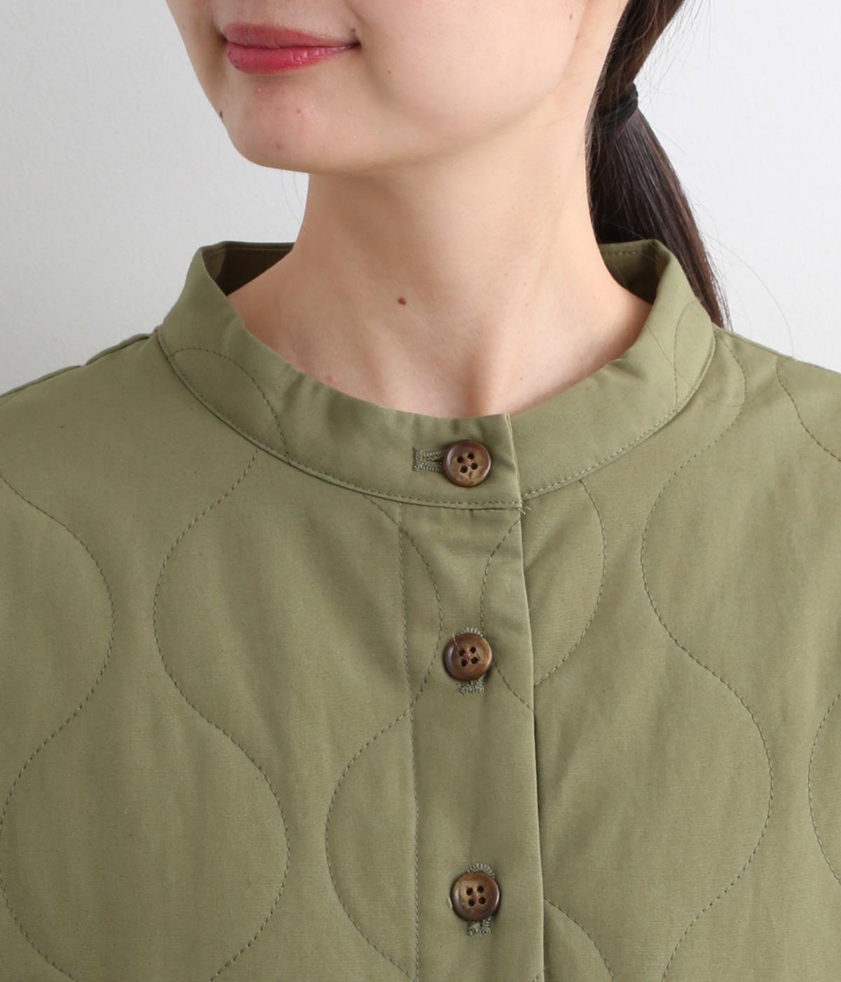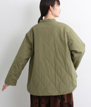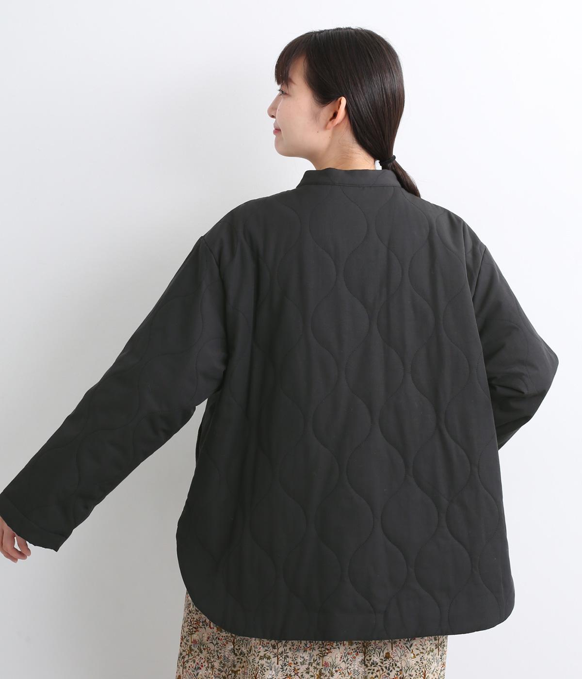 ボタンやラウンドカットの裾、バンドカラーなど随所にシャツディティールを取り入れたジャケット。大きめのひょうたんキルト地でカジュアルに仕上げました。裾に前後差をもたせることで、丸みを帯びた女性らしいシルエットにしています。